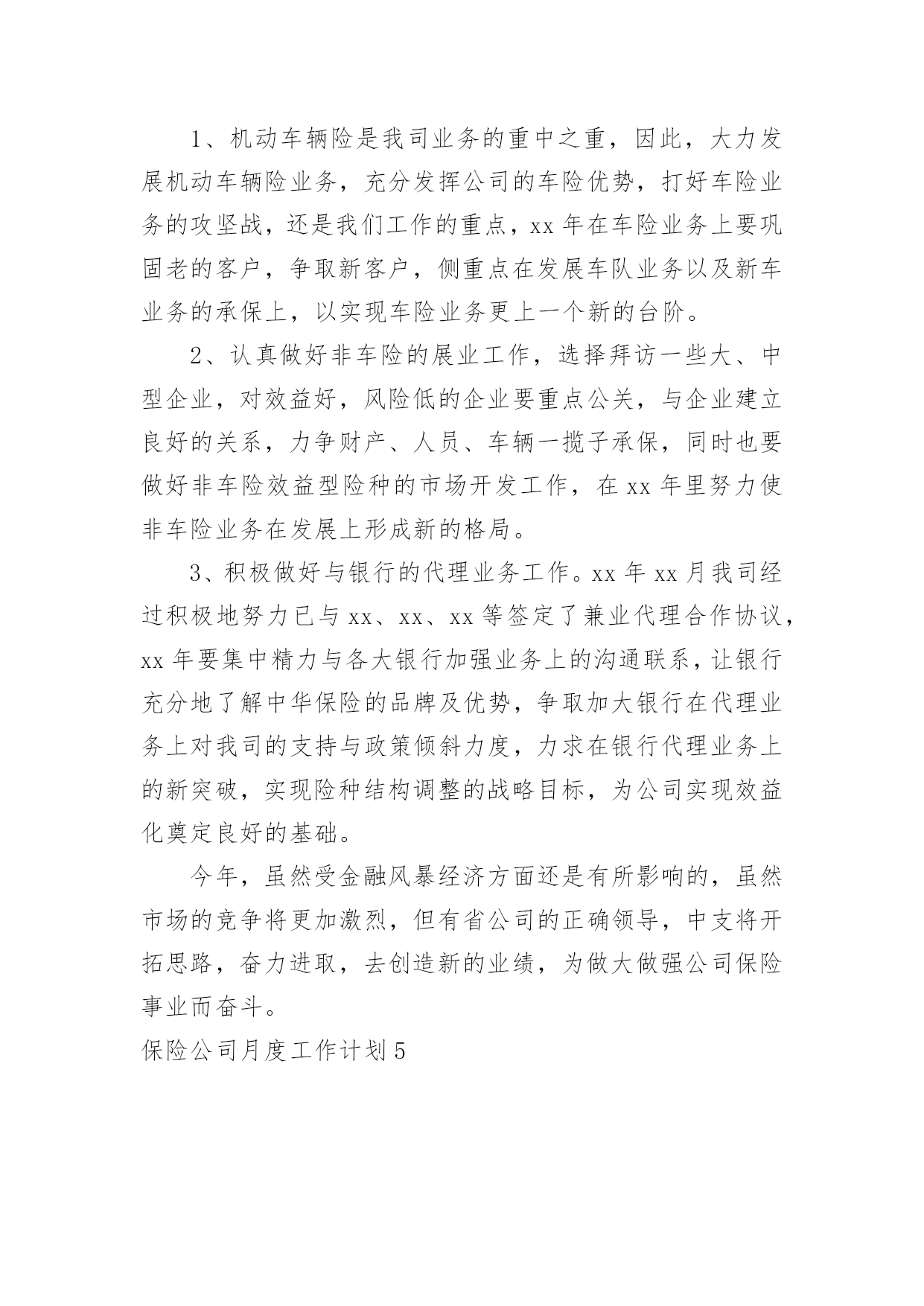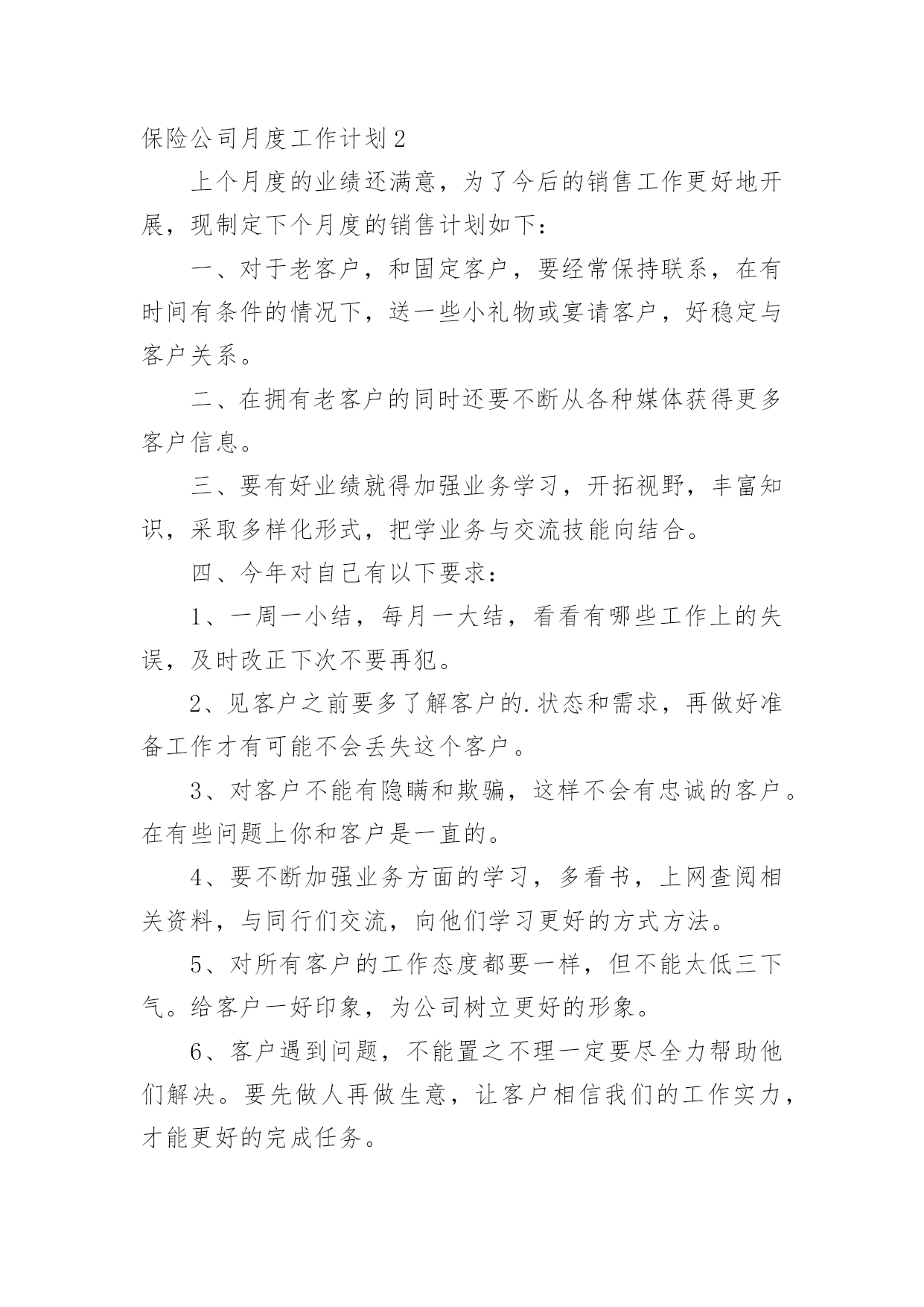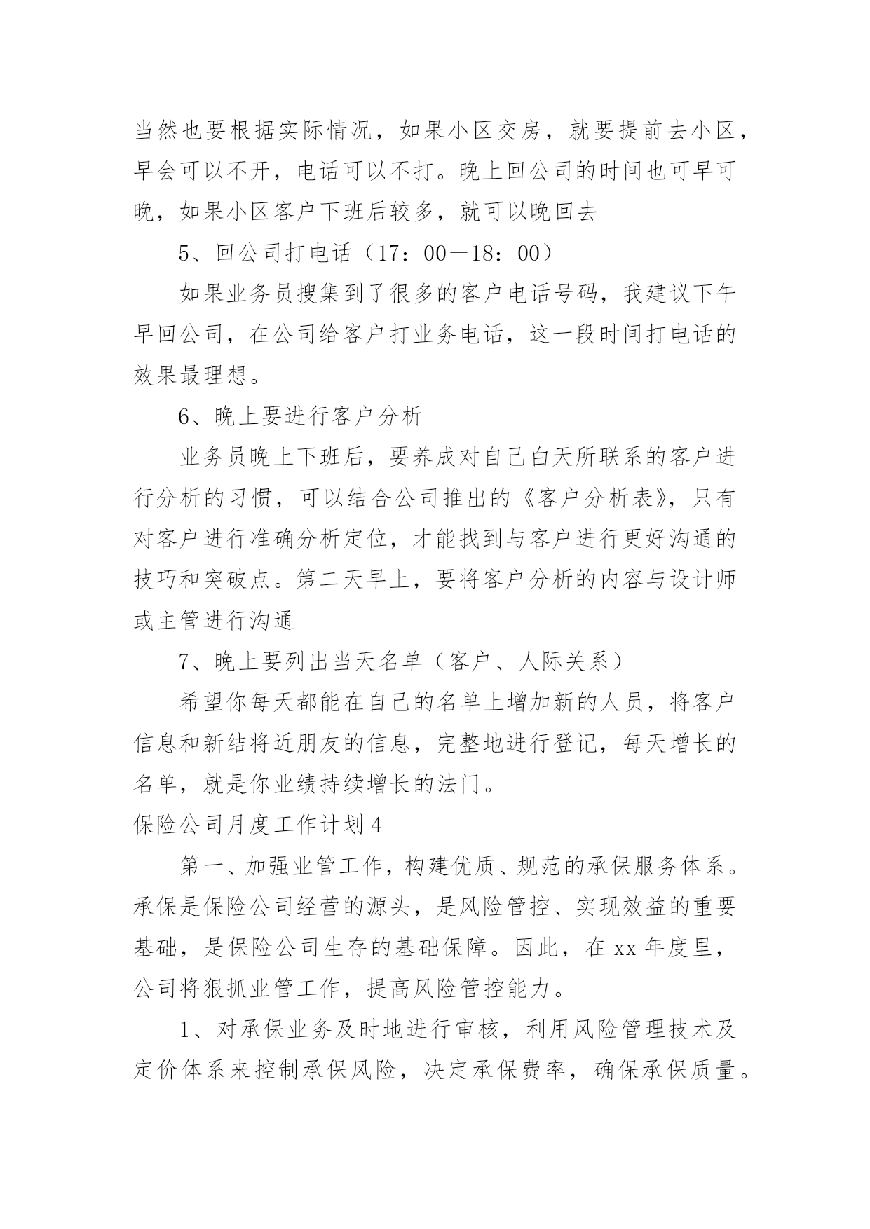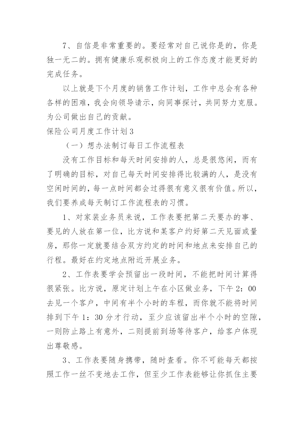 保险公司月度工作计划保险公司月度工作计划日子如同白驹过隙,不经意间,我们的工作又将在忙碌中充实着,在喜悦中收获着,写一份计划,为接下来的工作做准备吧!什么样的计划才是好的计划呢?以下是小编为大家收集的保险公司月度工作计划,欢迎阅读与收藏。保险公司月度工作计划1炎热酷暑的七月已经过去,在看看自己的业绩,心里很不是滋味,仔细回想起来在这个月中自己还是有好多地方做的不足,加上死板的销售套路,我的业绩像是一滩死水,所以我认识到了自己在工作中的不足,没有打破传统的销售政策,以守株待兔的方式最终还是失败了。结合七月份我的整车销售车台数是4台,有一台xx,两台森林人,一台傲虎,但这月只完成了两台森林人的数量,其他都没完成,我也反思了自己,觉得以后应该不段改善和完善自己,提高自己的专业知识,把现在的一种行业最终做成自己的专业。这月的20号和21号两天我荣幸的参加了xxxxx赛,使得我受益匪浅。首先第一次面对面见了的韩寒,也是第一次和那么xxxx主一起参加活动。在此真的很感谢xxx各位领导给我这次机会。在刚到赛场的时候我心潮澎湃,和那么多车主出去做活动,我才感受到了团队的合作是多么重要,整个赛场就只有斯巴鲁这个团队六颗星的蓝色标志感染了全场的整个气氛,挥旗子的挥旗子,吹号子的吹号子,我真的.为这只团队感到骄傲,也很荣幸能在这样一直团队中生活。8月的号角已经吹响,在最困难的时候我们谁都不能倒下,我要冲刺,要努力,相信只要自己辛勤过,努力过,付出过,你不比别人差!说实话,在8月的进程中,我对自己的业绩没有多大把握,怎么样去突破,怎么样去提高,成了我的思考问题。仔细回想7月的实际情况,我得出一些结论。一是进店量大大的减少,除非用一些做活动的形式来吸引客户,但往往效果不是很明显。二是在进店客户少的情况下往往有些客户是特别意向客户,看我们怎么去沟通与协调。这是考验我们能力的时候。三是我们没有主动和积极的心态,自暴自弃,想的这个月连人都没有怎么能买车,所以对自己的要求有所放松,其实越是在危难的时候越能体现出一个人的工作心态和状态。我们按照常理的坐店守客户是不对的,在这种情况下我们还要有很好的市场拓展能力,也是在客户不多的情况下正是我们学习和提高自身专业知识的绝好时间,但是我们好多人都没有发现,错过良机,就包括我自己也一样,在事情过后才突然明白。最后还是要感谢领导和同仁之间的相互支持,给我这个舞台,我会去努力,也请领导相信,在以后的日子里,我会不断改善,超越自我,用积极的心态去面对一切。保险公司月度工作计划2上个月度的业绩还满意,为了今后的销售工作更好地开展,现制定下个月度的销售计划如下:一、对于老客户,和固定客户,要经常保持联系,在有时间有条件的情况下,送一些小礼物或宴请客户,好稳定与客户关系。二、在拥有老客户的同时还要不断从各种媒体获得更多客户信息。三、要有好业绩就得加强业务学习,开拓视野,丰富知识,采取多样化形式,把学业务与交流技能向结合。四、今年对自己有以下要求:1、一周一小结,每月一大结,看看有哪些工作上的失误,及时改正下次不要再犯。2、见客户之前要多了解客户的.状态和需求,再做好准备工作才有可能不会丢失这个客户。3、对客户不能有隐瞒和欺骗,这样不会有忠诚的客户。在有些问题上你和客户是一直的。4、要不断加强业务方面的学习,多看书,上网查阅相关资料,与同行们交流,向他们学习更好的方式方法。5、对所有客户的工作态度都要一样,但不能太低三下气。给客户一好印象,为公司树立更好的形象。6、客户遇到问题,不能置之不理一定要尽全力帮助他们解决。要先做人再做生意,让客户相信我们的工作实力,才能更好的完成任务。7、自信是非常重要的。要经常对自己说你是的,你是独一无二的。拥有健康乐观积极向上的工作态度才能更好的完成任务。以上就是下个月度的销售工作计划,工作中总会有各种各样的困难,我会向领导请示,向同事探讨,共同努力克服。为公司做出自己的贡献。保险公司月度工作计划3(一)想办法制订每日工作流程表没有工作目标和每天时间安排的人,总是很悠闲,而有了明确的目标,对自己每天时间安排得比较满的人,是没有空闲时间的,每一点时间都会过得很有意义很有价值。所以,我们要养成每天制订工作流程表的习惯。1、对家装业务员来说,工作表要把第二天要办的事、要见的人放在第一位,比方说和某客户约好第二天见面或量房,那你一定就要结合双方约定的时间和地点来安排自己的行程。最好在约定地点附近开展业务。2、工作表要学会预留出一段时间,不能把时间计算得很紧张。比方说,原定计划上午在小区做业务,下午2:00去见一个客户,中间有半个小时的车程,而你就不能将时间排到下午1:30分才行动,至少应该留出半个小时的空隙,一则防止路上有意外,二则提前到场等待客户,给客户体现出尊敬感。3、工作表要随身携带,随时查看。你不可