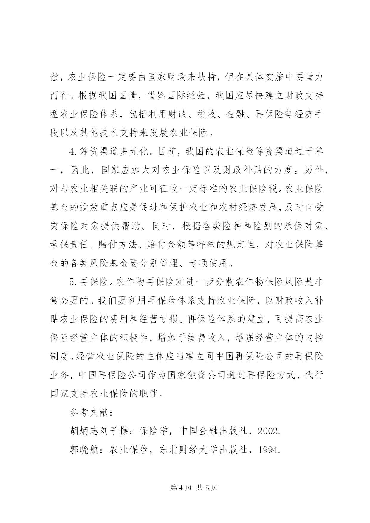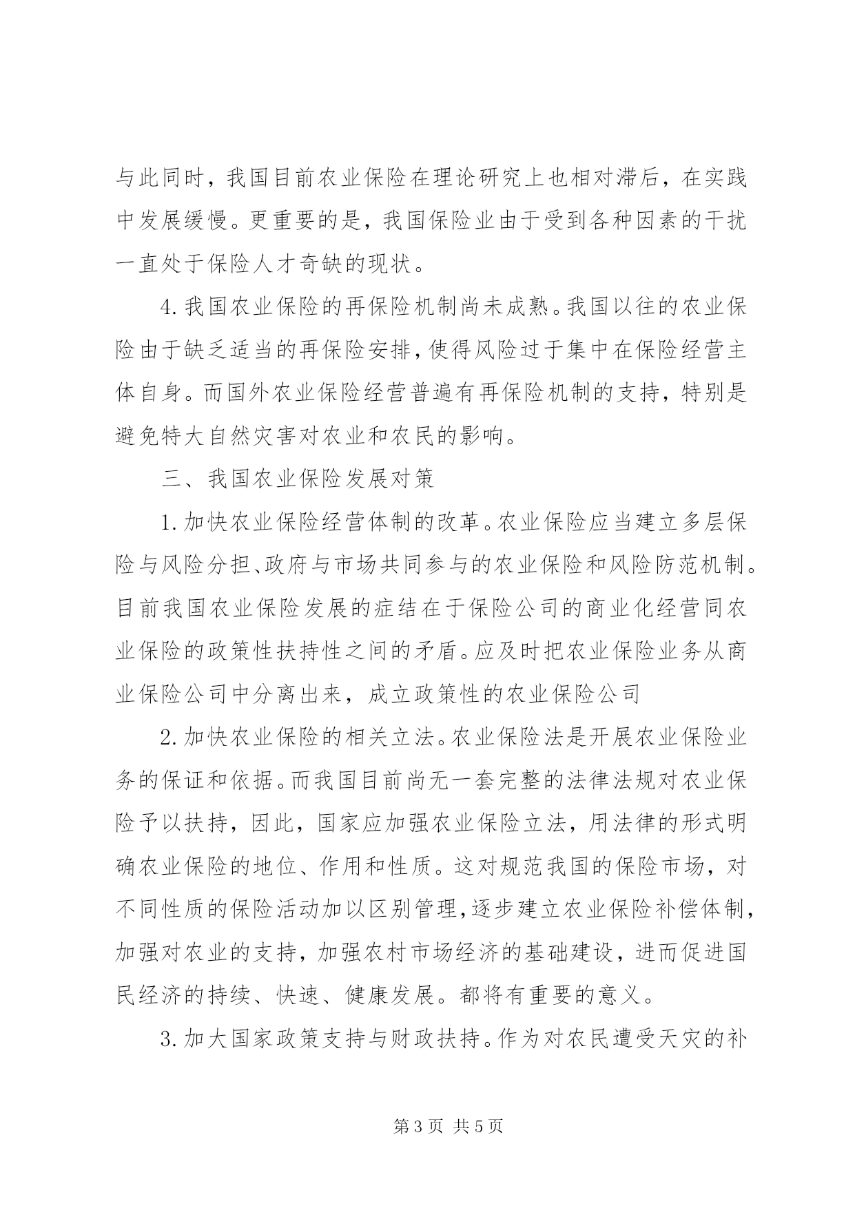 第PAGE\*Arabic\*MERGEFORMAT5页共NUMPAGES\*MERGEFORMAT5页农业保险体制改革发展思考摘要。农业保险对于中国这样一个农业大国来说,应是农业风险分散的重要工具,对于推动农业体制改革,保障农业在生产的顺利进行提供了有效的保障。但目前我国农业保险发展陷入了困境。其突出矛盾表现在广大农民迫切需要农业保险的保障而各商业保险公司却不愿涉足该领域。本文从农业保险的重要性入手,论述农业保险存在的必要性,详细分析农业保险在我国发展前进中遇到的问题,并提出相应的解决措施。关键词:农业保险;农业体制改革;政府支持;再保险一、农业保险的重要作用农业保险是商品经济发展到一定阶段的产物。现代农业承受着自然风险、社会风险、经济风险的威胁,这严重影响农业的可持续发展。我国农业风险机制的脆弱性是由多方面因素造成的,这种状况客观需要创建一种转移分散风险、分摊经济损失的风险管理机制,由此现代农业保险应运而生。农业保险的发展,对保障农业再生产的顺利进行,推动农业的可持续发展无疑具有重要的理论意义和深远的现实意义。1.农业保险对农民个人的影响。农业保险可以使投保农户在遭受保险责任范围内的灾害后及时得到经济补偿,农业保险可以通过转移和分散风险,以赔偿支付的方式保障农民生活的稳定。2.农业保险对农村经济的影响。农业保险有助于保障农业生产过程的持续稳定。它可以使大额的不定的农业风险损失,转化为小额的固定的农业保险费的缴纳。3.农业保险对整个国民经济的影响。在我国,农业是国民经济的基础,其波动是引发国民经济周期波动的重要因素。因而农业保险在直接促进农业生产经营活动健康稳定发展的同时,也间接保证整个国民经济的协调发展。同时,农业保险的介入是农业生产能够正常进行,会使农产品的供求状况平衡,进而影响社会其他阶层人们的正常生活。二、当前我国农业保险发展面临的突出矛盾1.农业保险的有效需求和供给不足。农业生产和经营风险的客观存在,必然形成对农业保险的巨大需求,但目前我国农业保险的有效需求不足。2.资金来源渠道单一。目前,农业保险基金主要来自于保户缴纳的保险费,而农业保险费率相对于保户的农业收入而言是很高的。而投保农业险会导致农户收入出现持续走低的趋势,在农户收入减少的同时,农村公共品供应的弱化将使农户隐性负担逐步增长。这种单一的、不稳定的来源渠道也是农业保险实践不成功的主要原因之一。3.农业保险的发展面临资金短缺、人才匮乏、技术薄弱的矛盾。农业保险的发展离不开政府的扶持,特别是在资金方面的资助,但政府的支持是有限的,农业保险将面临资金不足的矛盾。与此同时,我国目前农业保险在理论研究上也相对滞后,在实践中发展缓慢。更重要的是,我国保险业由于受到各种因素的干扰一直处于保险人才奇缺的现状。4.我国农业保险的再保险机制尚未成熟。我国以往的农业保险由于缺乏适当的再保险安排,使得风险过于集中在保险经营主体自身。而国外农业保险经营普遍有再保险机制的支持,特别是避免特大自然灾害对农业和农民的影响。三、我国农业保险发展对策1.加快农业保险经营体制的改革。农业保险应当建立多层保险与风险分担、政府与市场共同参与的农业保险和风险防范机制。目前我国农业保险发展的症结在于保险公司的商业化经营同农业保险的政策性扶持性之间的矛盾。应及时把农业保险业务从商业保险公司中分离出来,成立政策性的农业保险公司2.加快农业保险的相关立法。农业保险法是开展农业保险业务的保证和依据。而我国目前尚无一套完整的法律法规对农业保险予以扶持,因此,国家应加强农业保险立法,用法律的形式明确农业保险的地位、作用和性质。这对规范我国的保险市场,对不同性质的保险活动加以区别管理,逐步建立农业保险补偿体制,加强对农业的支持,加强农村市场经济的基础建设,进而促进国民经济的持续、快速、健康发展。都将有重要的意义。3.加大国家政策支持与财政扶持。作为对农民遭受天灾的补偿,农业保险一定要由国家财政来扶持,但在具体实施中要量力而行。根据我国国情,借鉴国际经验,我国应尽快建立财政支持型农业保险体系,包括利用财政、税收、金融、再保险等经济手段以及其他技术支持来发展农业保险。4.筹资渠道多元化。目前,我国的农业保险筹资渠道过于单一,因此,国家应加大对农业保险以及财政补贴的力度。另外,对与农业相关联的产业可征收一定标准的农业保险税。农业保险基金的投放重点应是促进和保护农业和农村经济发展,及时向受灾保险对象提供帮助。同时,根据各类险种和险别的承保对象、承保责任、赔付方法、赔付金额等特殊的规定性,对农业保险基金的各类风险基金要分别管理、专项使用。5.再保险。农作物再保险对进一步分散农作物保险风险是非常必要的。我们要利用再保险体系支持农业保险,以财政收入补贴农业保险的费用和经营亏损。再保险体系的建立,可提高