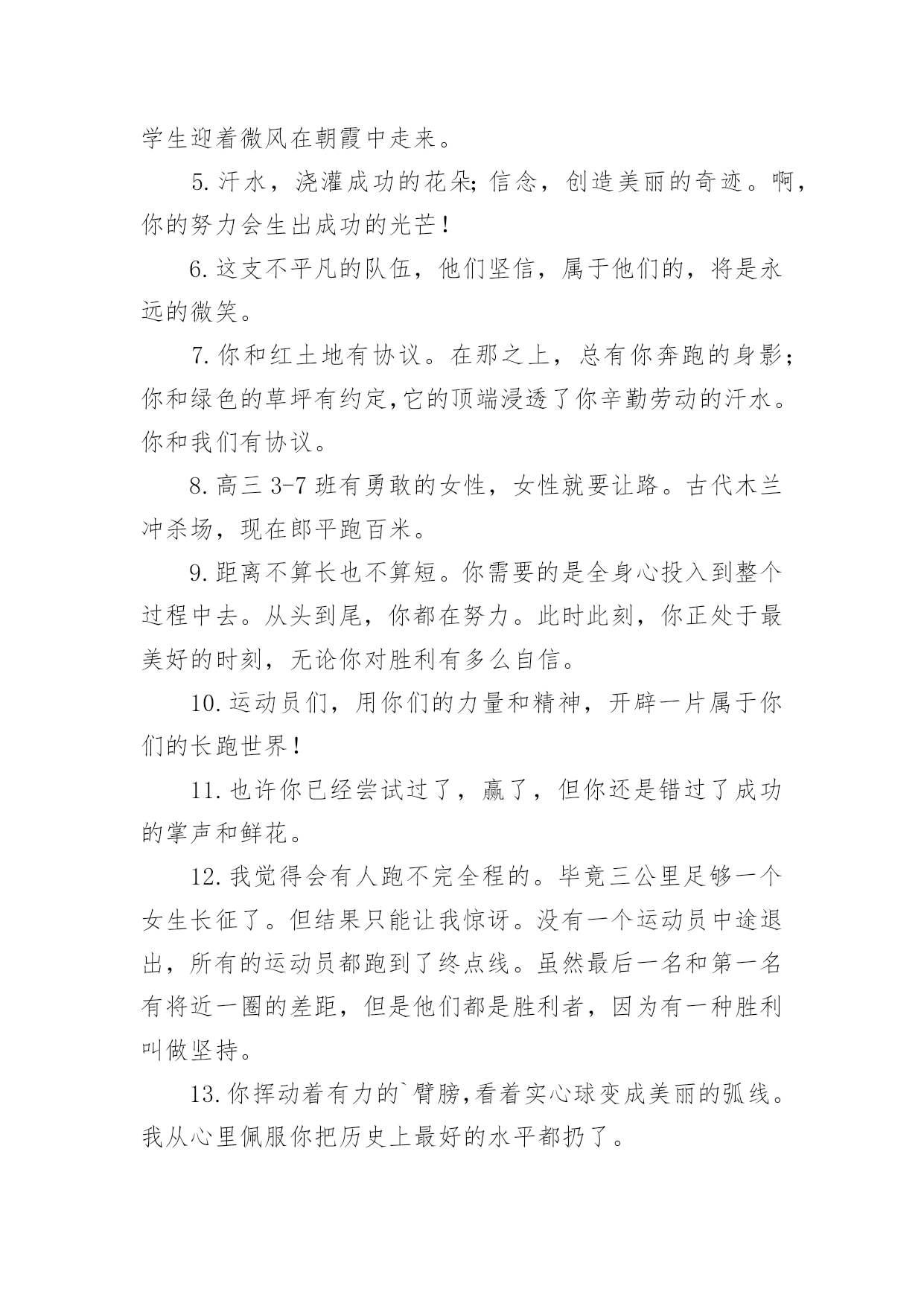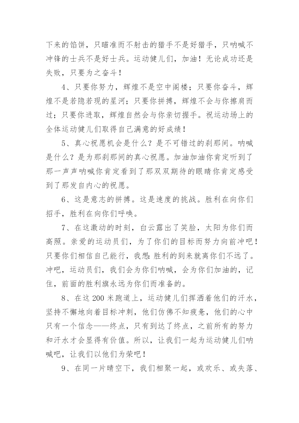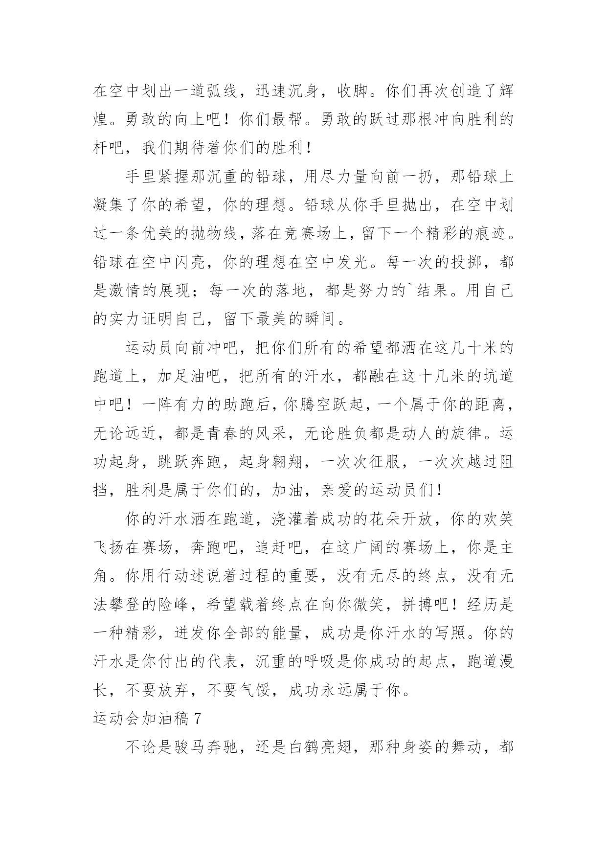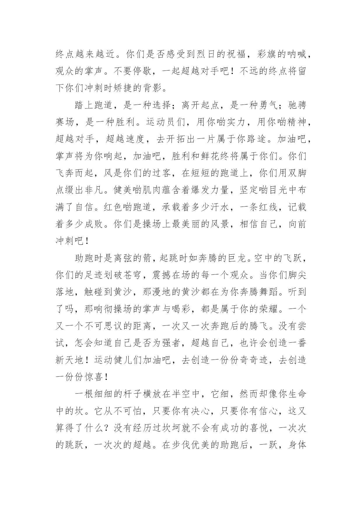 运动会加油稿运动会加油稿【必备】在社会一步步向前发展的今天,用到加油稿的地方越来越多,加油稿可以增添对方必胜的勇气和信心。怎样写加油稿才能更好地发挥其做用呢?下面是小编精心整理的运动会加油稿,仅供参考,欢迎大家阅读。运动会加油稿1嘿!大家好,我是本次运动会播报节目主持人xx。本次运动会是精彩纷呈,高潮迭起,下面让我们来看看我们的运动会盛况。令人骄傲的男子50米现在秋高气爽,空气清鲜,再过一会儿就是三年级男子50米跑步,各班主任已带好参赛者进入场地。裁判帮助班主任排好队开始比赛。“砰”的一声枪响了,运动员们有的像离弦的箭,风似地冲了出去。看!(一)班xx快速地摇摆着。(三)班xx加大步子,一直处于第一的`位置。终点处裁判也瞪大了双眼,想看看谁拿第一。这时,xx和xx同时加快步子,两人不分上下。眼看张丰瑞坚持不下了,尹治清却仿佛注入了力量,手摆得越来越有劲,还有3米……2米…………1米,到了!尹治清终于赢了第一,(3)班班主任,年轻漂亮的周老师是一阵欢呼,观众也忍不住了,冲上来把他举起来来了。运动会加油稿2超越对手,超越自我,是我们的目标,是我们的信念,在喧嚣的田径场上,你们点燃了似火的热情,无论成败,我们都为你们感到自豪,你们永远是我们的骄傲!天空中有道彩虹,它在雨后的天空中美丽夺目,生命中也有一道彩虹,那就是运动,它让生命丰富多彩。充满了生机青春的我们,青春的生命,青春的运动,使我们的心放飞、年轻,没有失败,无论成败,运动的我们就是生活的彩虹。秋风羽,天气淡淡的转凉。然而这秋在今天更加迷人,不是因为它的秋高气爽,也不是因为它的明媚阳光,是因为今天的`人儿倍加精神气爽。看!运动场上那一幕幕,无论是哭是笑,其中都融入了他们的汗水、辛劳。他们是真正的矫健者,是运动场上的骄儿,更是我们心中的英雄。加油吧!英雄们!运动会加油稿31.他们坚信只有真诚的心才是永恒的,只有坚定的信念才会赢得最后的胜利。2.我们坚信,汗水浸透的笑容会晶莹剔透,努力创造的成功会更加真实。3.运动员们,用你们强大的力量,用你们仅有的精神,去开辟属于你们的长跑世界!4.九月的金风荡漾,九月的心情飞扬,九月的天空空供我们驰骋,微风轻轻吹动发丝传递着丰收的喜悦,第一届的学生迎着微风在朝霞中走来。5.汗水,浇灌成功的花朵;信念,创造美丽的奇迹。啊,你的努力会生出成功的光芒!6.这支不平凡的队伍,他们坚信,属于他们的,将是永远的微笑。7.你和红土地有协议。在那之上,总有你奔跑的身影;你和绿色的草坪有约定,它的顶端浸透了你辛勤劳动的汗水。你和我们有协议。8.高三3-7班有勇敢的女性,女性就要让路。古代木兰冲杀场,现在郎平跑百米。9.距离不算长也不算短。你需要的是全身心投入到整个过程中去。从头到尾,你都在努力。此时此刻,你正处于最美好的时刻,无论你对胜利有多么自信。10.运动员们,用你们的力量和精神,开辟一片属于你们的长跑世界!11.也许你已经尝试过了,赢了,但你还是错过了成功的掌声和鲜花。12.我觉得会有人跑不完全程的。毕竟三公里足够一个女生长征了。但结果只能让我惊讶。没有一个运动员中途退出,所有的运动员都跑到了终点线。虽然最后一名和第一名有将近一圈的差距,但是他们都是胜利者,因为有一种胜利叫做坚持。13.你挥动着有力的`臂膀,看着实心球变成美丽的弧线。我从心里佩服你把历史上最好的水平都扔了。14.坚持一个信念——奋斗。虽然只有一线生机,但我们会创造奇迹!15.也许你尝试过,失败过,但成功的火焰就是烧不起来。16.这里的风景很独特!此刻,踏着冉冉升起的太阳,是一班正激情澎湃地走来的队伍。17.不要祈求太阳的光芒,拒绝被用作月亮的伴娘。脚下的路要自己闯,不怕在黑暗中迷失方向;即使人生如此短暂,也没有遗憾。夜晚的亮线是对命运最有力的挑战!18.你站在草坪上,挥舞着手臂,所有的力量都凝聚在手中。你有力的手握着一个沉重的实心球,你用尽全力去扔。扔的近不远都无所谓,只要你努力!加油!19.一根小木棍,连接着团结和友谊,传递着勇气和力量,诠释着奋斗和拼搏。加油!让这激动人心的时刻永远回荡在我们心中!20.对接力跑者:接力棒用你擦出的火温暖了我的手。在紧急新闻中,我们的眼睛传达着永恒、团结和友谊。21.运动员们,我们对你们的敬仰之情,如滔滔江水,如滔滔黄河,一发不可收拾!运动会加油稿4看!那一面面迎风飘舞的彩旗,是一朵朵盛开的鲜花;听!那一阵阵惊天动地的欢呼,是回响在耳边胜利的风声。运动场上的你们,是胜利的标志,运动场上的你们,是青春的.赞叹。去吧!去迎接那伟大的挑战,去吧!去做一名追风的少年。运动会加油稿51、致运动员,是体育场上游走的火焰,是来去不息的脚步,是风中飞舞的树叶折射的金色光芒,藉此,可以诠释运动员兴奋的脸庞。那轻盈的步伐似飞鸟的翅膀,那清脆的枪声响彻天际,它粲然升起那跃