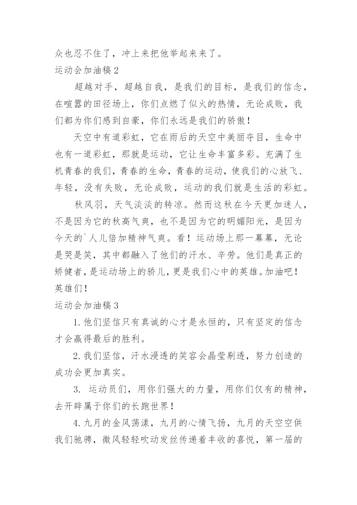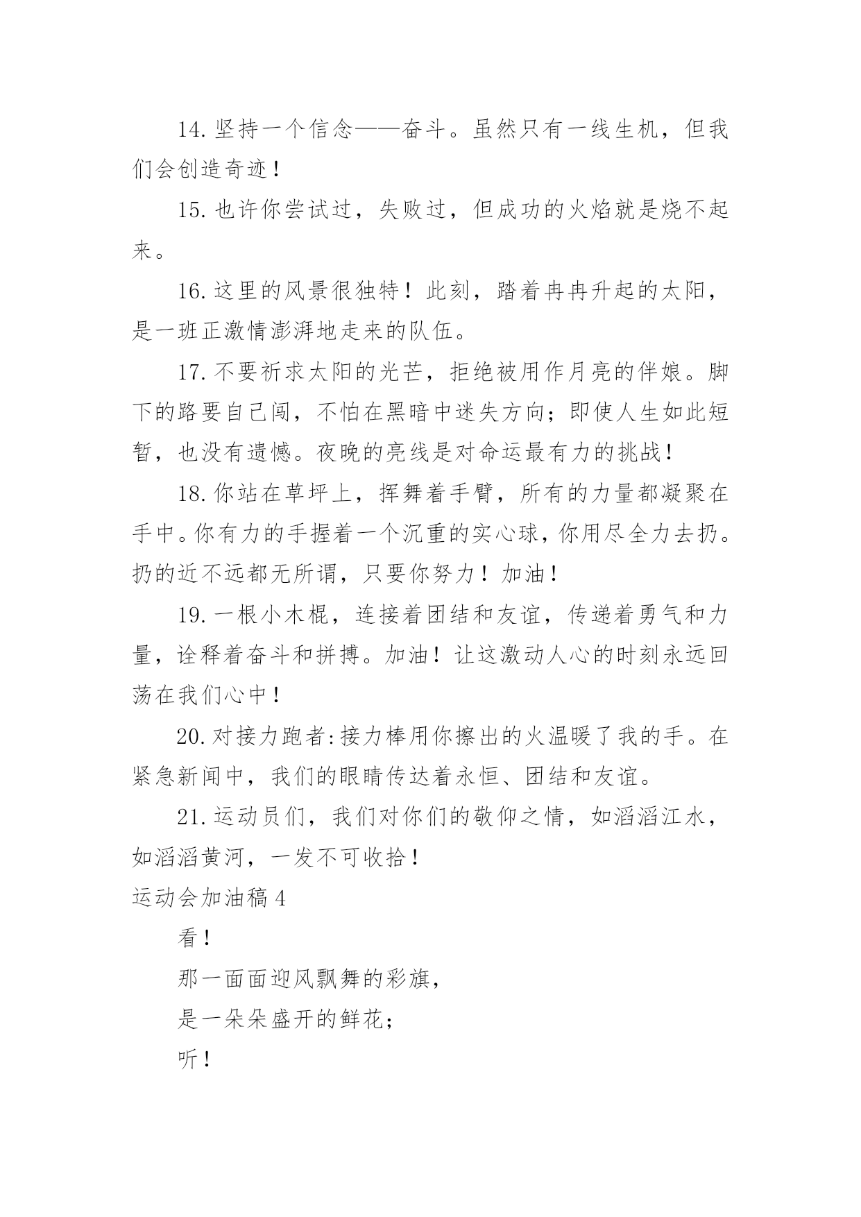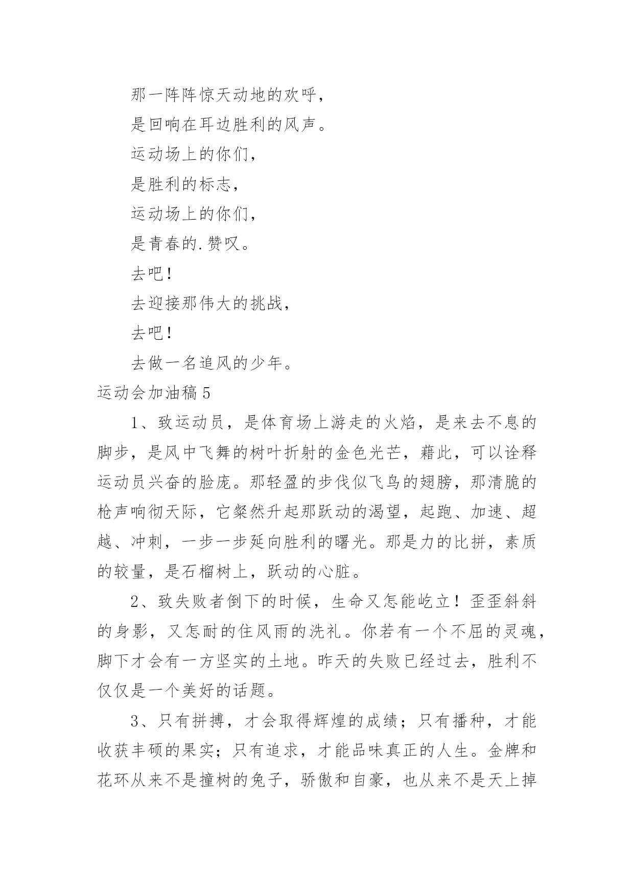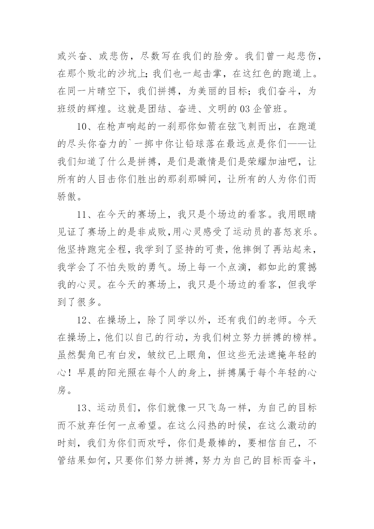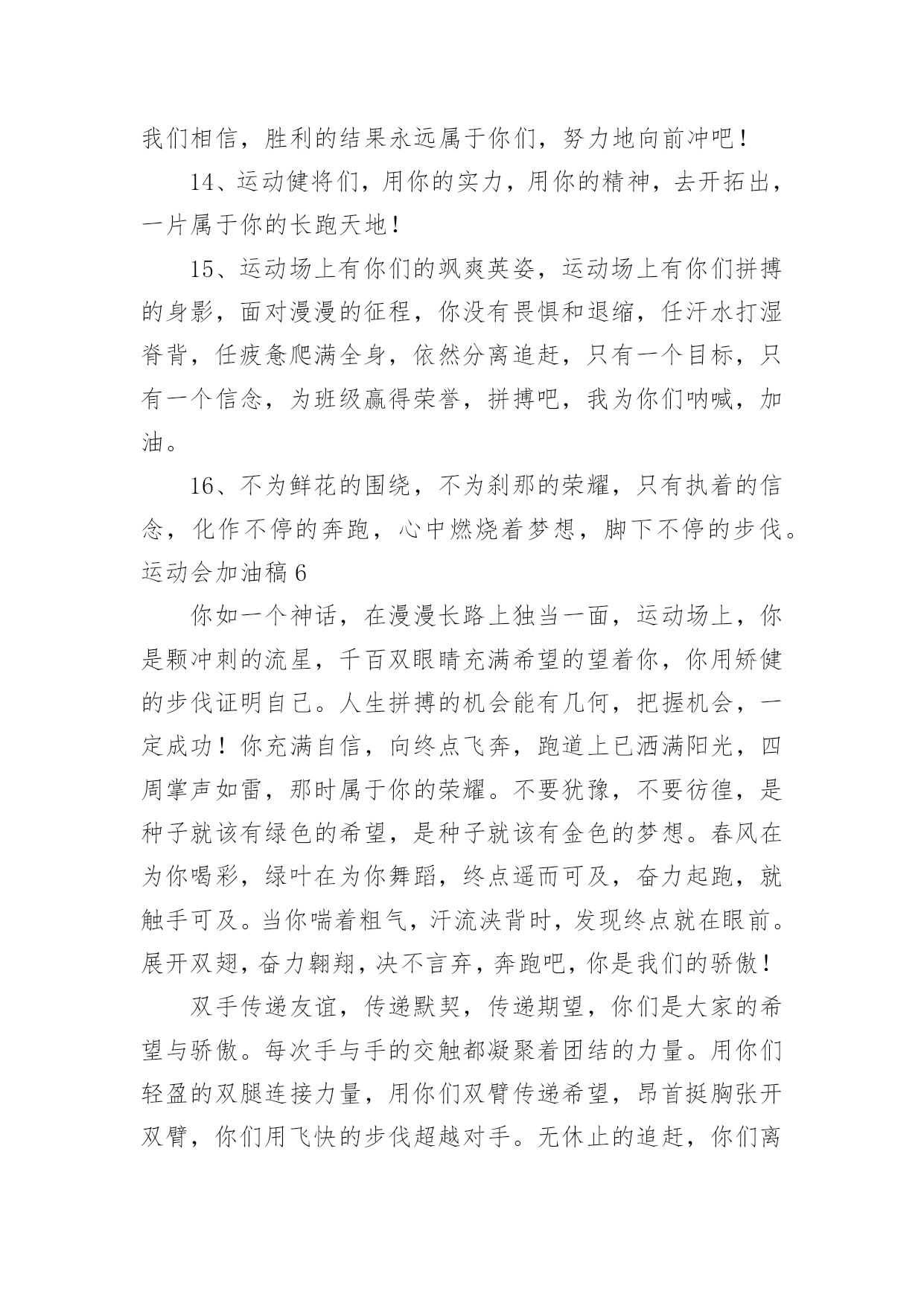运动会加油稿运动会加油稿【必备】在社会一步步向前发展的今天,用到加油稿的地方越来越多,加油稿可以增添对方必胜的勇气和信心。怎样写加油稿才能更好地发挥其做用呢?下面是小编精心整理的运动会加油稿,仅供参考,欢迎大家阅读。运动会加油稿1嘿!大家好,我是本次运动会播报节目主持人xx。本次运动会是精彩纷呈,高潮迭起,下面让我们来看看我们的运动会盛况。令人骄傲的男子50米现在秋高气爽,空气清鲜,再过一会儿就是三年级男子50米跑步,各班主任已带好参赛者进入场地。裁判帮助班主任排好队开始比赛。“砰”的一声枪响了,运动员们有的像离弦的箭,风似地冲了出去。看!(一)班xx快速地摇摆着。(三)班xx加大步子,一直处于第一的`位置。终点处裁判也瞪大了双眼,想看看谁拿第一。这时,xx和xx同时加快步子,两人不分上下。眼看张丰瑞坚持不下了,尹治清却仿佛注入了力量,手摆得越来越有劲,还有3米……2米…………1米,到了!尹治清终于赢了第一,(3)班班主任,年轻漂亮的周老师是一阵欢呼,观众也忍不住了,冲上来把他举起来来了。运动会加油稿2超越对手,超越自我,是我们的目标,是我们的信念,在喧嚣的田径场上,你们点燃了似火的热情,无论成败,我们都为你们感到自豪,你们永远是我们的骄傲!天空中有道彩虹,它在雨后的天空中美丽夺目,生命中也有一道彩虹,那就是运动,它让生命丰富多彩。充满了生机青春的我们,青春的生命,青春的运动,使我们的心放飞、年轻,没有失败,无论成败,运动的我们就是生活的彩虹。秋风羽,天气淡淡的转凉。然而这秋在今天更加迷人,不是因为它的秋高气爽,也不是因为它的明媚阳光,是因为今天的`人儿倍加精神气爽。看!运动场上那一幕幕,无论是哭是笑,其中都融入了他们的汗水、辛劳。他们是真正的矫健者,是运动场上的骄儿,更是我们心中的英雄。加油吧!英雄们!运动会加油稿31.他们坚信只有真诚的心才是永恒的,只有坚定的信念才会赢得最后的胜利。2.我们坚信,汗水浸透的笑容会晶莹剔透,努力创造的成功会更加真实。3.运动员们,用你们强大的力量,用你们仅有的精神,去开辟属于你们的长跑世界!4.九月的金风荡漾,九月的心情飞扬,九月的天空空供我们驰骋,微风轻轻吹动发丝传递着丰收的喜悦,第一届的学生迎着微风在朝霞中走来。5.汗水,浇灌成功的花朵;信念,创造美丽的奇迹。啊,你的努力会生出成功的光芒!6.这支不平凡的队伍,他们坚信,属于他们的,将是永远的微笑。7.你和红土地有协议。在那之上,总有你奔跑的身影;你和绿色的草坪有约定,它的顶端浸透了你辛勤劳动的汗水。你和我们有协议。8.高三3-7班有勇敢的女性,女性就要让路。古代木兰冲杀场,现在郎平跑百米。9.距离不算长也不算短。你需要的是全身心投入到整个过程中去。从头到尾,你都在努力。此时此刻,你正处于最美好的时刻,无论你对胜利有多么自信。10.运动员们,用你们的力量和精神,开辟一片属于你们的长跑世界!11.也许你已经尝试过了,赢了,但你还是错过了成功的掌声和鲜花。12.我觉得会有人跑不完全程的。毕竟三公里足够一个女生长征了。但结果只能让我惊讶。没有一个运动员中途退出,所有的运动员都跑到了终点线。虽然最后一名和第一名有将近一圈的差距,但是他们都是胜利者,因为有一种胜利叫做坚持。13.你挥动着有力的`臂膀,看着实心球变成美丽的弧线。我从心里佩服你把历史上最好的水平都扔了。14.坚持一个信念——奋斗。虽然只有一线生机,但我们会创造奇迹!15.也许你尝试过,失败过,但成功的火焰就是烧不起来。16.这里的风景很独特!此刻,踏着冉冉升起的太阳,是一班正激情澎湃地走来的队伍。17.不要祈求太阳的光芒,拒绝被用作月亮的伴娘。脚下的路要自己闯,不怕在黑暗中迷失方向;即使人生如此短暂,也没有遗憾。夜晚的亮线是对命运最有力的挑战!18.你站在草坪上,挥舞着手臂,所有的力量都凝聚在手中。你有力的手握着一个沉重的实心球,你用尽全力去扔。扔的近不远都无所谓,只要你努力!加油!19.一根小木棍,连接着团结和友谊,传递着勇气和力量,诠释着奋斗和拼搏。加油!让这激动人心的时刻永远回荡在我们心中!20.对接力跑者:接力棒用你擦出的火温暖了我的手。在紧急新闻中,我们的眼睛传达着永恒、团结和友谊。21.运动员们,我们对你们的敬仰之情,如滔滔江水,如滔滔黄河,一发不可收拾!运动会加油稿4看!那一面面迎风飘舞的彩旗,是一朵朵盛开的鲜花;听!那一阵阵惊天动地的欢呼,是回响在耳边胜利的风声。运动场上的你们,是胜利的标志,运动场上的你们,是青春的.赞叹。去吧!去迎接那伟大的挑战,去吧!去做一名追风的少年。运动会加油稿51、致运动员,是体育场上游走的火焰,是来去不息的脚步,是风中飞舞的树叶折射的金色光芒,藉此,可以诠释运动员兴奋的脸庞。那轻盈的步伐似飞鸟的翅膀,那清脆的枪声响彻天际,它粲然升起那跃