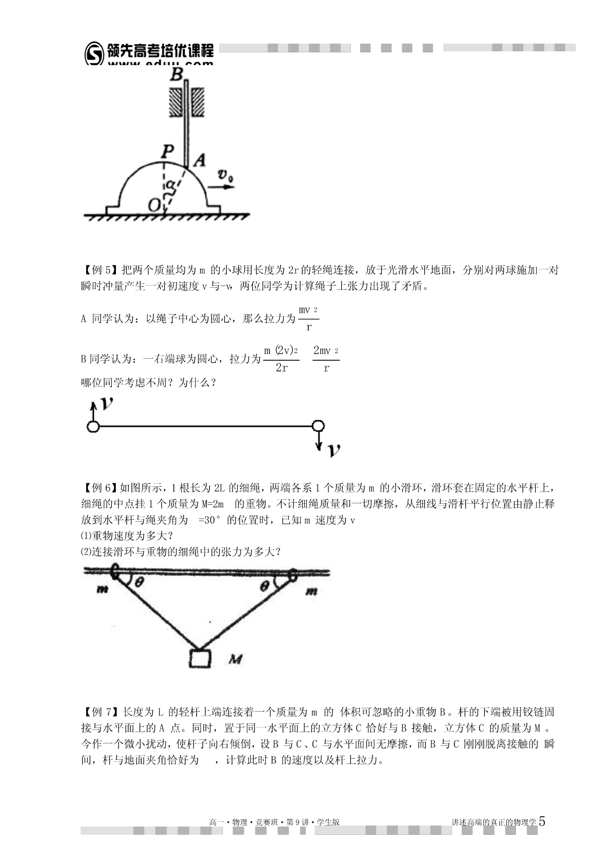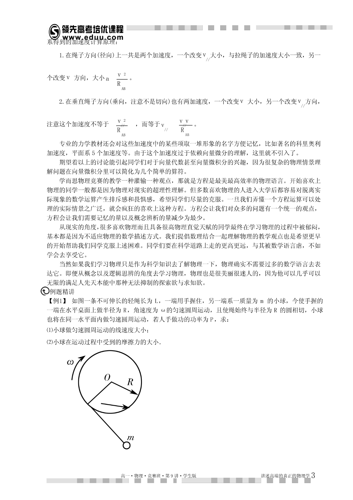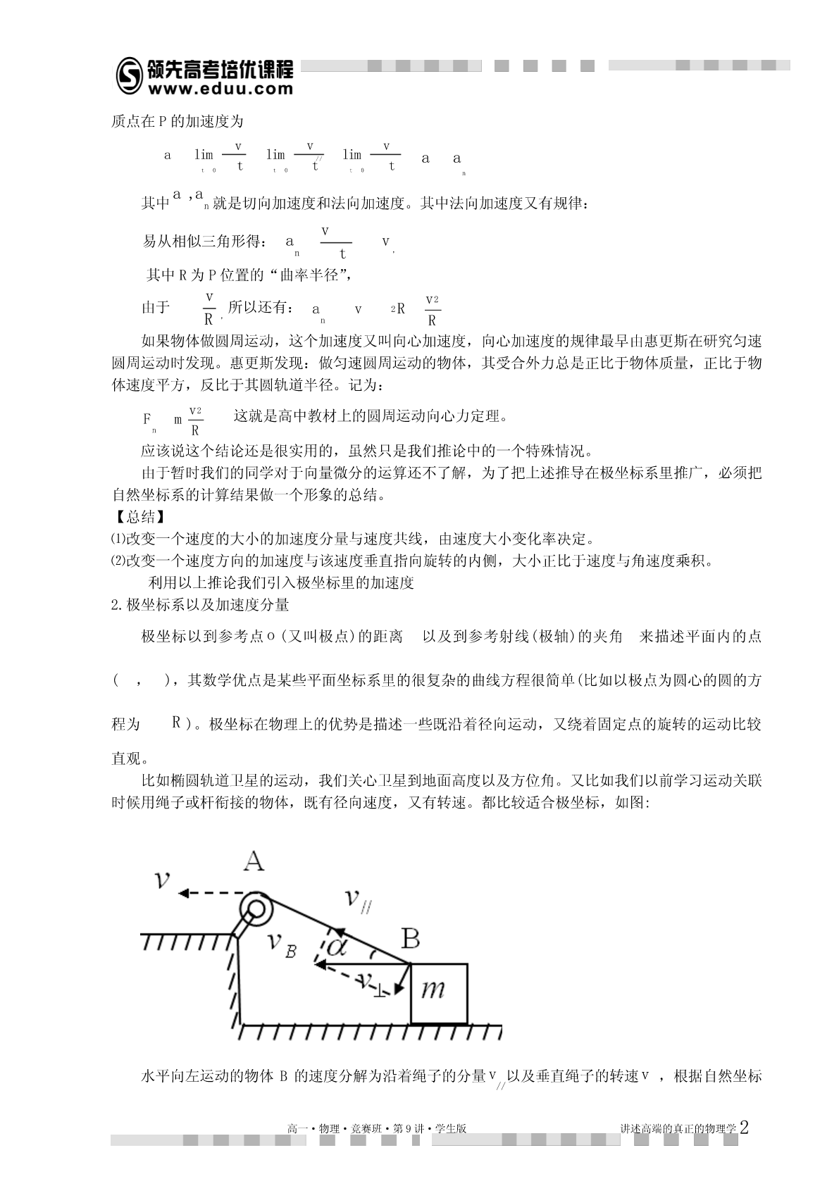 第9讲曲线运动动力学解释本讲提示:1.本讲的理论推导尽量在听懂的基础上自己能独立完成,不然容易留下“心理阴影”。2.新课为了激发兴趣肯定尽量结合实际讲,但是学习完后应该对理论有完整体系的认识。总得来说,做好受虐的心理准备,听不懂回家死磕,实在不行记得让老师下讲复习。知识点睛曲线运动中的加速度我们研究曲线运动,运用的坐标系不同,加速度分量式是不同。物理学研究的时候根据研究问题的特点不同,采用的坐标系经常不一样,比如直角坐标系,自然坐标系,极坐标系,球坐标系,注坐标系等,在高一暑假的讲义上,我们曾经铺垫过一些,本讲继续讨论。在普通的直角坐标系中,分加速度容易理解,每个坐标方向相互独立。记为:vaxxtvayytvazzt对应的动力学方程就是牛顿定律分量式,具体的应用参考我们对于抛体以及恒力曲线运动的处理,这个方法比较适合恒力作用下的曲线运动。由于浅显易懂,本讲不再重复。1.自然坐标系以及加速度分量除了直角坐标系以外,我们还经常会用自然坐标系研究加速度。有一类曲线运动是在已知轨道上进行的,这时,可以在轨道上任取一参照点o,这样就可以在轨道上用到o的距离来表示运动方程。这就是自然坐标,实际初中物理中的匀速率运动公式svt就是这个坐标系中的方程。我们把运动方向叫切向,垂直运动方向叫法向。对应的,每个方向的加速度叫切向加速度,与法向加速度。下面用数学推导相应的加速度。当质点做曲线运动时,一般速度的大小和方向都在变化。vvvvv为计算P位置加速度,将速度增量分解为与2平行的分量//和2垂直的分量1,如图:高一·物理·竞赛班·第9讲·学生版讲述高端的真正的物理学1质点在P的加速度为vvvalimlim//limaatttt0t0t0na,a其中n就是切向加速度和法向加速度。其中法向加速度又有规律:v易从相似三角形得:avnt,其中R为P位置的“曲率半径”,vv2由于所以还有:av2RR,nR如果物体做圆周运动,这个加速度又叫向心加速度,向心加速度的规律最早由惠更斯在研究匀速圆周运动时发现。惠更斯发现:做匀速圆周运动的物体,其受合外力总是正比于物体质量,正比于物体速度平方,反比于其圆轨道半径。记为:v2这就是高中教材上的圆周运动向心力定理。FmnR应该说这个结论还是很实用的,虽然只是我们推论中的一个特殊情况。由于暂时我们的同学对于向量微分的运算还不了解,为了把上述推导在极坐标系里推广,必须把自然坐标系的计算结果做一个形象的总结。【总结】⑴改变一个速度的大小的加速度分量与速度共线,由速度大小变化率决定。⑵改变一个速度方向的加速度与该速度垂直指向旋转的内侧,大小正比于速度与角速度乘积。利用以上推论我们引入极坐标里的加速度2.极坐标系以及加速度分量极坐标以到参考点o(又叫极点)的距离以及到参考射线(极轴)的夹角来描述平面内的点(,),其数学优点是某些平面坐标系里的很复杂的曲线方程很简单(比如以极点为圆心的圆的方程为R)。极坐标在物理上的优势是描述一些既沿着径向运动,又绕着固定点的旋转的运动比较直观。比如椭圆轨道卫星的运动,我们关心卫星到地面高度以及方位角。又比如我们以前学习运动关联时候用绳子或杆衔接的物体,既有径向速度,又有转速。都比较适合极坐标,如图:水平向左运动的物体B的速度分解为沿着绳子的分量v以及垂直绳子的转速v,根据自然坐标//高一·物理·竞赛班·第9讲·学生版讲述高端的真正的物理学2系得到的加速度计算原理:1.在绳子方向(径向)上一共是两个加速度,一个改变v大小,与拉绳子的加速度大小一致,另一//v2个改变v方向,大小a。RAB2.在垂直绳子方向(垂向,注意不是切向)也有两加速度,一个改变v大小,另一个改变v方向,//v2vv注意这个加速度不等于//,而等于v//。R//RABAB专业的力学教材还会对这些加速度中的某些项取一堆形象的名字方便记忆,比如著名的科里奥利加速度,平面系5个加速度等。由于这个加速度过于依赖向量微分的理解,这里就不引入了。期望着以上的讨论能引起同学们对于向量代数甚至向量微积分的兴趣,因为很复杂的物理情景理解问题在向量微积分里可以简化为几个简单的算符。学而思物理竞赛的教学一种灌输一种观点,那就是方程是最美最高效率的物理语言。开始喜欢上物理的同学一般都是因为物理对现实的超理性理解。但多数喜欢物理的人进入大