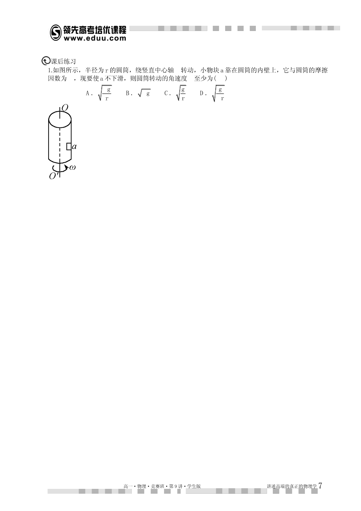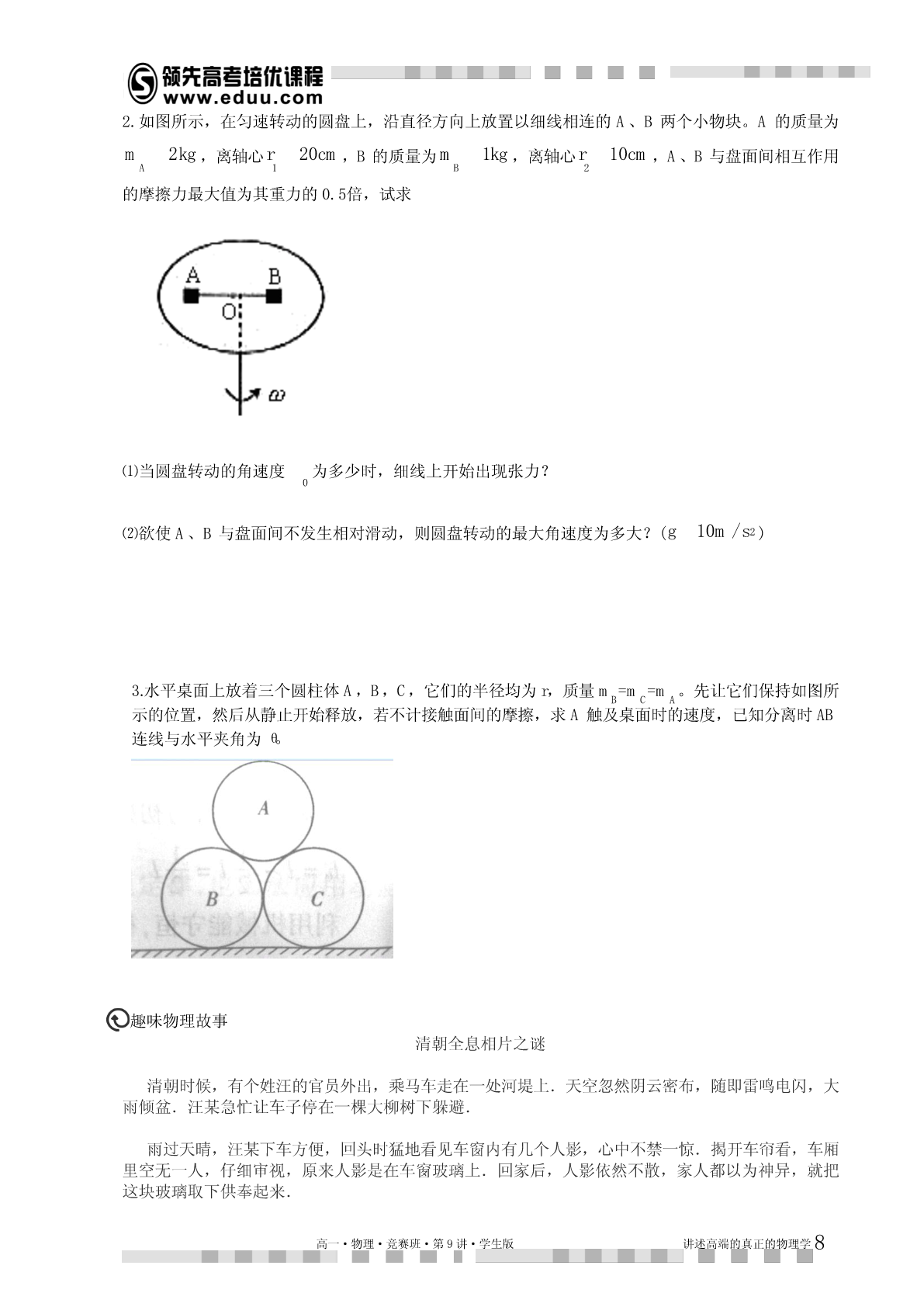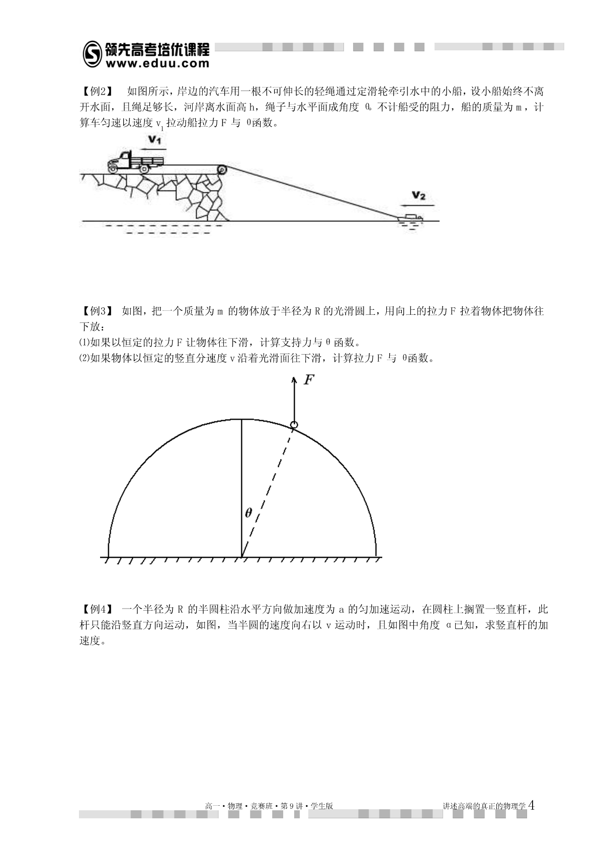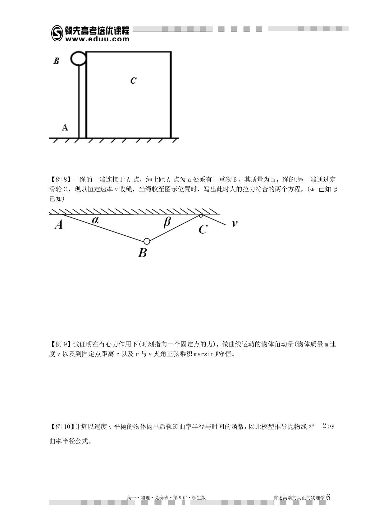 第9讲曲线运动动力学解释本讲提示:1.本讲的理论推导尽量在听懂的基础上自己能独立完成,不然容易留下“心理阴影”。2.新课为了激发兴趣肯定尽量结合实际讲,但是学习完后应该对理论有完整体系的认识。总得来说,做好受虐的心理准备,听不懂回家死磕,实在不行记得让老师下讲复习。知识点睛曲线运动中的加速度我们研究曲线运动,运用的坐标系不同,加速度分量式是不同。物理学研究的时候根据研究问题的特点不同,采用的坐标系经常不一样,比如直角坐标系,自然坐标系,极坐标系,球坐标系,注坐标系等,在高一暑假的讲义上,我们曾经铺垫过一些,本讲继续讨论。在普通的直角坐标系中,分加速度容易理解,每个坐标方向相互独立。记为:vaxxtvayytvazzt对应的动力学方程就是牛顿定律分量式,具体的应用参考我们对于抛体以及恒力曲线运动的处理,这个方法比较适合恒力作用下的曲线运动。由于浅显易懂,本讲不再重复。1.自然坐标系以及加速度分量除了直角坐标系以外,我们还经常会用自然坐标系研究加速度。有一类曲线运动是在已知轨道上进行的,这时,可以在轨道上任取一参照点o,这样就可以在轨道上用到o的距离来表示运动方程。这就是自然坐标,实际初中物理中的匀速率运动公式svt就是这个坐标系中的方程。我们把运动方向叫切向,垂直运动方向叫法向。对应的,每个方向的加速度叫切向加速度,与法向加速度。下面用数学推导相应的加速度。当质点做曲线运动时,一般速度的大小和方向都在变化。vvvvv为计算P位置加速度,将速度增量分解为与2平行的分量//和2垂直的分量1,如图:高一·物理·竞赛班·第9讲·学生版讲述高端的真正的物理学1质点在P的加速度为vvvalimlim//limaatttt0t0t0na,a其中n就是切向加速度和法向加速度。其中法向加速度又有规律:v易从相似三角形得:avnt,其中R为P位置的“曲率半径”,vv2由于所以还有:av2RR,nR如果物体做圆周运动,这个加速度又叫向心加速度,向心加速度的规律最早由惠更斯在研究匀速圆周运动时发现。惠更斯发现:做匀速圆周运动的物体,其受合外力总是正比于物体质量,正比于物体速度平方,反比于其圆轨道半径。记为:v2这就是高中教材上的圆周运动向心力定理。FmnR应该说这个结论还是很实用的,虽然只是我们推论中的一个特殊情况。由于暂时我们的同学对于向量微分的运算还不了解,为了把上述推导在极坐标系里推广,必须把自然坐标系的计算结果做一个形象的总结。【总结】⑴改变一个速度的大小的加速度分量与速度共线,由速度大小变化率决定。⑵改变一个速度方向的加速度与该速度垂直指向旋转的内侧,大小正比于速度与角速度乘积。利用以上推论我们引入极坐标里的加速度2.极坐标系以及加速度分量极坐标以到参考点o(又叫极点)的距离以及到参考射线(极轴)的夹角来描述平面内的点(,),其数学优点是某些平面坐标系里的很复杂的曲线方程很简单(比如以极点为圆心的圆的方程为R)。极坐标在物理上的优势是描述一些既沿着径向运动,又绕着固定点的旋转的运动比较直观。比如椭圆轨道卫星的运动,我们关心卫星到地面高度以及方位角。又比如我们以前学习运动关联时候用绳子或杆衔接的物体,既有径向速度,又有转速。都比较适合极坐标,如图:水平向左运动的物体B的速度分解为沿着绳子的分量v以及垂直绳子的转速v,根据自然坐标//高一·物理·竞赛班·第9讲·学生版讲述高端的真正的物理学2系得到的加速度计算原理:1.在绳子方向(径向)上一共是两个加速度,一个改变v大小,与拉绳子的加速度大小一致,另一//v2个改变v方向,大小a。RAB2.在垂直绳子方向(垂向,注意不是切向)也有两加速度,一个改变v大小,另一个改变v方向,//v2vv注意这个加速度不等于//,而等于v//。R//RABAB专业的力学教材还会对这些加速度中的某些项取一堆形象的名字方便记忆,比如著名的科里奥利加速度,平面系5个加速度等。由于这个加速度过于依赖向量微分的理解,这里就不引入了。期望着以上的讨论能引起同学们对于向量代数甚至向量微积分的兴趣,因为很复杂的物理情景理解问题在向量微积分里可以简化为几个简单的算符。学而思物理竞赛的教学一种灌输一种观点,那就是方程是最美最高效率的物理语言。开始喜欢上物理的同学一般都是因为物理对现实的超理性理解。但多数喜欢物理的人进入大