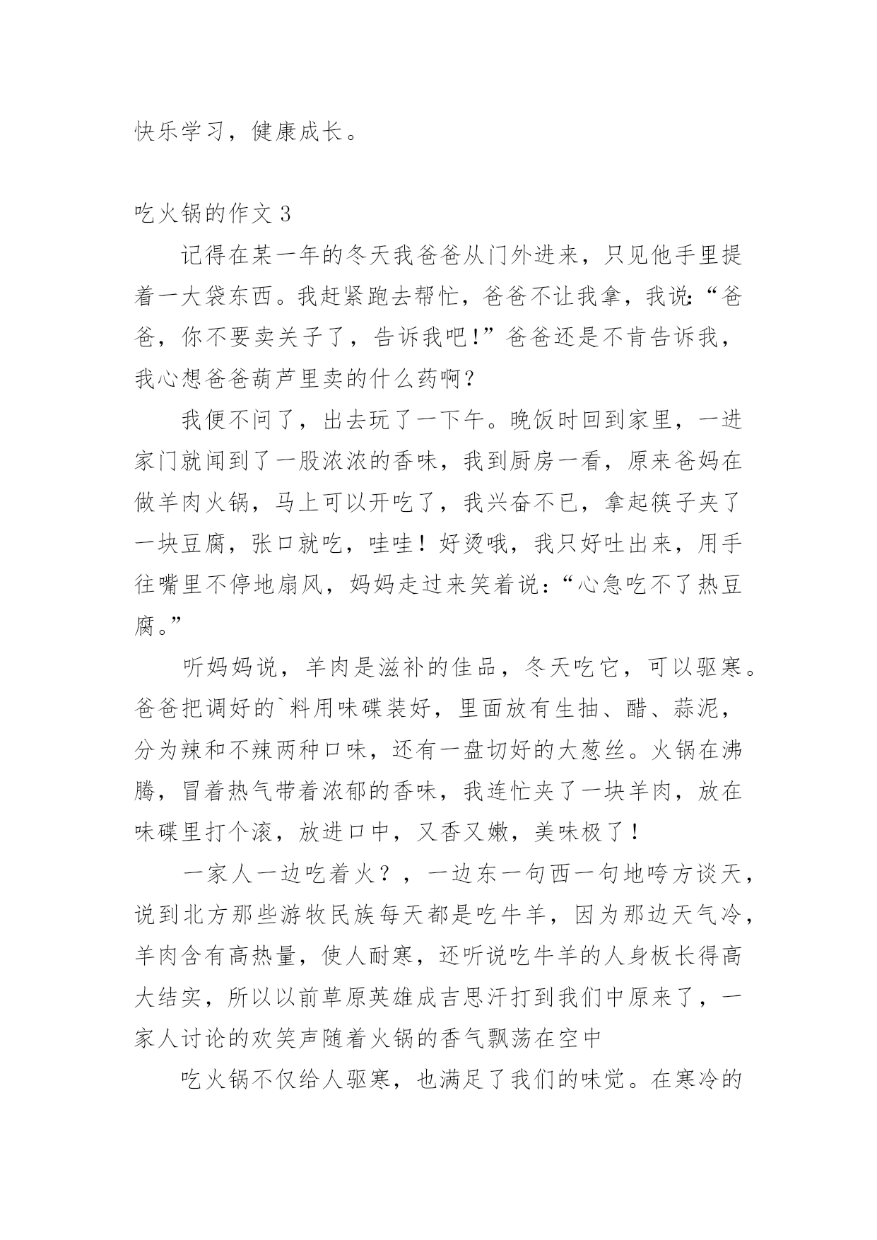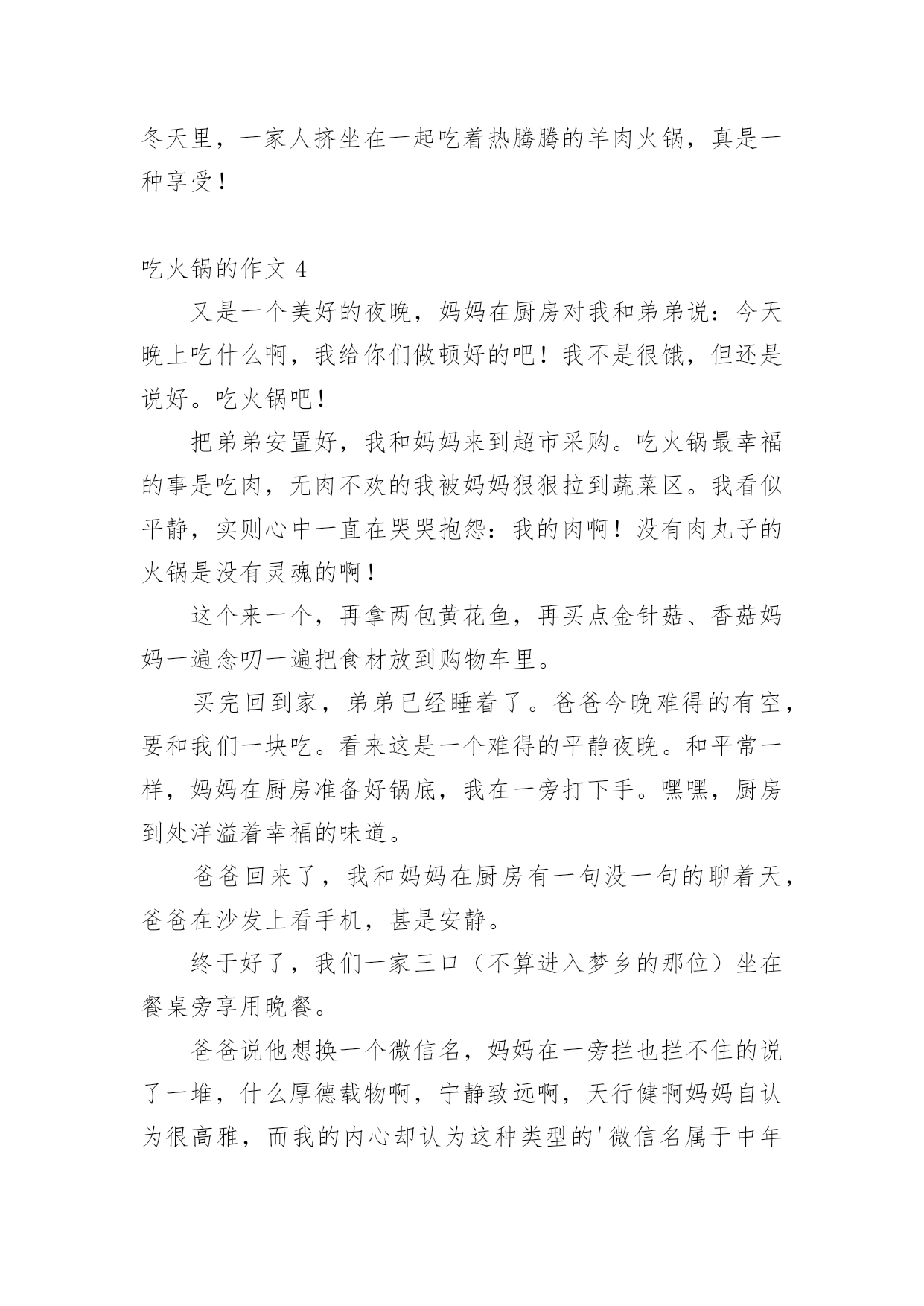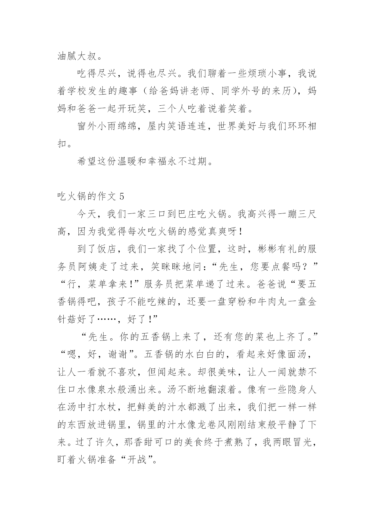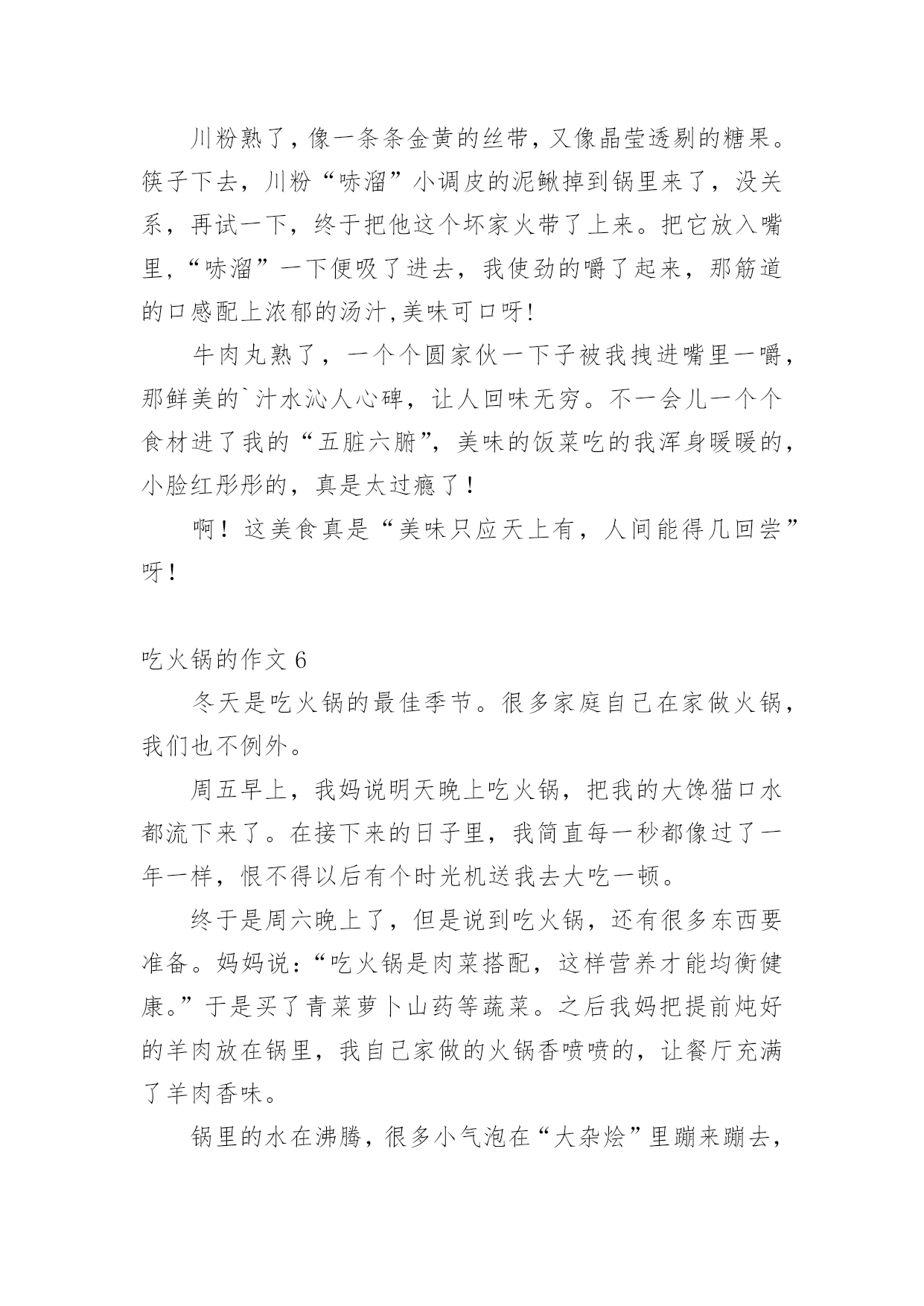 吃火锅的作文在平平淡淡的学习、工作、生活中,大家都经常接触到作文吧,作文要求篇章结构完整,一定要避免无结尾作文的出现。那么你知道一篇好的作文该怎么写吗?下面是小编收集整理的吃火锅的作文,仅供参考,希望能够帮助到大家。吃火锅的作文1今天,我上完二课一边走一边想:今天午饭会吃什么呢?我看了看阴沉沉的天,哆嗦了一下,心想:要是能吃上热乎乎的火锅就好了。想着想着我的肚子就咕噜咕噜地叫了起来,于是我雷厉风行地跑回家。我刚到家门口,还没进楼门就有一股火锅味钻进了我的鼻孔。这时我想:这不是火锅的味道吗,是谁家在做火锅呢?真是羡慕极了。我把家门打开进去一看,哦,原来火锅的香味是从我家传出的。我来到餐桌前,一股股香气钻入我的鼻孔,使我垂涎三尺。我们终于开饭了,我恨不得把所有的菜一下子扣进锅里,连锅带肉啊呜啊呜全塞进嘴里。我先把羊肉放进锅中,不一会儿羊肉就好了。我赶紧把羊肉夹到碗里,蘸了蘸调料,放入嘴里。啊,真是太好吃了!我吃了这个吃那个,吃了那个吃这个,我们整整吃了两个小时,终于火锅里连一个渣子都不剩了。我听说只要在冬天吃了让人热血沸腾的.食物整个冬天都不会冷,今天我们吃了热腾腾的火锅估计这个冬天是不会再冷了!这真是快乐的一天!吃火锅的作文2今天已经是8月28日,离暑假结束、开学来临还有没几天。爸爸、妈妈为了庆祝我又上了一年级,成为六年级学生,特意地让我去上林坊的“好吃香”火锅店大吃一顿。我开心极了。晚上,我们一家三口来到火锅店里,一股弥漫着羊肉味的风扑鼻而来。我们找了一张方桌坐下来,这儿人挺多的,有的在谈笑风生,有的在涮着羊肉,有的`在喝饮料。妈妈拿起菜单,点了一些我们爱吃的菜。不一会儿,服务员就拿来了一个大锅底和一些菜。锅底下的火焰像调皮的男孩不停地往上窜。锅里的水像一个个浪娃娃在大海里翻江倒海。水开了!我连忙拿起新鲜的羊肉放进锅里,不停地涮,鲜红的羊肉渐渐地变成了肉色。熟了,熟了!我马上捞起羊肉,蘸了点酱,囫囵地给咽了下去。真是好吃。爸爸、妈妈也拿起贡丸、草鱼片、四川粉条放进滚烫的热锅中。一股股热气不停地往上冒,不停地吹热泡泡。我从锅里夹起一根透明的粉条,放进嘴里,又好吃又有弹性,我一连吃了好多根。爸爸、妈妈也吃了许多。这次吃得可真过瘾。回到家里,我在想:“如今我要上六年级了,爸爸、妈妈就庆祝我又上了一年级。又买书包又买辅导书。而那些贫困山区的孩子连学都没得上,连一本像样的书都没见过。真是可怜!我们长大了一定会让那些贫困孩子像城里人一样快乐学习,健康成长。吃火锅的作文3记得在某一年的冬天我爸爸从门外进来,只见他手里提着一大袋东西。我赶紧跑去帮忙,爸爸不让我拿,我说:“爸爸,你不要卖关子了,告诉我吧!”爸爸还是不肯告诉我,我心想爸爸葫芦里卖的什么药啊?我便不问了,出去玩了一下午。晚饭时回到家里,一进家门就闻到了一股浓浓的香味,我到厨房一看,原来爸妈在做羊肉火锅,马上可以开吃了,我兴奋不已,拿起筷子夹了一块豆腐,张口就吃,哇哇!好烫哦,我只好吐出来,用手往嘴里不停地扇风,妈妈走过来笑着说:“心急吃不了热豆腐。”听妈妈说,羊肉是滋补的佳品,冬天吃它,可以驱寒。爸爸把调好的`料用味碟装好,里面放有生抽、醋、蒜泥,分为辣和不辣两种口味,还有一盘切好的大葱丝。火锅在沸腾,冒着热气带着浓郁的香味,我连忙夹了一块羊肉,放在味碟里打个滚,放进口中,又香又嫩,美味极了!一家人一边吃着火?,一边东一句西一句地咵方谈天,说到北方那些游牧民族每天都是吃牛羊,因为那边天气冷,羊肉含有高热量,使人耐寒,还听说吃牛羊的人身板长得高大结实,所以以前草原英雄成吉思汗打到我们中原来了,一家人讨论的欢笑声随着火锅的香气飘荡在空中吃火锅不仅给人驱寒,也满足了我们的味觉。在寒冷的冬天里,一家人挤坐在一起吃着热腾腾的羊肉火锅,真是一种享受!吃火锅的作文4又是一个美好的夜晚,妈妈在厨房对我和弟弟说:今天晚上吃什么啊,我给你们做顿好的吧!我不是很饿,但还是说好。吃火锅吧!把弟弟安置好,我和妈妈来到超市采购。吃火锅最幸福的事是吃肉,无肉不欢的我被妈妈狠狠拉到蔬菜区。我看似平静,实则心中一直在哭哭抱怨:我的肉啊!没有肉丸子的火锅是没有灵魂的啊!这个来一个,再拿两包黄花鱼,再买点金针菇、香菇妈妈一遍念叨一遍把食材放到购物车里。买完回到家,弟弟已经睡着了。爸爸今晚难得的有空,要和我们一块吃。看来这是一个难得的平静夜晚。和平常一样,妈妈在厨房准备好锅底,我在一旁打下手。嘿嘿,厨房到处洋溢着幸福的味道。爸爸回来了,我和妈妈在厨房有一句没一句的聊着天,爸爸在沙发上看手机,甚是安静。终于好了,我们一家三口(不算进入梦乡的那位)坐在餐桌旁享用晚餐。爸爸说他想换一个微信名,妈妈在一旁拦也拦不住的说了一堆,什么厚德载物啊,宁静致远啊,天行健啊妈妈自认为很高雅,而我的内心却认为这种类型的'微信名属于中年油腻