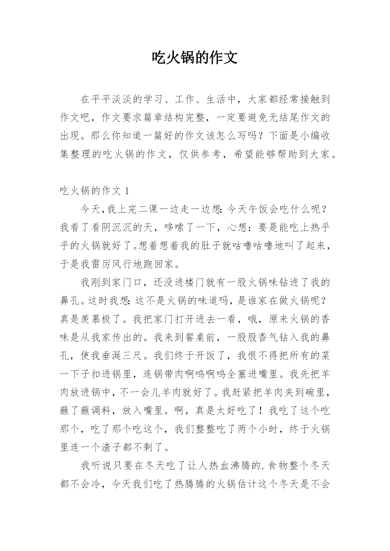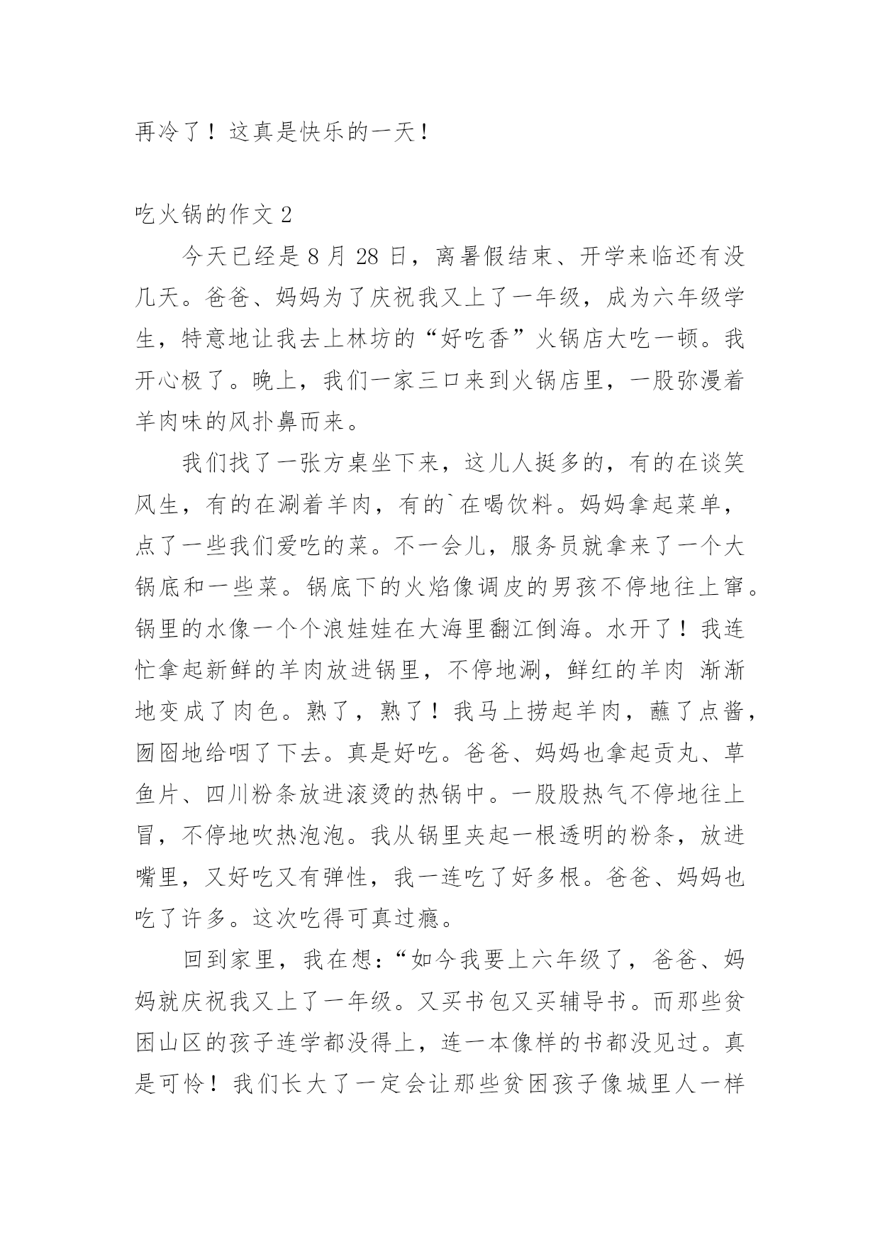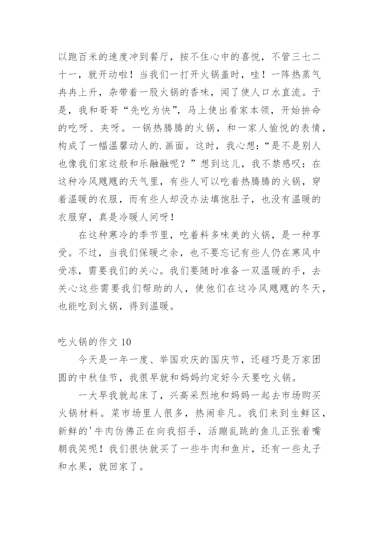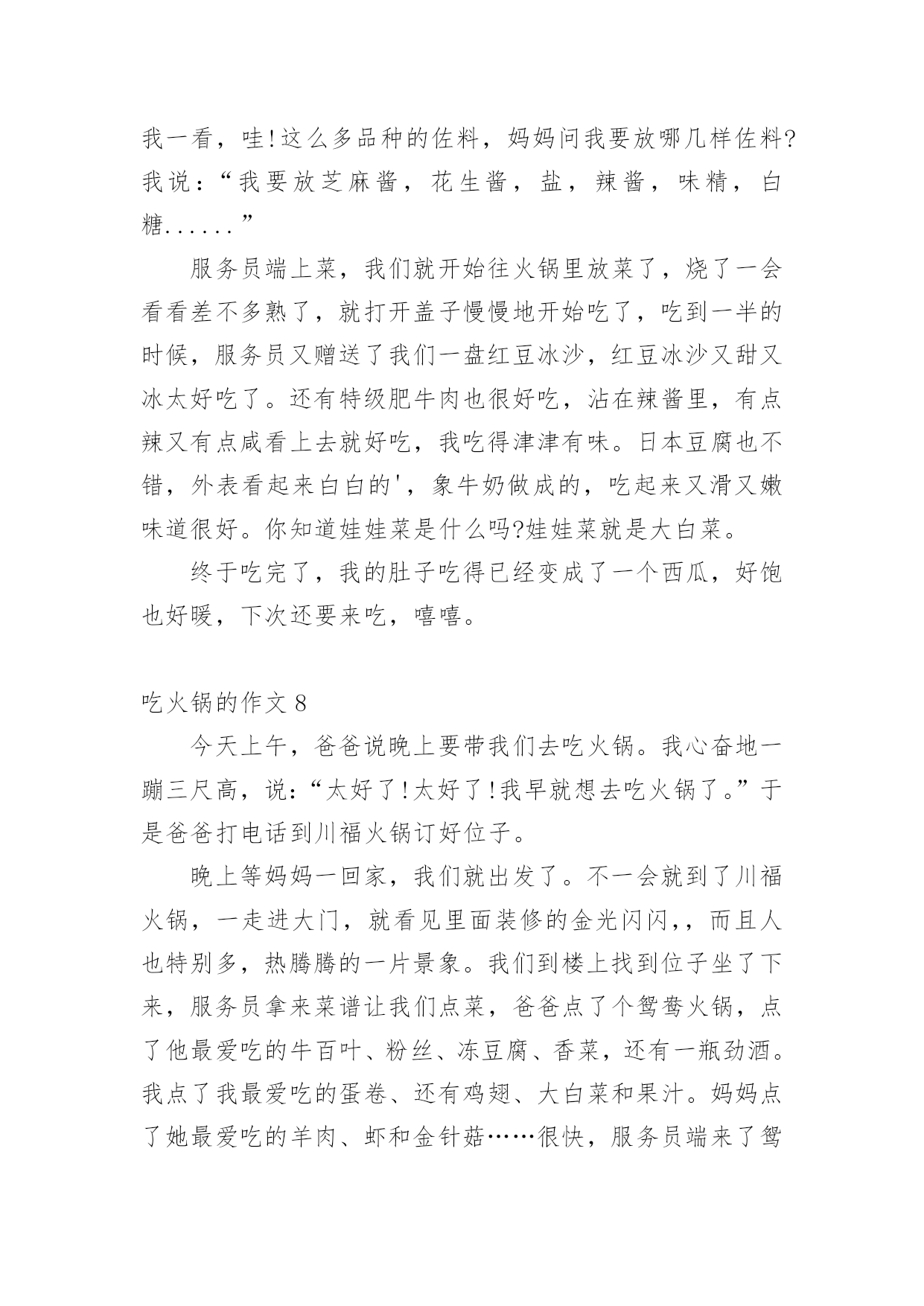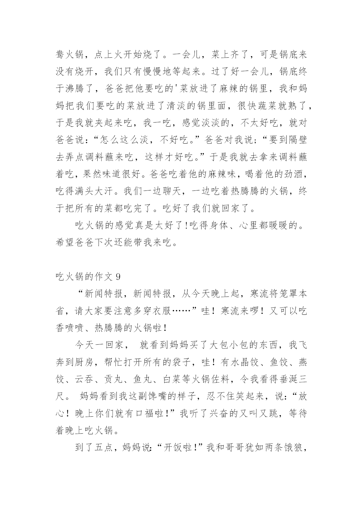 吃火锅的作文在平平淡淡的学习、工作、生活中,大家都经常接触到作文吧,作文要求篇章结构完整,一定要避免无结尾作文的出现。那么你知道一篇好的作文该怎么写吗?下面是小编收集整理的吃火锅的作文,仅供参考,希望能够帮助到大家。吃火锅的作文1今天,我上完二课一边走一边想:今天午饭会吃什么呢?我看了看阴沉沉的天,哆嗦了一下,心想:要是能吃上热乎乎的火锅就好了。想着想着我的肚子就咕噜咕噜地叫了起来,于是我雷厉风行地跑回家。我刚到家门口,还没进楼门就有一股火锅味钻进了我的鼻孔。这时我想:这不是火锅的味道吗,是谁家在做火锅呢?真是羡慕极了。我把家门打开进去一看,哦,原来火锅的香味是从我家传出的。我来到餐桌前,一股股香气钻入我的鼻孔,使我垂涎三尺。我们终于开饭了,我恨不得把所有的菜一下子扣进锅里,连锅带肉啊呜啊呜全塞进嘴里。我先把羊肉放进锅中,不一会儿羊肉就好了。我赶紧把羊肉夹到碗里,蘸了蘸调料,放入嘴里。啊,真是太好吃了!我吃了这个吃那个,吃了那个吃这个,我们整整吃了两个小时,终于火锅里连一个渣子都不剩了。我听说只要在冬天吃了让人热血沸腾的.食物整个冬天都不会冷,今天我们吃了热腾腾的火锅估计这个冬天是不会再冷了!这真是快乐的一天!吃火锅的作文2今天已经是8月28日,离暑假结束、开学来临还有没几天。爸爸、妈妈为了庆祝我又上了一年级,成为六年级学生,特意地让我去上林坊的“好吃香”火锅店大吃一顿。我开心极了。晚上,我们一家三口来到火锅店里,一股弥漫着羊肉味的风扑鼻而来。我们找了一张方桌坐下来,这儿人挺多的,有的在谈笑风生,有的在涮着羊肉,有的`在喝饮料。妈妈拿起菜单,点了一些我们爱吃的菜。不一会儿,服务员就拿来了一个大锅底和一些菜。锅底下的火焰像调皮的男孩不停地往上窜。锅里的水像一个个浪娃娃在大海里翻江倒海。水开了!我连忙拿起新鲜的羊肉放进锅里,不停地涮,鲜红的羊肉渐渐地变成了肉色。熟了,熟了!我马上捞起羊肉,蘸了点酱,囫囵地给咽了下去。真是好吃。爸爸、妈妈也拿起贡丸、草鱼片、四川粉条放进滚烫的热锅中。一股股热气不停地往上冒,不停地吹热泡泡。我从锅里夹起一根透明的粉条,放进嘴里,又好吃又有弹性,我一连吃了好多根。爸爸、妈妈也吃了许多。这次吃得可真过瘾。回到家里,我在想:“如今我要上六年级了,爸爸、妈妈就庆祝我又上了一年级。又买书包又买辅导书。而那些贫困山区的孩子连学都没得上,连一本像样的书都没见过。真是可怜!我们长大了一定会让那些贫困孩子像城里人一样快乐学习,健康成长。吃火锅的作文3记得在某一年的冬天我爸爸从门外进来,只见他手里提着一大袋东西。我赶紧跑去帮忙,爸爸不让我拿,我说:“爸爸,你不要卖关子了,告诉我吧!”爸爸还是不肯告诉我,我心想爸爸葫芦里卖的什么药啊?我便不问了,出去玩了一下午。晚饭时回到家里,一进家门就闻到了一股浓浓的香味,我到厨房一看,原来爸妈在做羊肉火锅,马上可以开吃了,我兴奋不已,拿起筷子夹了一块豆腐,张口就吃,哇哇!好烫哦,我只好吐出来,用手往嘴里不停地扇风,妈妈走过来笑着说:“心急吃不了热豆腐。”听妈妈说,羊肉是滋补的佳品,冬天吃它,可以驱寒。爸爸把调好的`料用味碟装好,里面放有生抽、醋、蒜泥,分为辣和不辣两种口味,还有一盘切好的大葱丝。火锅在沸腾,冒着热气带着浓郁的香味,我连忙夹了一块羊肉,放在味碟里打个滚,放进口中,又香又嫩,美味极了!一家人一边吃着火?,一边东一句西一句地咵方谈天,说到北方那些游牧民族每天都是吃牛羊,因为那边天气冷,羊肉含有高热量,使人耐寒,还听说吃牛羊的人身板长得高大结实,所以以前草原英雄成吉思汗打到我们中原来了,一家人讨论的欢笑声随着火锅的香气飘荡在空中吃火锅不仅给人驱寒,也满足了我们的味觉。在寒冷的冬天里,一家人挤坐在一起吃着热腾腾的羊肉火锅,真是一种享受!吃火锅的作文4又是一个美好的夜晚,妈妈在厨房对我和弟弟说:今天晚上吃什么啊,我给你们做顿好的吧!我不是很饿,但还是说好。吃火锅吧!把弟弟安置好,我和妈妈来到超市采购。吃火锅最幸福的事是吃肉,无肉不欢的我被妈妈狠狠拉到蔬菜区。我看似平静,实则心中一直在哭哭抱怨:我的肉啊!没有肉丸子的火锅是没有灵魂的啊!这个来一个,再拿两包黄花鱼,再买点金针菇、香菇妈妈一遍念叨一遍把食材放到购物车里。买完回到家,弟弟已经睡着了。爸爸今晚难得的有空,要和我们一块吃。看来这是一个难得的平静夜晚。和平常一样,妈妈在厨房准备好锅底,我在一旁打下手。嘿嘿,厨房到处洋溢着幸福的味道。爸爸回来了,我和妈妈在厨房有一句没一句的聊着天,爸爸在沙发上看手机,甚是安静。终于好了,我们一家三口(不算进入梦乡的那位)坐在餐桌旁享用晚餐。爸爸说他想换一个微信名,妈妈在一旁拦也拦不住的说了一堆,什么厚德载物啊,宁静致远啊,天行健啊妈妈自认为很高雅,而我的内心却认为这种类型的'微信名属于中年油腻