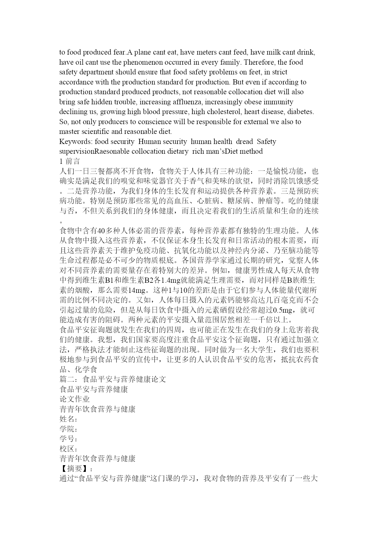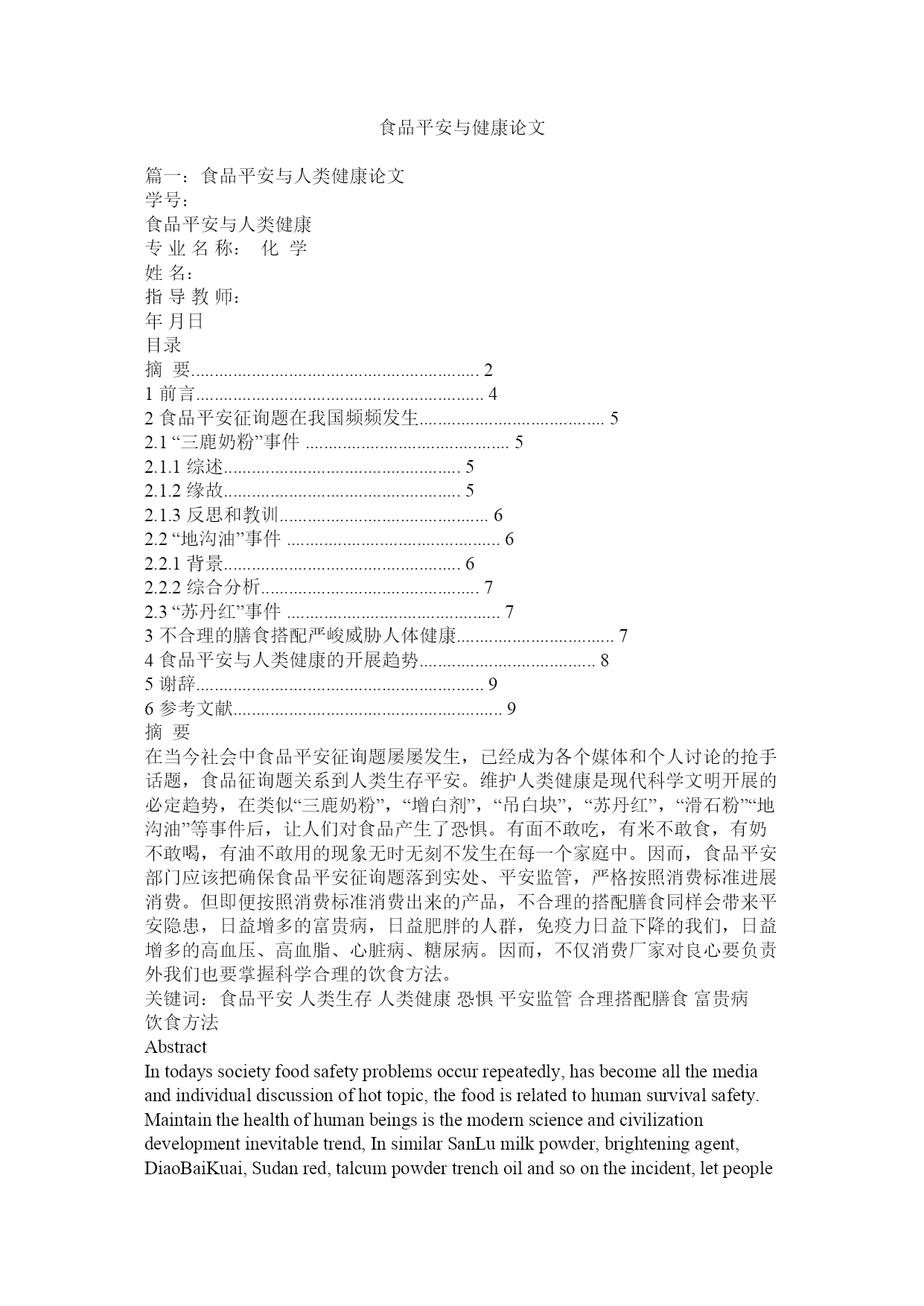 食品平安与健康论文篇一:食品平安与人类健康论文学号:食品平安与人类健康专业名称:化学姓名:指导教师:年月日目录摘要..............................................................21前言..............................................................42食品平安征询题在我国频频发生........................................52.1“三鹿奶粉”事件............................................52.1.1综述...................................................52.1.2缘故...................................................52.1.3反思和教训.............................................62.2“地沟油”事件..............................................62.2.1背景...................................................62.2.2综合分析...............................................72.3“苏丹红”事件..............................................73不合理的膳食搭配严峻威胁人体健康..................................74食品平安与人类健康的开展趋势......................................85谢辞..............................................................96参考文献..........................................................9摘要在当今社会中食品平安征询题屡屡发生,已经成为各个媒体和个人讨论的抢手话题,食品征询题关系到人类生存平安。维护人类健康是现代科学文明开展的必定趋势,在类似“三鹿奶粉”,“增白剂”,“吊白块”,“苏丹红”,“滑石粉”“地沟油”等事件后,让人们对食品产生了恐惧。有面不敢吃,有米不敢食,有奶不敢喝,有油不敢用的现象无时无刻不发生在每一个家庭中。因而,食品平安部门应该把确保食品平安征询题落到实处、平安监管,严格按照消费标准进展消费。但即便按照消费标准消费出来的产品,不合理的搭配膳食同样会带来平安隐患,日益增多的富贵病,日益肥胖的人群,免疫力日益下降的我们,日益增多的高血压、高血脂、心脏病、糖尿病。因而,不仅消费厂家对良心要负责外我们也要掌握科学合理的饮食方法。关键词:食品平安人类生存人类健康恐惧平安监管合理搭配膳食富贵病饮食方法AbstractIntodayssocietyfoodsafetyproblemsoccurrepeatedly,hasbecomeallthemediaandindividualdiscussionofhottopic,thefoodisrelatedtohumansurvivalsafety.Maintainthehealthofhumanbeingsisthemodernscienceandcivilizationdevelopmentinevitabletrend,InsimilarSanLumilkpowder,brighteningagent,DiaoBaiKuai,Sudanred,talcumpowdertrenchoilandsoontheincident,letpeopletofoodproducedfear.Aplanecanteat,havemeterscantfeed,havemilkcantdrink,haveoilcantusethephenomenonoccurredineveryfamily.Therefore,thefoodsafetydepartmentshouldensurethatfoodsafetyproblemsonfeet,instrictaccordancewiththeproductionstandardforproduction.Butevenifaccordingtoproductionstandardproducedproducts,notreasonab