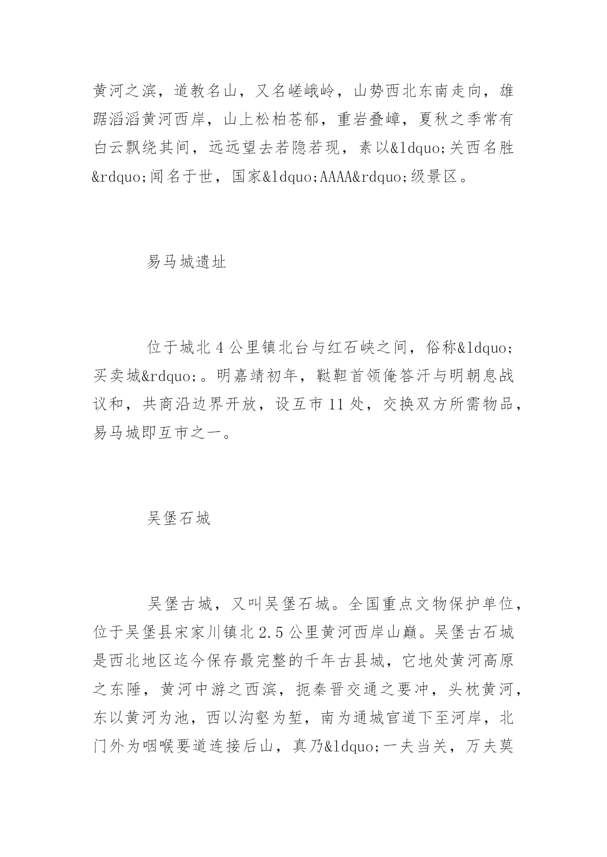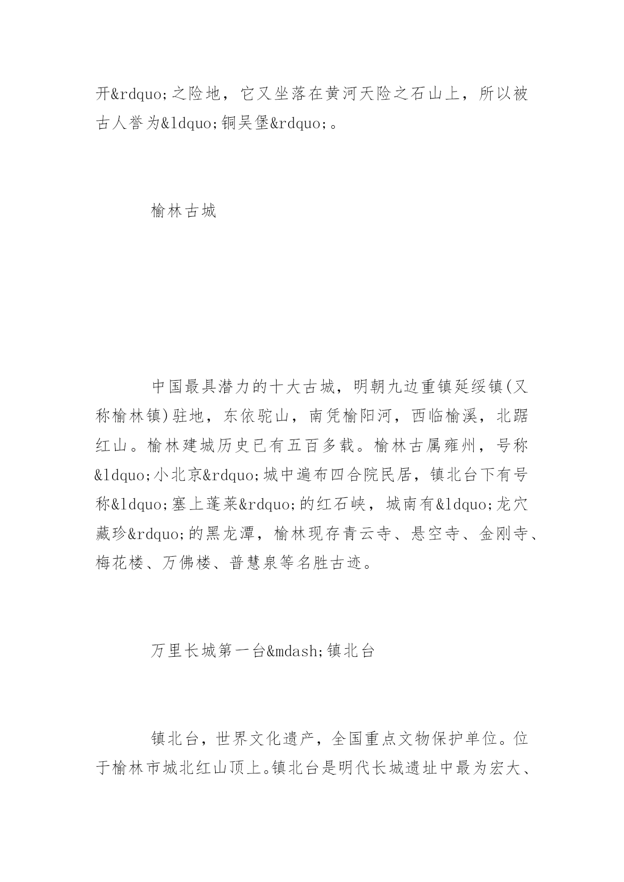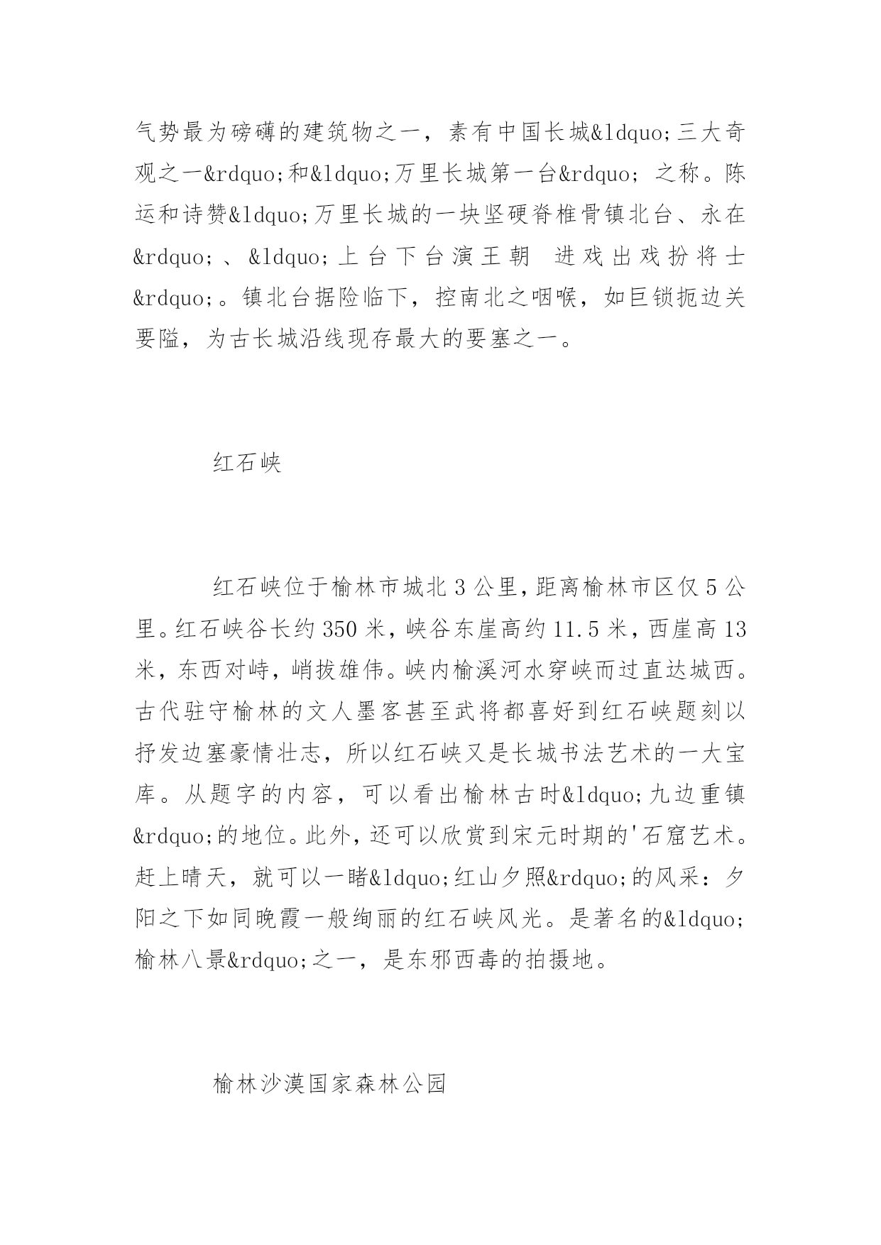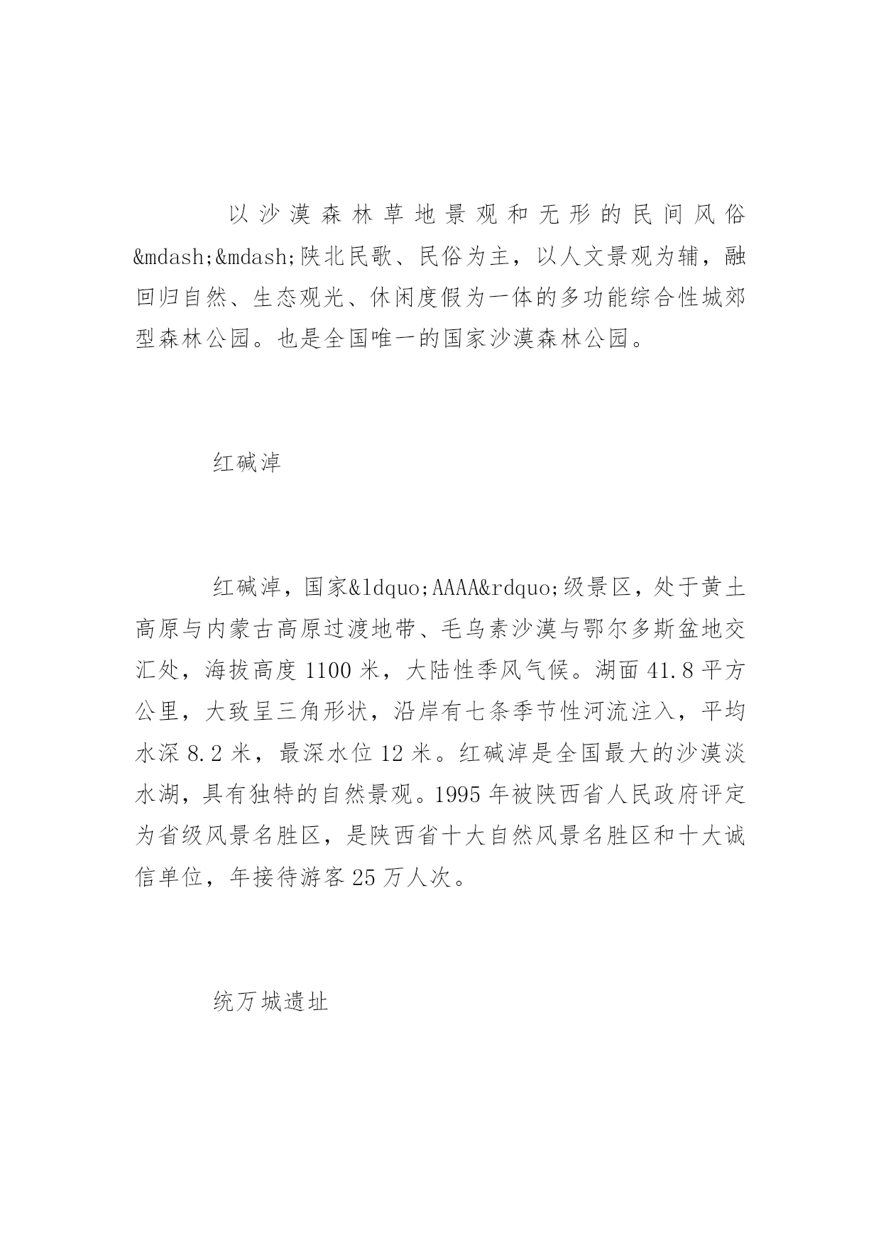 榆林旅游景点榆林旅游景点大全榆林是国家历史文化名城,国家历史文化名城重要标志。以下为您带来榆林旅游景点大全,欢迎浏览!盘龙山古建筑群(李自成行宫)位于米脂县北的盘龙山上,盘龙山原名马鞍山,是省级重点文物保护单位。李自成行宫是李自成在西安建立大顺国后,其侄李过奉命回米脂修建的。行宫依山据险,前后2层90级台阶,将秀丽别致的乐楼、梅花亭、捧圣楼、二天门以及凌空而立的玉皇阁联结托起,蜿蜒有序地直上山巅。白云山佳县白云山位于陕西省榆林市佳县城南5公里处的黄河之滨,道教名山,又名嵯峨岭,山势西北东南走向,雄踞滔滔黄河西岸,山上松柏苍郁,重岩叠嶂,夏秋之季常有白云飘绕其间,远远望去若隐若现,素以“关西名胜”闻名于世,国家“AAAA”级景区。易马城遗址位于城北4公里镇北台与红石峡之间,俗称“买卖城”。明嘉靖初年,鞑靼首领俺答汗与明朝息战议和,共商沿边界开放,设互市11处,交换双方所需物品,易马城即互市之一。吴堡石城吴堡古城,又叫吴堡石城。全国重点文物保护单位,位于吴堡县宋家川镇北2.5公里黄河西岸山巅。吴堡古石城是西北地区迄今保存最完整的千年古县城,它地处黄河高原之东陲,黄河中游之西滨,扼秦晋交通之要冲,头枕黄河,东以黄河为池,西以沟壑为堑,南为通城官道下至河岸,北门外为咽喉要道连接后山,真乃“一夫当关,万夫莫开”之险地,它又坐落在黄河天险之石山上,所以被古人誉为“铜吴堡”。榆林古城中国最具潜力的十大古城,明朝九边重镇延绥镇(又称榆林镇)驻地,东依驼山,南凭榆阳河,西临榆溪,北踞红山。榆林建城历史已有五百多载。榆林古属雍州,号称“小北京”城中遍布四合院民居,镇北台下有号称“塞上蓬莱”的红石峡,城南有“龙穴藏珍”的黑龙潭,榆林现存青云寺、悬空寺、金刚寺、梅花楼、万佛楼、普慧泉等名胜古迹。万里长城第一台—镇北台镇北台,世界文化遗产,全国重点文物保护单位。位于榆林市城北红山顶上。镇北台是明代长城遗址中最为宏大、气势最为磅礴的建筑物之一,素有中国长城“三大奇观之一”和“万里长城第一台”之称。陈运和诗赞“万里长城的一块坚硬脊椎骨镇北台、永在”、“上台下台演王朝进戏出戏扮将士”。镇北台据险临下,控南北之咽喉,如巨锁扼边关要隘,为古长城沿线现存最大的要塞之一。红石峡红石峡位于榆林市城北3公里,距离榆林市区仅5公里。红石峡谷长约350米,峡谷东崖高约11.5米,西崖高13米,东西对峙,峭拔雄伟。峡内榆溪河水穿峡而过直达城西。古代驻守榆林的文人墨客甚至武将都喜好到红石峡题刻以抒发边塞豪情壮志,所以红石峡又是长城书法艺术的一大宝库。从题字的内容,可以看出榆林古时“九边重镇”的地位。此外,还可以欣赏到宋元时期的'石窟艺术。赶上晴天,就可以一睹“红山夕照”的风采:夕阳之下如同晚霞一般绚丽的红石峡风光。是著名的“榆林八景”之一,是东邪西毒的拍摄地。榆林沙漠国家森林公园以沙漠森林草地景观和无形的民间风俗——陕北民歌、民俗为主,以人文景观为辅,融回归自然、生态观光、休闲度假为一体的多功能综合性城郊型森林公园。也是全国唯一的国家沙漠森林公园。红碱淖红碱淖,国家“AAAA”级景区,处于黄土高原与内蒙古高原过渡地带、毛乌素沙漠与鄂尔多斯盆地交汇处,海拔高度1100米,大陆性季风气候。湖面41.8平方公里,大致呈三角形状,沿岸有七条季节性河流注入,平均水深8.2米,最深水位12米。红碱淖是全国最大的沙漠淡水湖,具有独特的自然景观。1995年被陕西省人民政府评定为省级风景名胜区,是陕西省十大自然风景名胜区和十大诚信单位,年接待游客25万人次。统万城遗址统万城,因其城墙为白色,当地人称白城子。又因系赫连勃勃所建,故又称为赫连城。为东晋时南匈奴贵族赫连勃勃建立的大夏国都城遗址,也是匈奴族在人类历史长河中留下的唯一一座都城遗址,是中国北方最早、最著名的都城,[1-2]已有近1600年历史。统万城始建于公元413年,竣工于公元418年,由汉奢延城改筑而成。后来在北魏太武皇帝拓跋焘一统北方期间,统万城被攻克,从此设置为统万军镇。