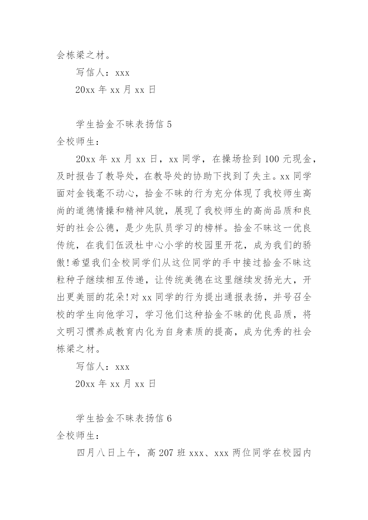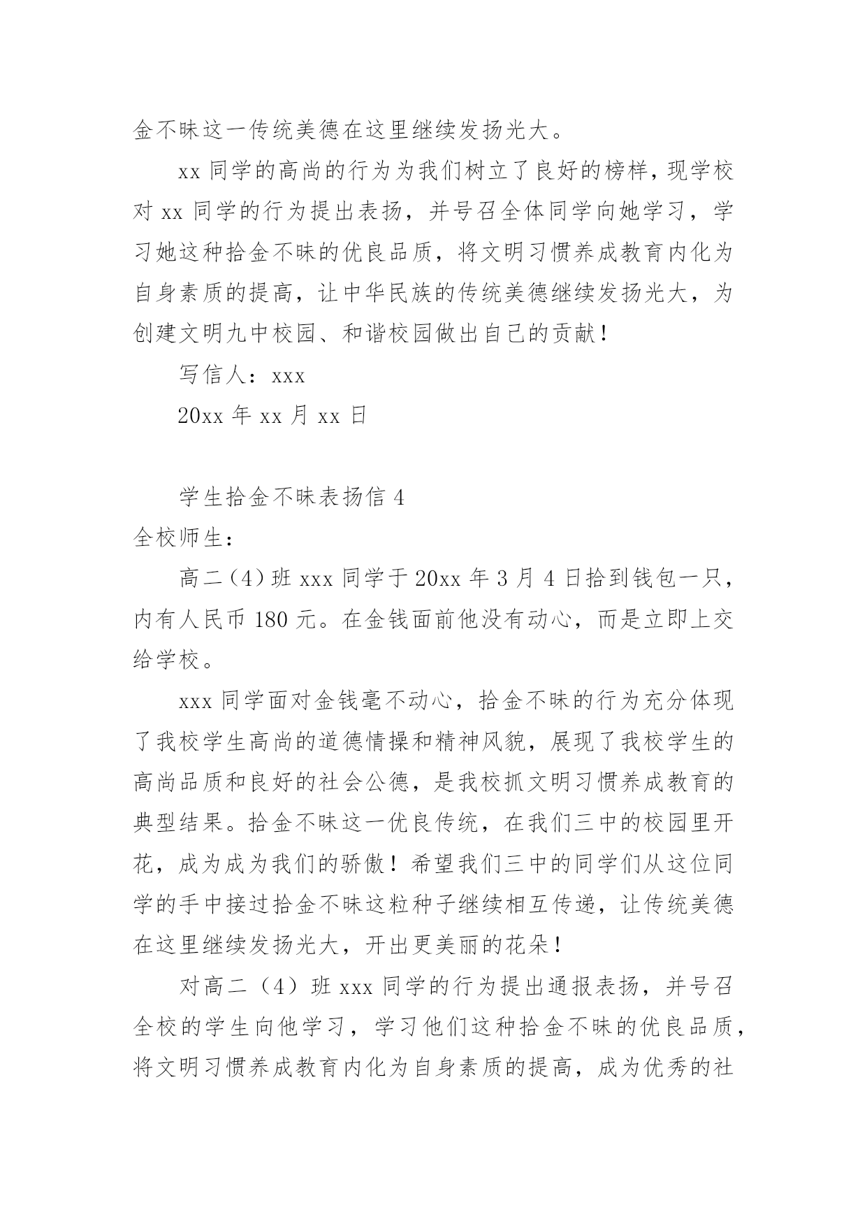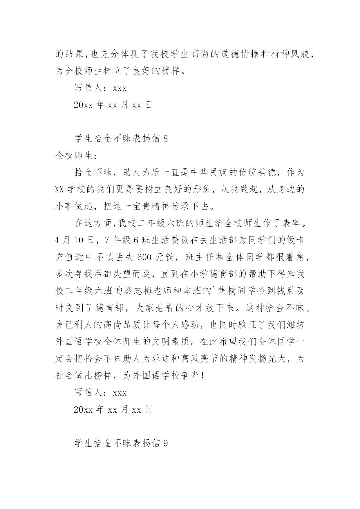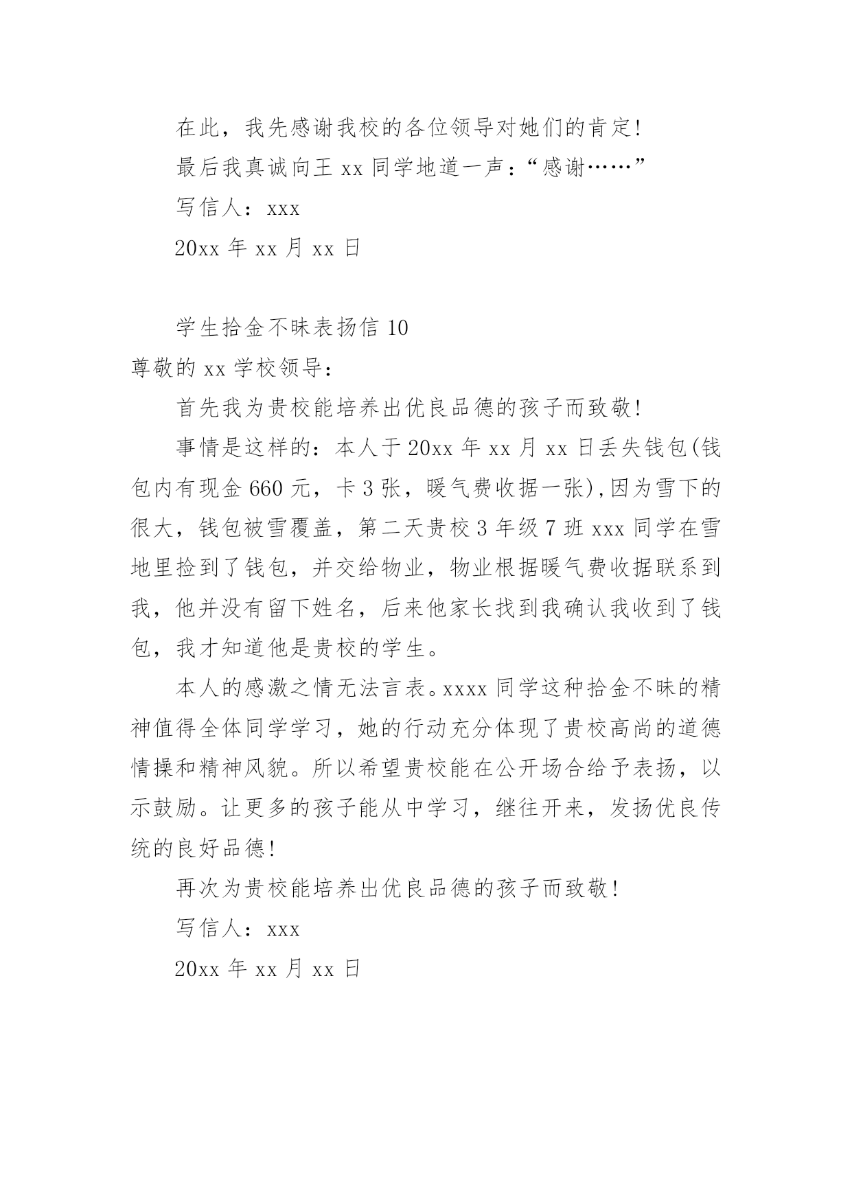 学生拾金不昧表扬信拾金不昧的意思是拾到东西并不隐瞒下来据为己有,指良好的人的道德和社会风尚。以下是小编为大家整理的学生拾金不昧表扬信(精选10篇),仅供参考,欢迎大家阅读。学生拾金不昧表扬信1全校师生:20xx年x月xx日晚上8点左右,我院轻化112班xxx同学在梁林校区一号楼门口捡到钱包一只,内有近千元现金和卡。面对如此大额的现金诱惑,xxx同学却没有动心,最后将钱包交给梁林校区大门口的值班保卫人员,请他们协助寻找失主。xxx同学以他的实际行动充分展现了我院学子高尚的道德情操和精神风貌,堪称全体同学的榜样。学院团总支对xxx同学这种拾金不昧的行为提出通报表扬,并号召学院全体团员青年向他学习这种拾金不昧的优良品质,将文明习惯养成教育内化为自身素质的提高,成为优秀的社会栋梁之材。写信人:xxx20xx年xx月xx日学生拾金不昧表扬信2全校师生:20xx年12月12日星期五下午,机械工程系工模S08-1班学习委员xxx在执行本班工作时,在楼道口碰见宿管阿姨,因有一位学生家长来办理退学手续,宿管阿姨一时离不开,便让此时正打算外出的xxx代她去查看下这位退学的学生床位是否有损坏,热心的xxx一口答应了,但在他检查的时候却惊讶的发现一个附有三张银行卡和一张身份证的钱包,经家长证实不是其孩子物品,问其他寝室成员也一一否认,于是怀着一颗拾金不昧的心,xxx毅然将偶得的钱包交给了学校老师。在这物欲横流的社会里,xxx能这样拾金不昧确实是难能可贵,他的行动充分体现了工院学子高尚的道德情操和精神风貌。同时这样拾金不昧的行为也是对我校精神文明建设的成果的肯定!在提倡和谐社会的今天,拾金不昧这种精神更是值得大力提倡和鼓励的。写信人:xxx20xx年xx月xx日学生拾金不昧表扬信3全校师生:xx时,我校xx班xxx同学在xx地方捡到xx。在利益面前她没有动私心,而是立即将xx交给了班主任。她的行为充分体现了我校学生高尚的道德情操和精神风貌,展现了我校学生的高尚品质和良好的社会公德,是我校“规范学生行为,争做文明学生”养成教育的典型模范。希望我校学生从这位同学手中接过拾金不昧这粒种子继续相互传递,让拾金不昧这一传统美德在这里继续发扬光大。xx同学的高尚的行为为我们树立了良好的榜样,现学校对xx同学的行为提出表扬,并号召全体同学向她学习,学习她这种拾金不昧的优良品质,将文明习惯养成教育内化为自身素质的提高,让中华民族的传统美德继续发扬光大,为创建文明九中校园、和谐校园做出自己的贡献!写信人:xxx20xx年xx月xx日学生拾金不昧表扬信4全校师生:高二(4)班xxx同学于20xx年3月4日拾到钱包一只,内有人民币180元。在金钱面前他没有动心,而是立即上交给学校。xxx同学面对金钱毫不动心,拾金不昧的行为充分体现了我校学生高尚的道德情操和精神风貌,展现了我校学生的高尚品质和良好的社会公德,是我校抓文明习惯养成教育的典型结果。拾金不昧这一优良传统,在我们三中的校园里开花,成为成为我们的骄傲!希望我们三中的同学们从这位同学的手中接过拾金不昧这粒种子继续相互传递,让传统美德在这里继续发扬光大,开出更美丽的花朵!对高二(4)班xxx同学的行为提出通报表扬,并号召全校的学生向他学习,学习他们这种拾金不昧的优良品质,将文明习惯养成教育内化为自身素质的提高,成为优秀的社会栋梁之材。写信人:xxx20xx年xx月xx日学生拾金不昧表扬信5全校师生:20xx年xx月xx日,xx同学,在操场捡到100元现金,及时报告了教导处,在教导处的协助下找到了失主。xx同学面对金钱毫不动心,拾金不昧的行为充分体现了我校师生高尚的道德情操和精神风貌,展现了我校师生的高尚品质和良好的社会公德,是少先队员学习的榜样。拾金不昧这一优良传统,在我们伍汲杜中心小学的校园里开花,成为我们的骄傲!希望我们全校同学们从这位同学的手中接过拾金不昧这粒种子继续相互传递,让传统美德在这里继续发扬光大,开出更美丽的花朵!对xx同学的行为提出通报表扬,并号召全校的学生向他学习,学习他们这种拾金不昧的优良品质,将文明习惯养成教育内化为自身素质的提高,成为优秀的社会栋梁之材。写信人:xxx20xx年xx月xx日学生拾金不昧表扬信6全校师生:四月八日上午,高207班xxx、xxx两位同学在校园内捡到人民币190元整。xxx、xxx两位同学不为利益所动,立即交给班主任丁老师,通过校园广播及时找到了失主。这感人的一幕已远远超越金钱本身的价值,拾金不昧这一优良传统,在我们十七中校园里开花,成为我们的骄傲!希望我们十七中全体同学从xxx、xxx两位同学手中接过拾金不昧这粒种子继续相互传递,让传统美德在这里继续发扬光大,开出更加美丽的花朵!非常感谢xxx、xxx两位同学,为我校文明建设锦上添花。写信人:xxx20xx年xx月x