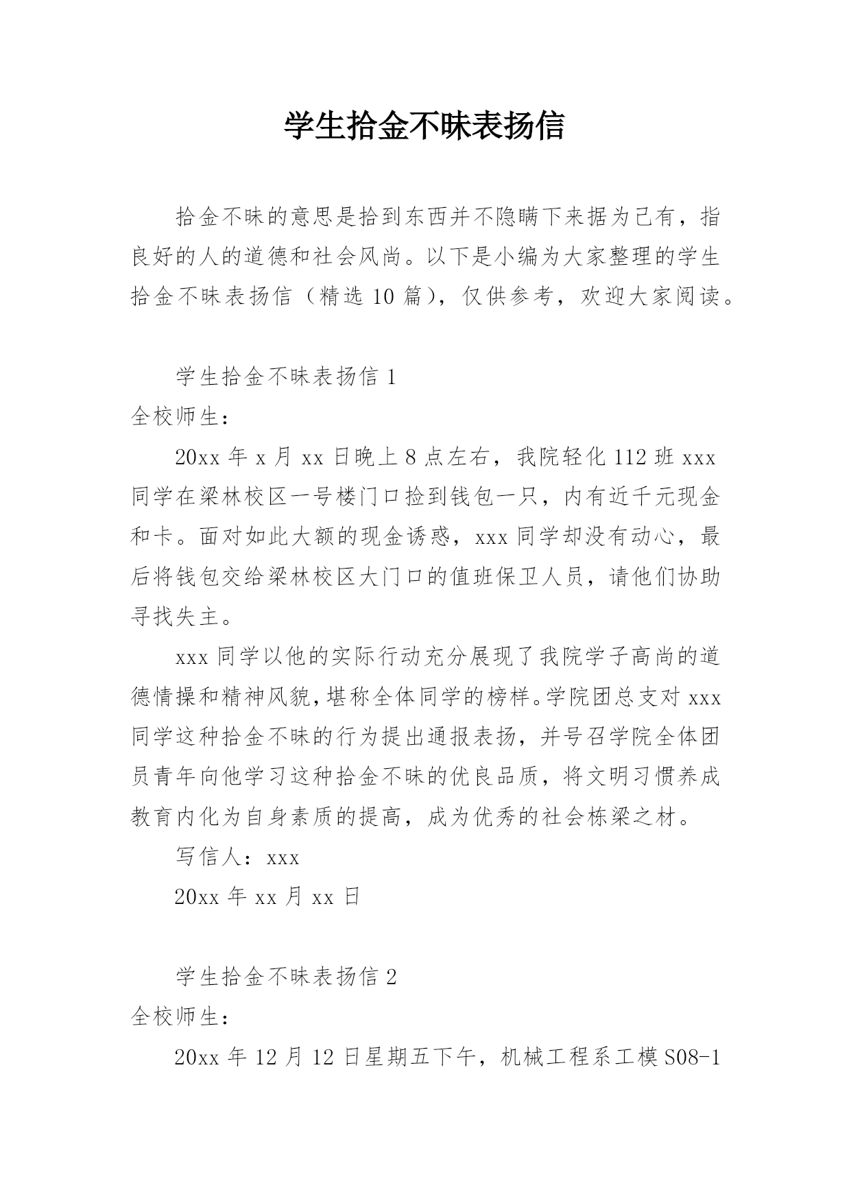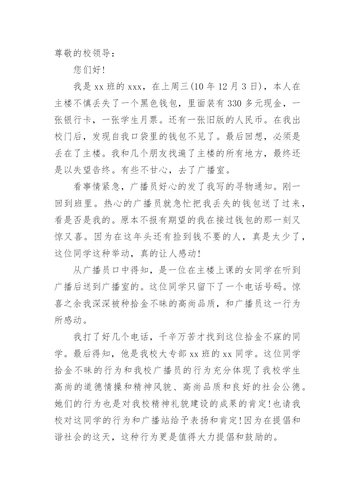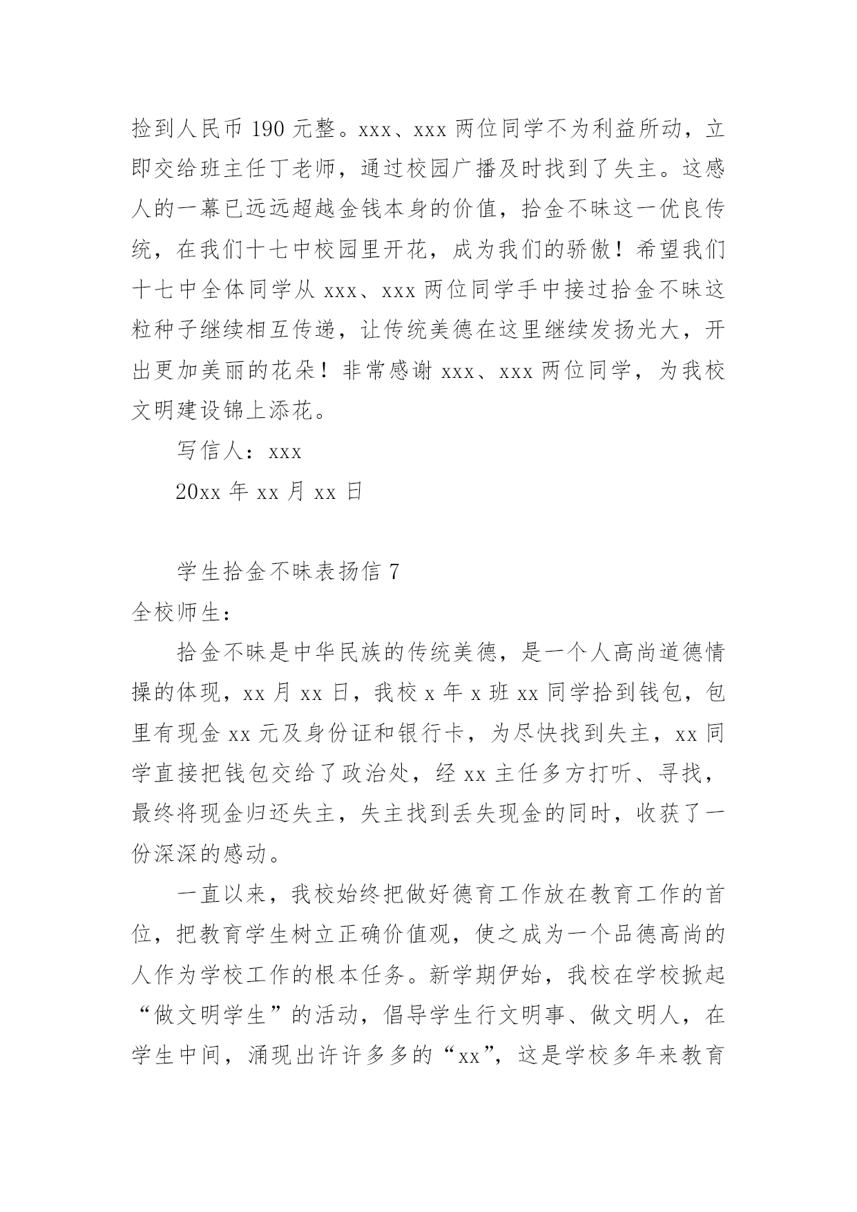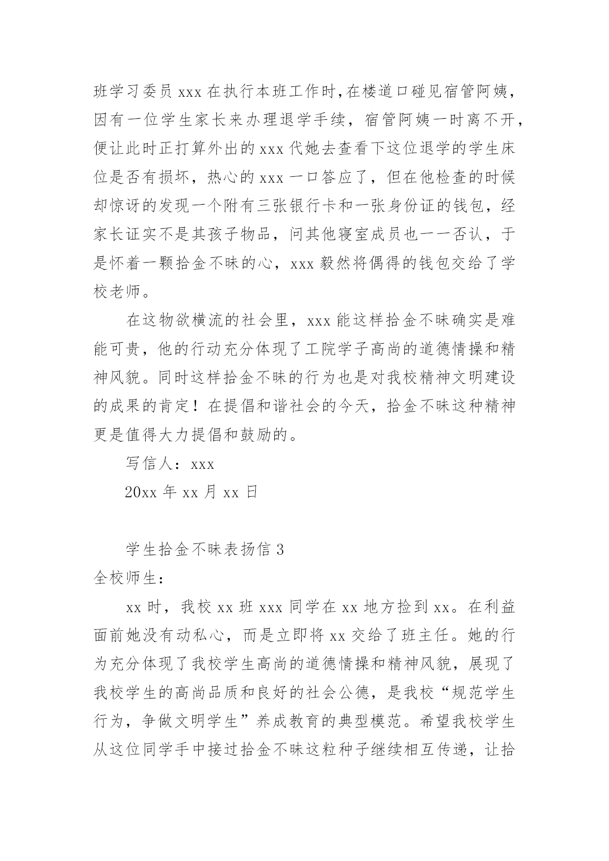 学生拾金不昧表扬信拾金不昧的意思是拾到东西并不隐瞒下来据为己有,指良好的人的道德和社会风尚。以下是小编为大家整理的学生拾金不昧表扬信(精选10篇),仅供参考,欢迎大家阅读。学生拾金不昧表扬信1全校师生:20xx年x月xx日晚上8点左右,我院轻化112班xxx同学在梁林校区一号楼门口捡到钱包一只,内有近千元现金和卡。面对如此大额的现金诱惑,xxx同学却没有动心,最后将钱包交给梁林校区大门口的值班保卫人员,请他们协助寻找失主。xxx同学以他的实际行动充分展现了我院学子高尚的道德情操和精神风貌,堪称全体同学的榜样。学院团总支对xxx同学这种拾金不昧的行为提出通报表扬,并号召学院全体团员青年向他学习这种拾金不昧的优良品质,将文明习惯养成教育内化为自身素质的提高,成为优秀的社会栋梁之材。写信人:xxx20xx年xx月xx日学生拾金不昧表扬信2全校师生:20xx年12月12日星期五下午,机械工程系工模S08-1班学习委员xxx在执行本班工作时,在楼道口碰见宿管阿姨,因有一位学生家长来办理退学手续,宿管阿姨一时离不开,便让此时正打算外出的xxx代她去查看下这位退学的学生床位是否有损坏,热心的xxx一口答应了,但在他检查的时候却惊讶的发现一个附有三张银行卡和一张身份证的钱包,经家长证实不是其孩子物品,问其他寝室成员也一一否认,于是怀着一颗拾金不昧的心,xxx毅然将偶得的钱包交给了学校老师。在这物欲横流的社会里,xxx能这样拾金不昧确实是难能可贵,他的行动充分体现了工院学子高尚的道德情操和精神风貌。同时这样拾金不昧的行为也是对我校精神文明建设的成果的肯定!在提倡和谐社会的今天,拾金不昧这种精神更是值得大力提倡和鼓励的。写信人:xxx20xx年xx月xx日学生拾金不昧表扬信3全校师生:xx时,我校xx班xxx同学在xx地方捡到xx。在利益面前她没有动私心,而是立即将xx交给了班主任。她的行为充分体现了我校学生高尚的道德情操和精神风貌,展现了我校学生的高尚品质和良好的社会公德,是我校“规范学生行为,争做文明学生”养成教育的典型模范。希望我校学生从这位同学手中接过拾金不昧这粒种子继续相互传递,让拾金不昧这一传统美德在这里继续发扬光大。xx同学的高尚的行为为我们树立了良好的榜样,现学校对xx同学的行为提出表扬,并号召全体同学向她学习,学习她这种拾金不昧的优良品质,将文明习惯养成教育内化为自身素质的提高,让中华民族的传统美德继续发扬光大,为创建文明九中校园、和谐校园做出自己的贡献!写信人:xxx20xx年xx月xx日学生拾金不昧表扬信4全校师生:高二(4)班xxx同学于20xx年3月4日拾到钱包一只,内有人民币180元。在金钱面前他没有动心,而是立即上交给学校。xxx同学面对金钱毫不动心,拾金不昧的行为充分体现了我校学生高尚的道德情操和精神风貌,展现了我校学生的高尚品质和良好的社会公德,是我校抓文明习惯养成教育的典型结果。拾金不昧这一优良传统,在我们三中的校园里开花,成为成为我们的骄傲!希望我们三中的同学们从这位同学的手中接过拾金不昧这粒种子继续相互传递,让传统美德在这里继续发扬光大,开出更美丽的花朵!对高二(4)班xxx同学的行为提出通报表扬,并号召全校的学生向他学习,学习他们这种拾金不昧的优良品质,将文明习惯养成教育内化为自身素质的提高,成为优秀的社会栋梁之材。写信人:xxx20xx年xx月xx日学生拾金不昧表扬信5全校师生:20xx年xx月xx日,xx同学,在操场捡到100元现金,及时报告了教导处,在教导处的协助下找到了失主。xx同学面对金钱毫不动心,拾金不昧的行为充分体现了我校师生高尚的道德情操和精神风貌,展现了我校师生的高尚品质和良好的社会公德,是少先队员学习的榜样。拾金不昧这一优良传统,在我们伍汲杜中心小学的校园里开花,成为我们的骄傲!希望我们全校同学们从这位同学的手中接过拾金不昧这粒种子继续相互传递,让传统美德在这里继续发扬光大,开出更美丽的花朵!对xx同学的行为提出通报表扬,并号召全校的学生向他学习,学习他们这种拾金不昧的优良品质,将文明习惯养成教育内化为自身素质的提高,成为优秀的社会栋梁之材。写信人:xxx20xx年xx月xx日学生拾金不昧表扬信6全校师生:四月八日上午,高207班xxx、xxx两位同学在校园内捡到人民币190元整。xxx、xxx两位同学不为利益所动,立即交给班主任丁老师,通过校园广播及时找到了失主。这感人的一幕已远远超越金钱本身的价值,拾金不昧这一优良传统,在我们十七中校园里开花,成为我们的骄傲!希望我们十七中全体同学从xxx、xxx两位同学手中接过拾金不昧这粒种子继续相互传递,让传统美德在这里继续发扬光大,开出更加美丽的花朵!非常感谢xxx、xxx两位同学,为我校文明建设锦上添花。写信人:xxx20xx年xx月x