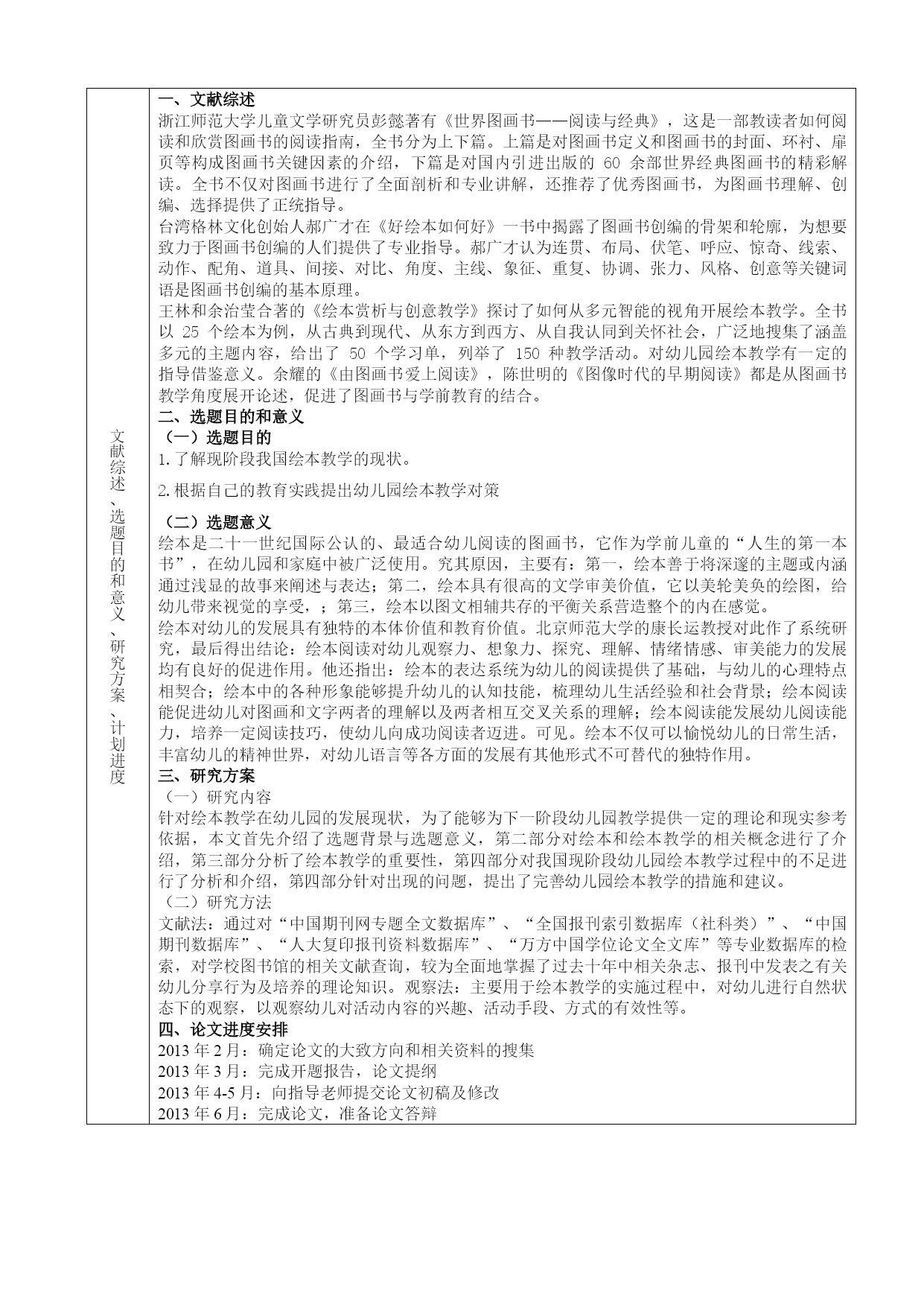苏州科技学院成人教育学院毕业设计(论文)开题报告教学单位:苏州科技学院成人教育学院学号姓名专业教育学题目:浅谈绘本教学对幼儿发展的影响文献综述、选题目的和意义、研究方案、计划进度一、文献综述浙江师范大学儿童文学研究员彭懿著有《世界图画书——阅读与经典》,这是一部教读者如何阅读和欣赏图画书的阅读指南,全书分为上下篇。上篇是对图画书定义和图画书的封面、环衬、扉页等构成图画书关键因素的介绍,下篇是对国内引进出版的60余部世界经典图画书的精彩解读。全书不仅对图画书进行了全面剖析和专业讲解,还推荐了优秀图画书,为图画书理解、创编、选择提供了正统指导。台湾格林文化创始人郝广才在《好绘本如何好》一书中揭露了图画书创编的骨架和轮廓,为想要致力于图画书创编的人们提供了专业指导。郝广才认为连贯、布局、伏笔、呼应、惊奇、线索、动作、配角、道具、间接、对比、角度、主线、象征、重复、协调、张力、风格、创意等关键词语是图画书创编的基本原理。王林和余治莹合著的《绘本赏析与创意教学》探讨了如何从多元智能的视角开展绘本教学。全书以25个绘本为例,从古典到现代、从东方到西方、从自我认同到关怀社会,广泛地搜集了涵盖多元的主题内容,给出了50个学习单,列举了150种教学活动。对幼儿园绘本教学有一定的指导借鉴意义。余耀的《由图画书爱上阅读》,陈世明的《图像时代的早期阅读》都是从图画书教学角度展开论述,促进了图画书与学前教育的结合。二、选题目的和意义(一)选题目的1.了解现阶段我国绘本教学的现状。2.根据自己的教育实践提出幼儿园绘本教学对策(二)选题意义绘本是二十一世纪国际公认的、最适合幼儿阅读的图画书,它作为学前儿童的“人生的第一本书”,在幼儿园和家庭中被广泛使用。究其原因,主要有:第一,绘本善于将深邃的主题或内涵通过浅显的故事来阐述与表达;第二,绘本具有很高的文学审美价值,它以美轮美奂的绘图,给幼儿带来视觉的享受,;第三,绘本以图文相辅共存的平衡关系营造整个的内在感觉。绘本对幼儿的发展具有独特的本体价值和教育价值。北京师范大学的康长运教授对此作了系统研究,最后得出结论:绘本阅读对幼儿观察力、想象力、探究、理解、情绪情感、审美能力的发展均有良好的促进作用。他还指出:绘本的表达系统为幼儿的阅读提供了基础,与幼儿的心理特点相契合;绘本中的各种形象能够提升幼儿的认知技能,梳理幼儿生活经验和社会背景;绘本阅读能促进幼儿对图画和文字两者的理解以及两者相互交叉关系的理解;绘本阅读能发展幼儿阅读能力,培养一定阅读技巧,使幼儿向成功阅读者迈进。可见。绘本不仅可以愉悦幼儿的日常生活,丰富幼儿的精神世界,对幼儿语言等各方面的发展有其他形式不可替代的独特作用。三、研究方案(一)研究内容针对绘本教学在幼儿园的发展现状,为了能够为下一阶段幼儿园教学提供一定的理论和现实参考依据,本文首先介绍了选题背景与选题意义,第二部分对绘本和绘本教学的相关概念进行了介绍,第三部分分析了绘本教学的重要性,第四部分对我国现阶段幼儿园绘本教学过程中的不足进行了分析和介绍,第四部分针对出现的问题,提出了完善幼儿园绘本教学的措施和建议。(二)研究方法文献法:通过对“中国期刊网专题全文数据库”、“全国报刊索引数据库(社科类)”、“中国期刊数据库”、“人大复印报刊资料数据库”、“万方中国学位论文全文库”等专业数据库的检索,对学校图书馆的相关文献查询,较为全面地掌握了过去十年中相关杂志、报刊中发表之有关幼儿分享行为及培养的理论知识。观察法:主要用于绘本教学的实施过程中,对幼儿进行自然状态下的观察,以观察幼儿对活动内容的兴趣、活动手段、方式的有效性等。四、论文进度安排2013年2月:确定论文的大致方向和相关资料的搜集2013年3月:完成开题报告,论文提纲2013年4-5月:向指导老师提交论文初稿及修改2013年6月:完成论文,准备论文答辩指导教师意见签字:___________________年___月___日说明:所有毕业论文撰写,均需填写本表。本表存教学单位备查。