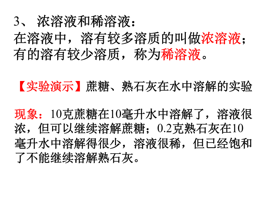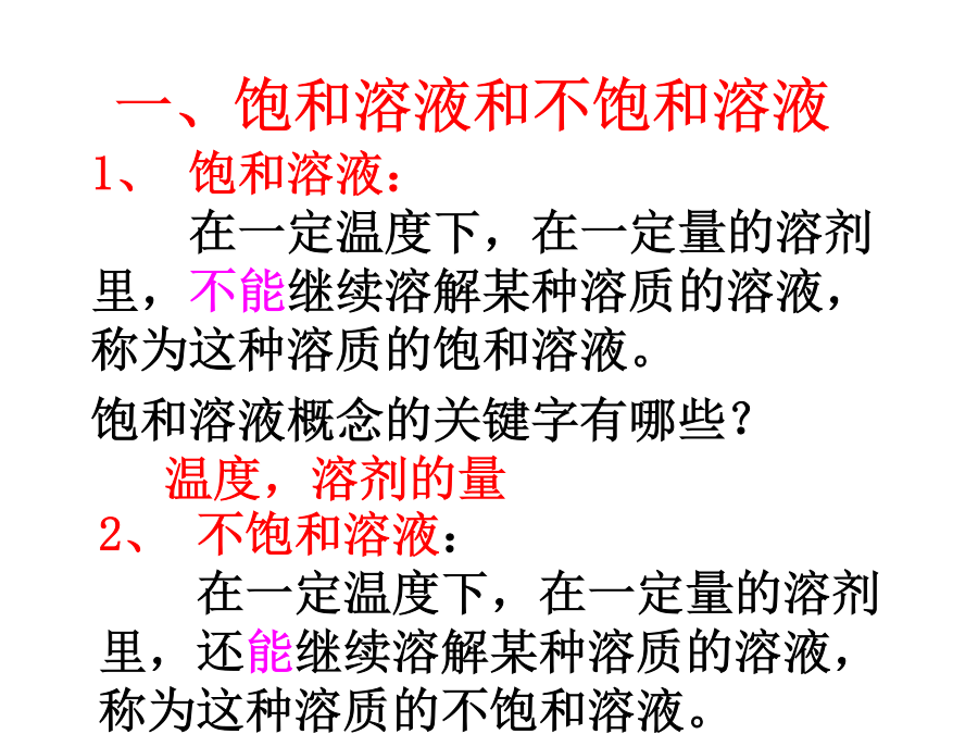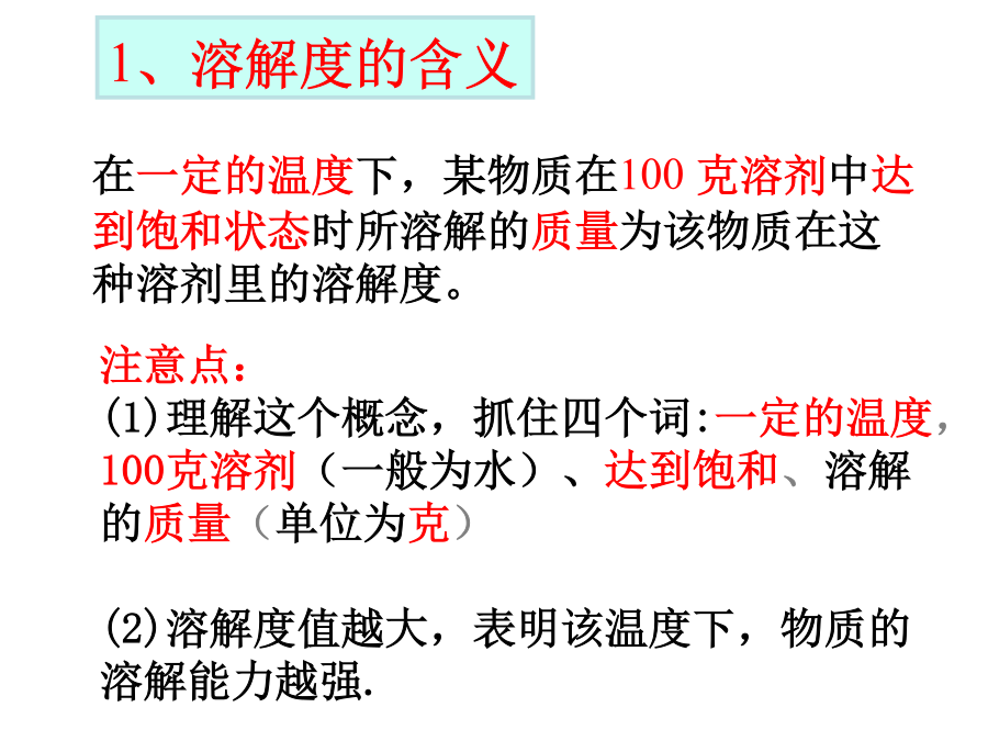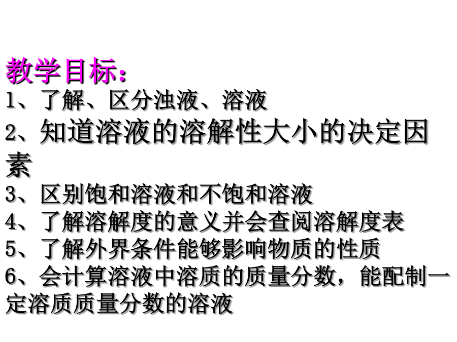 溶液及溶解度教学目标:1、了解、区分浊液、溶液2、知道溶液的溶解性大小的决定因素3、区别饱和溶液和不饱和溶液4、了解溶解度的意义并会查阅溶解度表5、了解外界条件能够影响物质的性质6、会计算溶液中溶质的质量分数,能配制一定溶质质量分数的溶液区分浊液和溶液:1、溶质、溶剂的性质、2、温度1、饱和溶液:在一定温度下,在一定量的溶剂里,不能继续溶解某种溶质的溶液,称为这种溶质的饱和溶液。【思考、讨论】怎样判断一种溶液是不是饱和溶液?1.如果溶液中有少量未溶的溶质,则是饱和溶液;2.加少量的溶质,溶质能继续溶解的是不饱和溶液,不能溶解的是饱和溶液。【思考、讨论】饱和溶液可以转变成不饱和溶液吗?不饱和溶液可以转变成饱和溶液吗?如能转化,怎样转化?3、浓溶液和稀溶液:在溶液中,溶有较多溶质的叫做浓溶液;有的溶有较少溶质,称为稀溶液。结论:饱和溶液不一定是浓溶液,不饱和溶液不一定是稀溶液;在同一温度下,对溶质、溶剂一定的溶液来说,饱和溶液比不饱和溶液浓一些。在一定的温度下,某物质在100克溶剂中达到饱和状态时所溶解的质量为该物质在这种溶剂里的溶解度。一定温度20℃时,蔗糖的溶解度是203.9g,其含义是什么?20℃时,100g水中最多能够溶解203.9g蔗糖。20℃时,100g水中溶解203.9g蔗糖,溶液达到饱和状态。判断是非:(1)20℃时,10克食盐溶解在100克水中,所以20℃时食盐的溶解度是10克。(2)100克水中溶解了36克食盐刚好达到饱和,所以食盐的溶解度是36克。(3)在20℃时,100克水里最多溶解33.3克氯化铵,则20℃氯化铵的溶解度是33.3。(4)在20℃时,100克硝酸钾饱和溶液里含硝酸钾24克,则20℃硝酸钾的溶解度是24克。(5)在30℃时,100克水中加入40克氯化钾后达到饱和溶液,则30℃时氯化钾的溶解度是40克。3、固体溶解度与溶解性的关系=溶解度计算的基本方法(1)公式法例一、在180C时,溶解27克碳酸钾至少需要水多少克?如果溶解在50克水中,应再加多少克碳酸钾才能成为饱和溶液?(在180C时碳酸钾的溶解度是108克)例二、在200C时,把30克硝酸钠溶解在60克水里,所得溶液为不饱和溶液。为了使它成为饱和溶液,可以用下面的方法:(1)蒸发溶剂的方法。需要蒸发掉多少克水,才能成为饱和溶液?(200C时,硝酸钠溶解度为88克)(2)增加溶质的方法。需要增加多少克硝酸钠,才能成为饱和溶液?氢氧化钙(熟石灰)的溶解度曲线图巩固练习2:如图是A、B、C三种物质在水中的溶解度曲线,请回答:(1):M点的含义是________(2):当温度为t1ºC,三种物质溶解度由小到大依次为_______,当为t3ºC时,溶解度最大的是________.3、气体溶解度(1)概念:在压强为101KPa,一定温度时溶解在1体积水里达到饱和状态时的气体体积。当温度一定时.气体溶解度一般随压强增大而增大,压强减小而减小。利用所学知识解释下列现象?1:打开健力宝盖时我们为何会看到有气体冒出?2:给水加热时我们为何可以看到水中出现气泡?1.固体溶解度与气体溶解度的概念表示有何不同之处?为何不同?2.增大二氧化碳在水中的溶解度的方法()A.升温增压;B.升温减压C.降温增压;D.降温减压。例四、330C时,有250克硝酸钾溶液,若向该溶液中加入30克硝酸钾,则恰好成为饱和溶液,若原溶液恒温蒸发掉60克水也恰好成为饱和溶液,求330C时硝酸钾的溶解度?