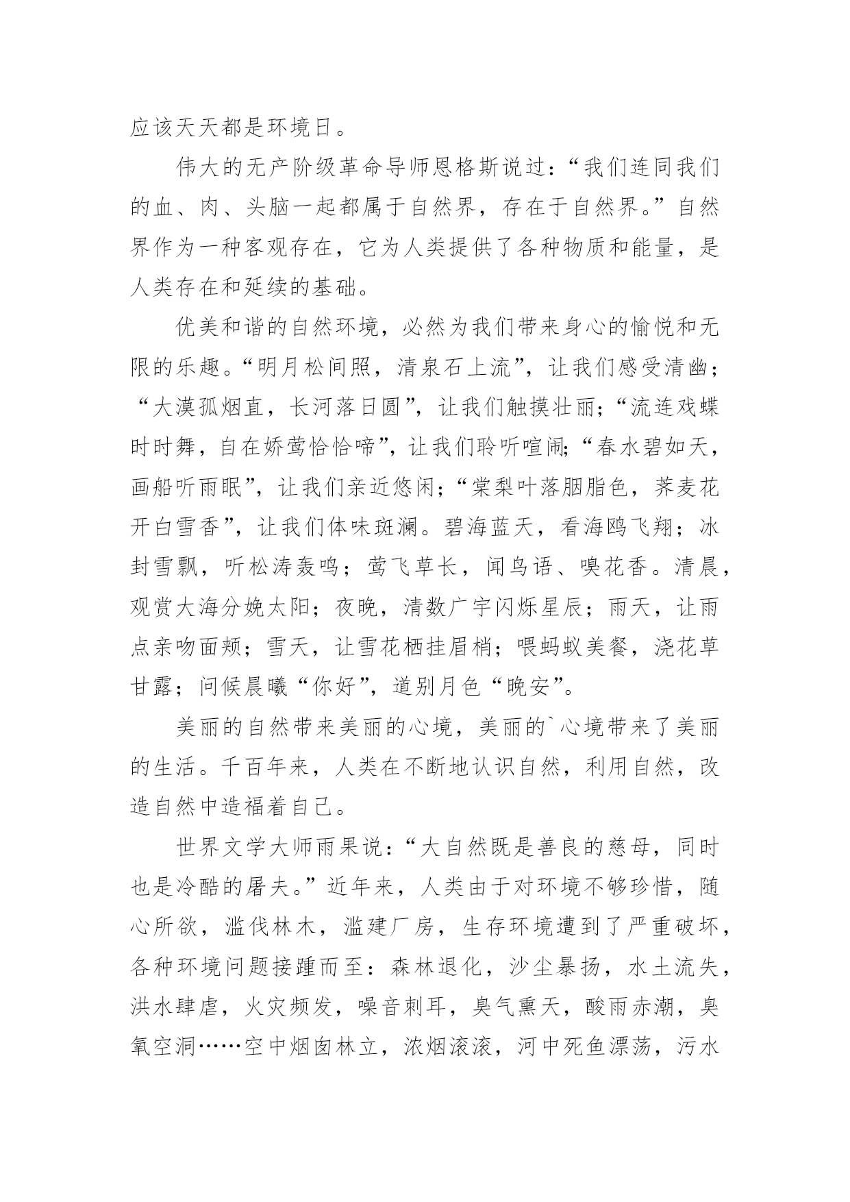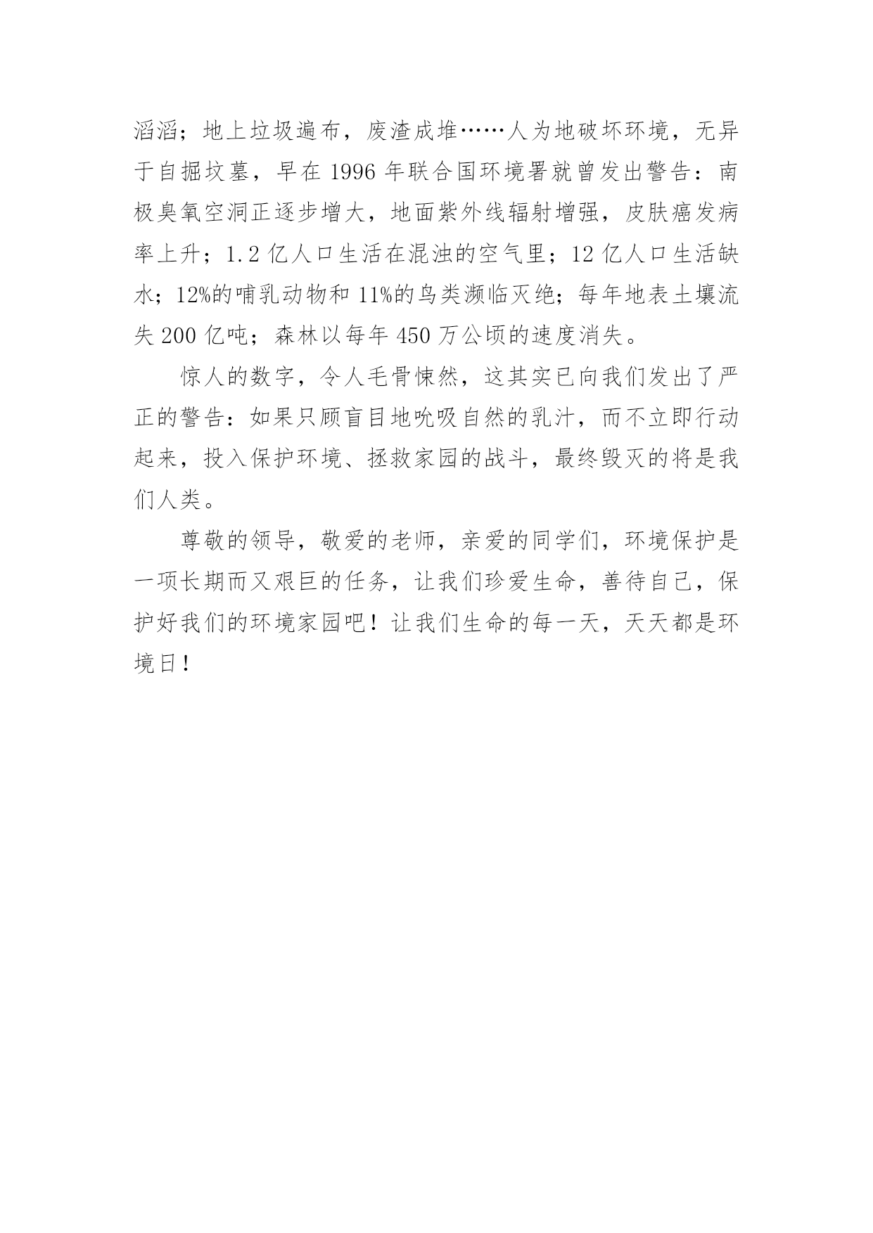 绿色环保的校园广播稿关于绿色环保的校园广播稿有在学校广播站锻炼的学生都知道,我们广播前都会预先做好广播稿,一份优秀的广播稿能提高节目效果,广播稿应该怎么写才好呢?下面是小编为大家整理的关于绿色环保的校园广播稿,欢迎大家借鉴与参考,希望对大家有所帮助。尊敬的各位领导,敬爱的老师,亲爱的同学们:早上好!我今天广播的题目是《天天都是环境日》。21世纪可谓挑战与机遇并存,希望与困难共存。它在给我们带来许多美好憧憬的同时,也给我们带来了许多难题,其中首要的就是环境问题。环境与我们的生活极为密切,与我们的生存息息相关。很久以来,我们赖以生存的环境就引起了许多有识之士的极大关注。1972年6月5日,人类环境会议在斯德哥尔摩开幕,会上通过了的《人类环境宣言》。同年10月,第27届联合国大会通过决议,将以后每年的6月5日定为世界环境日。今年的环境日离现在还有两个多月了,刚刚闭幕的第十一届全国人代会上又将国家环保总局升格为环境保护部,这次行政管理体制改革充分表明中央进一步加强对环境保护工作的重视达到了前所未有的高度。在我们的生命历程里,应该天天都是环境日。伟大的无产阶级革命导师恩格斯说过:“我们连同我们的血、肉、头脑一起都属于自然界,存在于自然界。”自然界作为一种客观存在,它为人类提供了各种物质和能量,是人类存在和延续的基础。优美和谐的自然环境,必然为我们带来身心的愉悦和无限的乐趣。“明月松间照,清泉石上流”,让我们感受清幽;“大漠孤烟直,长河落日圆”,让我们触摸壮丽;“流连戏蝶时时舞,自在娇莺恰恰啼”,让我们聆听喧闹;“春水碧如天,画船听雨眠”,让我们亲近悠闲;“棠梨叶落胭脂色,荠麦花开白雪香”,让我们体味斑澜。碧海蓝天,看海鸥飞翔;冰封雪飘,听松涛轰鸣;莺飞草长,闻鸟语、嗅花香。清晨,观赏大海分娩太阳;夜晚,清数广宇闪烁星辰;雨天,让雨点亲吻面颊;雪天,让雪花栖挂眉梢;喂蚂蚁美餐,浇花草甘露;问候晨曦“你好”,道别月色“晚安”。美丽的自然带来美丽的心境,美丽的`心境带来了美丽的生活。千百年来,人类在不断地认识自然,利用自然,改造自然中造福着自己。世界文学大师雨果说:“大自然既是善良的慈母,同时也是冷酷的屠夫。”近年来,人类由于对环境不够珍惜,随心所欲,滥伐林木,滥建厂房,生存环境遭到了严重破坏,各种环境问题接踵而至:森林退化,沙尘暴扬,水土流失,洪水肆虐,火灾频发,噪音刺耳,臭气熏天,酸雨赤潮,臭氧空洞……空中烟囱林立,浓烟滚滚,河中死鱼漂荡,污水滔滔;地上垃圾遍布,废渣成堆……人为地破坏环境,无异于自掘坟墓,早在1996年联合国环境署就曾发出警告:南极臭氧空洞正逐步增大,地面紫外线辐射增强,皮肤癌发病率上升;1.2亿人口生活在混浊的空气里;12亿人口生活缺水;12%的哺乳动物和11%的鸟类濒临灭绝;每年地表土壤流失200亿吨;森林以每年450万公顷的速度消失。惊人的数字,令人毛骨悚然,这其实已向我们发出了严正的警告:如果只顾盲目地吮吸自然的乳汁,而不立即行动起来,投入保护环境、拯救家园的战斗,最终毁灭的将是我们人类。尊敬的领导,敬爱的老师,亲爱的同学们,环境保护是一项长期而又艰巨的任务,让我们珍爱生命,善待自己,保护好我们的环境家园吧!让我们生命的每一天,天天都是环境日!
