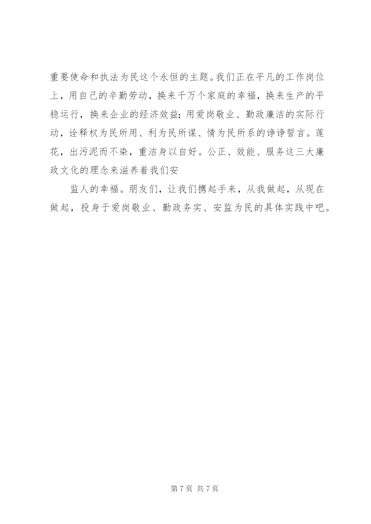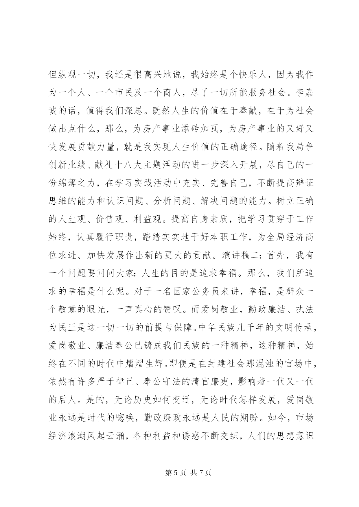 第PAGE\*Arabic\*MERGEFORMAT7页共NUMPAGES\*MERGEFORMAT7页最新公务员爱岗敬业演讲稿演讲稿一:工作既是谋生手段,也是一个人对社会的一份责任。那责任到底是什么。所谓责任,就是人们在各自的岗位上尽职尽责,工作到位,不允许任何人工作马马虎虎,不负责任,不允许任何环节出现空挡或发生松动。要有全员观念,其要义就是我参与,我尽责,我奉献,我快乐。我们应当明白这样的道理:只要爱岗敬业,认真履行职责,就能建功立业,在平凡的岗位做出不平凡的业绩。一、保证单位持续发展关键在于落实岗位责任任何责任事故的发生,原因可能有很多方面,但归根到底是责任落实不到位。事实证明,每一次责任事故都与相关岗位和人员的责任不落实有直接关系。现在,各项工作方面的各种规章制度、改进措施、应急预案已经不少了,关键在于切实落实责任。责任是对自己所负使命的忠诚和信守,它是出色完成任务的根基,有至高无上的价值。尽职尽责,既是我们科级领导干部的神圣权利,也是科级领导干部义不容辞的义务。权利体现对自己负责,义务体现对事业负责、对社会负责、对他人负责。责任到底是什么。它是职业操守,是职业道德,是对生命的关爱,是对国家利益、人民利益的最大维护。一位伟人曾说过:人生所有的履历都必须排在勇于负责任的精神之后。在责任的内在力量的驱使下,我常常油然而生一种崇高的使命感和归属感。作为一名基层的科级领导干部,我的基本责任就是主动争取为单位做得更多,承担更多的责任;就是全力以赴,满腔热情地做事;就是为单位分担忧虑,给上级领导减轻压力,在自觉履行好自己岗位责任的同时,还要发挥身在一线、了解情况的优势,认真查找本单位乃至全局工作存在的薄弱环节,主动向上级反馈,同时开动脑筋,研究应对和解决办法,积极提出合理化建议,最完美地履行自己的职责,立足本职,努力工作,认真落实岗位责任。为促进房产事业持续发展贡献聪明才智。二、在平凡工作岗位上努力建功立业每个人有理想、有志向、有抱负,都渴望干出一番事业。这种雄心壮志是可贵的,但是首先必须懂得,伟大出自平凡,轰轰烈烈的大事业往往寓于平凡的日常工作之中。做好本职工作,爱岗敬业,正是成就事业的起点。爱岗敬业,最根本的是要有责任感和忠诚度。责任产生忠诚,忠诚产生动力,而忠诚和动力,会让你承担更大的责任。一个人只有对所从事的职业充满责任感,他才能对企业、对工作忠诚,才会有无限的热情和无穷的力量,也才能赢得企业管理者对他的好感和信任,从而把需要承担更大责任的重要岗位交给他,他因此也就一步一步地成长、发展起来了,事业的丰碑也就一点一点树立起来了。为国家、为人民建功立业,是每个人应有的追求。这种追求,不应当只存在于豪言壮语中,更不应当只存在于幻想里,而应当付诸行动,在踏踏实实地学习、工作、履行岗位责任中体现这种崇高追求。事业的丰碑需要一砖一石,我们何不扑下身子,甘做这一砖一石昵。事实上,建功立业不是一人之力,一身之功。只有把自己平凡的本职工作融入党和人民的伟大事业,把责任体现到自己的一言一行、一举一动上,使你从事的工作又好又快发展收到成效,你也才能从中享受到胜利的喜悦。否则,搞不清建功立业与脚踏实地的关系,好高骛远,志大才疏,终日怨天尤人,总觉得怀才不遇、报国无门,就会陷于无尽的烦恼之中。我的本职岗位看起来很小,实际上它是我人生的大舞台。它给我提供了表现自我的机会,给我搭建了展示才华的平台。既然投身房产事业是我当初自觉自愿的选择,我就要珍惜它,充分利用这个舞台,展示自己的聪明才智。不少为社会做出突出贡献的成功人士,他们正是从做好本职工作起步的,他们的成长成才经验尤其值得我虚心学习借鉴。三、在促进房产事业持续发展中实现人生价值人生是一个对人生观和价值观所包含的正反两方面因素不断选择的过程。选择信念以支撑生命,选择事业以实现价值,选择方法以解决问题,选择态度以调整内心,都潜移默化地贯穿和体现着人生观和价值观。选择什么样的人生观和价值观,直接关系着人生道路的航向和进程。不少朋友都喜欢说实现人生价值、让生命过得有意义这样的话。人生哲学是一个很大的题目,也是一部很大很厚的书,要读懂它,需要分解开来,将它化孝化具体。大而化之,囫囵吞枣,是难以将人生观、价值观理解透彻的。在看待人生上,要害是行大道,还是行小道。所谓行大道,就是选择正确的东西,站在正确的一方。所谓行小道,就是选择错误的东西,站在错误的一方。正确的东西,比如坚定的信念、崇高的人格、美好的心灵、科学的态度、强烈的社会责任感等,要敬仰它,敢于坚守。错误的东西,比如拜金主义、享受主义、极端个人主义、潜规则、功利思想等等,要鄙视它,勇于摈弃。站在正确的一方,你也许一时会吃点儿亏,但最终你将获得人生全局的胜利。站在错误的一方,你可能一时风光,但最终你将失去人生最根本的意义,甚至