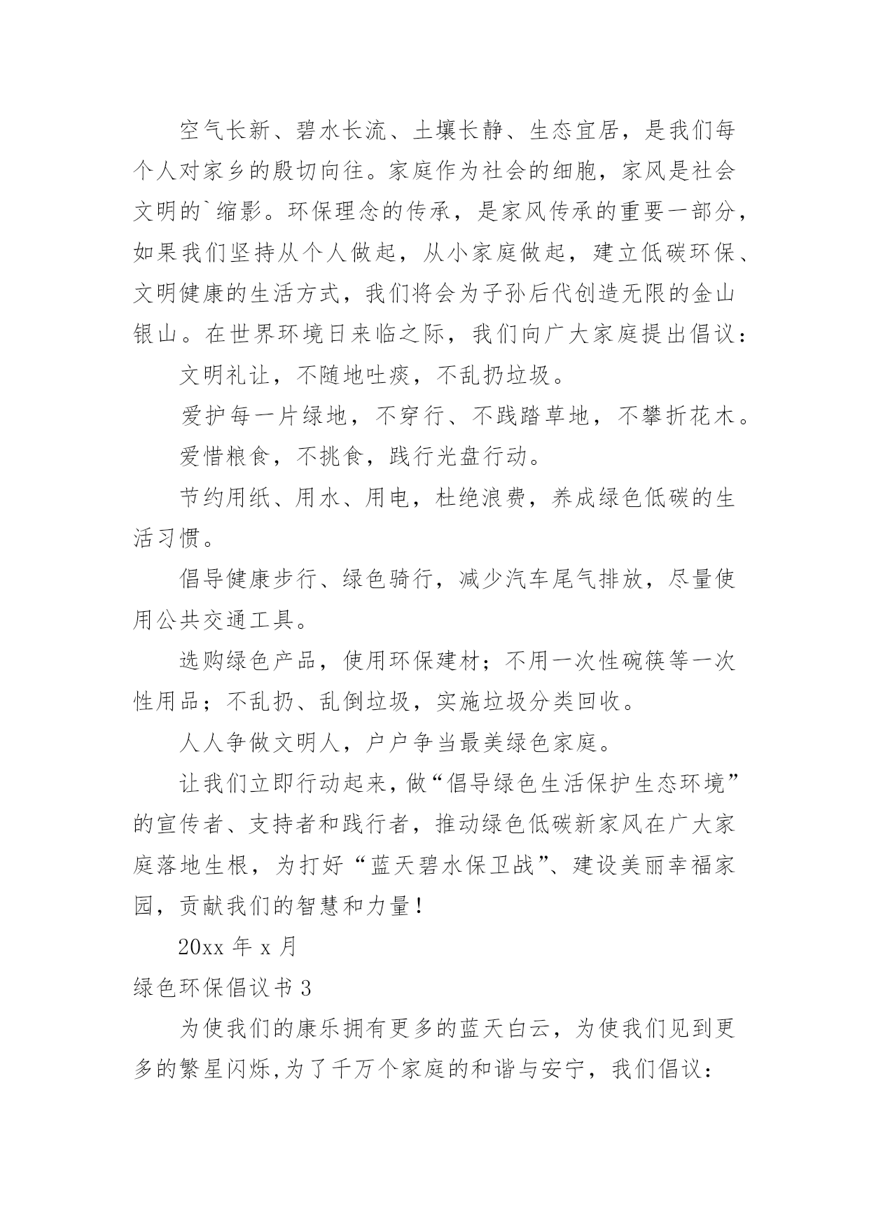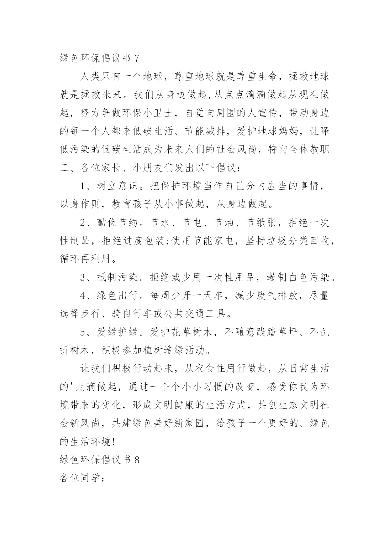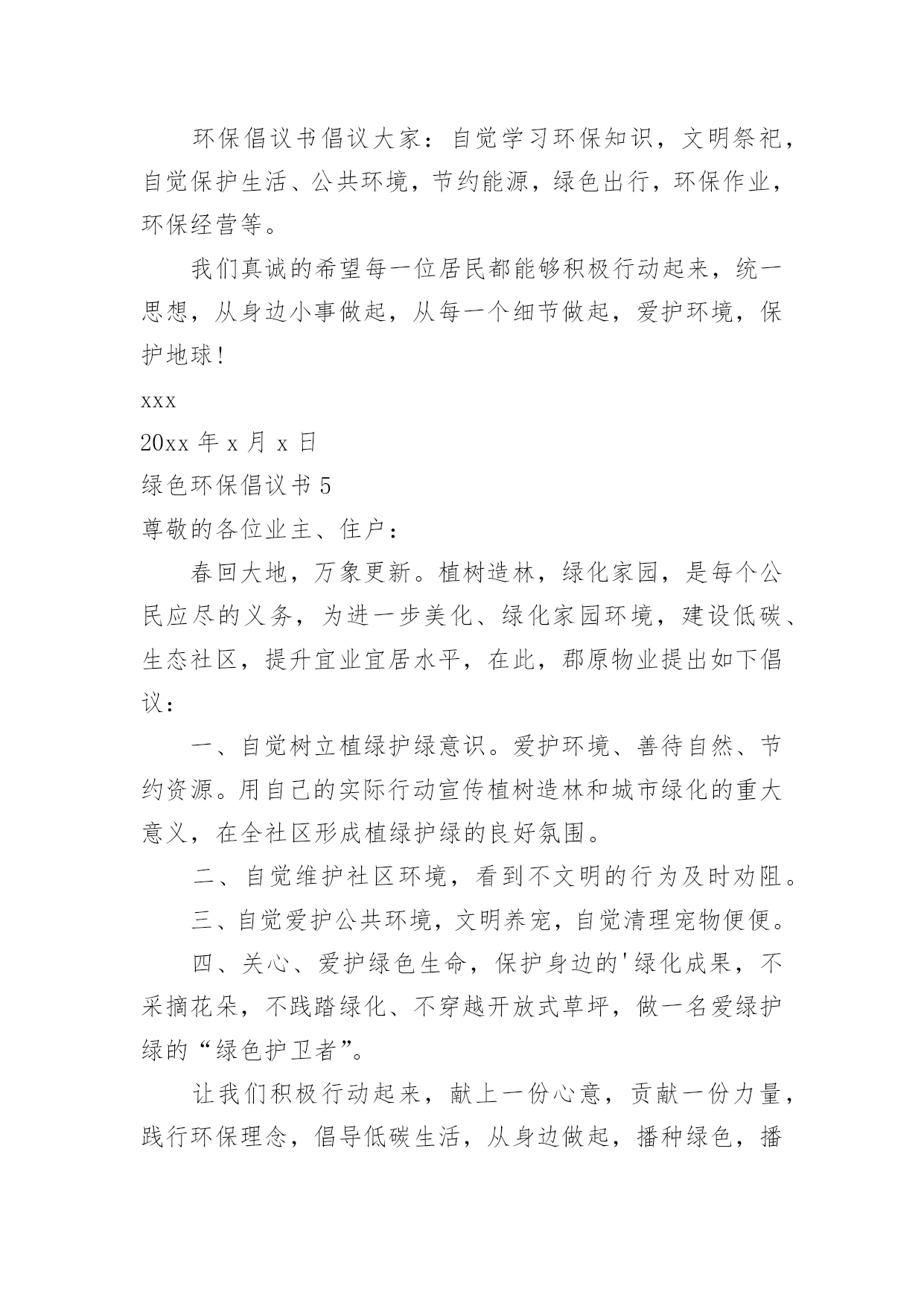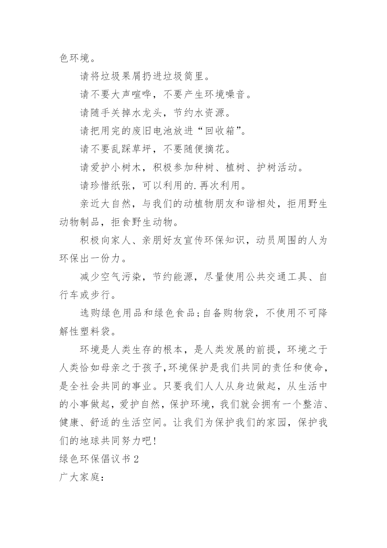 绿色环保倡议书绿色环保倡议书(合集15篇)在当下社会,用到倡议书的地方越来越多,倡议书本身不具有很强的约束力,有关人员可以表示响应,也可以不表示响应。写起倡议书来就毫无头绪?以下是小编收集整理的绿色环保倡议书,欢迎阅读与收藏。绿色环保倡议书1尊敬的老师、家长,各位小朋友们:大家好!你曾经仰望过蓝天白云、欣赏万里晴空的美景吗?你曾经在树荫下纳凉,为一抹新绿而感动过吗?你曾经聆听过小河潺潺、观察过清澈河底的鱼儿吗?---------那都是绿色的生命在闪耀的勃勃生机我们每个人都希望生活在一个清洁、舒适的环境中。但是,我们共有的家园——地球,却由于人类的肆意破坏、污染、浪费,已经失去了往日的美丽,环境污染已成为影响我们生活的一大问题。我们渴望美丽的地球、绿色的家园、湛蓝的天空、清新的空气。但美丽的环境需要我们共同营造,文明的习惯靠我们平时一点一滴地养成。为了让地球更美,让家园更绿,我园特别向广大教师、家长、小朋友们提出以下倡议:做一个文明的人,不随地吐痰,不乱扔废弃物,保护绿色环境。请将垃圾果屑扔进垃圾筒里。请不要大声喧哗,不要产生环境噪音。请随手关掉水龙头,节约水资源。请把用完的废旧电池放进“回收箱”。请不要乱踩草坪,不要随便摘花。请爱护小树木,积极参加种树、植树、护树活动。请珍惜纸张,可以利用的.再次利用。亲近大自然,与我们的动植物朋友和谐相处,拒用野生动物制品,拒食野生动物。积极向家人、亲朋好友宣传环保知识,动员周围的人为环保出一份力。减少空气污染,节约能源,尽量使用公共交通工具、自行车或步行。选购绿色用品和绿色食品;自备购物袋,不使用不可降解性塑料袋。环境是人类生存的根本,是人类发展的前提,环境之于人类恰如母亲之于孩子,环境保护是我们共同的责任和使命,是全社会共同的事业。只要我们人人从身边做起,从生活中的小事做起,爱护自然,保护环境,我们就会拥有一个整洁、健康、舒适的生活空间。让我们为保护我们的家园,保护我们的地球共同努力吧!绿色环保倡议书2广大家庭:空气长新、碧水长流、土壤长静、生态宜居,是我们每个人对家乡的殷切向往。家庭作为社会的细胞,家风是社会文明的`缩影。环保理念的传承,是家风传承的重要一部分,如果我们坚持从个人做起,从小家庭做起,建立低碳环保、文明健康的生活方式,我们将会为子孙后代创造无限的金山银山。在世界环境日来临之际,我们向广大家庭提出倡议:文明礼让,不随地吐痰,不乱扔垃圾。爱护每一片绿地,不穿行、不践踏草地,不攀折花木。爱惜粮食,不挑食,践行光盘行动。节约用纸、用水、用电,杜绝浪费,养成绿色低碳的生活习惯。倡导健康步行、绿色骑行,减少汽车尾气排放,尽量使用公共交通工具。选购绿色产品,使用环保建材;不用一次性碗筷等一次性用品;不乱扔、乱倒垃圾,实施垃圾分类回收。人人争做文明人,户户争当最美绿色家庭。让我们立即行动起来,做“倡导绿色生活保护生态环境”的宣传者、支持者和践行者,推动绿色低碳新家风在广大家庭落地生根,为打好“蓝天碧水保卫战”、建设美丽幸福家园,贡献我们的智慧和力量!20xx年x月绿色环保倡议书3为使我们的康乐拥有更多的蓝天白云,为使我们见到更多的繁星闪烁,为了千万个家庭的和谐与安宁,我们倡议:一、不燃放、少燃放烟花爆竹。让我们从少购买一串鞭炮、少燃放一个礼炮做起,减轻我市空气污染,减少安全事故的发生,积极营造文明、安全、宜居环境。二、文明燃放烟花爆竹。不在明令禁止的安全保护单位和公共场所随意燃放烟花爆竹,不燃放具有伤害性的礼花弹、大型烟花;不在早、晚等休息时间燃放烟花爆竹;不在通风状况差的楼道、小巷内燃放烟花爆竹;不在阳台、楼顶、草坪上燃放烟花爆竹;未成年人要在家长的监护下燃放烟花爆竹,不利用燃放烟花爆竹嬉戏打闹、妨碍行人及车辆安全通行。三、选择低碳环保喜庆方式。建议选择电子爆竹、喜庆音乐、鲜花等新颖、安全的喜庆方式;积极选购安全、低污染的环保烟花爆竹,在享受烟花爆竹带来的`喜悦时,尽量减少有害物质对环境的污染。我们真诚地倡议全体市民朋友,节日期间不燃放或少燃放烟花爆竹,点燃文明之火,培育礼仪之花,共同爱护环境、保护环境,过一个节俭、安全、环保的低碳春节。康乐县生态环境保护协会新年快乐绿色环保倡议书4社区是我们居住、生活的场所,是我们共同的家园,创建健康、整洁、有序、环保的社区环境是我们共同的心愿,为使广大居民更好地了解环保知识,20__年5月10,常江湾社区工作人员在金石滩大集为辖区居民发放环保倡议书。希望通过倡议,能够唤起更多的.居民积极加入到爱护环境的工作中来。环保倡议书倡议大家:自觉学习环保知识,文明祭祀,自觉保护生活、公共环境,节约能源,绿色出行,环保作业,环保经营等。我们真诚的希望每一位居民都能够积极行动起来,统一思想,从身边小事做起,从每一个细节做起,爱护环境,保护地球!xxx20xx