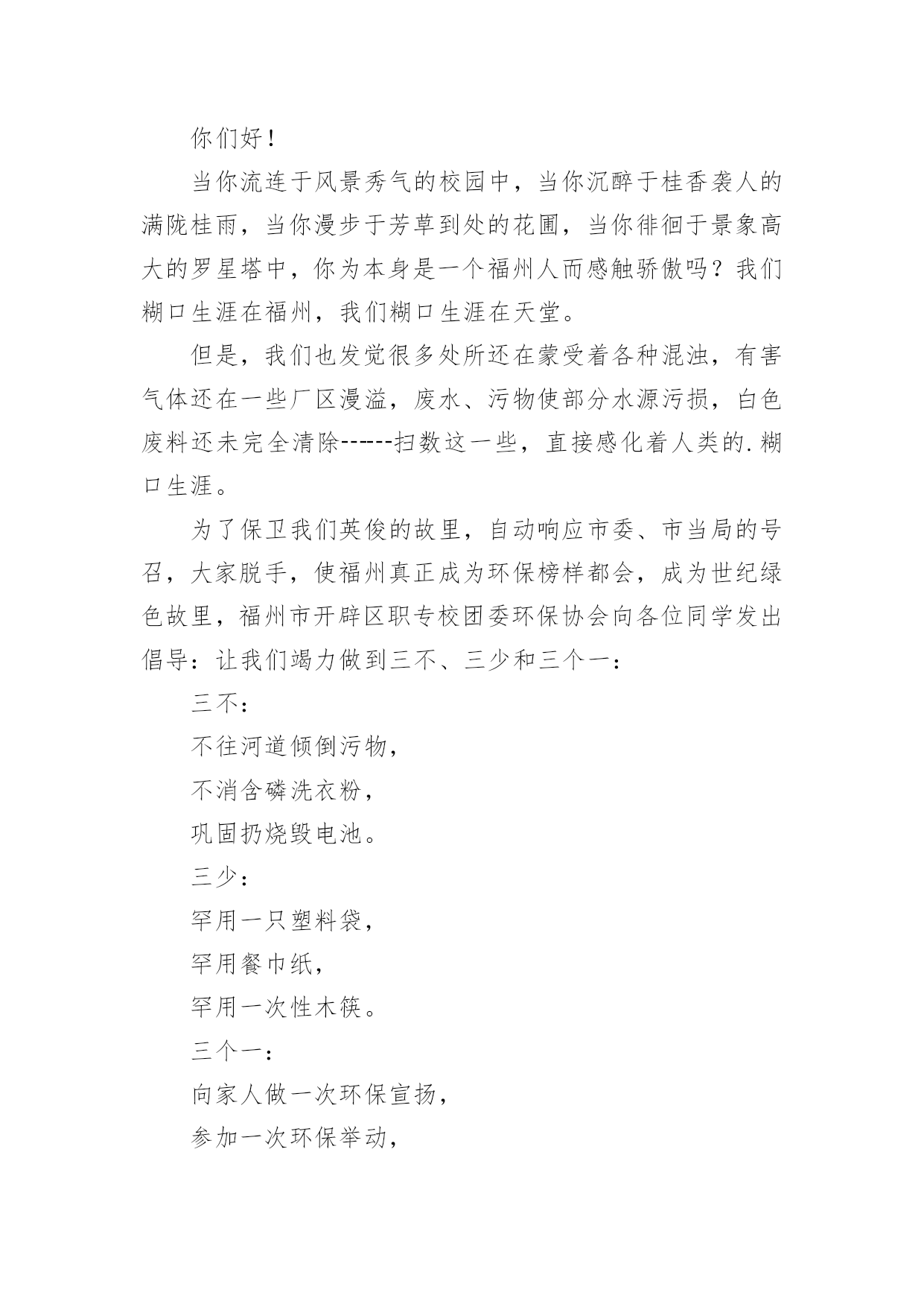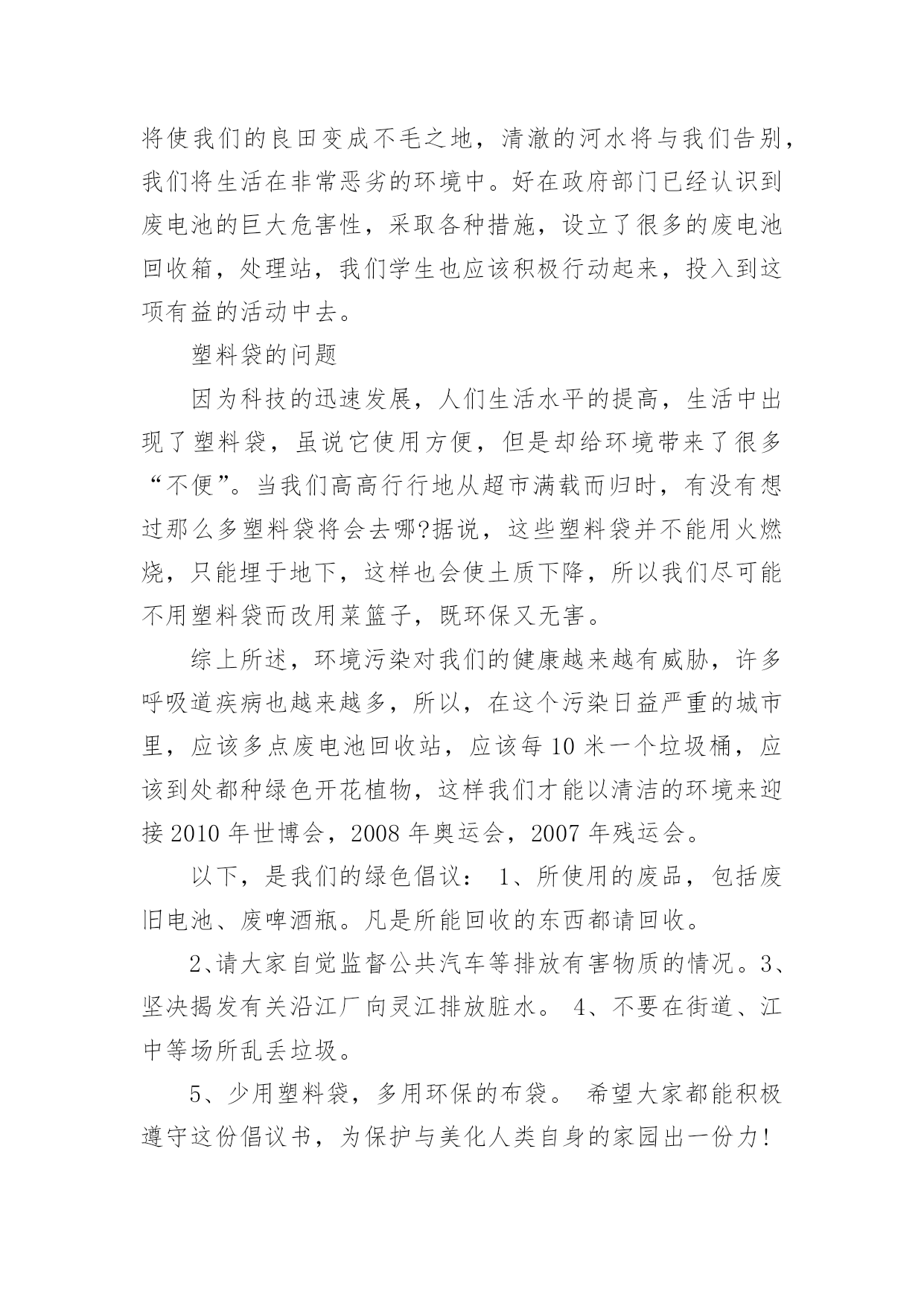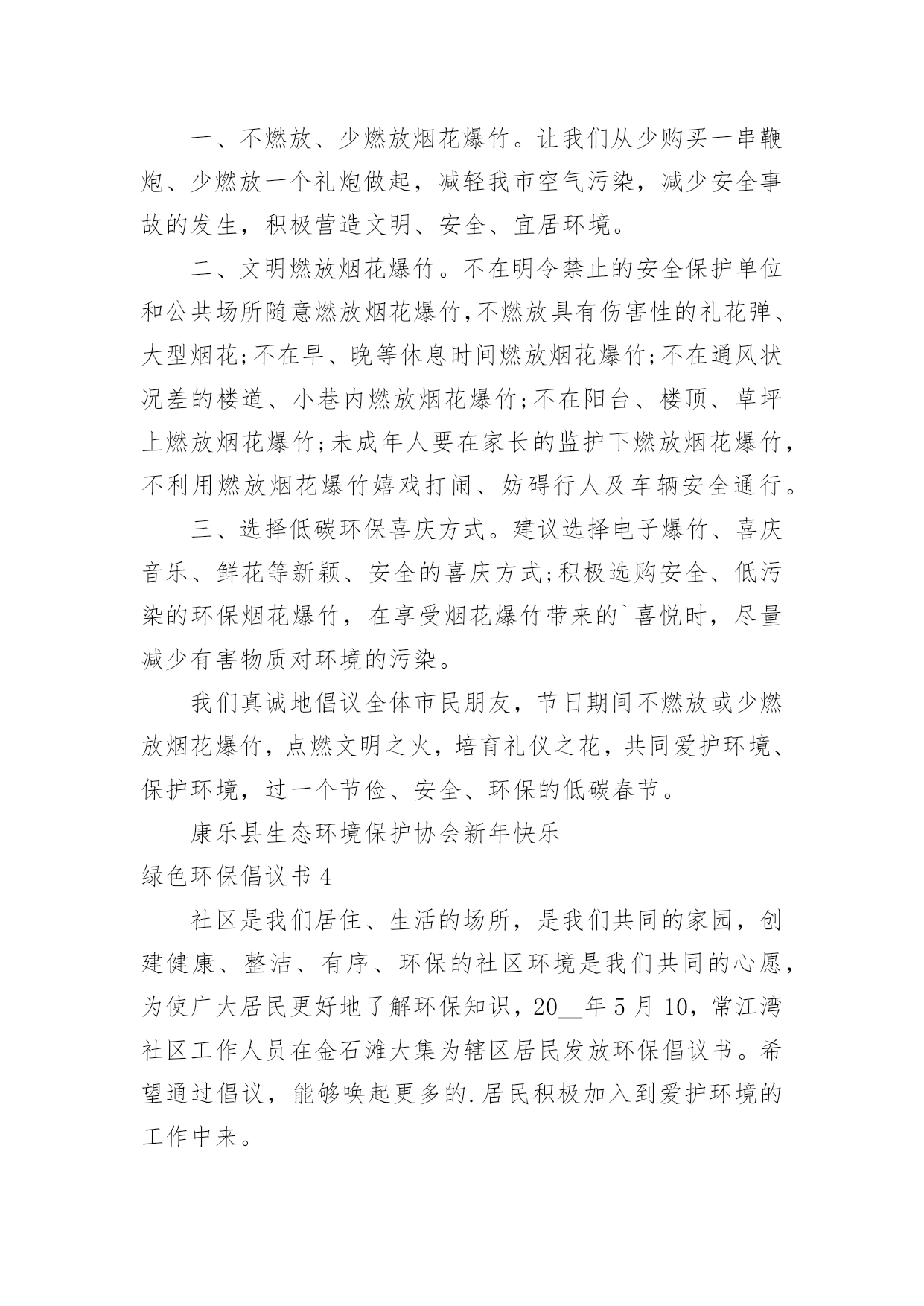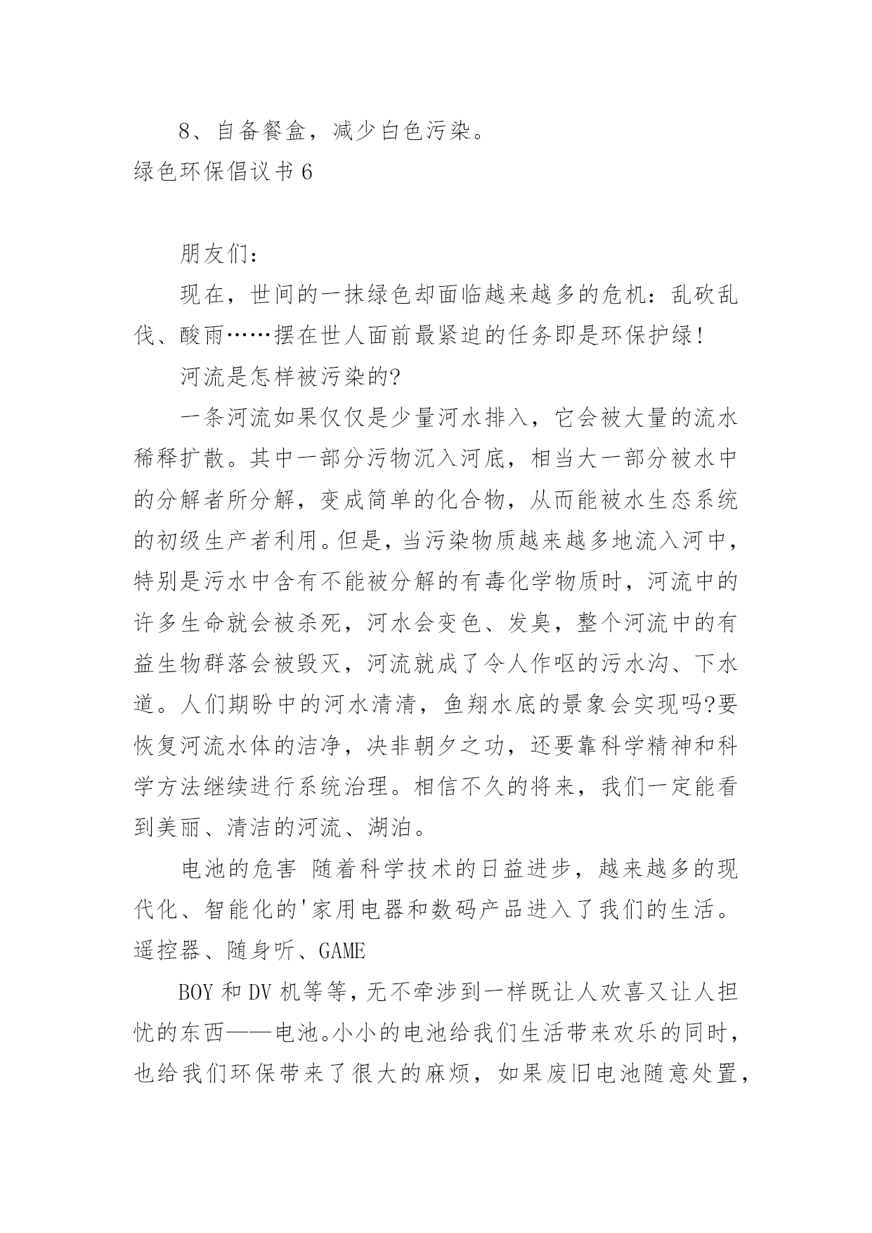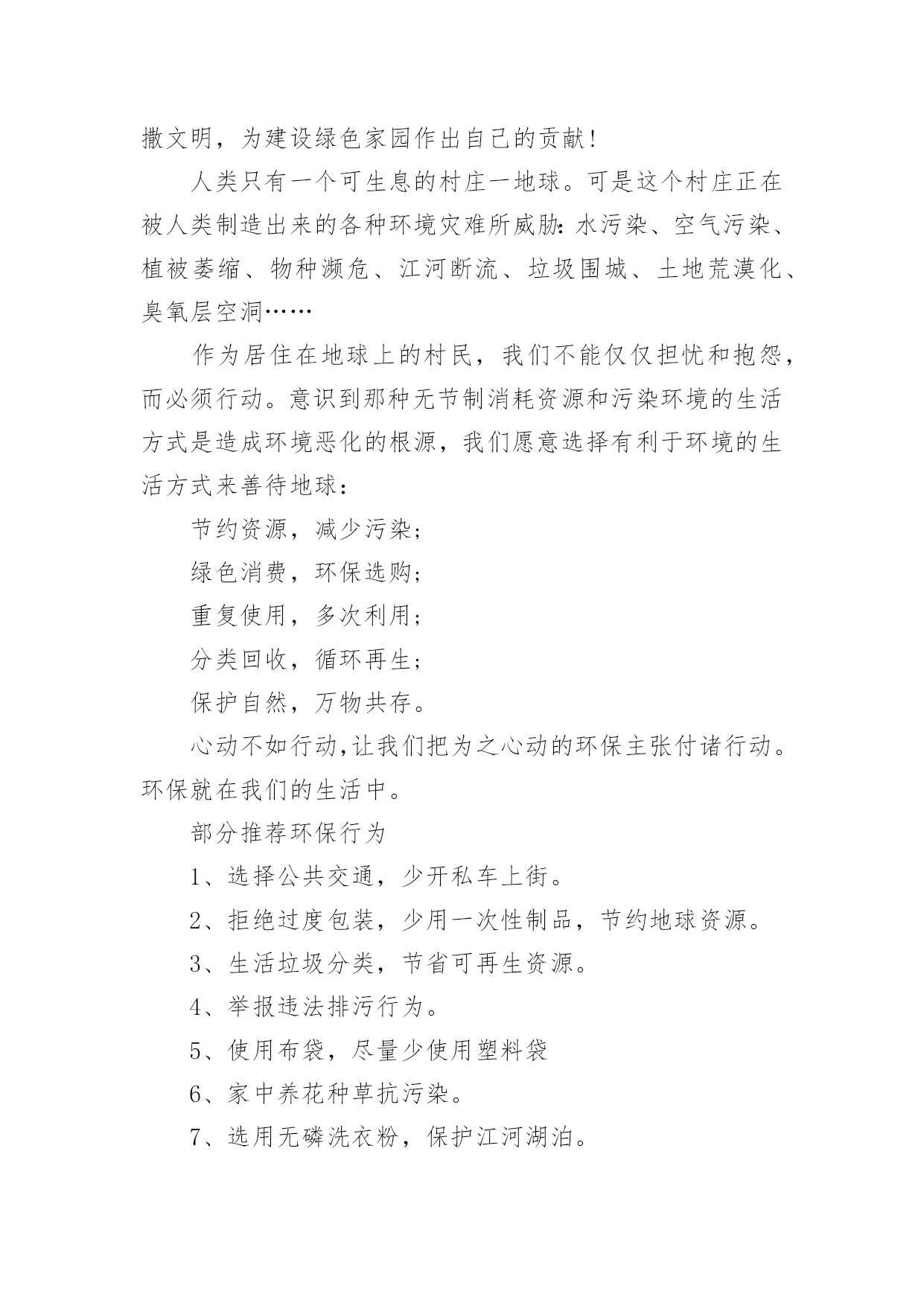 绿色环保倡议书绿色环保倡议书(合集15篇)在当下社会,用到倡议书的地方越来越多,倡议书本身不具有很强的约束力,有关人员可以表示响应,也可以不表示响应。写起倡议书来就毫无头绪?以下是小编收集整理的绿色环保倡议书,欢迎阅读与收藏。绿色环保倡议书1尊敬的老师、家长,各位小朋友们:大家好!你曾经仰望过蓝天白云、欣赏万里晴空的美景吗?你曾经在树荫下纳凉,为一抹新绿而感动过吗?你曾经聆听过小河潺潺、观察过清澈河底的鱼儿吗?---------那都是绿色的生命在闪耀的勃勃生机我们每个人都希望生活在一个清洁、舒适的环境中。但是,我们共有的家园——地球,却由于人类的肆意破坏、污染、浪费,已经失去了往日的美丽,环境污染已成为影响我们生活的一大问题。我们渴望美丽的地球、绿色的家园、湛蓝的天空、清新的空气。但美丽的环境需要我们共同营造,文明的习惯靠我们平时一点一滴地养成。为了让地球更美,让家园更绿,我园特别向广大教师、家长、小朋友们提出以下倡议:做一个文明的人,不随地吐痰,不乱扔废弃物,保护绿色环境。请将垃圾果屑扔进垃圾筒里。请不要大声喧哗,不要产生环境噪音。请随手关掉水龙头,节约水资源。请把用完的废旧电池放进“回收箱”。请不要乱踩草坪,不要随便摘花。请爱护小树木,积极参加种树、植树、护树活动。请珍惜纸张,可以利用的.再次利用。亲近大自然,与我们的动植物朋友和谐相处,拒用野生动物制品,拒食野生动物。积极向家人、亲朋好友宣传环保知识,动员周围的人为环保出一份力。减少空气污染,节约能源,尽量使用公共交通工具、自行车或步行。选购绿色用品和绿色食品;自备购物袋,不使用不可降解性塑料袋。环境是人类生存的根本,是人类发展的前提,环境之于人类恰如母亲之于孩子,环境保护是我们共同的责任和使命,是全社会共同的事业。只要我们人人从身边做起,从生活中的小事做起,爱护自然,保护环境,我们就会拥有一个整洁、健康、舒适的生活空间。让我们为保护我们的家园,保护我们的地球共同努力吧!绿色环保倡议书2广大家庭:空气长新、碧水长流、土壤长静、生态宜居,是我们每个人对家乡的殷切向往。家庭作为社会的细胞,家风是社会文明的`缩影。环保理念的传承,是家风传承的重要一部分,如果我们坚持从个人做起,从小家庭做起,建立低碳环保、文明健康的生活方式,我们将会为子孙后代创造无限的金山银山。在世界环境日来临之际,我们向广大家庭提出倡议:文明礼让,不随地吐痰,不乱扔垃圾。爱护每一片绿地,不穿行、不践踏草地,不攀折花木。爱惜粮食,不挑食,践行光盘行动。节约用纸、用水、用电,杜绝浪费,养成绿色低碳的生活习惯。倡导健康步行、绿色骑行,减少汽车尾气排放,尽量使用公共交通工具。选购绿色产品,使用环保建材;不用一次性碗筷等一次性用品;不乱扔、乱倒垃圾,实施垃圾分类回收。人人争做文明人,户户争当最美绿色家庭。让我们立即行动起来,做“倡导绿色生活保护生态环境”的宣传者、支持者和践行者,推动绿色低碳新家风在广大家庭落地生根,为打好“蓝天碧水保卫战”、建设美丽幸福家园,贡献我们的智慧和力量!20xx年x月绿色环保倡议书3为使我们的康乐拥有更多的蓝天白云,为使我们见到更多的繁星闪烁,为了千万个家庭的和谐与安宁,我们倡议:一、不燃放、少燃放烟花爆竹。让我们从少购买一串鞭炮、少燃放一个礼炮做起,减轻我市空气污染,减少安全事故的发生,积极营造文明、安全、宜居环境。二、文明燃放烟花爆竹。不在明令禁止的安全保护单位和公共场所随意燃放烟花爆竹,不燃放具有伤害性的礼花弹、大型烟花;不在早、晚等休息时间燃放烟花爆竹;不在通风状况差的楼道、小巷内燃放烟花爆竹;不在阳台、楼顶、草坪上燃放烟花爆竹;未成年人要在家长的监护下燃放烟花爆竹,不利用燃放烟花爆竹嬉戏打闹、妨碍行人及车辆安全通行。三、选择低碳环保喜庆方式。建议选择电子爆竹、喜庆音乐、鲜花等新颖、安全的喜庆方式;积极选购安全、低污染的环保烟花爆竹,在享受烟花爆竹带来的`喜悦时,尽量减少有害物质对环境的污染。我们真诚地倡议全体市民朋友,节日期间不燃放或少燃放烟花爆竹,点燃文明之火,培育礼仪之花,共同爱护环境、保护环境,过一个节俭、安全、环保的低碳春节。康乐县生态环境保护协会新年快乐绿色环保倡议书4社区是我们居住、生活的场所,是我们共同的家园,创建健康、整洁、有序、环保的社区环境是我们共同的心愿,为使广大居民更好地了解环保知识,20__年5月10,常江湾社区工作人员在金石滩大集为辖区居民发放环保倡议书。希望通过倡议,能够唤起更多的.居民积极加入到爱护环境的工作中来。环保倡议书倡议大家:自觉学习环保知识,文明祭祀,自觉保护生活、公共环境,节约能源,绿色出行,环保作业,环保经营等。我们真诚的希望每一位居民都能够积极行动起来,统一思想,从身边小事做起,从每一个细节做起,爱护环境,保护地球!xxx20xx