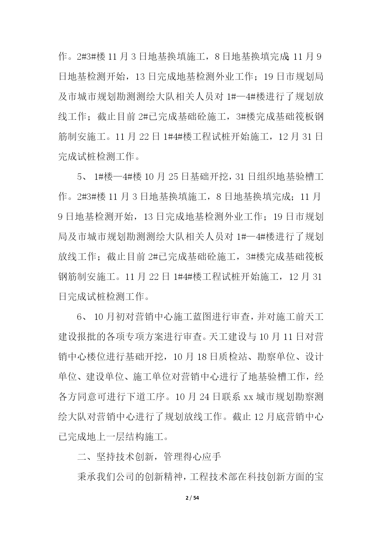 PAGE54/NUMPAGES54技术部工作总结集合15篇技术部工作总结120xx年是不平凡的一年,在这一年,也是我们xx地产公司的大喜之年,我们的心情是欢腾中而又夹杂着沉默;喜悦当中又带着忧伤。在欢送20xx年迎接2xxx年到来之际,我们部门认真地回顾近一年来的工作成果及存在的不足,为了能够使今后的工作在质量上、效率上再上一个台阶,现将本年度完成的主要工作总结如下几个方面:一、人员分工合作,共同完成任务我们技术部是公司的一个重要部门,负责工程项目的工程管理、工程技术资料编写和整理,以及工程项目的施工进行技术监督和技术支持等等。今年,我部组织相关人员,将各项工作任务落实到每一个人,分工合作、加班加点,最终能按时完成生产任务,从而确保了每项工程都能按质按量地完成。工程技术部工程项目包括:1、8月份完成21#、22#地块内的清表工作2、8月15日完成部门专业人员岗位职责的编制,完成工程管理制度建设。3、9月3日完成施工施工用电的接入;9月日完成自来水接入。4、1#楼—4#楼10月25日基础开挖,31日组织地基验槽工作。2#3#楼11月3日地基换填施工,8日地基换填完成;11月9日地基检测开始,13日完成地基检测外业工作;19日市规划局及市城市规划勘测测绘大队相关人员对1#—4#楼进行了规划放线工作;截止目前2#已完成基础砼施工,3#楼完成基础筏板钢筋制安施工。11月22日1#4#楼工程试桩开始施工,12月31日完成试桩检测工作。5、1#楼—4#楼10月25日基础开挖,31日组织地基验槽工作。2#3#楼11月3日地基换填施工,8日地基换填完成;11月9日地基检测开始,13日完成地基检测外业工作;19日市规划局及市城市规划勘测测绘大队相关人员对1#—4#楼进行了规划放线工作;截止目前2#已完成基础砼施工,3#楼完成基础筏板钢筋制安施工。11月22日1#4#楼工程试桩开始施工,12月31日完成试桩检测工作。6、10月初对营销中心施工蓝图进行审查,并对施工前天工建设报批的各项专项方案进行审查。天工建设与10月11日对营销中心楼位进行基础开挖,10月18日质检站、勘察单位、设计单位、建设单位、施工单位对营销中心进行了地基验槽工作,经各方同意可进行下道工序。10月24日联系xx城市规划勘察测绘大队对营销中心进行了规划放线工作。截止12月底营销中心已完成地上一层结构施工。二、坚持技术创新,管理得心应手秉承我们公司的创新精神,工程技术部在科技创新方面的宝贵的经验又得到了较完善的一次体现!我们把xxx项目作为我们部门施工管理和完善工艺的“革命根据地”,从设计和开发项目,在原有基础上根据现场的实际进度情况,做出了许多的改进,把现在所存在的问题和未来运行中可能出现的问题都尽可能的考虑周全,并结合我们经过多年来所掌握的实践经验和技术知识,部分施工方案还通过了多次试验,尽力使xxx项目在将来的运行中实现安全、高效、节能、环保的目标。三、坚持不断学习,提高综合素质为提高工程技术部的人员综合素质,满足公司长远发展建设的需要,我工程技术部长期学习施工现场管理知识,平时鼓励员工积极参加一些专业课程的培训学习,通过近一年来的理论和实践锻炼学习,工程技术部员工的综合能力都有了较好的提高,今后我们一定还会做好理论与实践的锻炼培训工作,以巩固、强化和提高工程技术部队伍的综合素质。四、发扬优良作风,改善不足之处通过近一年的努力,我们的工作取得了一些新进展,如果说本年度工程技术部工作取得了一些成绩的话,离不开公司的正确领导、各部门之间的积极配合和工程技术部全体员工的共同努力。但我们在肯定成绩的同时也看到了有待改善和提高的地方,具体表现为:我们的队伍综合素质还有待进一步提高;其次是技术资料和图纸整理、归类的合理化仍需进一步加强;存在的问题更多的是我们在施工过程中考虑不周,许多问题在施工中才逐渐显露出来,这就要求我们多学习新工艺,新知识,在实践过程中拓展思路,敢于创新。今后我们还将努力完善我们部门综合建设,继续发扬优良作风,改进不足,逐步改进上述提出的问题,为公司再添佳绩。我们坚信,在大家的团结努力下,xxx公司的明天会更加灿烂辉煌!技术部工作总结220xx年度是技术开发部快速、稳步、持续发展的一年。在x总的带领及公司各位领导、各位同事的大力支持下、技术开发部成员的通力协作下,以新产品开发作为技术部的工作重心,同时为其他部门带给技术支持、质量改善,并加强技术部门的内部管理,在这些工作中既取得了成绩,也看到了不足,现就20xx年技术工作向公司领导和各位同事作以下汇报。一、新产品开发xx公司技术开发部在20xx年共进行新产品开xx项,其中xx%实现了批量生产,xx%客户考证中,xx%待考证,xx%在研制开发。这些新项目中,国际客户占xx%,国内客户占xx%。国际客
