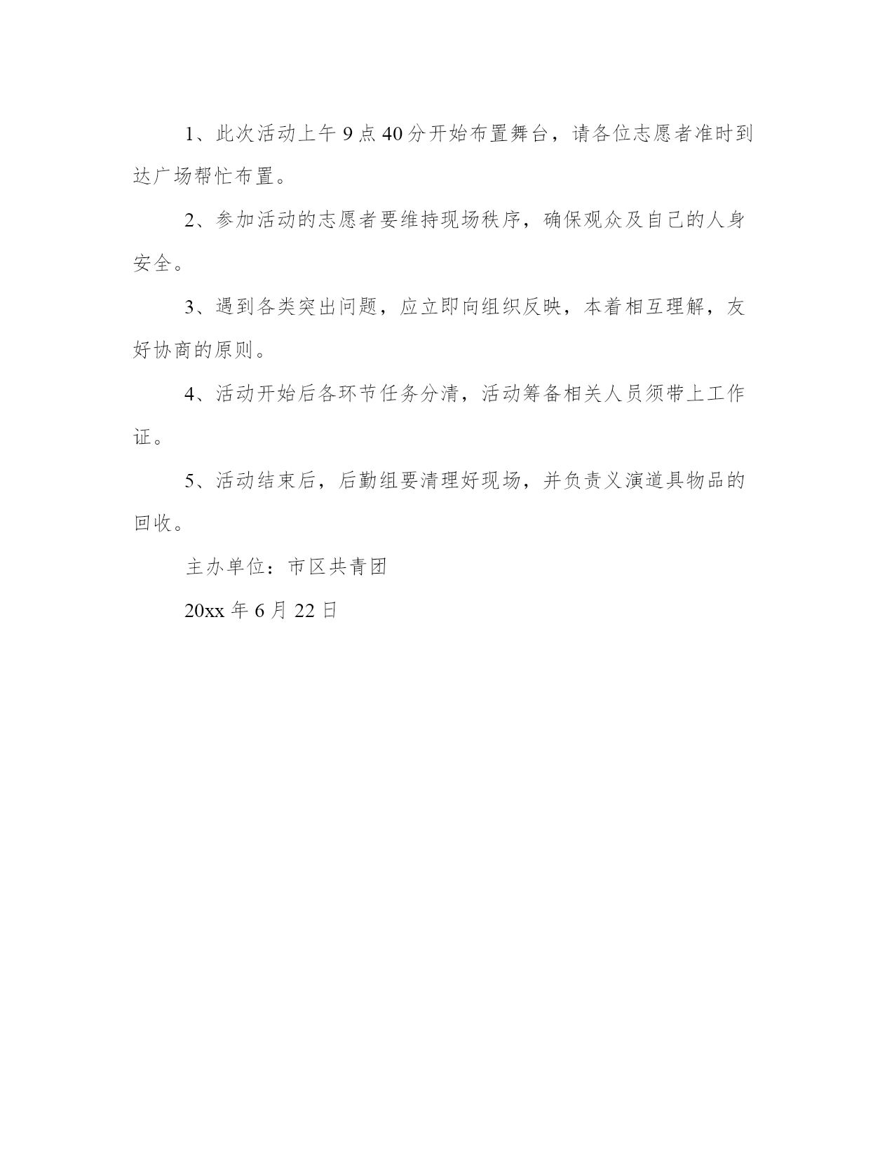 环保公益活动策划案20xx年7月日,今天的环保主题是“绿色世纪”,和共青团志愿者借此通过丰富有趣的环保活动增强环保意识,培养各位志愿者养成环保习惯,并以此带动所有中小学生和群众环保,从而影响整个社会公民共同环保,共同关爱我们的地球家园!二、活动目的:1、唤起社会公民环保意识,用实际行动保护我们共有的家园——地球!、从我做起,从身边做起,抵制环境污染,节约能源,爱护绿色环境。三、活动内容及人员时间安排:20xx年7月日(如因天气原因可推迟日)a组:布置广场挂环保画、环保图片。b组:发放环保邀请函。(主要针对各学校学生、社会公众等)09:40—10:00布置广场挂环保画、环保图片。10:00—11:30环保义演11:30—12:00环保志愿者签名,为志愿者系绿丝带(各学校学生、社会公众等)12:00—12:10为广大热爱环保的市民发放绿色购物布袋。(具体图案如下:四、活动注意事项:1、此次活动上午9点40分开始布置舞台,请各位志愿者准时到达广场帮忙布置。2、参加活动的志愿者要维持现场秩序,确保观众及自己的人身安全。3、遇到各类突出问题,应立即向组织反映,本着相互理解,友好协商的原则。4、活动开始后各环节任务分清,活动筹备相关人员须带上工作证。5、活动结束后,后勤组要清理好现场,并负责义演道具物品的回收。主办单位:市区共青团20xx年6月22日