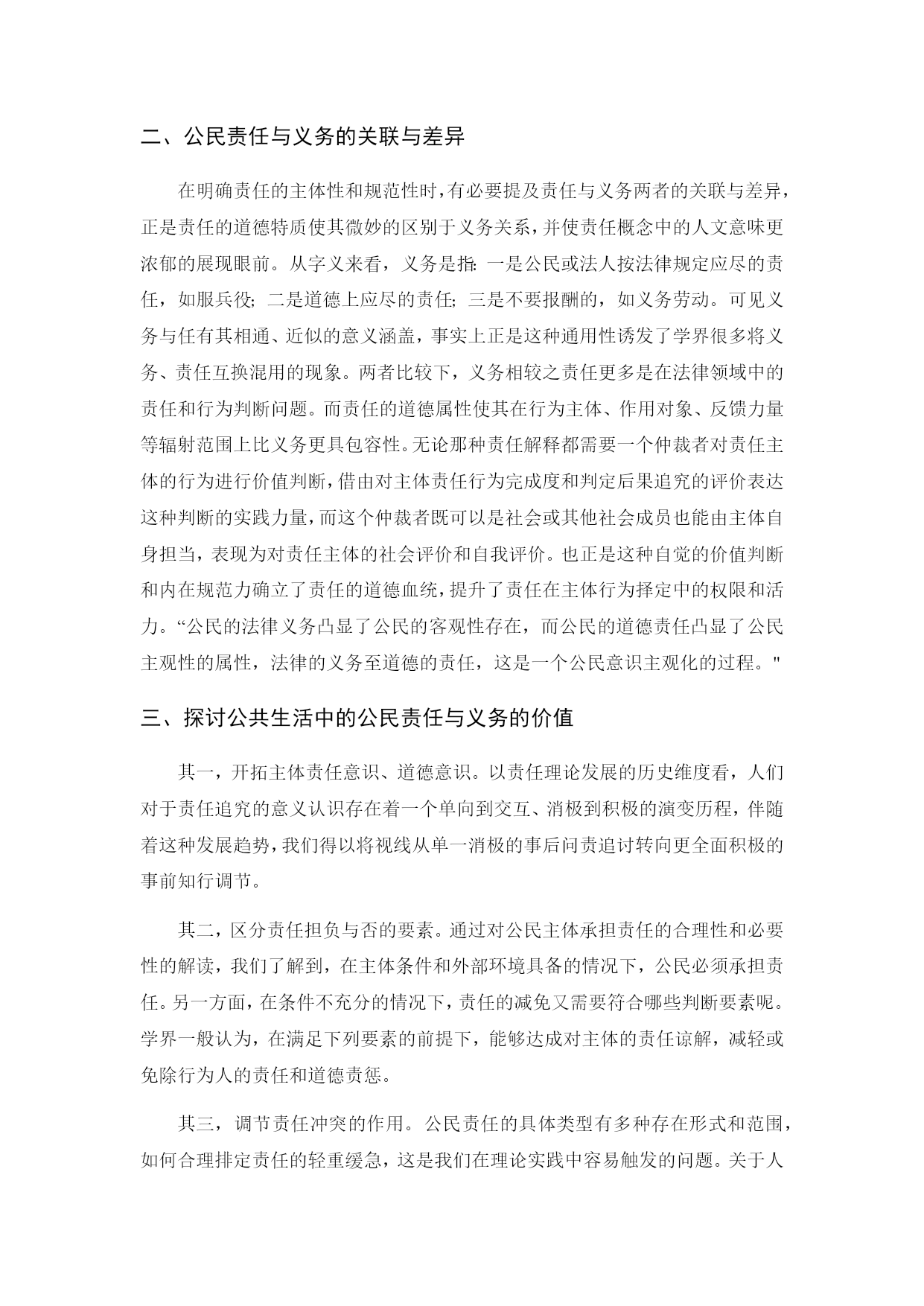 论公共生活中的公民责任与义务摘要《责任伦理》的作者约纳斯指出:当代伦理学的核心问题就是责任问题。责任和义务在当代道德理解中已经成为一个关键术语。作为一种应当性的负担,责任既意味着份内应做之事,也包含了对应做而不作为的谴责和责罚。对责任和义务的判断和评价体现了责任主体与他人和社会的关系,可以说,责任包含着自我与他我的主体性思辨、规则与伦理的社会性争论、自由与角色的意志性选择等多重辩证含义,对它的研究,可以展现出对世俗社会公共生态的人伦关怀,在当代社会具有现实意义。关键词:公共生活;公民责任;公民义务引言从公民这一主体角度辨析责任的生成和确认有其时代背景:现代市场经济社会把伦理道德规范建立在多元主体的博弈之上,对每一公民的意愿给予较为充分的考虑,从而把以往的伦理道德转变成了主体性的伦理。正是在这层现实意义上,我们对公民责任的考察和确认不能只止步于传统社会中政治格局、家庭环境、风俗文化等作用形式,而要进一步把视角置入公民社会的现实语境,从公民这一基本社会角色出发,发掘公民身处经济活动、社会活动中所展现的个体性和普遍性、主体的差异化和共通面。一、相关概念界定(一)公共生活公共生活是与私人生活相对应的公共交往场景。现代文明的跨领域性和主体性特征,和谐公民社会所伸张的道德自律和弹性规则,要求作为其中活动主体的公民,明晰责任担当的必然性、合理性,通过互相的责任履践实现各自的发展图景。公民责任在公共生活的社会生态中充当的重要节点。市场经济、民主政治、科学理性与信息化,导致社会的公共化程度空前提高,开放性和公共性成为现代公民交往状态的两个主要特征。在社群层面,社会生活方式和生活价值观念的共享范围,信息与行为的交流范围,人际、群际关系及其处理方式的透明和规范程度等,都获得了前所未有的广度和深度。从公民个体看,个人生活空间获得了巨大的拓展,个人生活所具有的公共性和非私密性也与日俱增,个人生活的时空维度显示出空前的公共取向和价值意义。也正是由于现代文所具有的这种开放性和公共性特征,使人们得以在不同的生活形式中提炼出共同的实践诉求,进而使维系公共利益的共同体生活成为公共生活。(二)公民责任与义务1.公民责任公民责任作为一个复合名词,要阐明它的含义和内容,需要先明示“公民”和“责任”这两者的内容和关系。现代意义上的公民是一个具有独立自由平等人格享有充分的法律权利、政治权、利社会权利和参与权利的人。对责任的一般定义可以分为两个连贯解释:一是份内应做的事,如尽责任;二是没有做好份内应做的事,因而应当承担的过失,如追究责任。这里可以对责任从两方面来理解,首先责任意味份内应做之事,在此基础上,责任还意味着未做好份内应做之事所应受的谴责和制裁。2.公民义务公民义务是指权利主体应当作出或者不作出一定行为的约束,如享有一定权利的公民或法人依法应负的责任。公民义务是法律关系的构成要素之一,要依靠国家的强制力(法律的或行政的)来保证履行。任何一项权利必有相应的义务,在法律上以明示(如义务性规范、禁止性规范),或者默示(如授权性规范)的形式予以规定。二、公民责任与义务的关联与差异在明确责任的主体性和规范性时,有必要提及责任与义务两者的关联与差异,正是责任的道德特质使其微妙的区别于义务关系,并使责任概念中的人文意味更浓郁的展现眼前。从字义来看,义务是指:一是公民或法人按法律规定应尽的责任,如服兵役;二是道德上应尽的责任;三是不要报酬的,如义务劳动。可见义务与任有其相通、近似的意义涵盖,事实上正是这种通用性诱发了学界很多将义务、责任互换混用的现象。两者比较下,义务相较之责任更多是在法律领域中的责任和行为判断问题。而责任的道德属性使其在行为主体、作用对象、反馈力量等辐射范围上比义务更具包容性。无论那种责任解释都需要一个仲裁者对责任主体的行为进行价值判断,借由对主体责任行为完成度和判定后果追究的评价表达这种判断的实践力量,而这个仲裁者既可以是社会或其他社会成员也能由主体自身担当,表现为对责任主体的社会评价和自我评价。也正是这种自觉的价值判断和内在规范力确立了责任的道德血统,提升了责任在主体行为择定中的权限和活力。“公民的法律义务凸显了公民的客观性存在,而公民的道德责任凸显了公民主观性的属性,法律的义务至道德的责任,这是一个公民意识主观化的过程。"三、探讨公共生活中的公民责任与义务的价值其一,开拓主体责任意识、道德意识。以责任理论发展的历史维度看,人们对于责任追究的意义认识存在着一个单向到交互、消极到积极的演变历程,伴随着这种发展趋势,我们得以将视线从单一消极的事后问责追讨转向更全面积极的事前知行调节。其二,区分责任担负与否的要素。通过对公民主体承担责任的合理性和必要性的解读,我们了解到,在主体条件和外部环境具备的情况下,公民必须承担责任