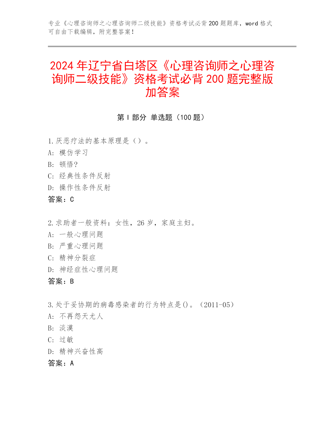 2024年辽宁省白塔区《心理咨询师之心理咨询师二级技能》资格考试必背200题完整版加答案