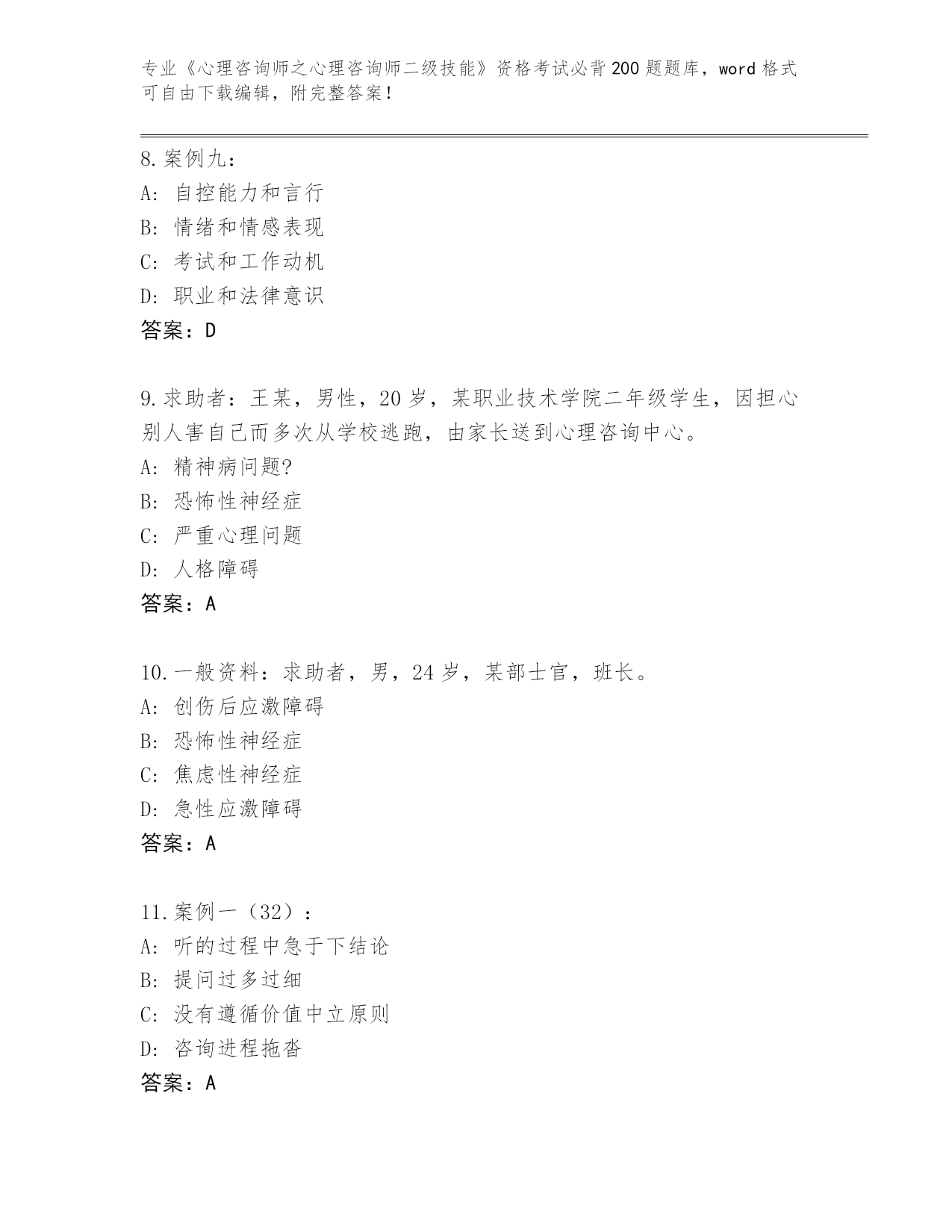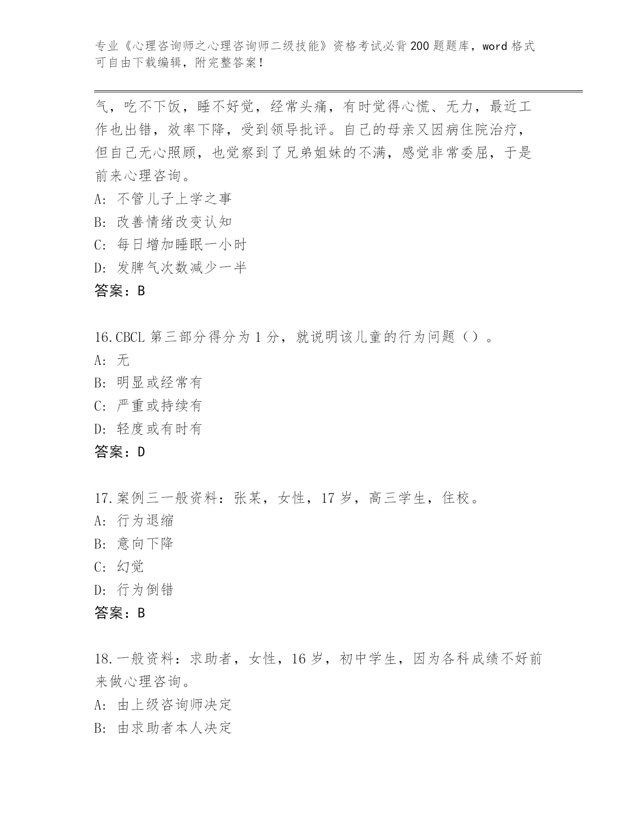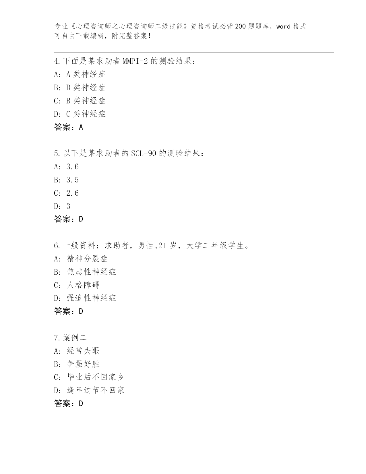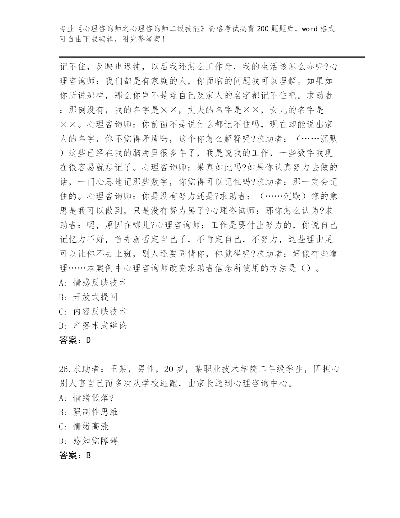 甘肃省迭部县完整版《心理咨询师之心理咨询师二级技能》资格考试必背200题完整版加答案