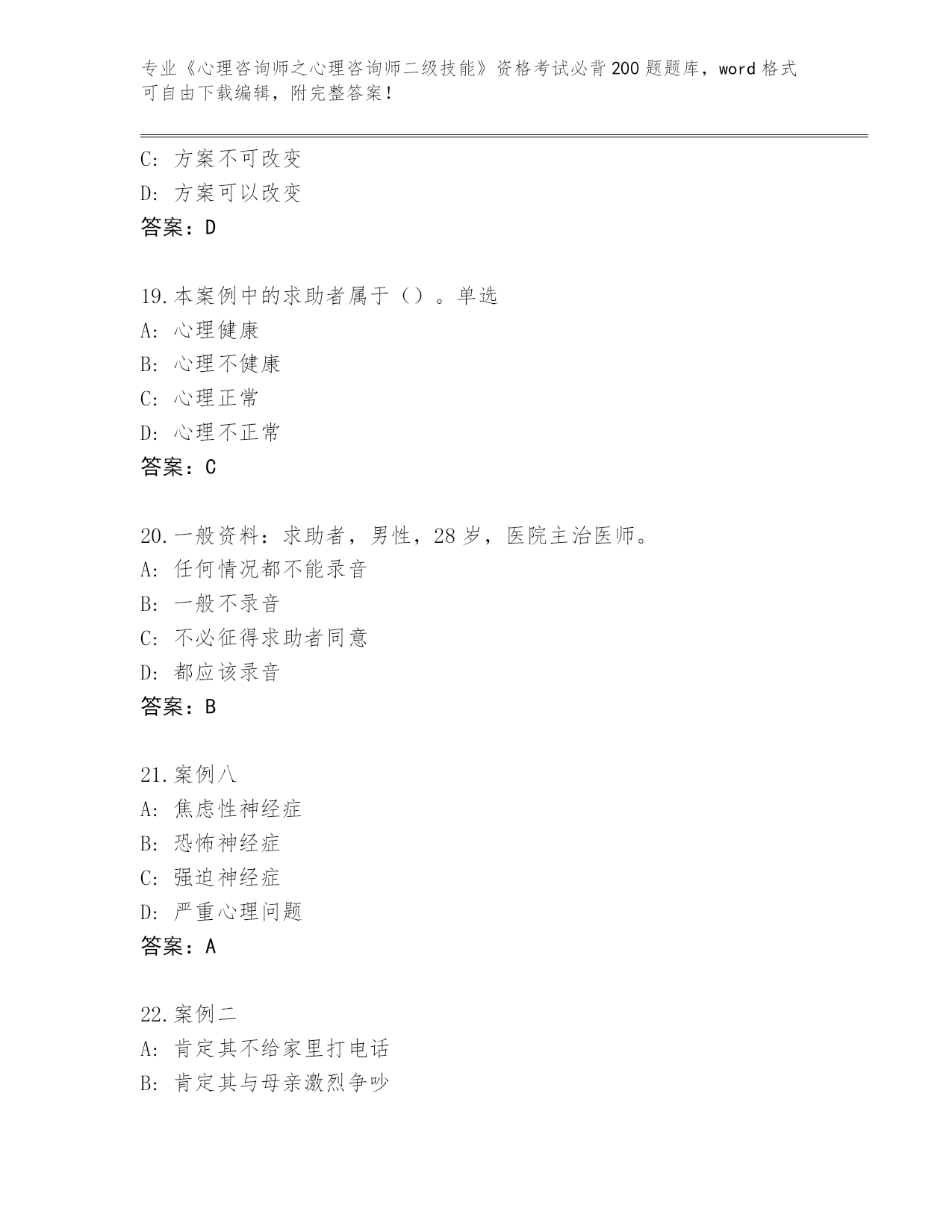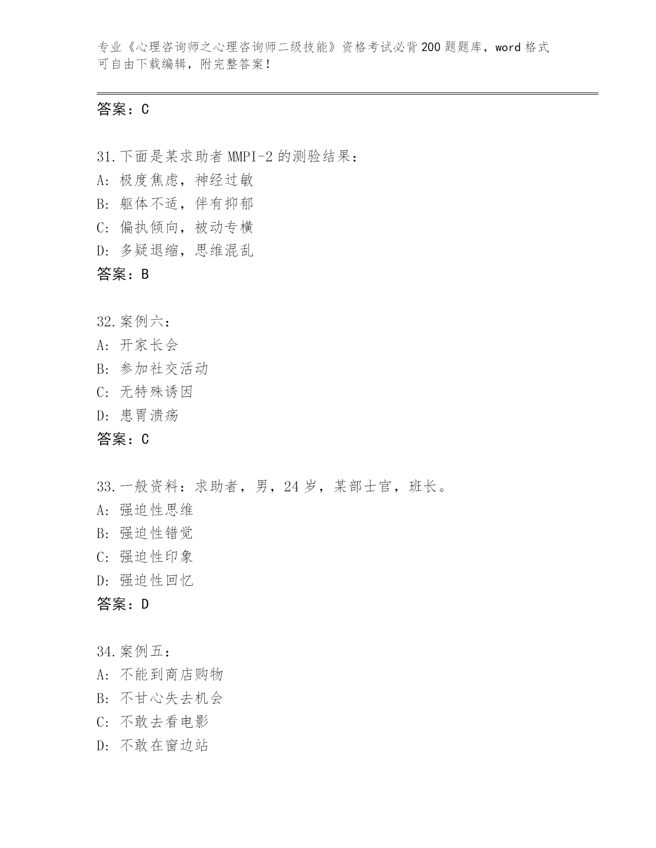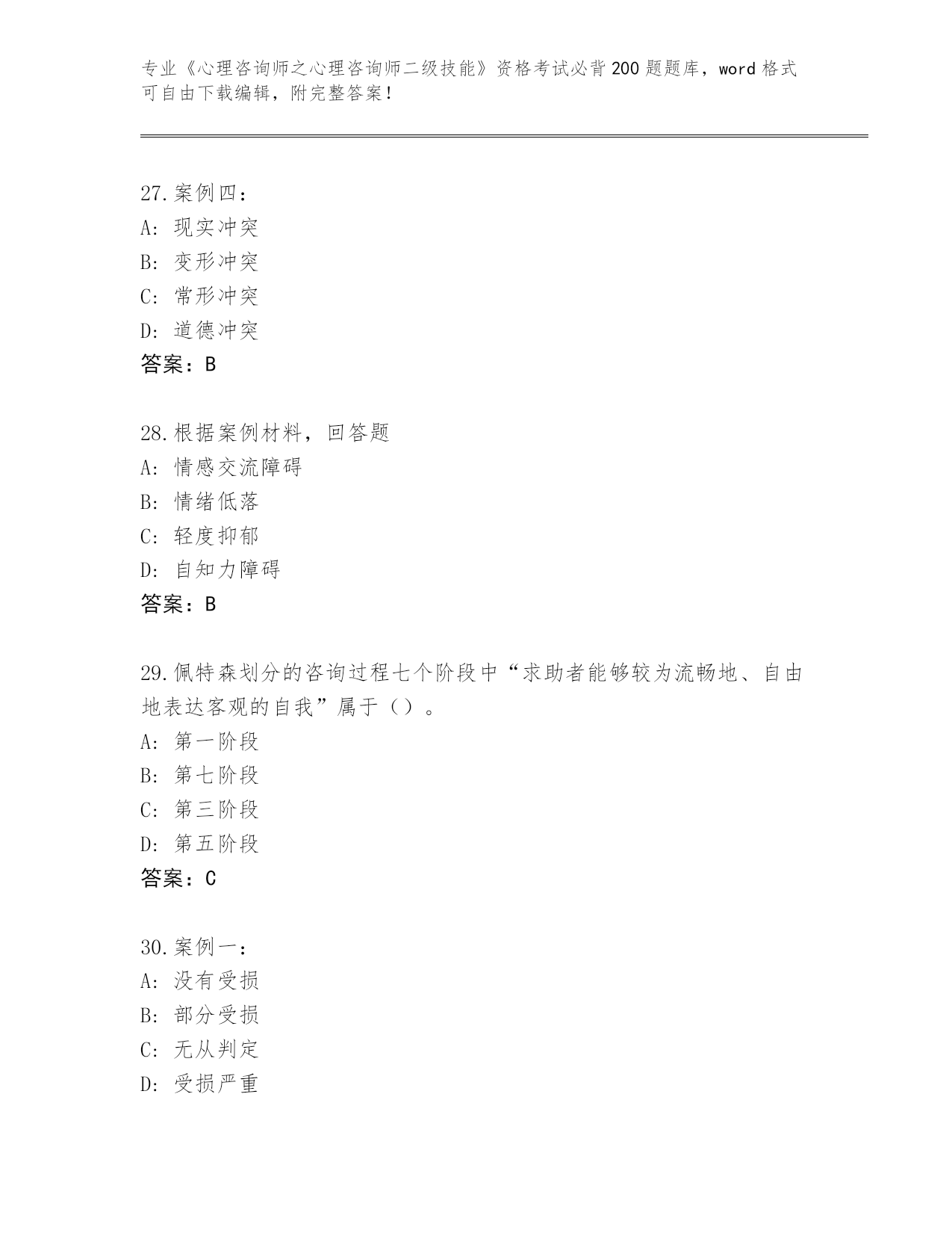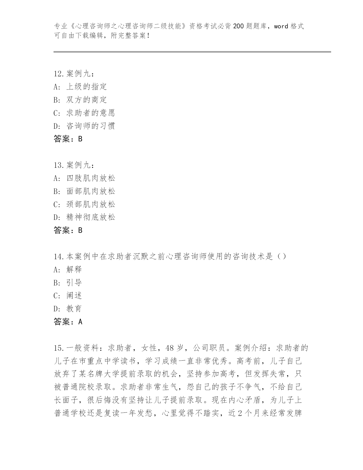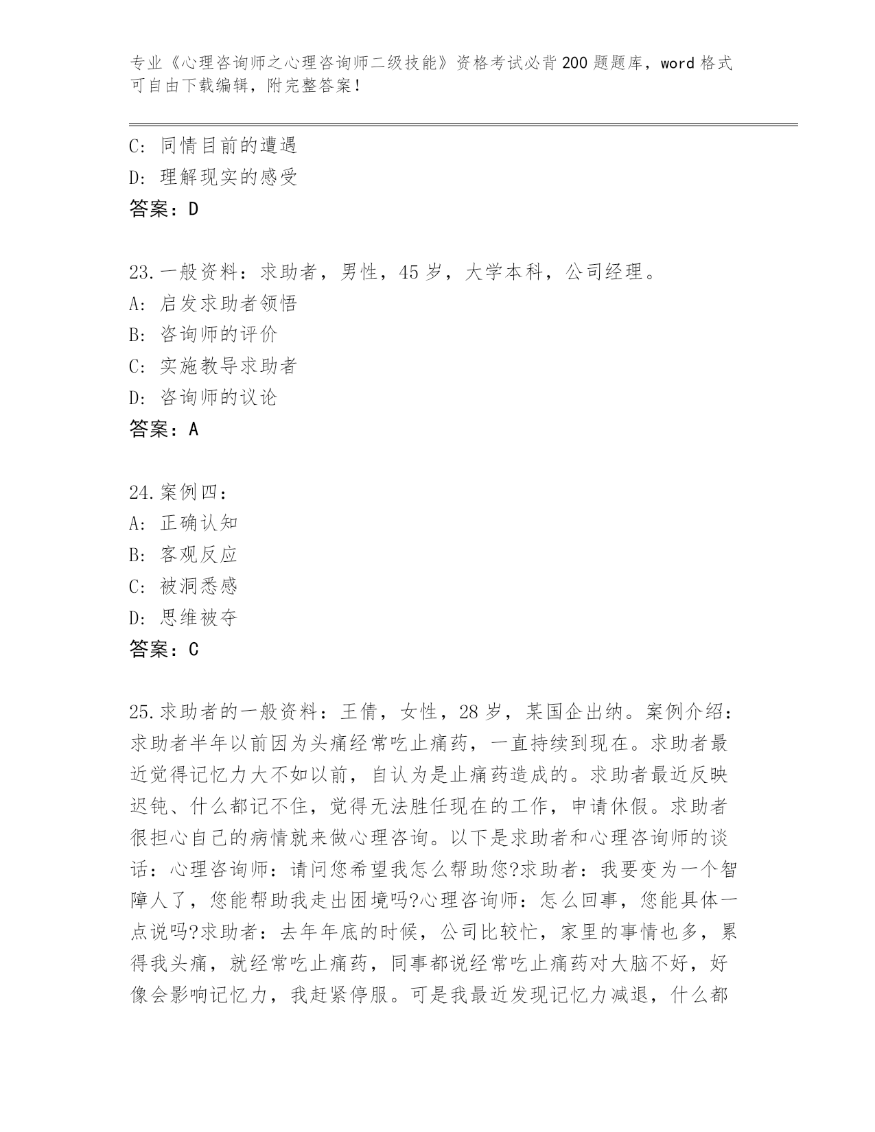 甘肃省迭部县完整版《心理咨询师之心理咨询师二级技能》资格考试必背200题完整版加答案