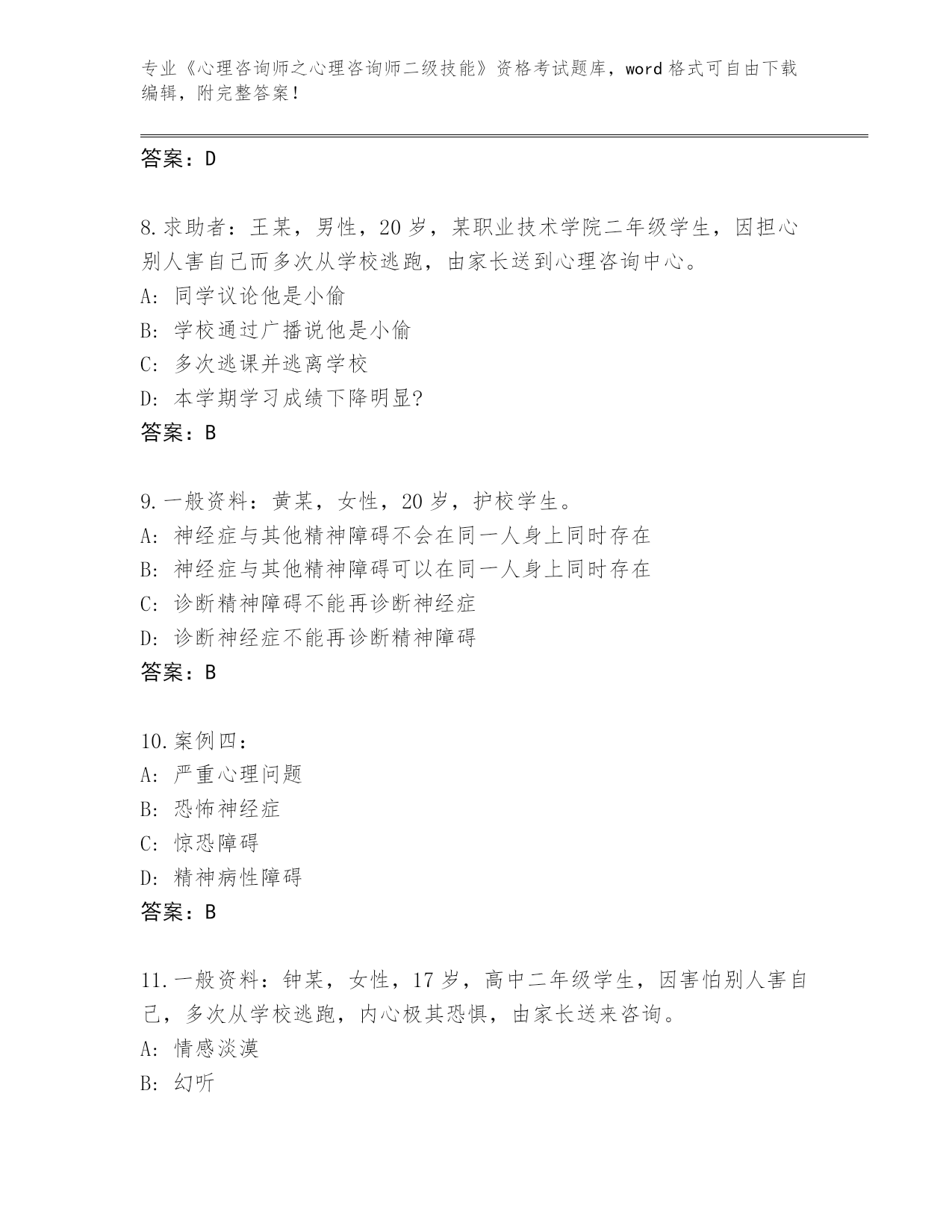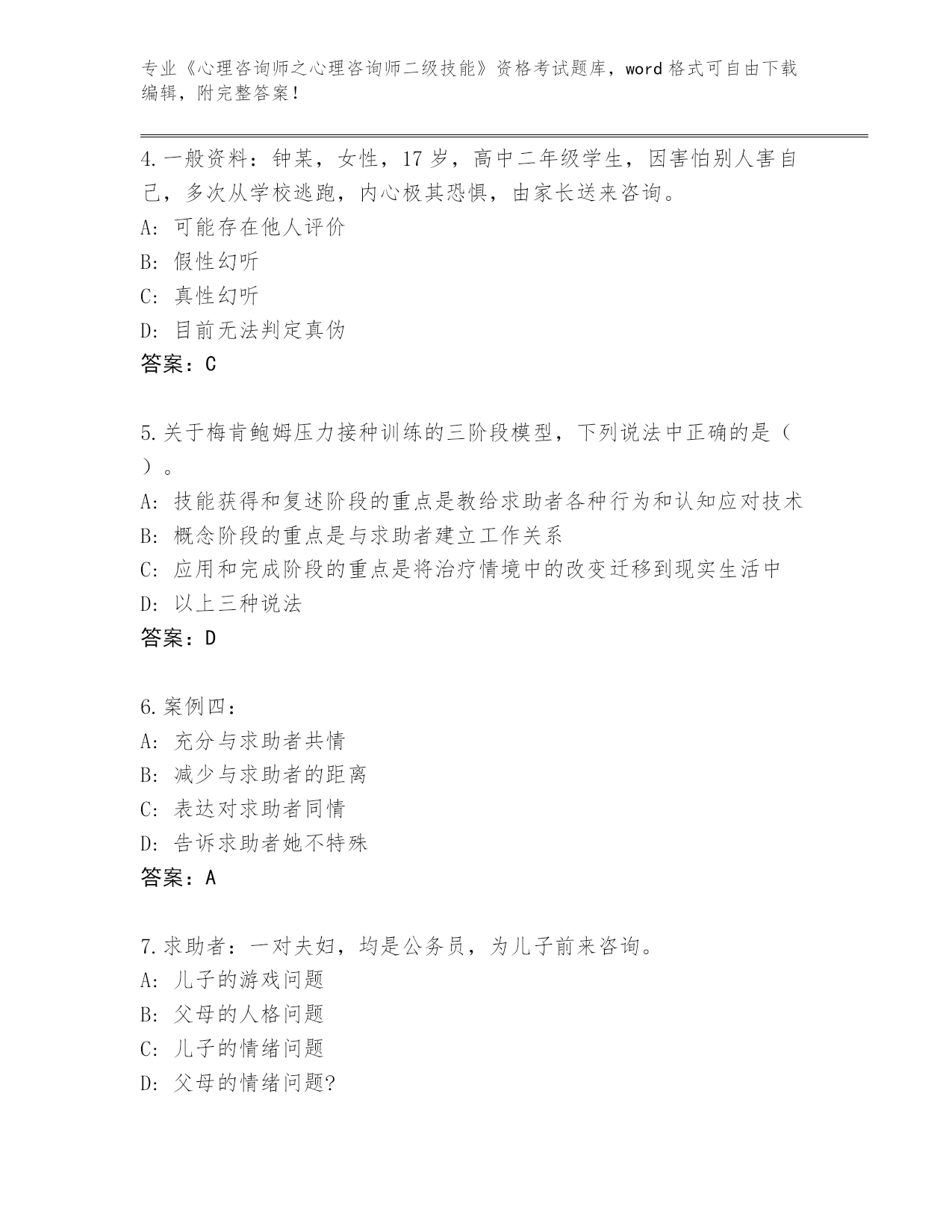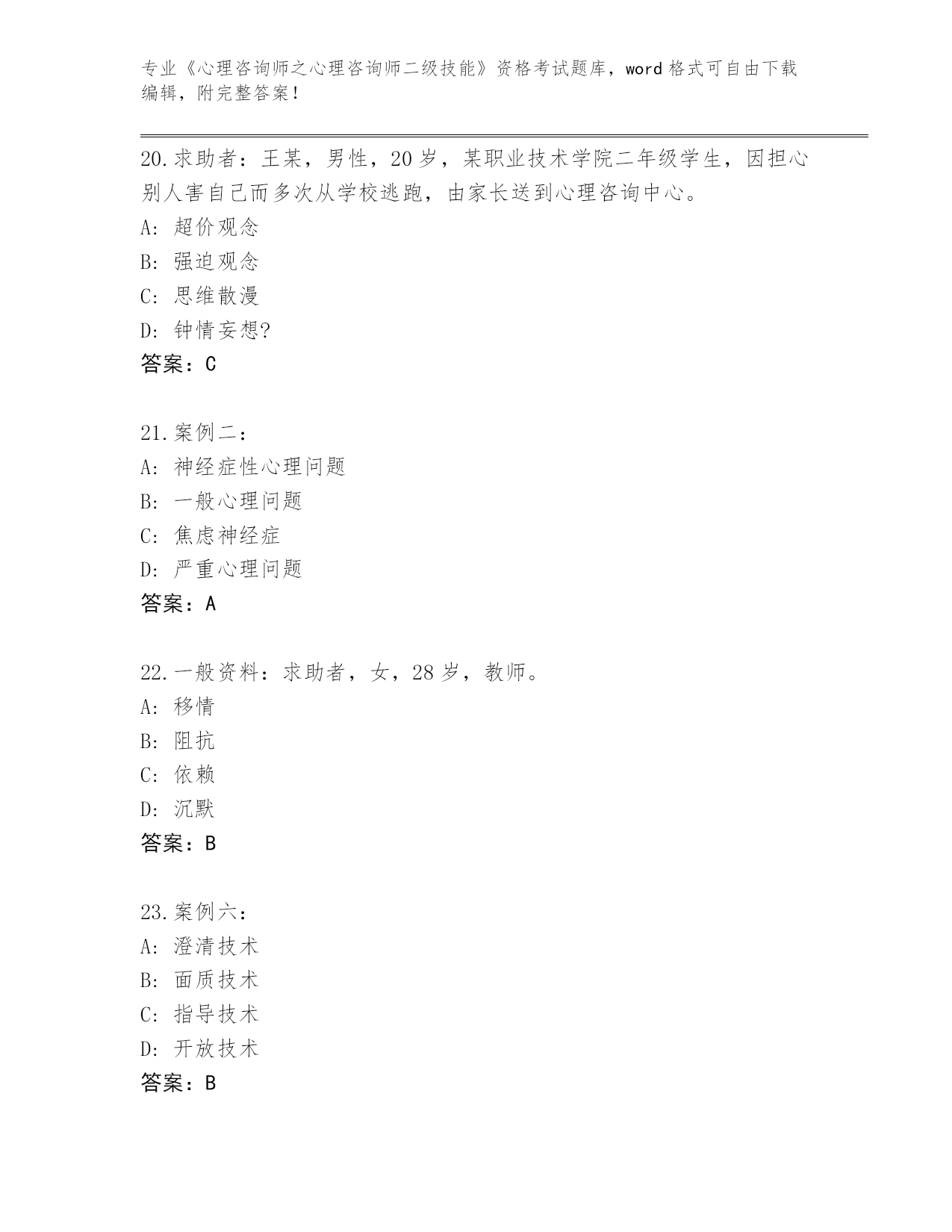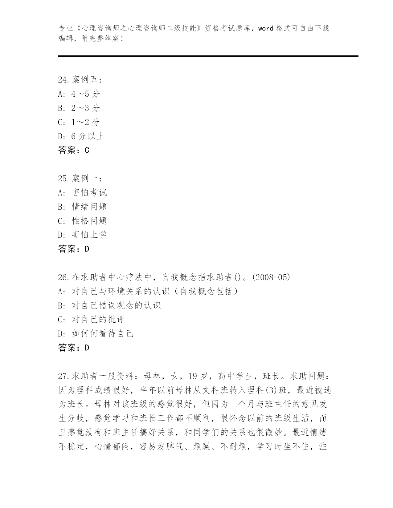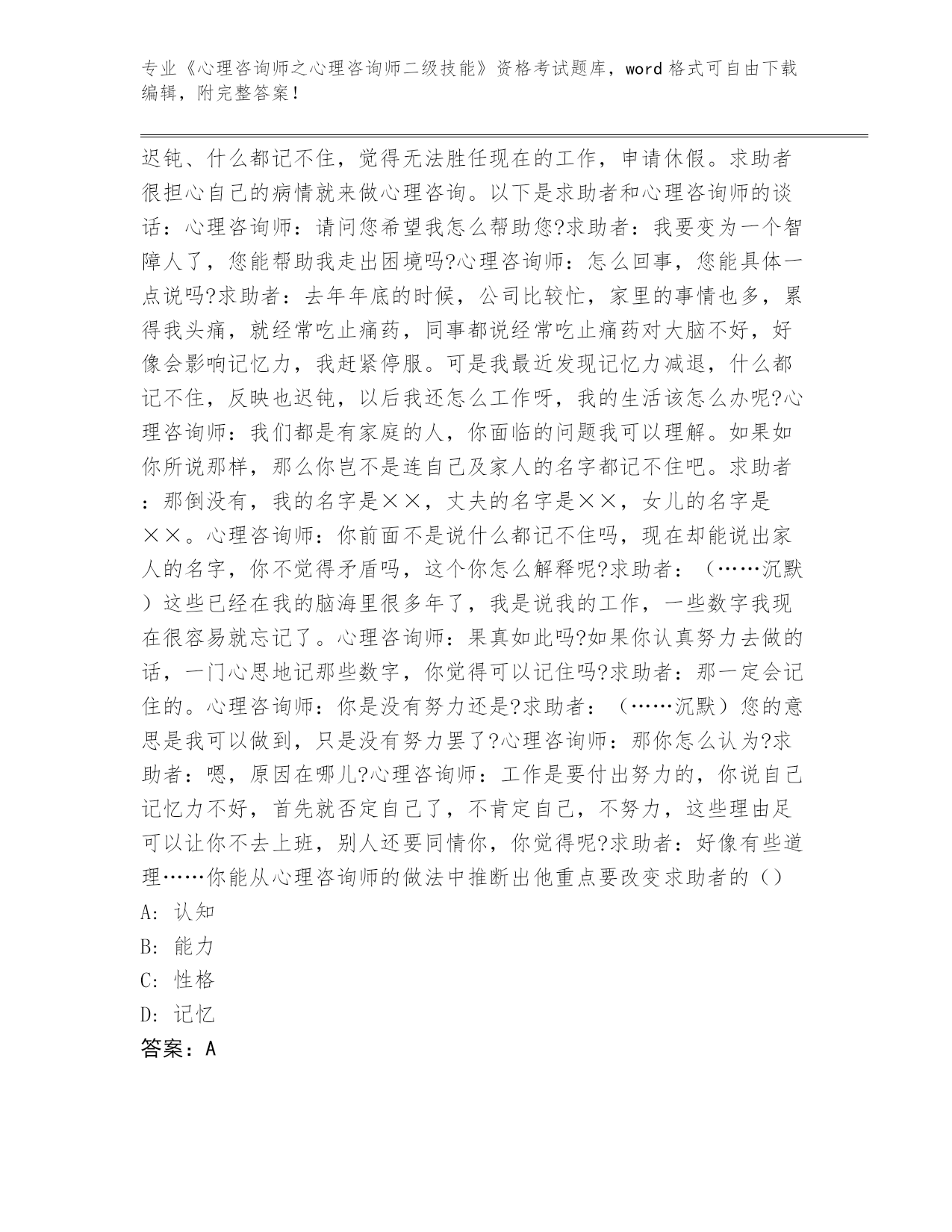 湖南省岳塘区2024《心理咨询师之心理咨询师二级技能》资格考试必刷200题完整版【网校专用】