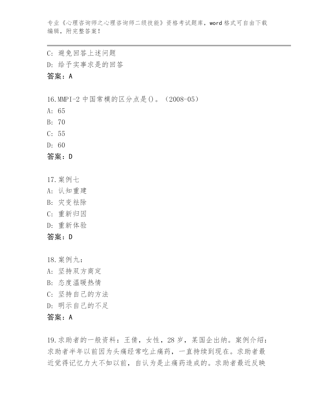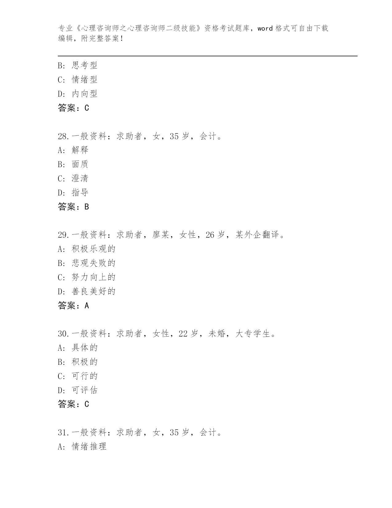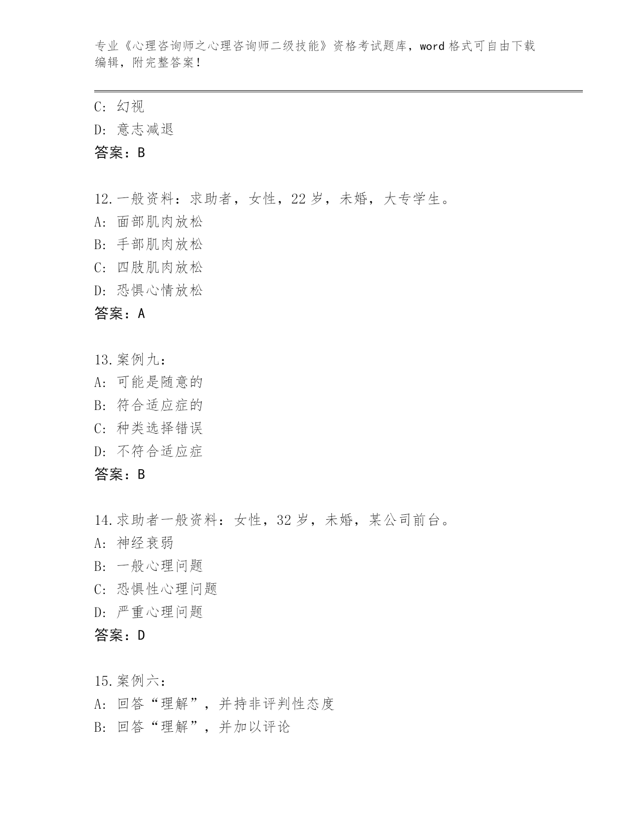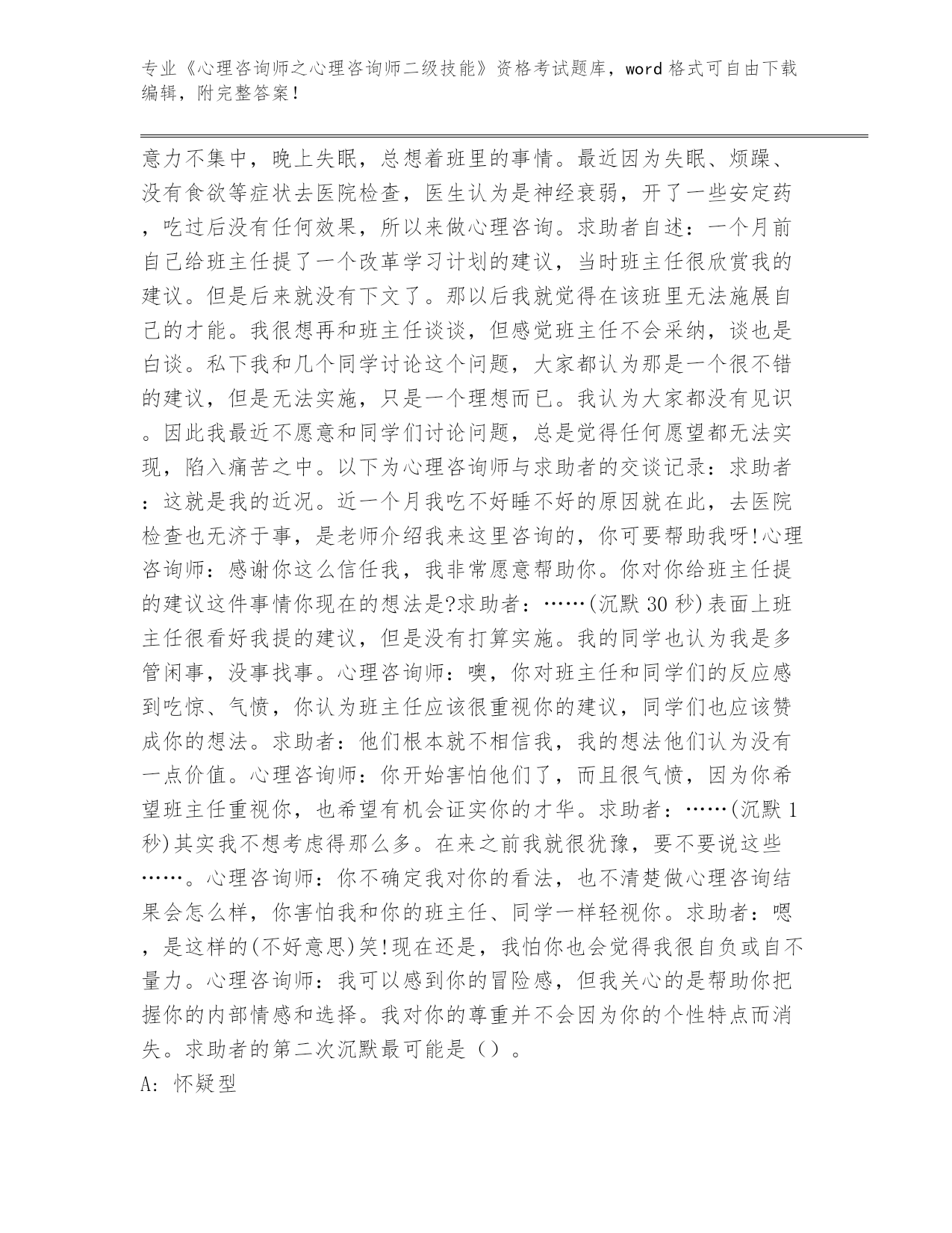 湖南省内部使用《心理咨询师之心理咨询师二级技能》资格考试内部题库(历年真题)