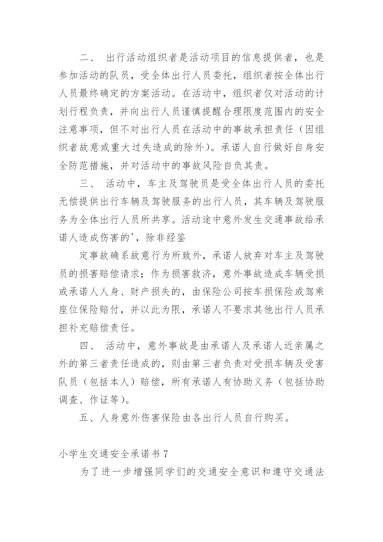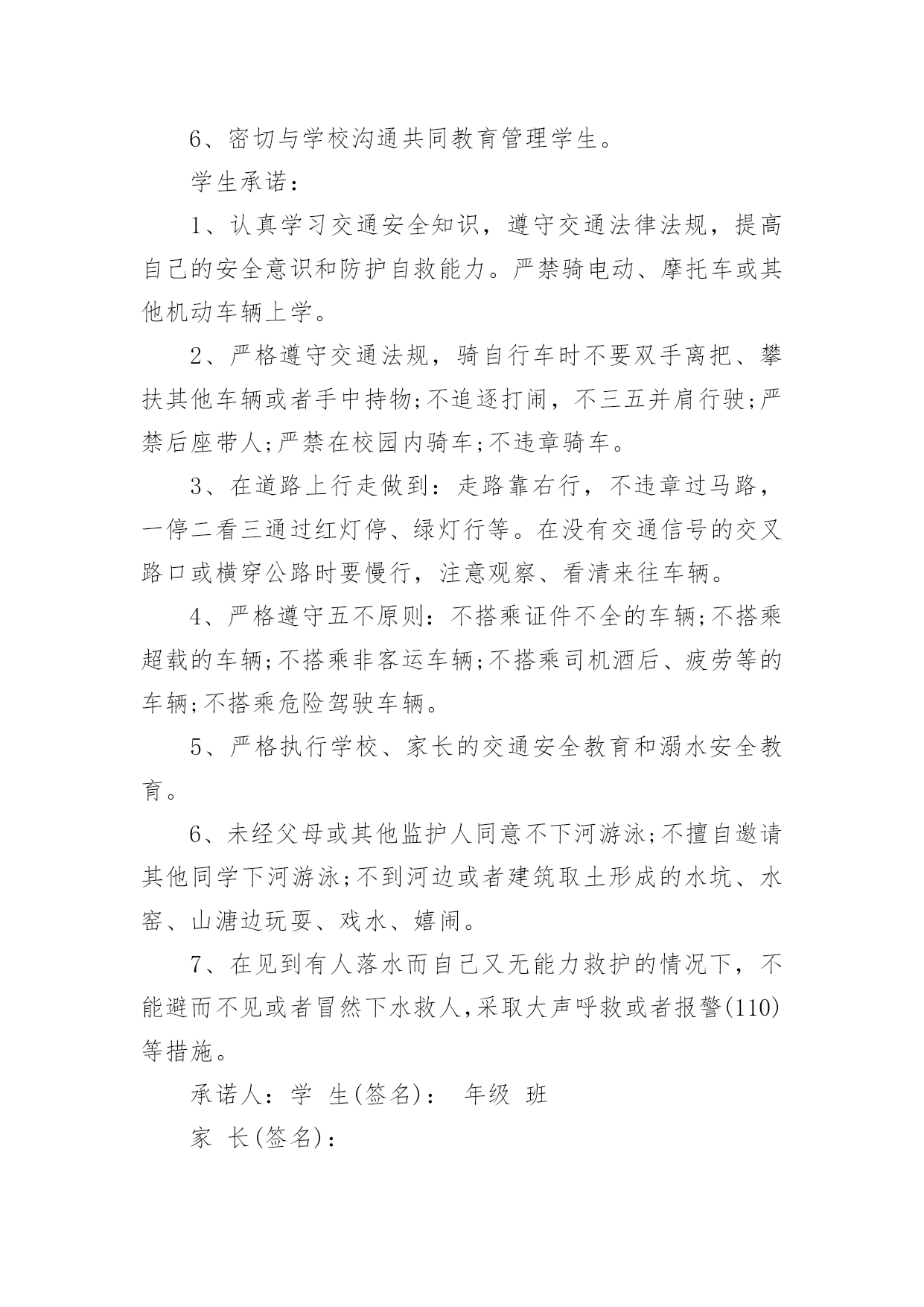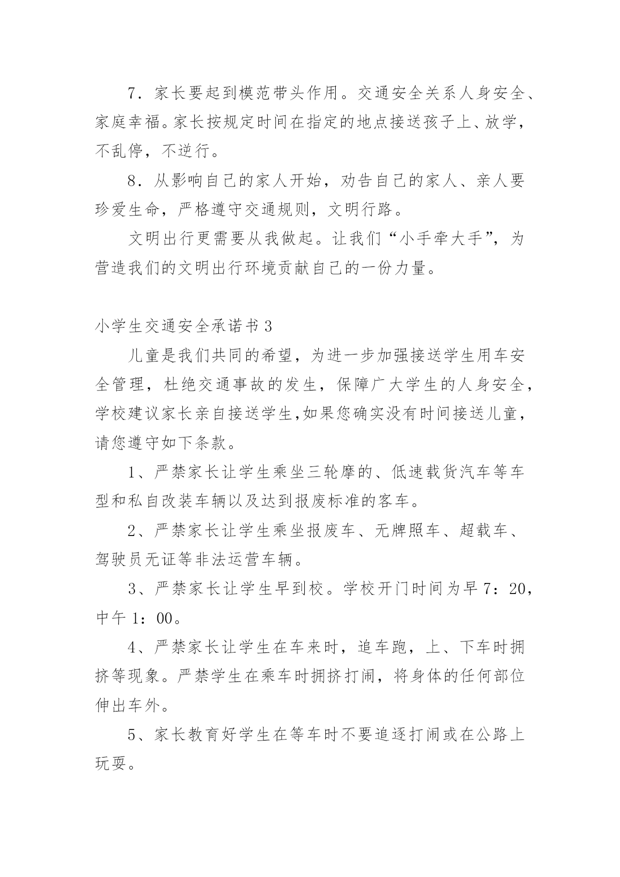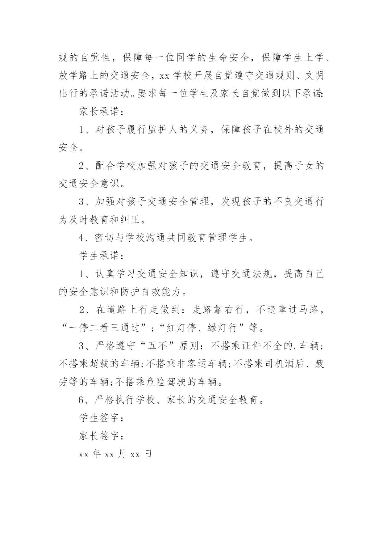 小学生交通安全承诺书随着社会不断地进步,很多地方都会使用到承诺书,承诺书在写作上有一定的规范。写起承诺书来就毫无头绪?以下是小编为大家整理的小学生交通安全承诺书,仅供参考,大家一起来看看吧。小学生交通安全承诺书1安全无小事,防交通安全、防溺水安全从我做起。为增强学生防交通、防溺水安全意识和遵守交通法律法规自觉性和提高抵御溺水能力,预防和减少道路交通、溺水事故,保障学生上学、放学路上的交通安全、溺水安全,我们愿意作出以下承诺:家长承诺:1、对儿童履行监护人的义务,保障儿童在校外的交通安全和溺水安全。2、配合学校加强对儿童交通、溺水安全教育,提高子女防交通、防溺水安全意识。3、加强对儿童交通安全管理,发现儿童的'不良交通行为及时教育和纠正。4、指导儿童正确骑行自行车,严格禁止儿童骑电动、摩托车等机动车上学、放学。特别是严禁儿童飚车。5、教育自己儿童不私自下水游泳;尽到监护责任,做好儿童上学、放学路途中、双休日、节假日溺水监护工作。6、密切与学校沟通共同教育管理学生。学生承诺:1、认真学习交通安全知识,遵守交通法律法规,提高自己的安全意识和防护自救能力。严禁骑电动、摩托车或其他机动车辆上学。2、严格遵守交通法规,骑自行车时不要双手离把、攀扶其他车辆或者手中持物;不追逐打闹,不三五并肩行驶;严禁后座带人;严禁在校园内骑车;不违章骑车。3、在道路上行走做到:走路靠右行,不违章过马路,一停二看三通过红灯停、绿灯行等。在没有交通信号的交叉路口或横穿公路时要慢行,注意观察、看清来往车辆。4、严格遵守五不原则:不搭乘证件不全的车辆;不搭乘超载的车辆;不搭乘非客运车辆;不搭乘司机酒后、疲劳等的车辆;不搭乘危险驾驶车辆。5、严格执行学校、家长的交通安全教育和溺水安全教育。6、未经父母或其他监护人同意不下河游泳;不擅自邀请其他同学下河游泳;不到河边或者建筑取土形成的水坑、水窑、山溏边玩耍、戏水、嬉闹。7、在见到有人落水而自己又无能力救护的情况下,不能避而不见或者冒然下水救人,采取大声呼救或者报警(110)等措施。承诺人:学生(签名):年级班家长(签名):年月日小学生交通安全承诺书2千校万班百万师生文明行动“文明出行-小手牵大手”承诺书生命无价,安全为先。安全出行是每一个公民的愿望,营造文明和谐的交通环境,是每一位公民的责任,遵守交通法规,是每个公民的`义务。为了时光少在拥堵中虚耗,生命不在事故中流逝,让我们一起来做文明出行的好榜样。我和爸爸妈妈一起郑重作出以下承诺:1.认真学习交通安全知识,牢固树立文明交通意识,提高防护自救能力。2.不骑“故障车”,不骑车带人,12岁以下同学不得骑车上路。3.过马路时遵守信号灯、不闯红灯、不抢黄灯,走人行横道,做到“一慢二看三通过”。4.不在马路上打闹、嬉戏或追逐,不翻越道路隔离护栏,不在车辆临近时突然横穿马路。5.乘车时要在指定地点侯车,上车时自觉排队,遵守“先下后上”规则,自觉遵守乘车纪律,不抢座,不打架,不将头手伸出窗外,下车时不急于过马路。6.不搭乘无牌、无证、无营运资格的各类车辆,不搭乘超载车辆,不搭乘车况不好的车辆;不搭乘四轮车、电动三轮车,不搭乘驾驶员有问题(酒后、疲劳等)的车辆。7.家长要起到模范带头作用。交通安全关系人身安全、家庭幸福。家长按规定时间在指定的地点接送孩子上、放学,不乱停,不逆行。8.从影响自己的家人开始,劝告自己的家人、亲人要珍爱生命,严格遵守交通规则,文明行路。文明出行更需要从我做起。让我们“小手牵大手”,为营造我们的文明出行环境贡献自己的一份力量。小学生交通安全承诺书3儿童是我们共同的希望,为进一步加强接送学生用车安全管理,杜绝交通事故的发生,保障广大学生的人身安全,学校建议家长亲自接送学生,如果您确实没有时间接送儿童,请您遵守如下条款。1、严禁家长让学生乘坐三轮摩的、低速载货汽车等车型和私自改装车辆以及达到报废标准的客车。2、严禁家长让学生乘坐报废车、无牌照车、超载车、驾驶员无证等非法运营车辆。3、严禁家长让学生早到校。学校开门时间为早7:20,中午1:00。4、严禁家长让学生在车来时,追车跑,上、下车时拥挤等现象。严禁学生在乘车时拥挤打闹,将身体的任何部位伸出车外。5、家长教育好学生在等车时不要追逐打闹或在公路上玩耍。6、家长要经常对学生进行乘车安全教育,教育学生遵守乘车秩序。7、家长要经常对接送学生车辆的.车况、运营手续、乘坐人数等情况进行监督检查,发现问题立即向公安交管部门举报。8、家长应该按指定时间、地点接送学生,如延误接送时间或特殊情况(学生在放学后在校外被冒领、或出现任何意外事故)后果自负。9、家长必须与车主签订《安全行车协议书》,进一步划清责任主体,提高驾驶员的责任意识。10、家长如经济条件许可,应为子女办理意外伤害保险。11、如果您的儿童必须乘坐班车上学,请
