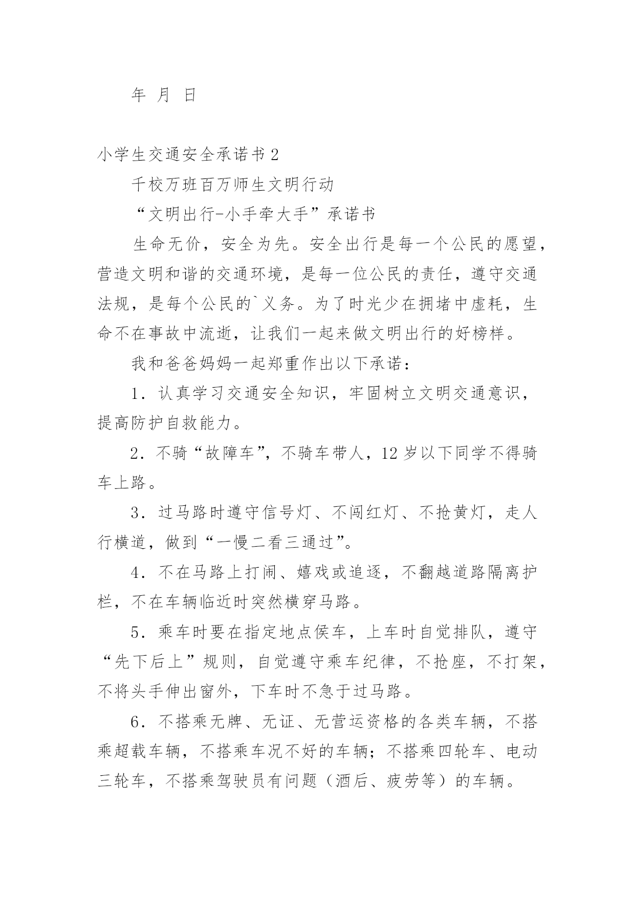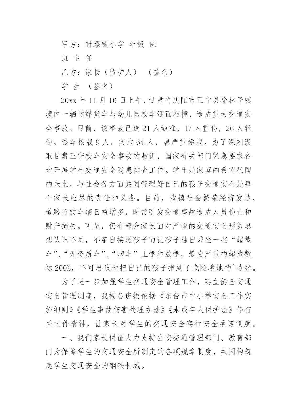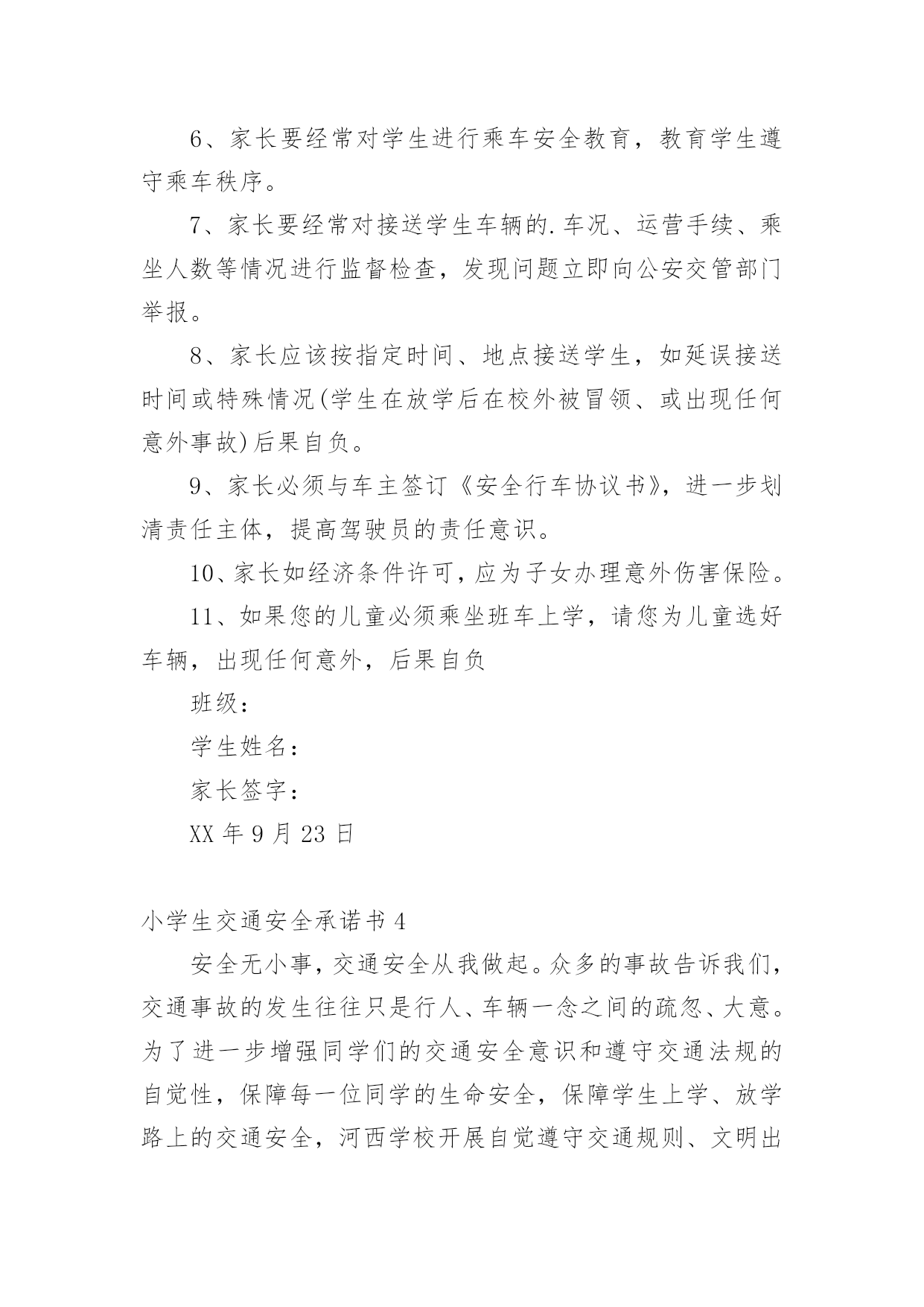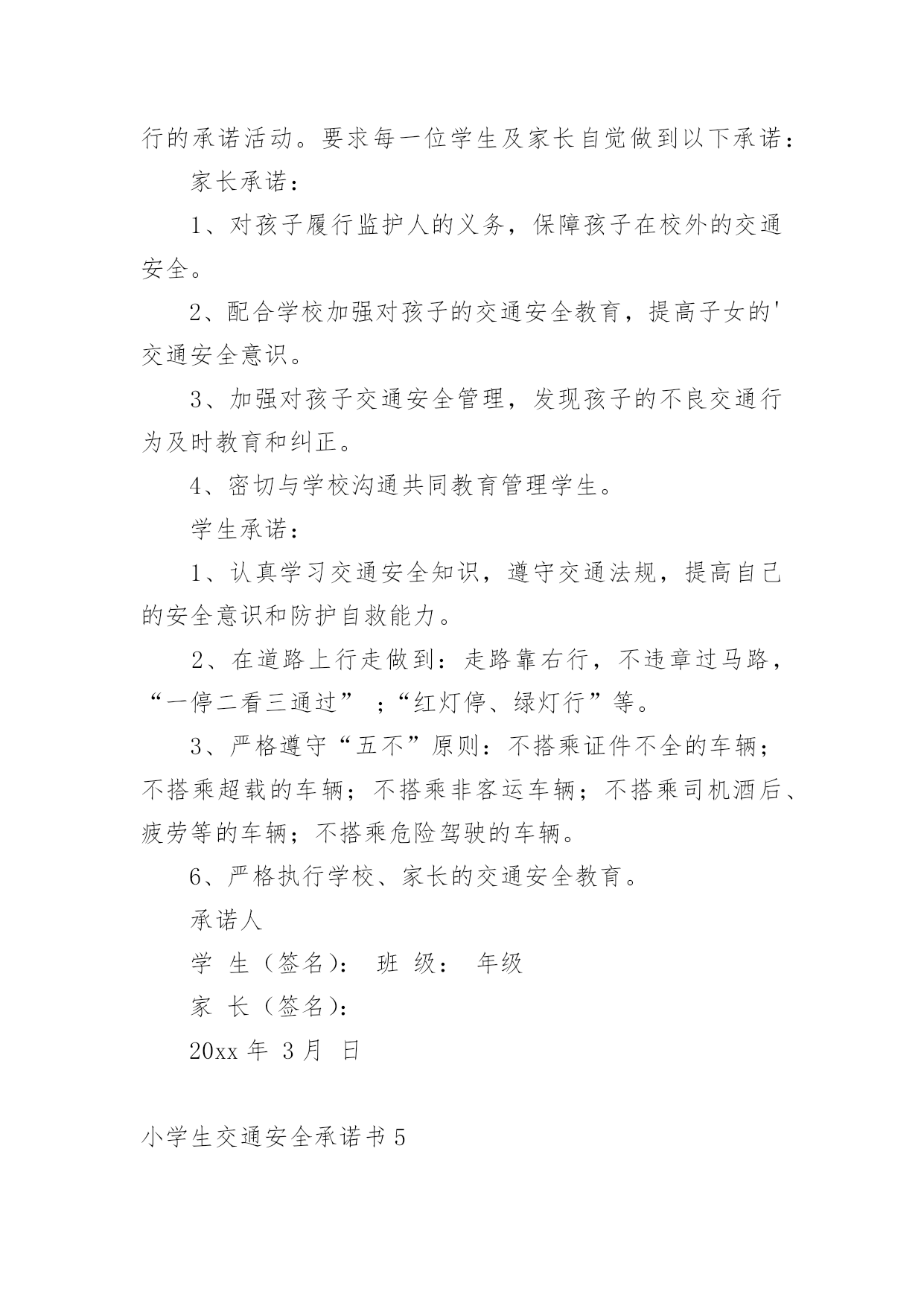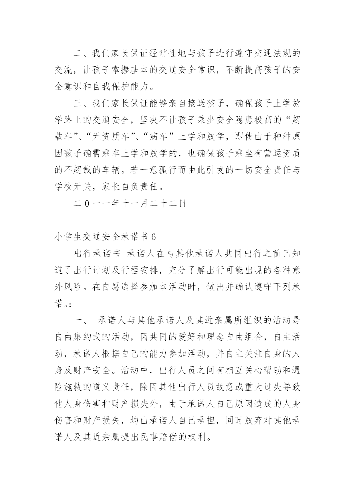 小学生交通安全承诺书随着社会不断地进步,很多地方都会使用到承诺书,承诺书在写作上有一定的规范。写起承诺书来就毫无头绪?以下是小编为大家整理的小学生交通安全承诺书,仅供参考,大家一起来看看吧。小学生交通安全承诺书1安全无小事,防交通安全、防溺水安全从我做起。为增强学生防交通、防溺水安全意识和遵守交通法律法规自觉性和提高抵御溺水能力,预防和减少道路交通、溺水事故,保障学生上学、放学路上的交通安全、溺水安全,我们愿意作出以下承诺:家长承诺:1、对儿童履行监护人的义务,保障儿童在校外的交通安全和溺水安全。2、配合学校加强对儿童交通、溺水安全教育,提高子女防交通、防溺水安全意识。3、加强对儿童交通安全管理,发现儿童的'不良交通行为及时教育和纠正。4、指导儿童正确骑行自行车,严格禁止儿童骑电动、摩托车等机动车上学、放学。特别是严禁儿童飚车。5、教育自己儿童不私自下水游泳;尽到监护责任,做好儿童上学、放学路途中、双休日、节假日溺水监护工作。6、密切与学校沟通共同教育管理学生。学生承诺:1、认真学习交通安全知识,遵守交通法律法规,提高自己的安全意识和防护自救能力。严禁骑电动、摩托车或其他机动车辆上学。2、严格遵守交通法规,骑自行车时不要双手离把、攀扶其他车辆或者手中持物;不追逐打闹,不三五并肩行驶;严禁后座带人;严禁在校园内骑车;不违章骑车。3、在道路上行走做到:走路靠右行,不违章过马路,一停二看三通过红灯停、绿灯行等。在没有交通信号的交叉路口或横穿公路时要慢行,注意观察、看清来往车辆。4、严格遵守五不原则:不搭乘证件不全的车辆;不搭乘超载的车辆;不搭乘非客运车辆;不搭乘司机酒后、疲劳等的车辆;不搭乘危险驾驶车辆。5、严格执行学校、家长的交通安全教育和溺水安全教育。6、未经父母或其他监护人同意不下河游泳;不擅自邀请其他同学下河游泳;不到河边或者建筑取土形成的水坑、水窑、山溏边玩耍、戏水、嬉闹。7、在见到有人落水而自己又无能力救护的情况下,不能避而不见或者冒然下水救人,采取大声呼救或者报警(110)等措施。承诺人:学生(签名):年级班家长(签名):年月日小学生交通安全承诺书2千校万班百万师生文明行动“文明出行-小手牵大手”承诺书生命无价,安全为先。安全出行是每一个公民的愿望,营造文明和谐的交通环境,是每一位公民的责任,遵守交通法规,是每个公民的`义务。为了时光少在拥堵中虚耗,生命不在事故中流逝,让我们一起来做文明出行的好榜样。我和爸爸妈妈一起郑重作出以下承诺:1.认真学习交通安全知识,牢固树立文明交通意识,提高防护自救能力。2.不骑“故障车”,不骑车带人,12岁以下同学不得骑车上路。3.过马路时遵守信号灯、不闯红灯、不抢黄灯,走人行横道,做到“一慢二看三通过”。4.不在马路上打闹、嬉戏或追逐,不翻越道路隔离护栏,不在车辆临近时突然横穿马路。5.乘车时要在指定地点侯车,上车时自觉排队,遵守“先下后上”规则,自觉遵守乘车纪律,不抢座,不打架,不将头手伸出窗外,下车时不急于过马路。6.不搭乘无牌、无证、无营运资格的各类车辆,不搭乘超载车辆,不搭乘车况不好的车辆;不搭乘四轮车、电动三轮车,不搭乘驾驶员有问题(酒后、疲劳等)的车辆。7.家长要起到模范带头作用。交通安全关系人身安全、家庭幸福。家长按规定时间在指定的地点接送孩子上、放学,不乱停,不逆行。8.从影响自己的家人开始,劝告自己的家人、亲人要珍爱生命,严格遵守交通规则,文明行路。文明出行更需要从我做起。让我们“小手牵大手”,为营造我们的文明出行环境贡献自己的一份力量。小学生交通安全承诺书3儿童是我们共同的希望,为进一步加强接送学生用车安全管理,杜绝交通事故的发生,保障广大学生的人身安全,学校建议家长亲自接送学生,如果您确实没有时间接送儿童,请您遵守如下条款。1、严禁家长让学生乘坐三轮摩的、低速载货汽车等车型和私自改装车辆以及达到报废标准的客车。2、严禁家长让学生乘坐报废车、无牌照车、超载车、驾驶员无证等非法运营车辆。3、严禁家长让学生早到校。学校开门时间为早7:20,中午1:00。4、严禁家长让学生在车来时,追车跑,上、下车时拥挤等现象。严禁学生在乘车时拥挤打闹,将身体的任何部位伸出车外。5、家长教育好学生在等车时不要追逐打闹或在公路上玩耍。6、家长要经常对学生进行乘车安全教育,教育学生遵守乘车秩序。7、家长要经常对接送学生车辆的.车况、运营手续、乘坐人数等情况进行监督检查,发现问题立即向公安交管部门举报。8、家长应该按指定时间、地点接送学生,如延误接送时间或特殊情况(学生在放学后在校外被冒领、或出现任何意外事故)后果自负。9、家长必须与车主签订《安全行车协议书》,进一步划清责任主体,提高驾驶员的责任意识。10、家长如经济条件许可,应为子女办理意外伤害保险。11、如果您的儿童必须乘坐班车上学,请