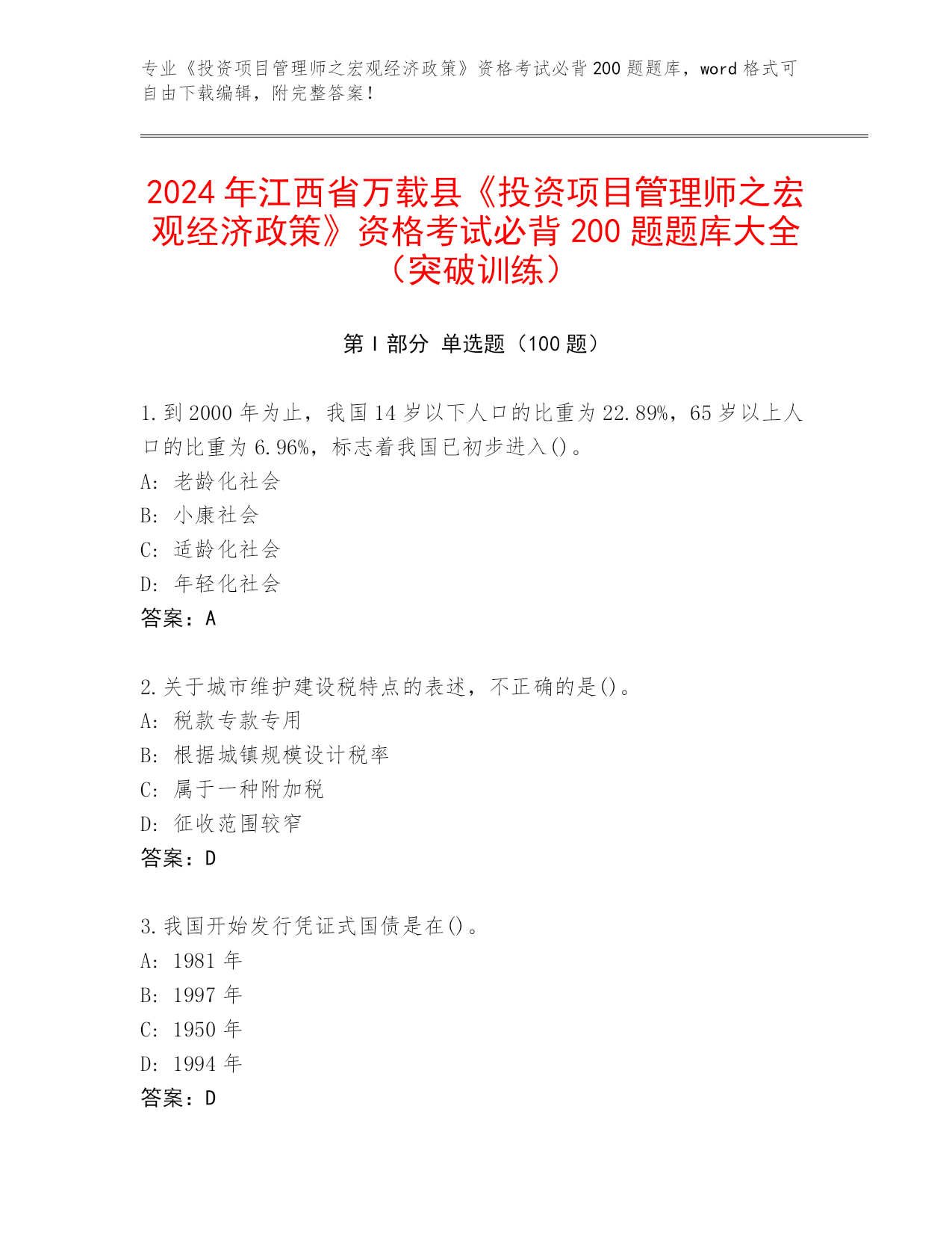 2024年江西省万载县《投资项目管理师之宏观经济政策》资格考试必背200题题库大全(突破训练)