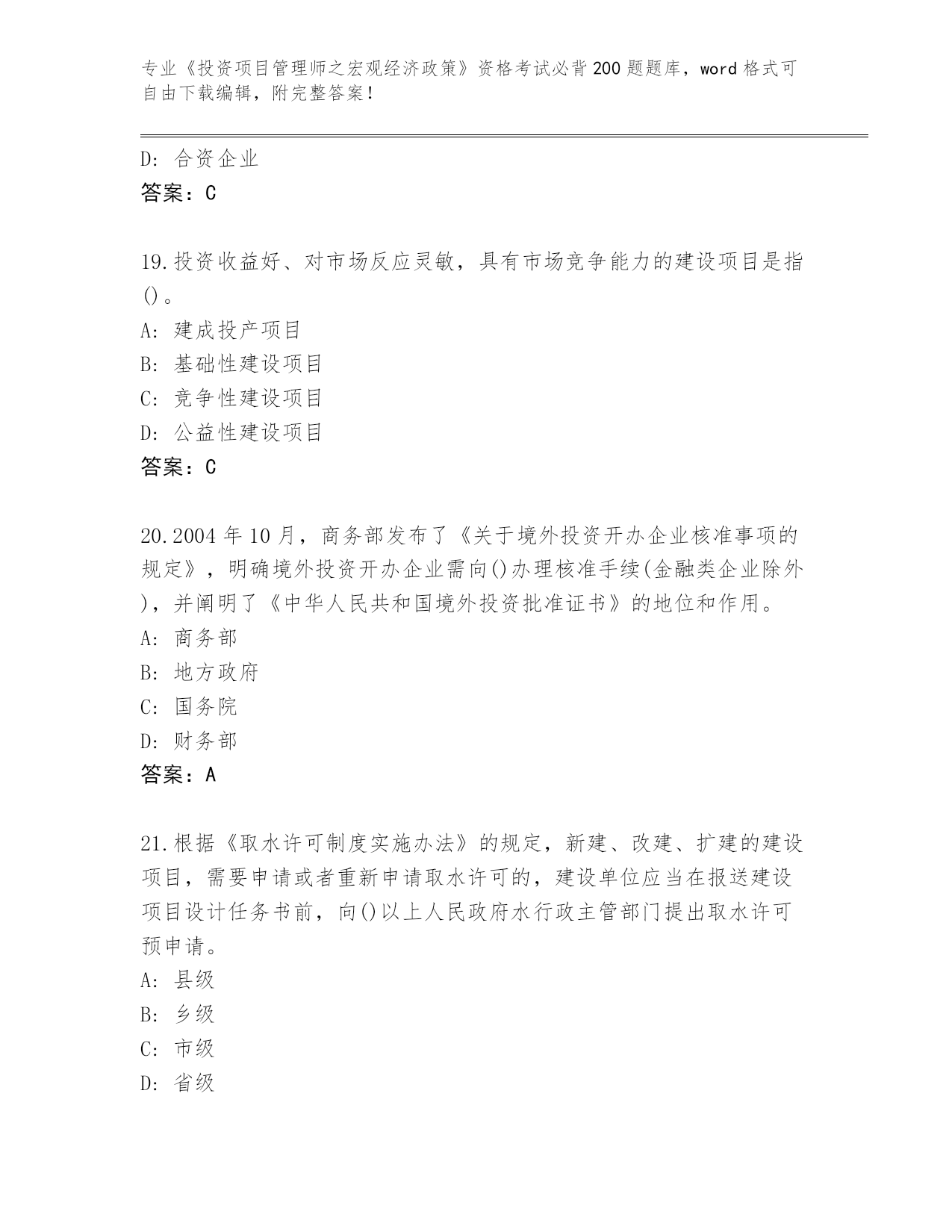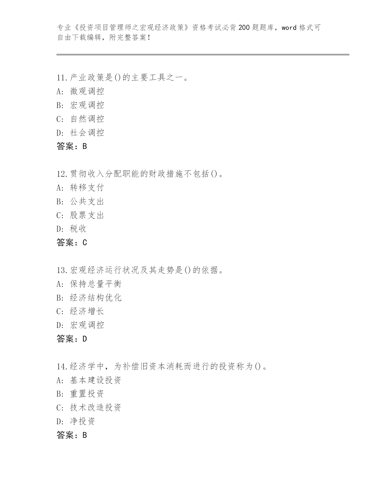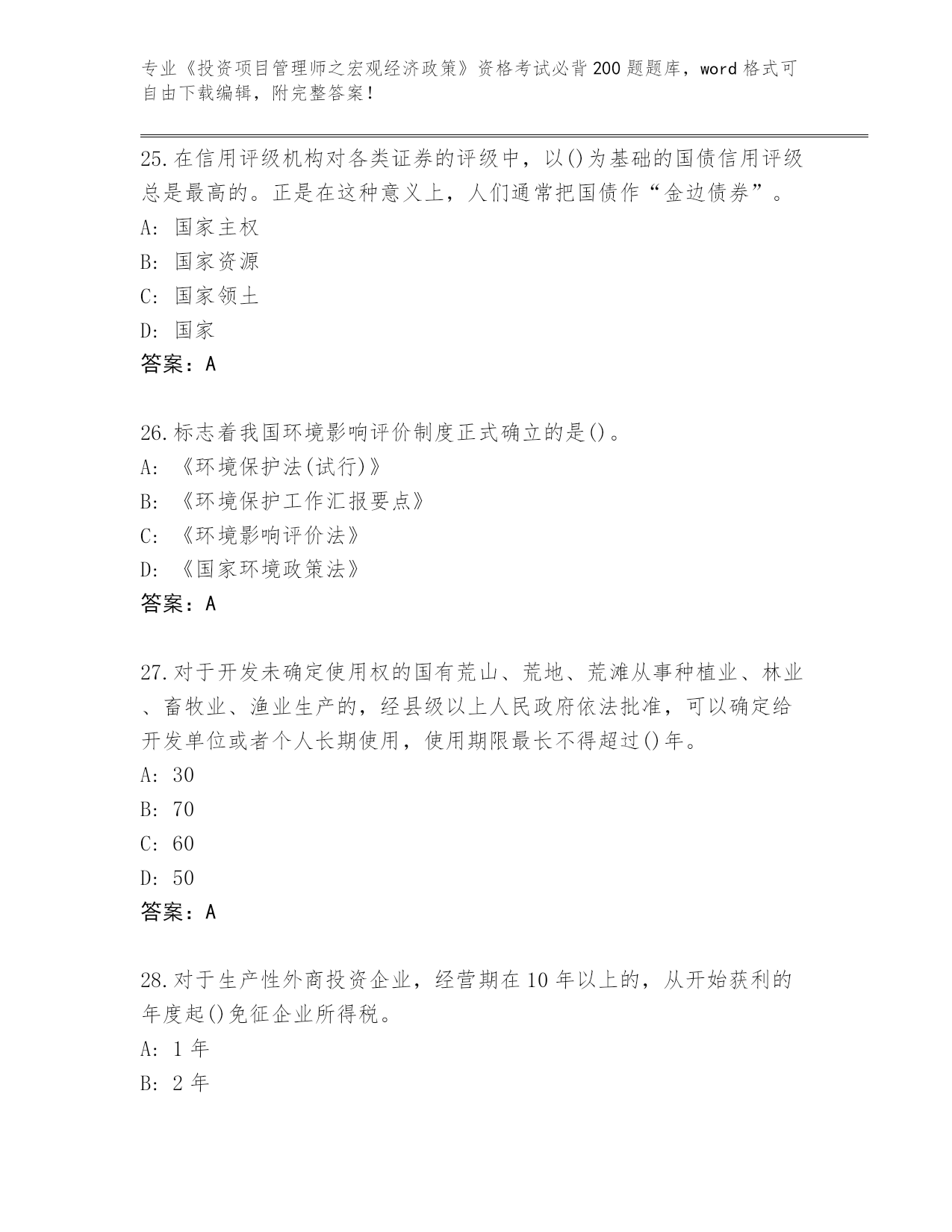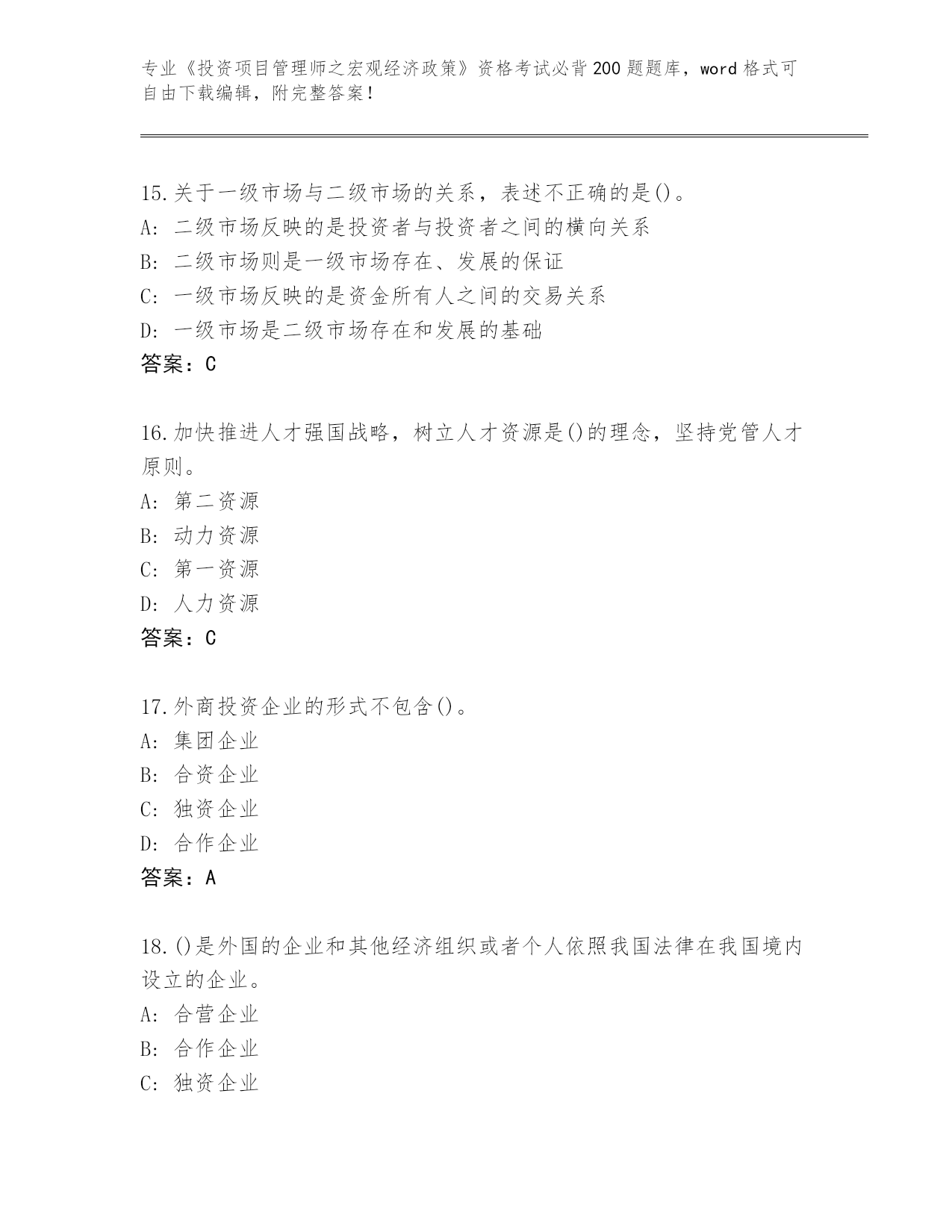 湖南省澧县《投资项目管理师之宏观经济政策》资格考试必背200题完整题库(突破训练)