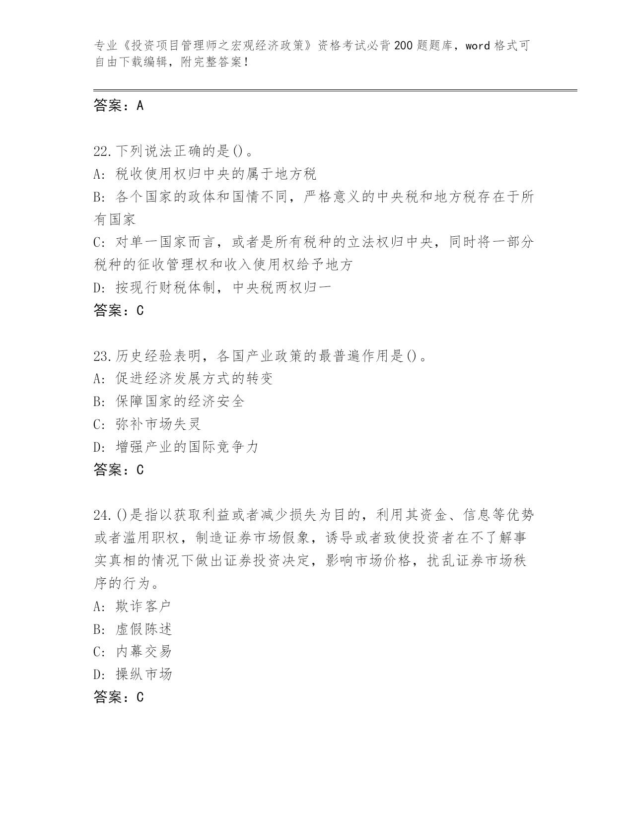 2024年河北省安新县《投资项目管理师之宏观经济政策》资格考试必背200题大全(突破训练)