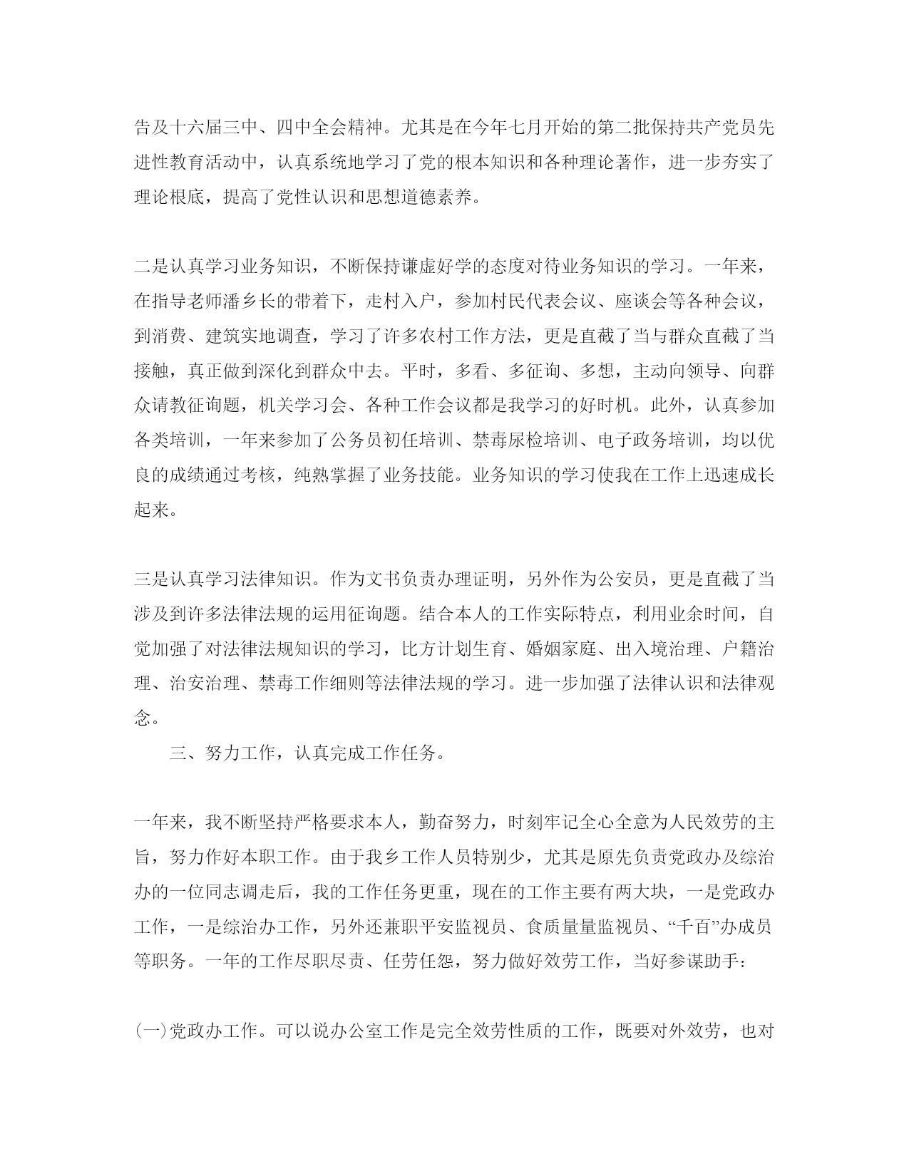 2021年公务员转正个人参考总结(通用)2021年公务员转正个人总结我叫***,1983年3月9日出生,原籍*****,2002年10月入党,2004年6月毕业于*****,获学士学位。2004年参加浙江省公务员考试,被录用为乡镇公务员,试用期一年,工作单位**乡政府,2004年9月正式到任,现任职务乡党政办副主任、文书、公安员。一年来,我热衷于本职工作,严格要求本人,摆正工作位置,时刻保持“谦虚”、“慎重”、“律己”的态度,在领导的关心栽培和同事们的协助支持下,不断勤奋学习、积极进取,努力提高自我,不断勤奋工作,认真完成任务,履行好岗位职责,各方面表现优良,得到了领导和群众确实信。现将一年来的学习、工作情况简要总结如下:一、严于律己,自觉加强党性锻炼,政治思想觉悟得到提高。一年来,不断坚持运用马克思列宁主义的立尝观点和方法论,坚持正确的世界观、人生观、价值观,并用以指导本人的学习、工作和生活实践。热爱祖国、热爱党、热爱社会主义,坚决共产主义信念,与党组织保持高度一致。认真贯彻执行党的道路、方针、政策,工作积极主动,勤奋努力,不畏困难,尽职尽责,任劳任怨,在平凡的工作岗位上作出力所能及的奉献。二、强化理论和业务学习,不断提高本身综合素养。作为一名刚踏入社会的大学毕业生,我清醒地看到人生舞台已发生转变,本人又缺乏工作经历,因而只有不断加强学习,积累充实自我,才能锻炼好为人民效劳的本领。这一年来,不断坚持一边工作一边学习,不断提高了本身综合素养水平。一是认真学习“三个代表”重要思想,深化领会其科学内涵,认真学习党的十六大报告及十六届三中、四中全会精神。尤其是在今年七月开始的第二批保持共产党员先进性教育活动中,认真系统地学习了党的根本知识和各种理论著作,进一步夯实了理论根底,提高了党性认识和思想道德素养。二是认真学习业务知识,不断保持谦虚好学的态度对待业务知识的学习。一年来,在指导老师潘乡长的带着下,走村入户,参加村民代表会议、座谈会等各种会议,到消费、建筑实地调查,学习了许多农村工作方法,更是直截了当与群众直截了当接触,真正做到深化到群众中去。平时,多看、多征询、多想,主动向领导、向群众请教征询题,机关学习会、各种工作会议都是我学习的好时机。此外,认真参加各类培训,一年来参加了公务员初任培训、禁毒尿检培训、电子政务培训,均以优良的成绩通过考核,纯熟掌握了业务技能。业务知识的学习使我在工作上迅速成长起来。三是认真学习法律知识。作为文书负责办理证明,另外作为公安员,更是直截了当涉及到许多法律法规的运用征询题。结合本人的工作实际特点,利用业余时间,自觉加强了对法律法规知识的学习,比方计划生育、婚姻家庭、出入境治理、户籍治理、治安治理、禁毒工作细则等法律法规的学习。进一步加强了法律认识和法律观念。三、努力工作,认真完成工作任务。一年来,我不断坚持严格要求本人,勤奋努力,时刻牢记全心全意为人民效劳的主旨,努力作好本职工作。由于我乡工作人员特别少,尤其是原先负责党政办及综治办的一位同志调走后,我的工作任务更重,现在的工作主要有两大块,一是党政办工作,一是综治办工作,另外还兼职平安监视员、食质量量监视员、“千百”办成员等职务。一年的工作尽职尽责、任劳任怨,努力做好效劳工作,当好参谋助手:(一)党政办工作。可以说办公室工作是完全效劳性质的工作,既要对外效劳,也对内效劳,工作中要做到“三勤”即嘴勤、手勤、脚勤:在接待群众来访办事时,都能主动询征询是否有需要办理的事,遇到办不了的证明材料时能耐心向其解释明晰,或帮其联络驻村干部、经办人,帮其查看档案材料等,使群众能尽快办好手续,树立好政府窗口的形象;在收文发文时,总是用最短的时间把文件送到达各办公室,并及时把领导批阅文件收回归档或传阅到其他办公室,从来没有遗漏掉一份文件;在搜集整理材料时,全面、准确地理解各方面工作的开展情况,及时总结、汇总,向领导汇报或让领导备查,如年度目的治理考核材料预备等;在起草文稿时,能及时认真完成领导交付的任务,一年来完成各种报告70余篇,包括2004年政府工作总结、2005年上半年政府工作总结、人代会报告等文稿。同时在组织会务、后勤治理、打字复印等工作上也尽职尽责,不留下任何纰漏。(二)综治办工作。主要负责材料整理、报告材料起草、各类报表统计,同时仍然公安员、禁毒专管员、平安监视员、综治中心成员。综治办工作任务重、责任大、业务性强,预备的各种材料特别多,如z在禁毒工作方面,今年上半年就起草各种报告20余篇,还负责宣传教育、查毒、禁种铲毒、尿检帮教等工作;又如签订责任书方面,年初综治、禁毒、反邪教、平安消费等7个方面需要起草责任书。今年上半年还负责整理了“四五”普法验收材料,接受了综治、平安消费、禁毒工作半年度考核。另外在治安治理、抓赌帮教、纠纷调
