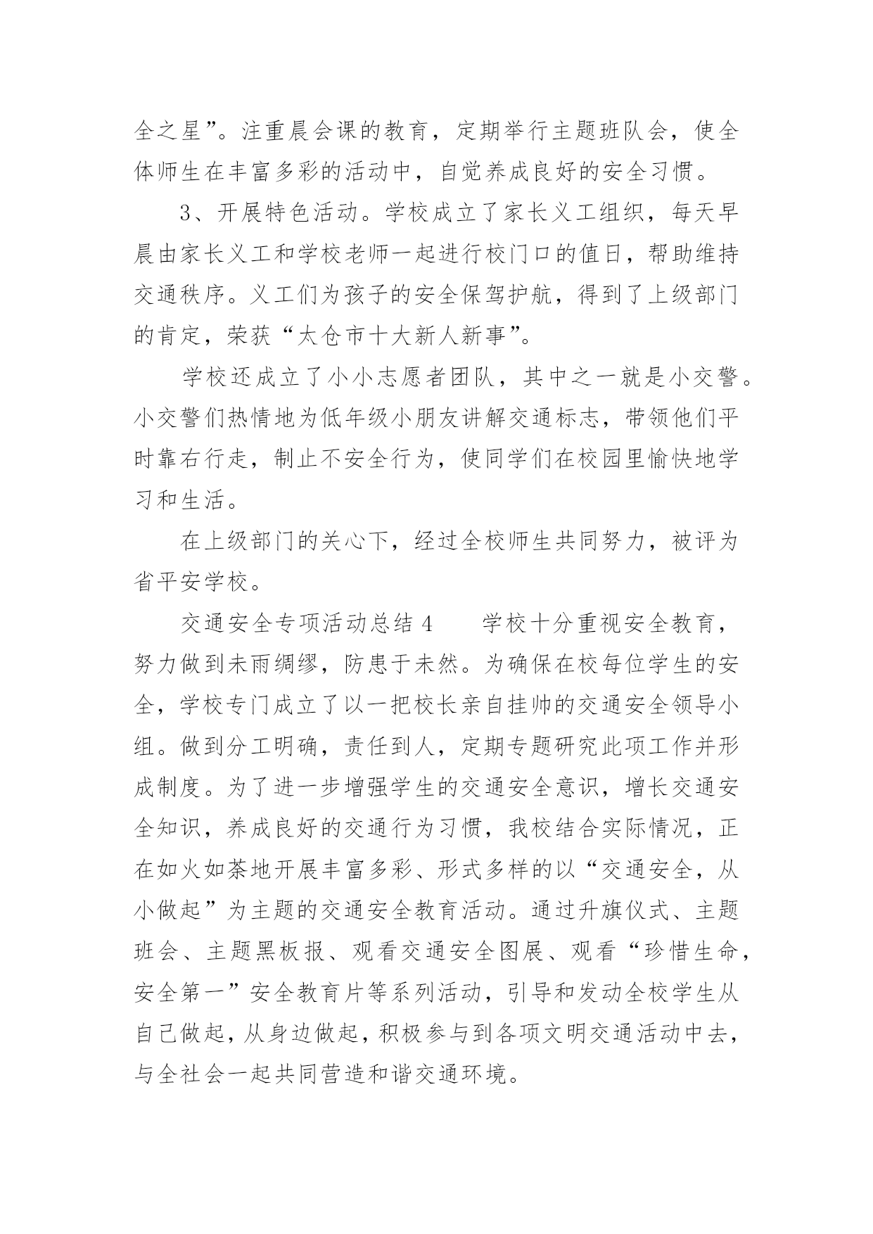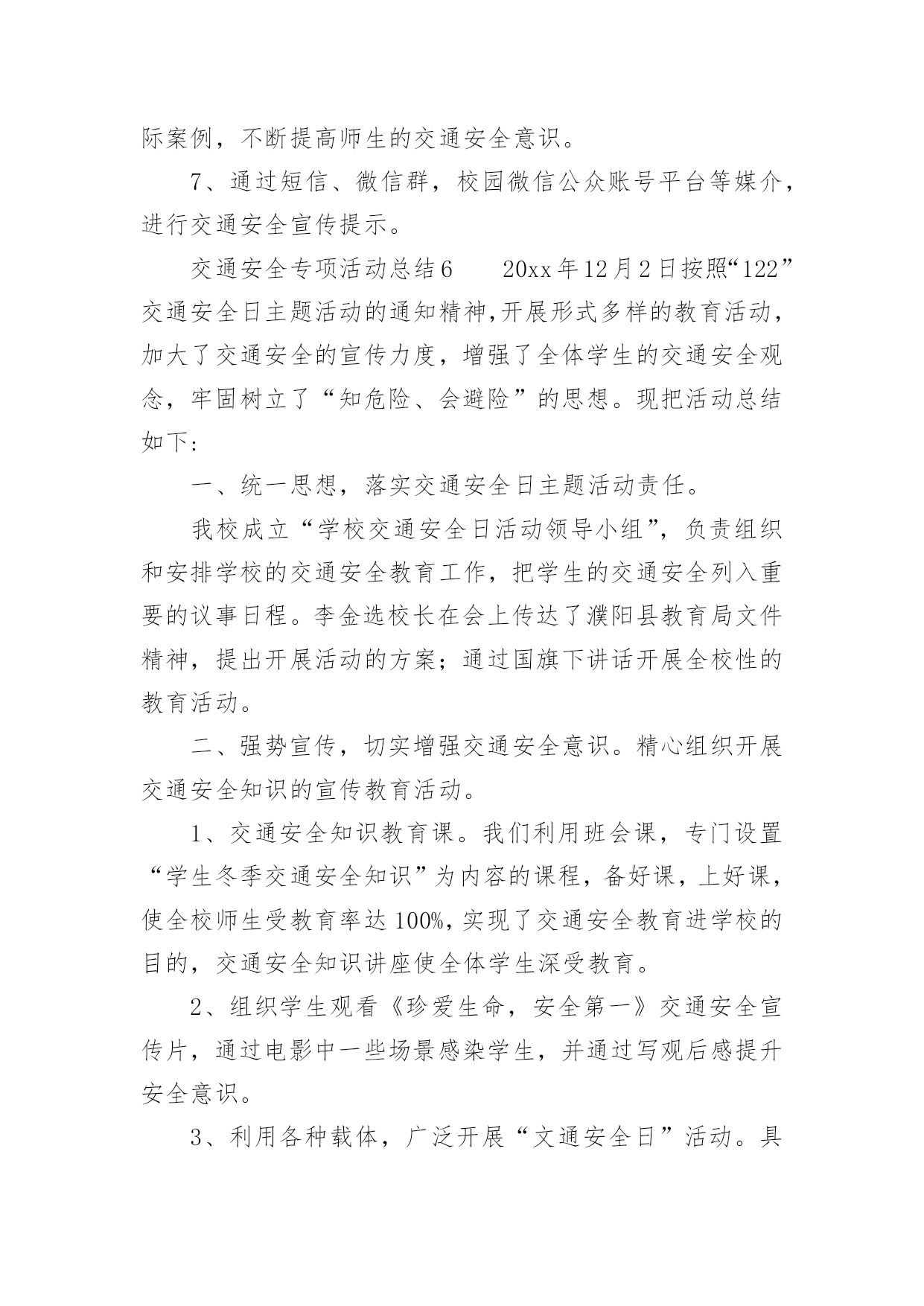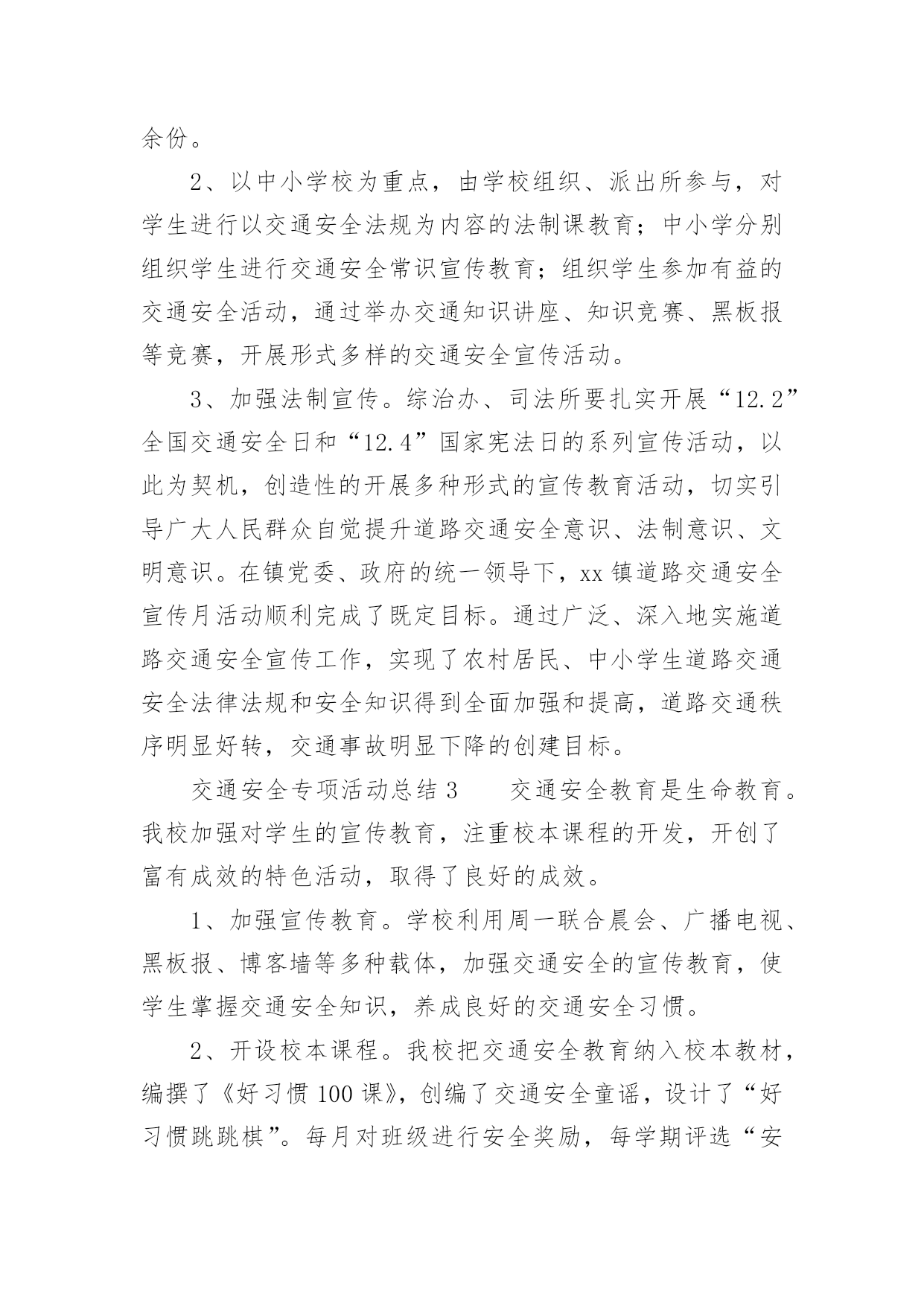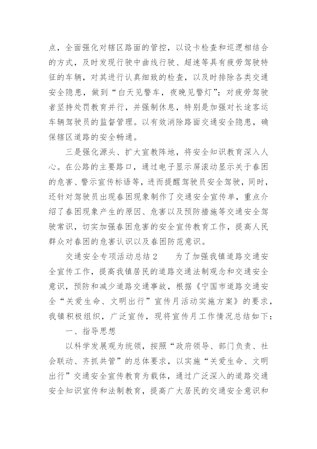 交通安全专项活动总结交通安全专项活动总结(通用13篇)活动已经告一段落了,想必你会开拓了视野,是不是该好好总结总结呢?那么活动总结怎么写才能发挥它最大的作用呢?以下是小编精心整理的交通安全专项活动总结(通用13篇),欢迎大家分享。交通安全专项活动总结1俗话说:“春困秋乏”,“春困”是季节交换中人们生理机能的一个自然反映,在交通安全管理方面,“春困”现象则是一个不容忽视的问题,近日气温回暖,根据人体生理变化以及以往经验,驾驶员在此季节行车容易产生一种懒洋洋的困倦感,尤其是在凌晨及午后是驾驶员疲劳驾驶的多发期,也是极易发生事故的重点时段,为此,xx大队全警动员,提高警惕,积极采取各项措施最大程度地扫除“春困”隐患,积极开展事故预防工作。一是提高认识、合理安排警务,将事故预防工作落到实处。要求大队全体民警、协警充分认识到“春困”对交管工作的严重危害性,把工作重心转移到路面巡逻和检查当中,增强责任感和感紧迫感,提高对“春困”事故预防工作的主动性,切实将事故预防工作落到实处,全力应对疲劳驾驶等交通违法行为的发生,确保辖区道路的安全畅通。二是加大检查、加强巡逻管控,将隐患消除在萌芽阶段。加强重点时段的巡逻检查。在每天11时至14时等疲劳驾驶多发时段,合理调整和部署警力,针对疲劳驾驶中呈现的特点,全面强化对辖区路面的管控,以设卡检查和巡逻相结合的方式,及时发现行驶中曲线行驶、超速等具有疲劳驾驶特征的车辆,对其进行认真细致的检查,以及时排除各类交通安全隐患,做到“白天见警车,夜晚见警灯”;对疲劳驾驶者坚持处罚教育并行,并强制休息,特别是加强对长途客运车辆驾驶员的监督管理。以有效消除路面交通安全隐患,确保辖区道路的安全畅通。三是强化源头、扩大宣教阵地,将安全知识教育深入人心。在公路的主要路口,通过电子显示屏滚动显示关于春困的危害、警示宣传标语等,进而提醒驾驶员安全驾驶,同时,还针对驾驶员出现春困现象制作了交通安全宣传单,重点介绍了春困现象产生的原因、危害以及预防措施等交通安全驾驶常识,切实加强春困危害的安全宣传教育工作,提高人民群众对春困的危害认识以及春困防范意识。交通安全专项活动总结2为了加强我镇道路交通安全宣传工作,提高我镇居民的道路交通法制观念和交通安全意识,预防和减少道路交通事故,根据《宁国市道路交通安全“关爱生命、文明出行”宣传月活动实施方案》的要求,我镇积极组织,广泛宣传,现将宣传月工作情况总结如下:一、指导思想以科学发展观为统领,按照“政府领导、部门负责、社会联动、齐抓共管”的总体要求,以实施“关爱生命、文明出行”交通安全宣传教育为载体,通过广泛深入的道路交通安全知识宣传和法制教育,提高广大居民的交通安全意识和预防交通事故的能力,达到减少道路交通事故的目的,为我镇经济持续发展创造良好的道路交通安全环境。二、组织领导为确保我镇“关爱生命、文明出行”道路交通安全宣传教育计划扎实有效地开展,镇政府成立了以镇党委副书记章学龙同志为组长,派出所所长唐金余为副组长,各相关职能部门为成员的道路交通安全宣传领导小组,负责全镇“关爱生命、文明出行”道路交通安全宣传教育的组织实施,确保此项工作取得实效。三、工作重点本次宣传工作重点针对机动车驾驶人、乘车人、农民群众、中小学生等群体,集中宣传各项交通法规以及“使用安全带”、“遵守限速规定”、“驾乘摩托车戴头盔”、“不乘坐安全隐患车辆”等交通安全常识。通过开展交通安全知识竞赛、悬挂横幅、印刷张贴固定标语和临时标语,发放宣传资料、组织文艺演出等多种形式,在全镇营造文明出行的社会氛围。四、工作内容1、在各村、单位指导开展群众喜闻乐见的宣传教育活动。通过张贴宣传警示标语,开办交通安全宣传专栏,交通事故图片展览;引导广大群众学法、懂法、守法,使交通安全宣传工作深入人心。标语、横幅、宣传展板等形式组织开展交通安全宣传教育活动。在本次宣传月活动中,各村印刷交通安全固定宣传标语9条,悬挂横幅5条,发放宣传单2000余份。2、以中小学校为重点,由学校组织、派出所参与,对学生进行以交通安全法规为内容的法制课教育;中小学分别组织学生进行交通安全常识宣传教育;组织学生参加有益的交通安全活动,通过举办交通知识讲座、知识竞赛、黑板报等竞赛,开展形式多样的交通安全宣传活动。3、加强法制宣传。综治办、司法所要扎实开展“12.2”全国交通安全日和“12.4”国家宪法日的系列宣传活动,以此为契机,创造性的开展多种形式的宣传教育活动,切实引导广大人民群众自觉提升道路交通安全意识、法制意识、文明意识。在镇党委、政府的统一领导下,xx镇道路交通安全宣传月活动顺利完成了既定目标。通过广泛、深入地实施道路交通安全宣传工作,实现了农村居民、中小学生道路交通安全法律法规和安全知识得到全面加强和提高,道路交通秩序明显好转,交通事故明显下降的创建目标。
