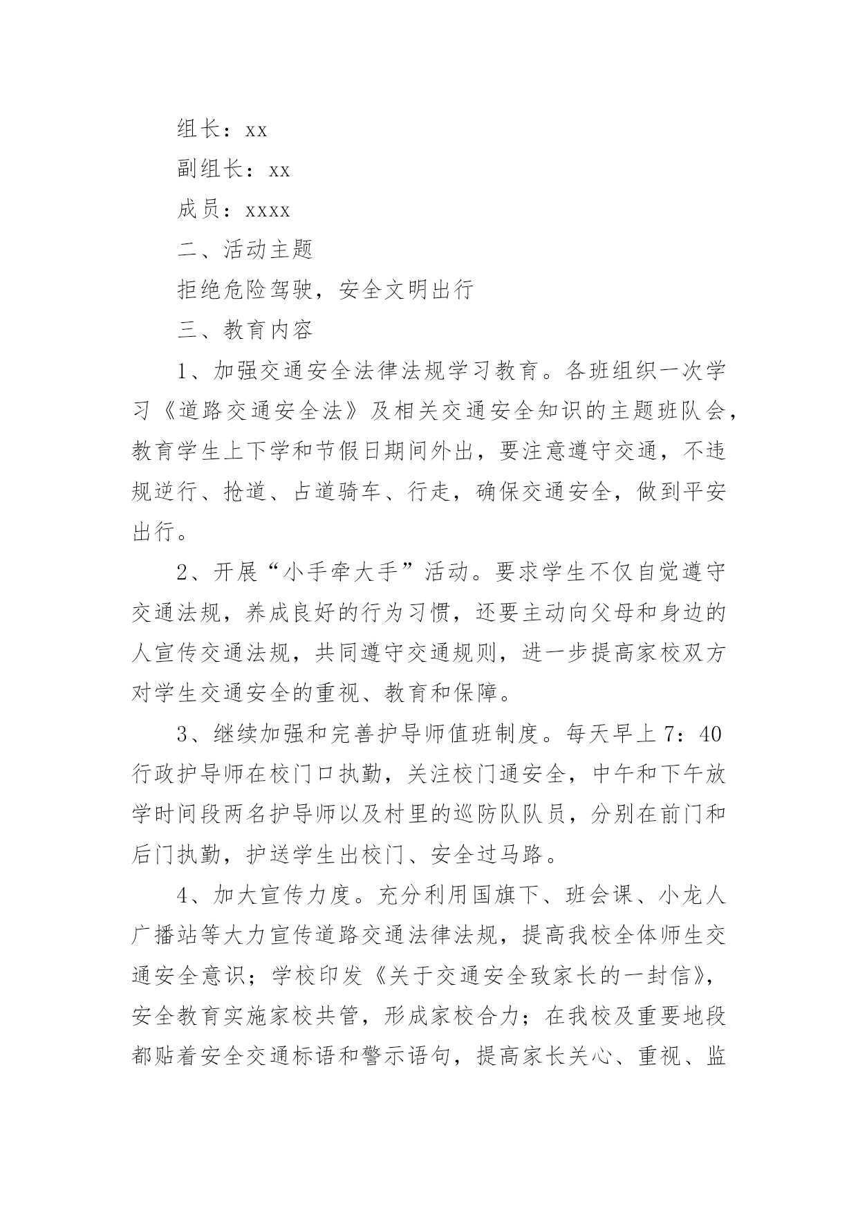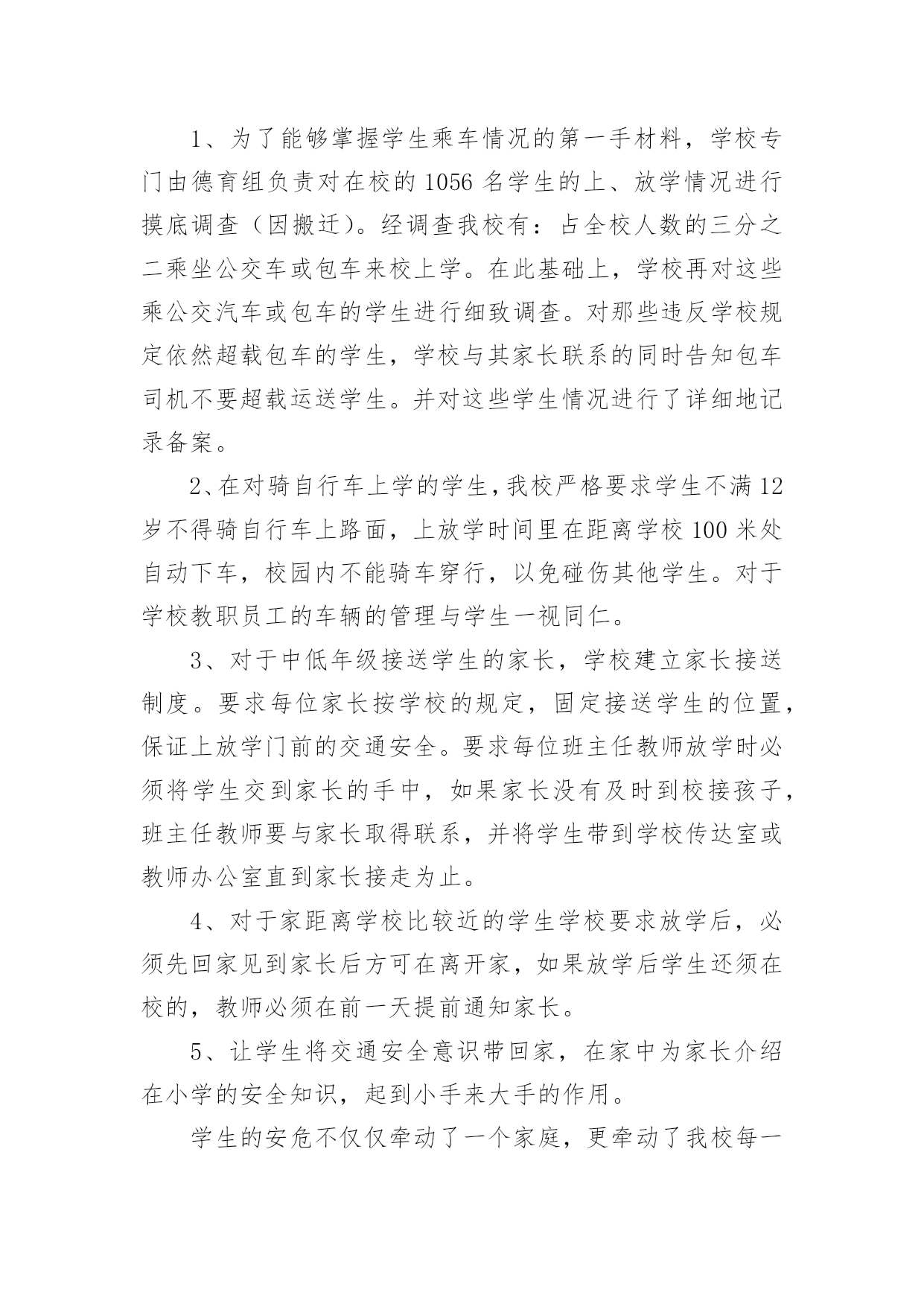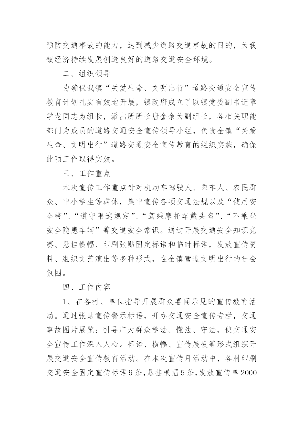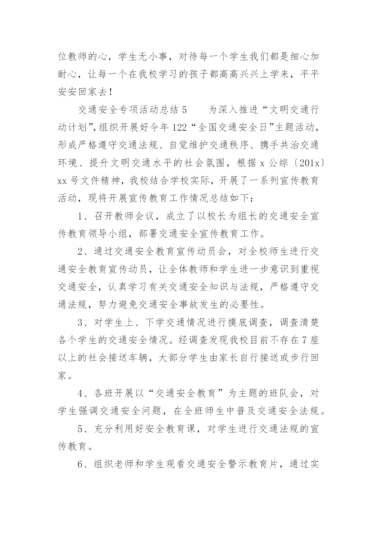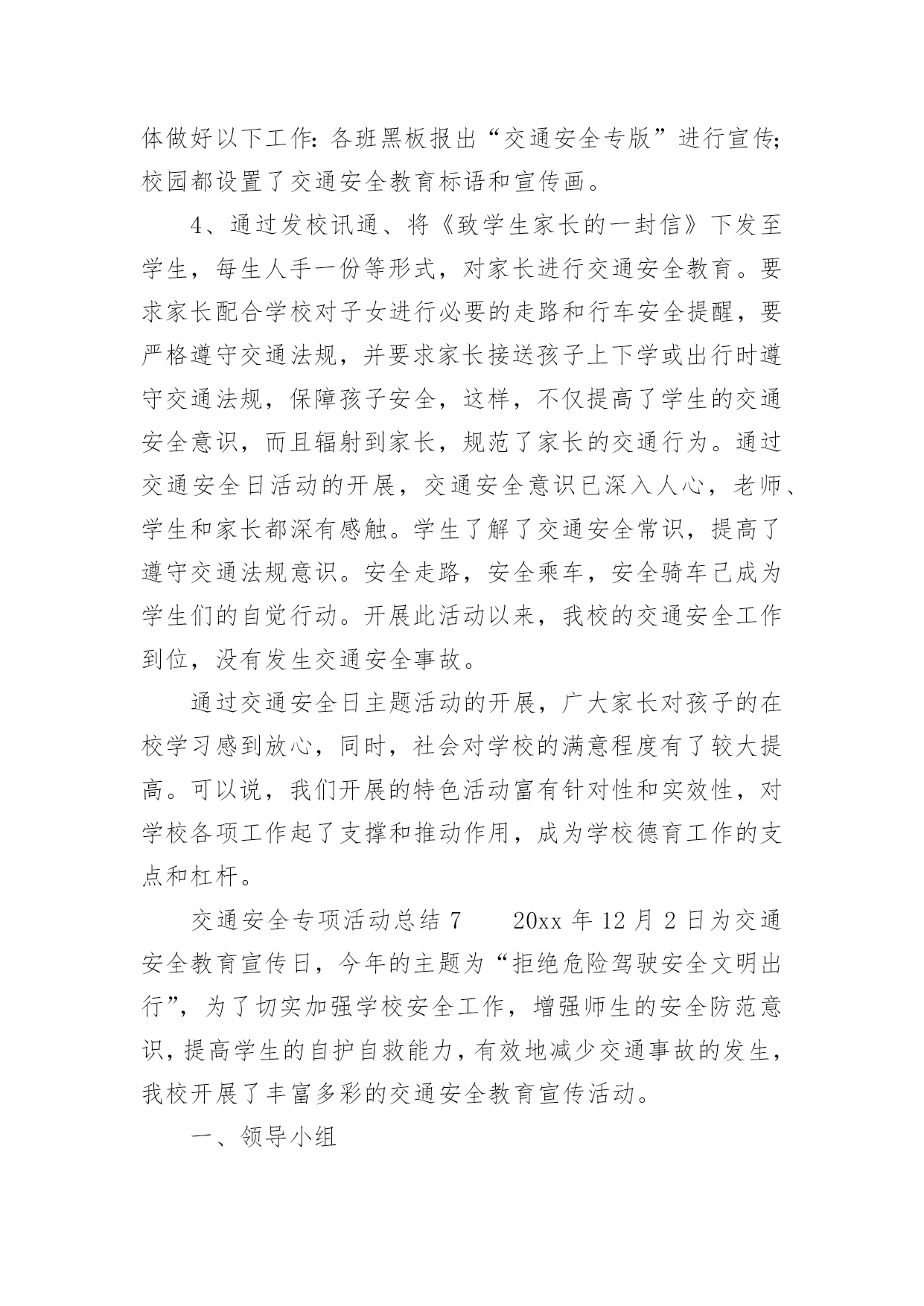交通安全专项活动总结交通安全专项活动总结(通用13篇)活动已经告一段落了,想必你会开拓了视野,是不是该好好总结总结呢?那么活动总结怎么写才能发挥它最大的作用呢?以下是小编精心整理的交通安全专项活动总结(通用13篇),欢迎大家分享。交通安全专项活动总结1俗话说:“春困秋乏”,“春困”是季节交换中人们生理机能的一个自然反映,在交通安全管理方面,“春困”现象则是一个不容忽视的问题,近日气温回暖,根据人体生理变化以及以往经验,驾驶员在此季节行车容易产生一种懒洋洋的困倦感,尤其是在凌晨及午后是驾驶员疲劳驾驶的多发期,也是极易发生事故的重点时段,为此,xx大队全警动员,提高警惕,积极采取各项措施最大程度地扫除“春困”隐患,积极开展事故预防工作。一是提高认识、合理安排警务,将事故预防工作落到实处。要求大队全体民警、协警充分认识到“春困”对交管工作的严重危害性,把工作重心转移到路面巡逻和检查当中,增强责任感和感紧迫感,提高对“春困”事故预防工作的主动性,切实将事故预防工作落到实处,全力应对疲劳驾驶等交通违法行为的发生,确保辖区道路的安全畅通。二是加大检查、加强巡逻管控,将隐患消除在萌芽阶段。加强重点时段的巡逻检查。在每天11时至14时等疲劳驾驶多发时段,合理调整和部署警力,针对疲劳驾驶中呈现的特点,全面强化对辖区路面的管控,以设卡检查和巡逻相结合的方式,及时发现行驶中曲线行驶、超速等具有疲劳驾驶特征的车辆,对其进行认真细致的检查,以及时排除各类交通安全隐患,做到“白天见警车,夜晚见警灯”;对疲劳驾驶者坚持处罚教育并行,并强制休息,特别是加强对长途客运车辆驾驶员的监督管理。以有效消除路面交通安全隐患,确保辖区道路的安全畅通。三是强化源头、扩大宣教阵地,将安全知识教育深入人心。在公路的主要路口,通过电子显示屏滚动显示关于春困的危害、警示宣传标语等,进而提醒驾驶员安全驾驶,同时,还针对驾驶员出现春困现象制作了交通安全宣传单,重点介绍了春困现象产生的原因、危害以及预防措施等交通安全驾驶常识,切实加强春困危害的安全宣传教育工作,提高人民群众对春困的危害认识以及春困防范意识。交通安全专项活动总结2为了加强我镇道路交通安全宣传工作,提高我镇居民的道路交通法制观念和交通安全意识,预防和减少道路交通事故,根据《宁国市道路交通安全“关爱生命、文明出行”宣传月活动实施方案》的要求,我镇积极组织,广泛宣传,现将宣传月工作情况总结如下:一、指导思想以科学发展观为统领,按照“政府领导、部门负责、社会联动、齐抓共管”的总体要求,以实施“关爱生命、文明出行”交通安全宣传教育为载体,通过广泛深入的道路交通安全知识宣传和法制教育,提高广大居民的交通安全意识和预防交通事故的能力,达到减少道路交通事故的目的,为我镇经济持续发展创造良好的道路交通安全环境。二、组织领导为确保我镇“关爱生命、文明出行”道路交通安全宣传教育计划扎实有效地开展,镇政府成立了以镇党委副书记章学龙同志为组长,派出所所长唐金余为副组长,各相关职能部门为成员的道路交通安全宣传领导小组,负责全镇“关爱生命、文明出行”道路交通安全宣传教育的组织实施,确保此项工作取得实效。三、工作重点本次宣传工作重点针对机动车驾驶人、乘车人、农民群众、中小学生等群体,集中宣传各项交通法规以及“使用安全带”、“遵守限速规定”、“驾乘摩托车戴头盔”、“不乘坐安全隐患车辆”等交通安全常识。通过开展交通安全知识竞赛、悬挂横幅、印刷张贴固定标语和临时标语,发放宣传资料、组织文艺演出等多种形式,在全镇营造文明出行的社会氛围。四、工作内容1、在各村、单位指导开展群众喜闻乐见的宣传教育活动。通过张贴宣传警示标语,开办交通安全宣传专栏,交通事故图片展览;引导广大群众学法、懂法、守法,使交通安全宣传工作深入人心。标语、横幅、宣传展板等形式组织开展交通安全宣传教育活动。在本次宣传月活动中,各村印刷交通安全固定宣传标语9条,悬挂横幅5条,发放宣传单2000余份。2、以中小学校为重点,由学校组织、派出所参与,对学生进行以交通安全法规为内容的法制课教育;中小学分别组织学生进行交通安全常识宣传教育;组织学生参加有益的交通安全活动,通过举办交通知识讲座、知识竞赛、黑板报等竞赛,开展形式多样的交通安全宣传活动。3、加强法制宣传。综治办、司法所要扎实开展“12.2”全国交通安全日和“12.4”国家宪法日的系列宣传活动,以此为契机,创造性的开展多种形式的宣传教育活动,切实引导广大人民群众自觉提升道路交通安全意识、法制意识、文明意识。在镇党委、政府的统一领导下,xx镇道路交通安全宣传月活动顺利完成了既定目标。通过广泛、深入地实施道路交通安全宣传工作,实现了农村居民、中小学生道路交通安全法律法规和安全知识得到全面加强和提高,道路交通秩序明显好转,交通事故明显下降的创建目标。