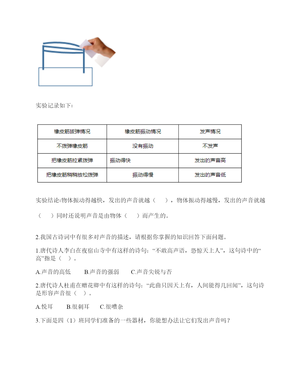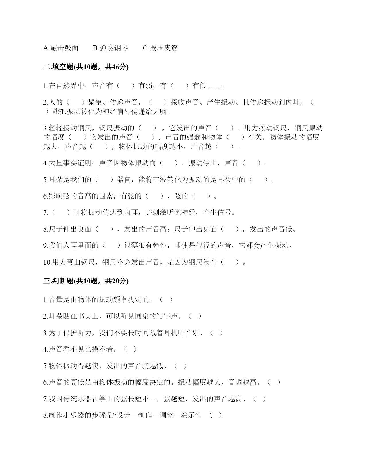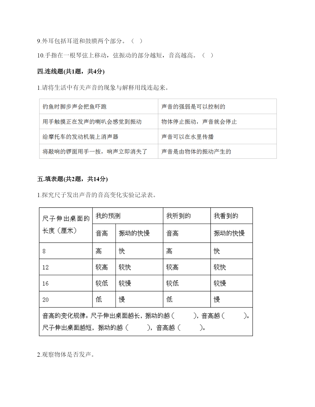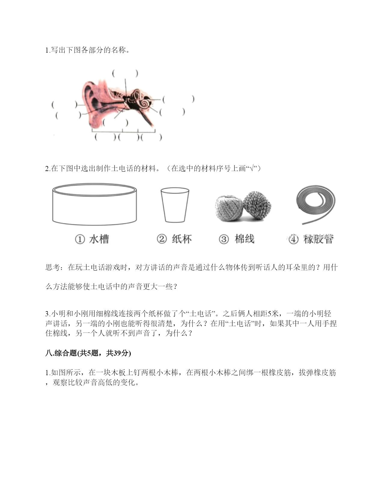 小学科学《声音》练习题一.选择题(共10题,共20分)1.“风声雨声读书声,声声入耳”中,()属于人为制造的声音。A.风声B.雨声C.读书声2.同一个物体,振动幅度越(),发出的声音越强。A.大B.均匀C.小3.利用棉线和纸杯制作的“土电话”,声音主要是通过()从话简传到听筒的。A.棉线B.空气C.话筒4.把玻璃罩里的空气逐渐抽掉,钟罩里的闹钟铃声会()。A.不变B.越来越轻C.越来越响D.先变响再变轻5.音量与物体振动之间的关系是()。A.物体振动的幅度越大,声音越强B.物体振动的幅度越小,声音越强C.物体振动的速度越快,声音越强6.演奏家停止拨琴弦,琴声还能持续产生,主要原因是()。A.琴弦还在振动B.人们还沉浸在音乐中C.空气能传播声音7.手指轻轻接触到桌面,并在桌面上滑动一段距离,当耳贴在桌子一角上,再这样让手指滑动时,()。A.耳朵听到一样清晰的声音B.它们几乎没有声音C.贴在桌角上听得更清晰8.尺子振动的频率和尺子伸出桌面部分的()有关。A.高度B.长度C.刻度9.平常所说的声音的强弱、大小、轻重,都是指()。A.音量B.音高C.音色10.下面几种做法中,()不能发出声音。A.敲击鼓面B.弹奏钢琴C.按压皮筋二.填空题(共10题,共46分)1.在自然界中,声音有()有弱,有()有低……。2.人的()聚集、传递声音,()接收声音、产生振动、且传递振动到内耳;()能把振动转化为神经信号传递给大脑。3.轻轻拨动钢尺,钢尺振动的(),它发出的声音()。用力拨动钢尺,钢尺振动的幅度()它发出的声音()。声音的强弱和物体()有关。物体振动的幅度越大,声音越();物体振动的幅度越小,声音越()。4.大量事实证明:声音因物体振动而()。振动停止,声音()。5.耳朵是我们的()器官,能将声波转化为振动的是耳朵中的()。6.影响弦的音高的因素,有弦的()、弦的()。7.()可将振动传达到内耳,并刺激听觉神经,产生信号。8.尺子伸出桌面(),发出的声音高;尺子伸出桌面(),发出的声音低。9.我们人耳里面的()很薄很有弹性,即使是很轻的声音,它都会产生振动。10.用力弯曲钢尺,钢尺不会发出声音,是因为钢尺没有()。三.判断题(共10题,共20分)1.音量是由物体的振动频率决定的。()2.耳朵贴在书桌上,可以听见同桌的写字声。()3.为了保护听力,我们不要长时间戴着耳机听音乐。()4.声音看不见也摸不着。()5.物体振动得越快,发出的声音就越低。()6.声音的高低是由物体振动的幅度决定的。振动幅度越大,音调越高。()7.我国传统乐器古筝上的弦长短不一,弦越短,发出的声音越高。()8.制作小乐器的步骤是“设计—制作—调整—演示”。()9.外耳包括耳道和鼓膜两个部分。()10.手指在一根琴弦上移动,弦振动的部分越短,音高越高。()四.连线题(共1题,共4分)1.请将生活中有关声音的现象与解释用线连起来。五.填表题(共2题,共14分)1.探究尺子发出声音的音高变化实验记录表。2.观察物体是否发声。六.简答题(共5题,共25分)1.物体振动的幅度与声音的强弱有什么关系?2.闪电和雷同时在云层产生,在夏季的雨夜,我们总是先看到闪电,后听到雷声,请对这种现象进行合理解释。3.二胡有两根弦,空弦拉的时候,发出的声音有高有低,这是为什么?4.为什么说“一个巴掌拍不响”?5.如图,请你提出两个与“橡皮筋发出声音”有关的科学探究问题。七.材料题(共3题,共20分)1.写出下图各部分的名称。2.在下图中选出制作土电话的材料。(在选中的材料序号上画“√”)思考:在玩土电话游戏时,对方讲话的声音是通过什么物体传到听话人的耳朵里的?用什么方法能够使土电话中的声音更大一些?3.小明和小刚用细棉线连接两个纸杯做了个“土电话”。之后俩人相距5米,一端的小明轻声讲话,另一端的小刚也能听得很清楚,为什么?在用“土电话”时,如果其中一人用手捏住棉线,另一个人就听不到声音了,为什么?八.综合题(共5题,共39分)1.如图所示,在一块木板上钉两根小木棒,在两根小木棒之间绑一根橡皮筋,拔弹橡皮筋,观察比较声音高低的变化。实验记录如下∶实验结论∶物体振动得越快,发出的声音就越(),物体振动得越慢,发出的声音就越()同时还说明声音是由物体()而产生的。2.我国古诗词中有很多对声音的描述,请根据你掌握的知识回答下面问题。1.唐代诗人李白在夜宿山寺中有这样的诗句:“不敢高声语,恐惊天上人”,这句诗中的“高”指是()。A.声音的高低B.声音的强弱C.声音尖锐与否2.唐代诗人杜甫在赠花卿中有这样的诗句:“此曲只因天上有,人间能得几回闻”,这句诗是形容