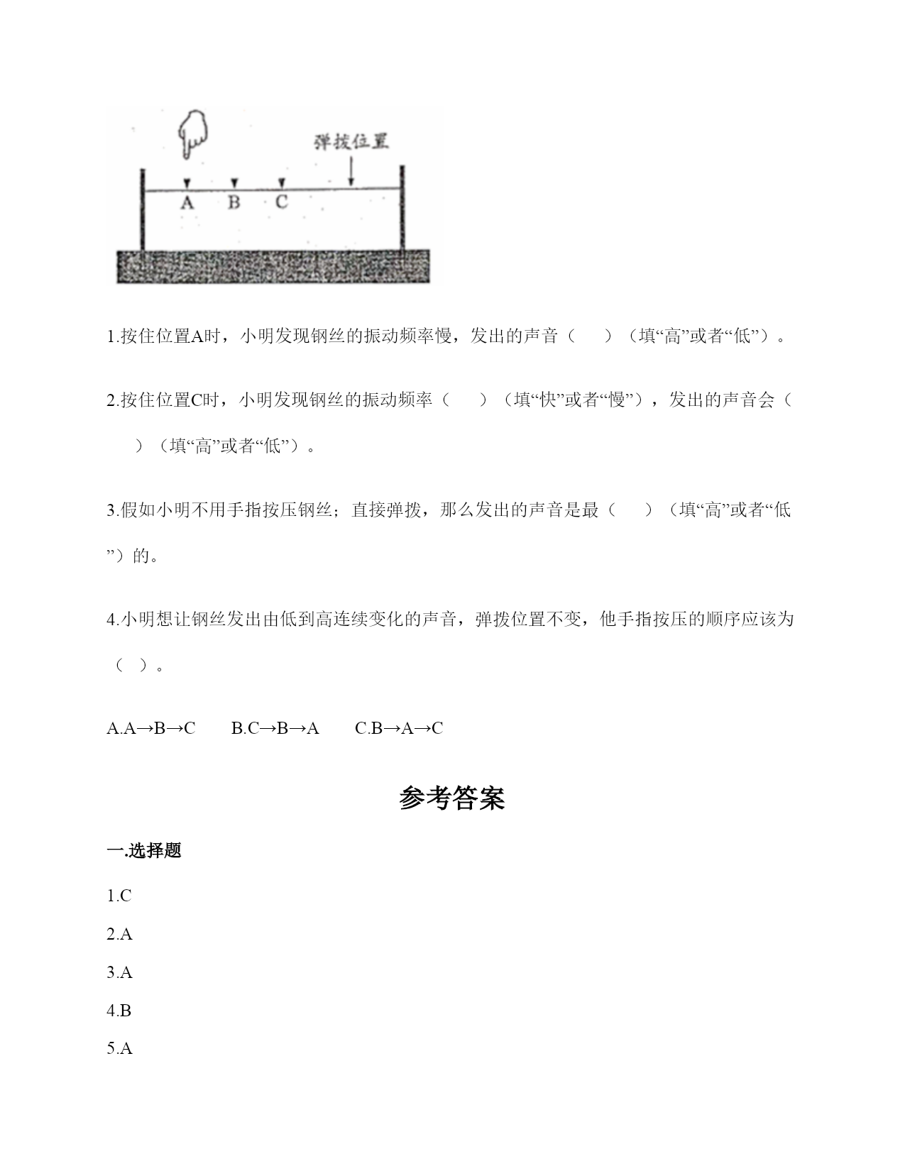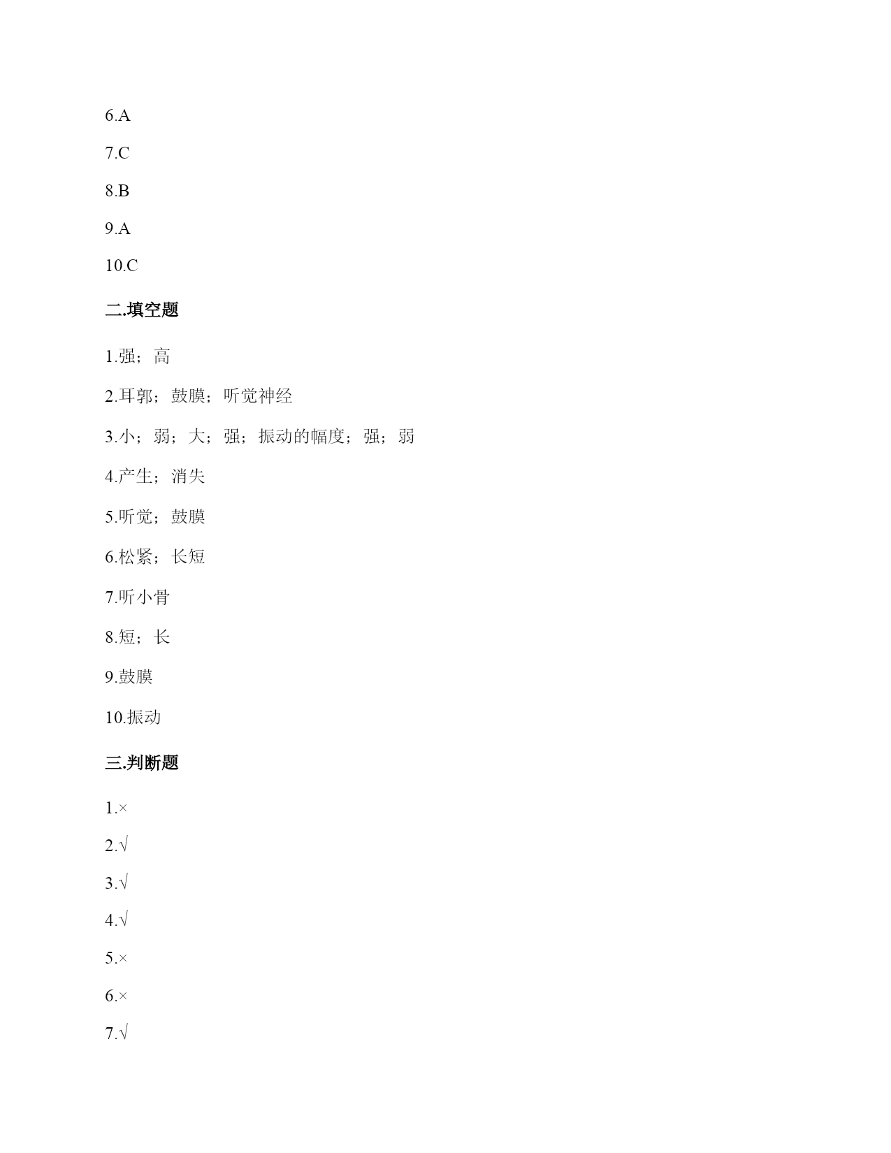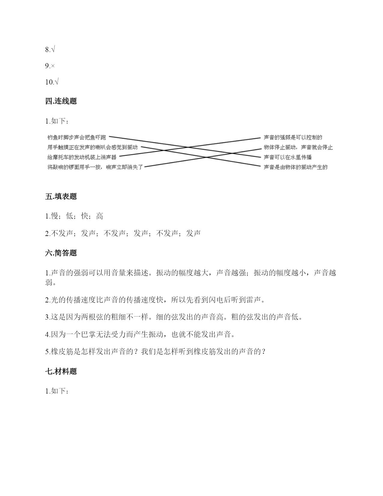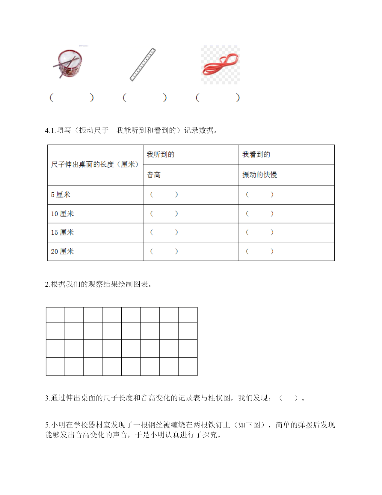 小学科学《声音》练习题一.选择题(共10题,共20分)1.“风声雨声读书声,声声入耳”中,()属于人为制造的声音。A.风声B.雨声C.读书声2.同一个物体,振动幅度越(),发出的声音越强。A.大B.均匀C.小3.利用棉线和纸杯制作的“土电话”,声音主要是通过()从话简传到听筒的。A.棉线B.空气C.话筒4.把玻璃罩里的空气逐渐抽掉,钟罩里的闹钟铃声会()。A.不变B.越来越轻C.越来越响D.先变响再变轻5.音量与物体振动之间的关系是()。A.物体振动的幅度越大,声音越强B.物体振动的幅度越小,声音越强C.物体振动的速度越快,声音越强6.演奏家停止拨琴弦,琴声还能持续产生,主要原因是()。A.琴弦还在振动B.人们还沉浸在音乐中C.空气能传播声音7.手指轻轻接触到桌面,并在桌面上滑动一段距离,当耳贴在桌子一角上,再这样让手指滑动时,()。A.耳朵听到一样清晰的声音B.它们几乎没有声音C.贴在桌角上听得更清晰8.尺子振动的频率和尺子伸出桌面部分的()有关。A.高度B.长度C.刻度9.平常所说的声音的强弱、大小、轻重,都是指()。A.音量B.音高C.音色10.下面几种做法中,()不能发出声音。A.敲击鼓面B.弹奏钢琴C.按压皮筋二.填空题(共10题,共46分)1.在自然界中,声音有()有弱,有()有低……。2.人的()聚集、传递声音,()接收声音、产生振动、且传递振动到内耳;()能把振动转化为神经信号传递给大脑。3.轻轻拨动钢尺,钢尺振动的(),它发出的声音()。用力拨动钢尺,钢尺振动的幅度()它发出的声音()。声音的强弱和物体()有关。物体振动的幅度越大,声音越();物体振动的幅度越小,声音越()。4.大量事实证明:声音因物体振动而()。振动停止,声音()。5.耳朵是我们的()器官,能将声波转化为振动的是耳朵中的()。6.影响弦的音高的因素,有弦的()、弦的()。7.()可将振动传达到内耳,并刺激听觉神经,产生信号。8.尺子伸出桌面(),发出的声音高;尺子伸出桌面(),发出的声音低。9.我们人耳里面的()很薄很有弹性,即使是很轻的声音,它都会产生振动。10.用力弯曲钢尺,钢尺不会发出声音,是因为钢尺没有()。三.判断题(共10题,共20分)1.音量是由物体的振动频率决定的。()2.耳朵贴在书桌上,可以听见同桌的写字声。()3.为了保护听力,我们不要长时间戴着耳机听音乐。()4.声音看不见也摸不着。()5.物体振动得越快,发出的声音就越低。()6.声音的高低是由物体振动的幅度决定的。振动幅度越大,音调越高。()7.我国传统乐器古筝上的弦长短不一,弦越短,发出的声音越高。()8.制作小乐器的步骤是“设计—制作—调整—演示”。()9.外耳包括耳道和鼓膜两个部分。()10.手指在一根琴弦上移动,弦振动的部分越短,音高越高。()四.连线题(共1题,共4分)1.请将生活中有关声音的现象与解释用线连起来。五.填表题(共2题,共14分)1.探究尺子发出声音的音高变化实验记录表。2.观察物体是否发声。六.简答题(共5题,共25分)1.物体振动的幅度与声音的强弱有什么关系?2.闪电和雷同时在云层产生,在夏季的雨夜,我们总是先看到闪电,后听到雷声,请对这种现象进行合理解释。3.二胡有两根弦,空弦拉的时候,发出的声音有高有低,这是为什么?4.为什么说“一个巴掌拍不响”?5.如图,请你提出两个与“橡皮筋发出声音”有关的科学探究问题。七.材料题(共3题,共20分)1.写出下图各部分的名称。2.在下图中选出制作土电话的材料。(在选中的材料序号上画“√”)思考:在玩土电话游戏时,对方讲话的声音是通过什么物体传到听话人的耳朵里的?用什么方法能够使土电话中的声音更大一些?3.小明和小刚用细棉线连接两个纸杯做了个“土电话”。之后俩人相距5米,一端的小明轻声讲话,另一端的小刚也能听得很清楚,为什么?在用“土电话”时,如果其中一人用手捏住棉线,另一个人就听不到声音了,为什么?八.综合题(共5题,共39分)1.如图所示,在一块木板上钉两根小木棒,在两根小木棒之间绑一根橡皮筋,拔弹橡皮筋,观察比较声音高低的变化。实验记录如下∶实验结论∶物体振动得越快,发出的声音就越(),物体振动得越慢,发出的声音就越()同时还说明声音是由物体()而产生的。2.我国古诗词中有很多对声音的描述,请根据你掌握的知识回答下面问题。1.唐代诗人李白在夜宿山寺中有这样的诗句:“不敢高声语,恐惊天上人”,这句诗中的“高”指是()。A.声音的高低B.声音的强弱C.声音尖锐与否2.唐代诗人杜甫在赠花卿中有这样的诗句:“此曲只因天上有,人间能得几回闻”,这句诗是形容