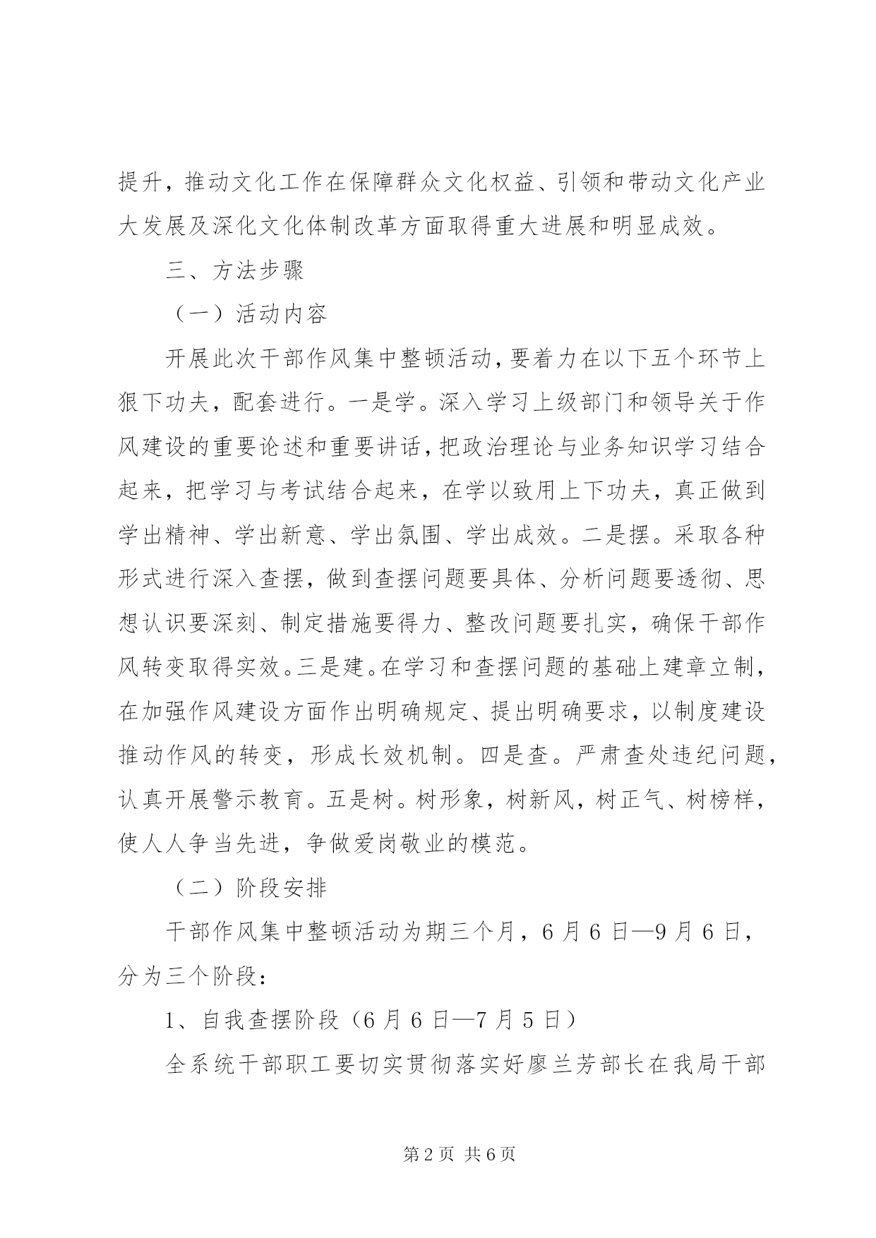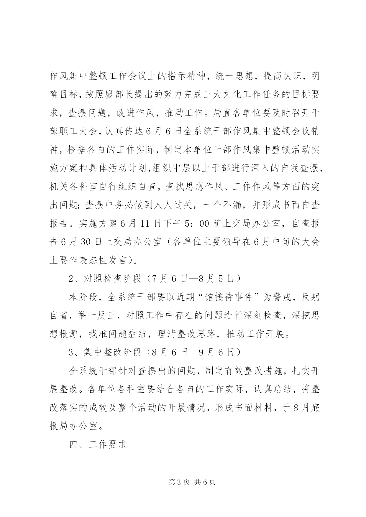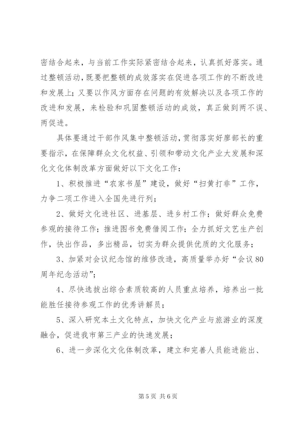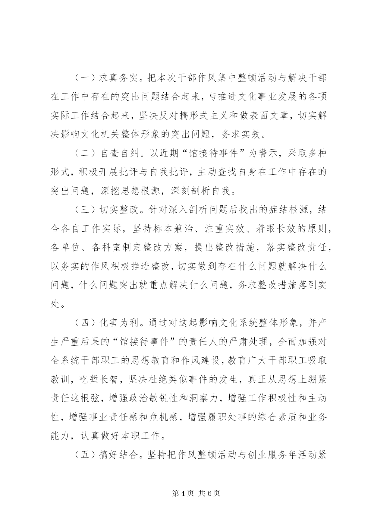 第PAGE\*Arabic\*MERGEFORMAT6页共NUMPAGES\*MERGEFORMAT6页文广局作风治理工作方案为切实解决全系统干部队伍中存在的影响文化事业改革和发展的突出问题,彻底改进干部队伍的思想作风和工作作风,着力在全系统营造勤奋敬业、争先创优的良好氛围,重塑文化部门勤政、廉洁、务实、高效的全新形象,推进我局各项工作扎实有效开展,结合我局实际,特制定本活动方案。一、指导思想以十七大文化工作方针为指导,深入贯彻落实科学发展观,紧紧围绕市委市政府的重大决策部署,按照全市宣传思想文化工作会议上提出的“内强素质,外树形象”的工作要求,做到“加强学习,集中整顿,带好队伍,务求实效”。重点突出作风建设这个主题,抓住提高能力这个要点,促使全系统干部思想、学风、作风有明显的改观,推动文化事业全面发展、开创文化工作崭新局面,为我市“积极融入鄱阳湖生态经济区,加快建设国家新能源科技城”,实现经济社会建设的科学发展、进位赶超、绿色崛起提供强劲的文化动力和智力支持。二、总体目标通过干部作风的集中整顿,使全系统干部人人争做勤奋好学的先行者,干事创业的开拓者,文化工作的创新者,全系统上下形成你赶我超,争先创优的崭新局面;促进干部队伍工作作风根本好转,综合素质明显提高,工作能力不断增强,整体形象全面提升,推动文化工作在保障群众文化权益、引领和带动文化产业大发展及深化文化体制改革方面取得重大进展和明显成效。三、方法步骤(一)活动内容开展此次干部作风集中整顿活动,要着力在以下五个环节上狠下功夫,配套进行。一是学。深入学习上级部门和领导关于作风建设的重要论述和重要讲话,把政治理论与业务知识学习结合起来,把学习与考试结合起来,在学以致用上下功夫,真正做到学出精神、学出新意、学出氛围、学出成效。二是摆。采取各种形式进行深入查摆,做到查摆问题要具体、分析问题要透彻、思想认识要深刻、制定措施要得力、整改问题要扎实,确保干部作风转变取得实效。三是建。在学习和查摆问题的基础上建章立制,在加强作风建设方面作出明确规定、提出明确要求,以制度建设推动作风的转变,形成长效机制。四是查。严肃查处违纪问题,认真开展警示教育。五是树。树形象,树新风,树正气、树榜样,使人人争当先进,争做爱岗敬业的模范。(二)阶段安排干部作风集中整顿活动为期三个月,6月6日—9月6日,分为三个阶段:1、自我查摆阶段(6月6日—7月5日)全系统干部职工要切实贯彻落实好廖兰芳部长在我局干部作风集中整顿工作会议上的指示精神,统一思想,提高认识,明确目标,按照廖部长提出的努力完成三大文化工作任务的目标要求,查摆问题,改进作风,推动工作。局直各单位要及时召开干部职工大会,认真传达6月6日全系统干部作风集中整顿会议精神,根据各自的工作实际,制定本单位干部作风集中整顿活动实施方案和具体活动计划,组织中层以上干部进行深入的自我查摆,机关各科室自行组织自查,查找思想作风、工作作风等方面的突出问题;查摆中务必做到人人过关,一个不漏,并形成书面自查报告。实施方案6月11日下午5:00前上交局办公室,自查报告6月30日上交局办公室(各单位主要领导在6月中旬的大会上要作表态性发言)。2、对照检查阶段(7月6日—8月5日)本阶段,全系统干部要以近期“馆接待事件”为警戒,反躬自省,举一反三,对照工作中存在的问题进行深刻检查,深挖思想根源,找准问题症结,理清整改思路,推动工作开展。3、集中整改阶段(8月6日—9月6日)全系统干部针对查摆出的问题,制定有效整改措施,扎实开展整改。各单位各科室要结合各自的工作实际,认真总结,将整改落实的成效及整个活动的开展情况,形成书面材料,于8月底报局办公室。四、工作要求(一)求真务实。把本次干部作风集中整顿活动与解决干部在工作中存在的突出问题结合起来,与推进文化事业发展的各项实际工作结合起来,坚决反对搞形式主义和做表面文章,切实解决影响文化机关整体形象的突出问题,务求实效。(二)自查自纠。以近期“馆接待事件”为警示,采取多种形式,积极开展批评与自我批评,主动查找自身在工作中存在的突出问题,深挖思想根源,深刻剖析自我。(三)切实整改。针对深入剖析问题后找出的症结根源,结合各自工作实际,坚持标本兼治、注重实效、着眼长效的原则,各单位、各科室制定整改方案,提出整改措施,落实整改责任,以务实的作风积极推进整改,切实做到存在什么问题就解决什么问题,什么问题突出就重点解决什么问题,务求整改措施落到实处。(四)化害为利。通过对这起影响文化系统整体形象,并产生严重后果的“馆接待事件”的责任人的严肃处理,全面加强对全系统干部职工的思想教育和作风建设,教育广大干部职工吸取教训,吃堑长智,坚决杜绝类似事件的发生,真正从思想上绷紧责任这根弦,增强政治敏锐性和洞察力,增强工作积极性和主