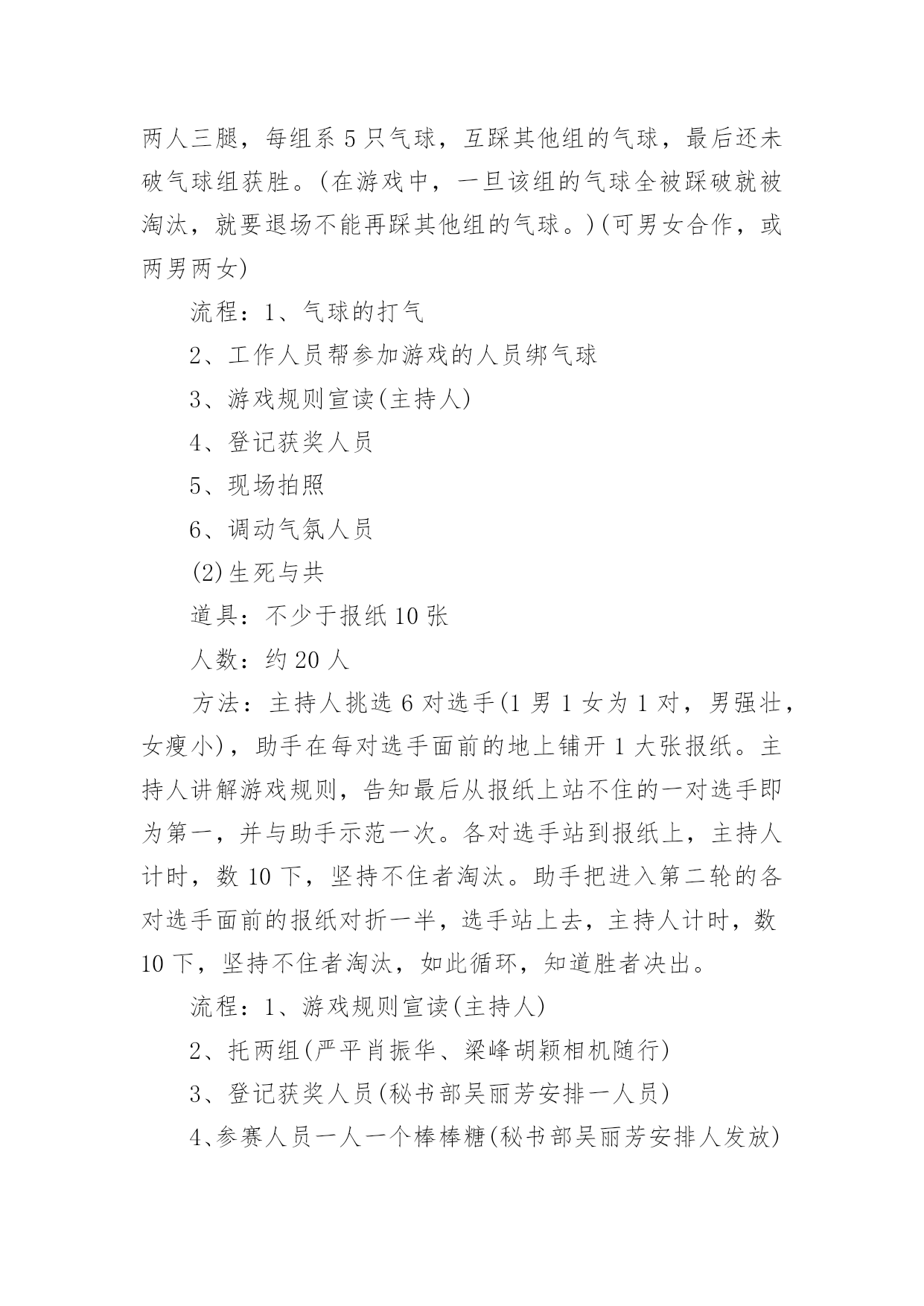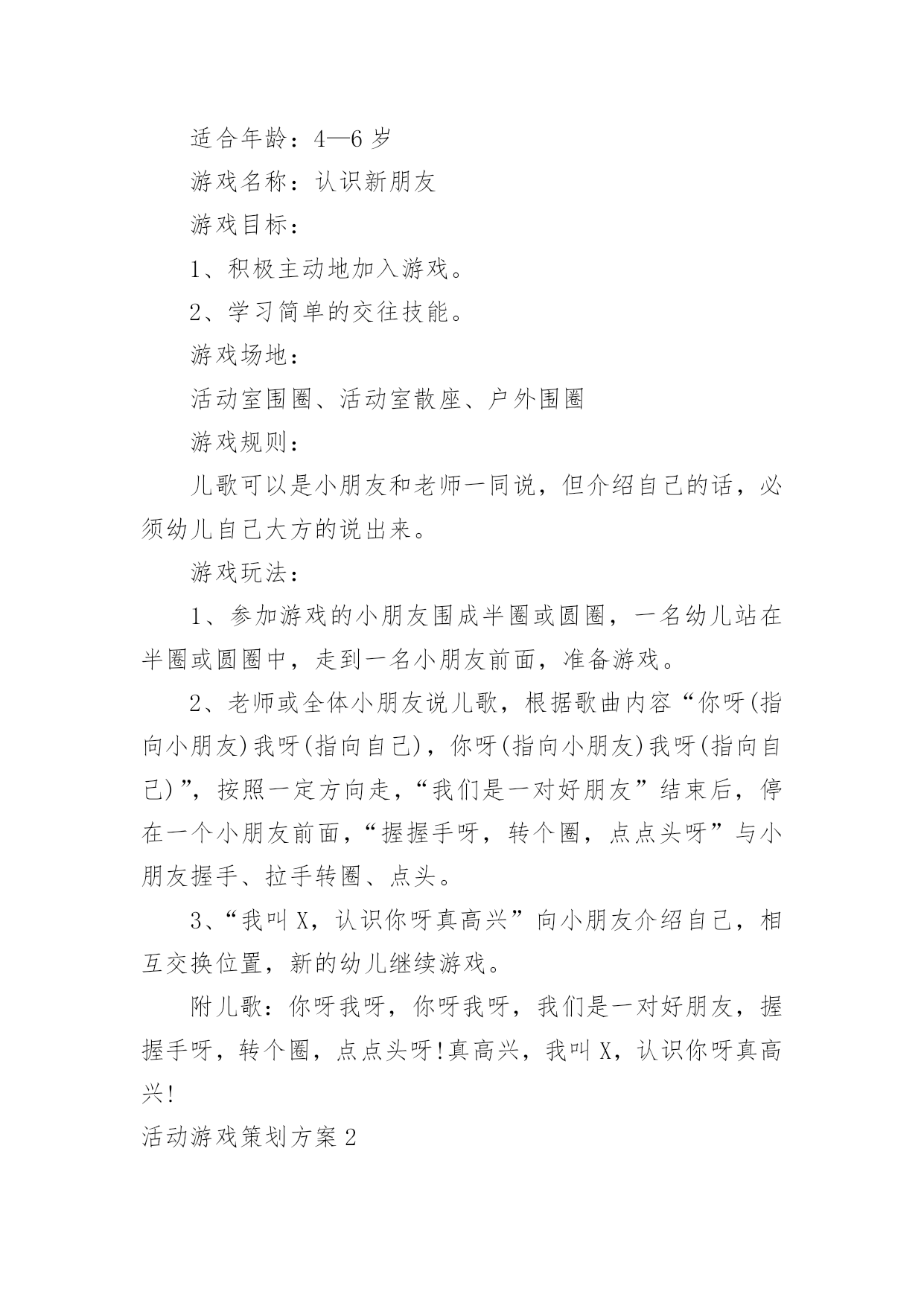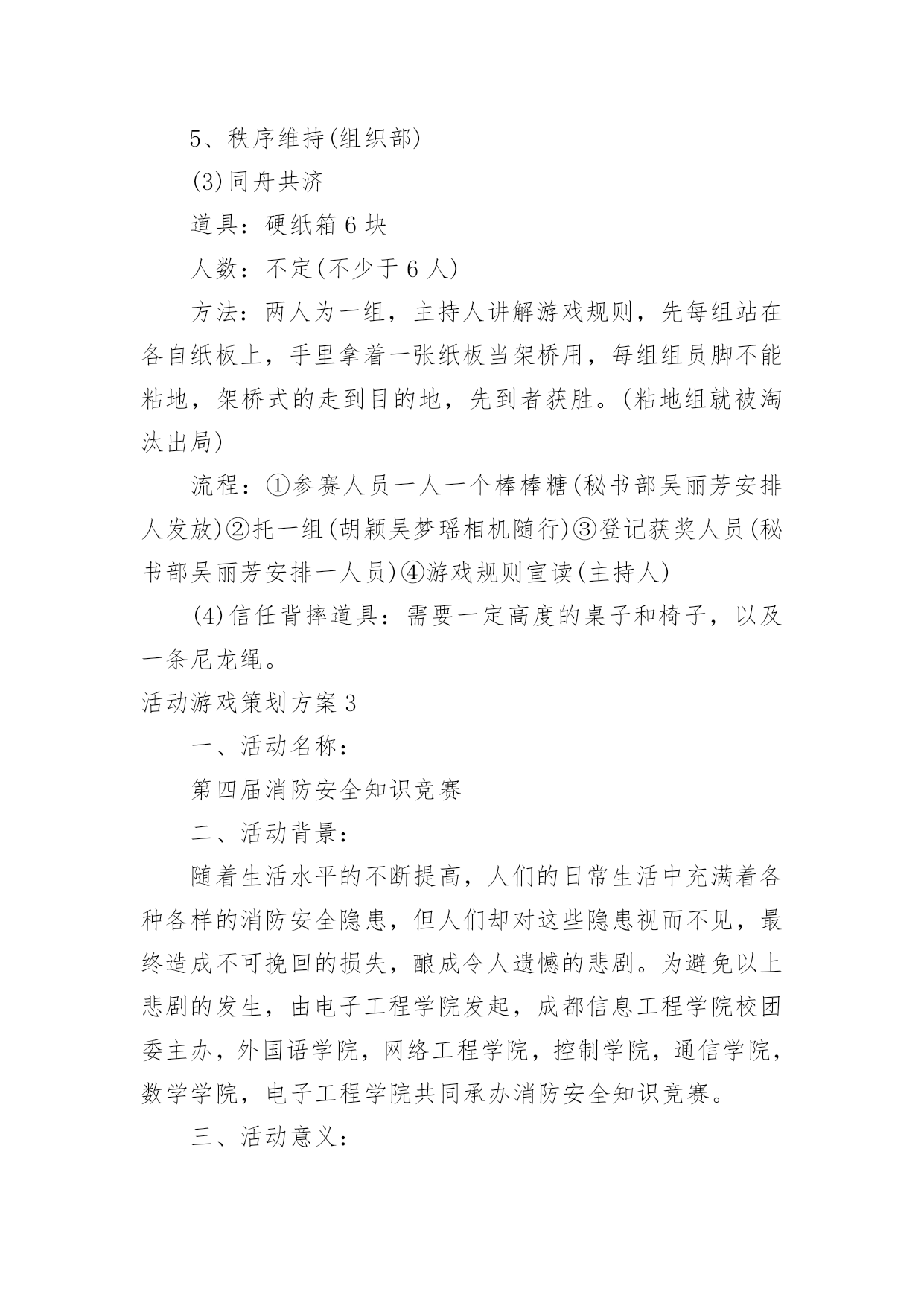 活动游戏策划方案活动游戏策划方案为了确保工作或事情顺利进行,通常需要提前准备好一份方案,方案是从目的、要求、方式、方法、进度等都部署具体、周密,并有很强可操作性的计划。方案应该怎么制定才好呢?以下是小编帮大家整理的活动游戏策划方案,欢迎大家分享。活动游戏策划方案1一、设计意图幼儿在和同伴交往的过程中,不仅学习如何与人友好相处,也在学习如何对待自己和看待他人,不断发展适应社会生活的能力。现代家庭,大都是一个孩子,部分孩子有霸道,唯我独尊的一面,不善于进行友好的沟通与协作,我们可以通过一系列的活动改善并提高幼儿的交往能力,使他们更好地适应社会生活。二、活动目标1、喜欢和小朋友一起游戏,并有自己的好朋友。2、愿意并主动参加群体活动。3、感受规则的意义,并能遵守游戏规则。三、游戏准备儿歌、歌曲、音乐、相关游戏四、游戏玩法及指导适合年龄:4—6岁游戏名称:认识新朋友游戏目标:1、积极主动地加入游戏。2、学习简单的交往技能。游戏场地:活动室围圈、活动室散座、户外围圈游戏规则:儿歌可以是小朋友和老师一同说,但介绍自己的话,必须幼儿自己大方的说出来。游戏玩法:1、参加游戏的小朋友围成半圈或圆圈,一名幼儿站在半圈或圆圈中,走到一名小朋友前面,准备游戏。2、老师或全体小朋友说儿歌,根据歌曲内容“你呀(指向小朋友)我呀(指向自己),你呀(指向小朋友)我呀(指向自己)”,按照一定方向走,“我们是一对好朋友”结束后,停在一个小朋友前面,“握握手呀,转个圈,点点头呀”与小朋友握手、拉手转圈、点头。3、“我叫X,认识你呀真高兴”向小朋友介绍自己,相互交换位置,新的幼儿继续游戏。附儿歌:你呀我呀,你呀我呀,我们是一对好朋友,握握手呀,转个圈,点点头呀!真高兴,我叫X,认识你呀真高兴!活动游戏策划方案2一、活动背景:为宣传心理知识引导健康人生,提高心理素质,营造良好的校园心理文化氛围,为此我们将开展团体心理活动作为教育的一个重要方式。现开展“踩气球”“生死与共““同舟共济”“信任背摔”四个心理励志游戏。二、活动主题:关注心灵,促进身心健康。三、活动对象:以本协会成员为主。四、活动目的:加强各成员之间交流,丰富课余生活。五、活动地点:操场田径场六、活动时间:20xx年七、活动材料:奖品(本子)7份、报纸5张、纸壳子6个、计时表(可用手机)护垫(体育器材室)2个、尼龙绳一条、桌子一张、气球两袋。八、活动安排:1、主持人2、物品管理3、物品购买4、游戏场地选择5、游戏结束主持人宣布获奖名单6、工作人员收拾场地九、游戏(1)踩气球道具:气球若干(不少于200个)人数:30人(具体人数可以以情况而定)方法:两人为一组,组员全部进入到一个规定的区域内,两人三腿,每组系5只气球,互踩其他组的气球,最后还未破气球组获胜。(在游戏中,一旦该组的气球全被踩破就被淘汰,就要退场不能再踩其他组的气球。)(可男女合作,或两男两女)流程:1、气球的打气2、工作人员帮参加游戏的人员绑气球3、游戏规则宣读(主持人)4、登记获奖人员5、现场拍照6、调动气氛人员(2)生死与共道具:不少于报纸10张人数:约20人方法:主持人挑选6对选手(1男1女为1对,男强壮,女瘦小),助手在每对选手面前的地上铺开1大张报纸。主持人讲解游戏规则,告知最后从报纸上站不住的一对选手即为第一,并与助手示范一次。各对选手站到报纸上,主持人计时,数10下,坚持不住者淘汰。助手把进入第二轮的各对选手面前的报纸对折一半,选手站上去,主持人计时,数10下,坚持不住者淘汰,如此循环,知道胜者决出。流程:1、游戏规则宣读(主持人)2、托两组(严平肖振华、梁峰胡颖相机随行)3、登记获奖人员(秘书部吴丽芳安排一人员)4、参赛人员一人一个棒棒糖(秘书部吴丽芳安排人发放)5、秩序维持(组织部)(3)同舟共济道具:硬纸箱6块人数:不定(不少于6人)方法:两人为一组,主持人讲解游戏规则,先每组站在各自纸板上,手里拿着一张纸板当架桥用,每组组员脚不能粘地,架桥式的走到目的地,先到者获胜。(粘地组就被淘汰出局)流程:①参赛人员一人一个棒棒糖(秘书部吴丽芳安排人发放)②托一组(胡颖吴梦瑶相机随行)③登记获奖人员(秘书部吴丽芳安排一人员)④游戏规则宣读(主持人)(4)信任背摔道具:需要一定高度的桌子和椅子,以及一条尼龙绳。活动游戏策划方案3一、活动名称:第四届消防安全知识竞赛二、活动背景:随着生活水平的不断提高,人们的日常生活中充满着各种各样的消防安全隐患,但人们却对这些隐患视而不见,最终造成不可挽回的损失,酿成令人遗憾的悲剧。为避免以上悲剧的发生,由电子工程学院发起,成都信息工程学院校团委主办,外国语学院,网络工程学院,控制学院,通信学院,数学学院,电子工程学院共同承办消防安全知识竞赛。三、活动意义:我们举办此次消防安全知识竞赛,旨在加强大学生基