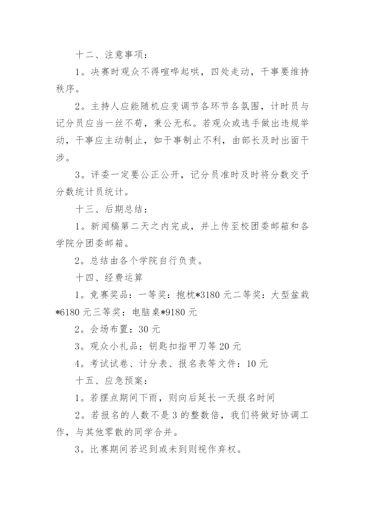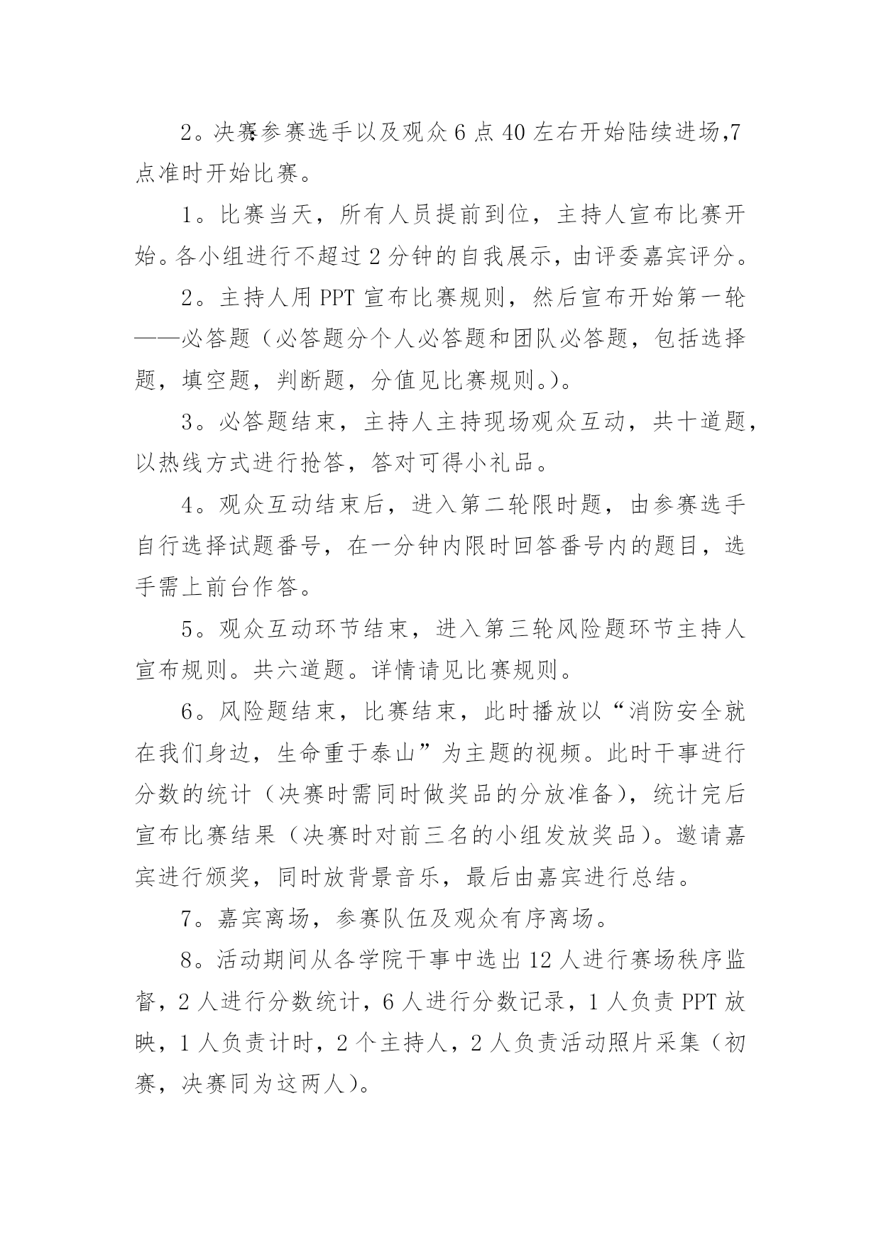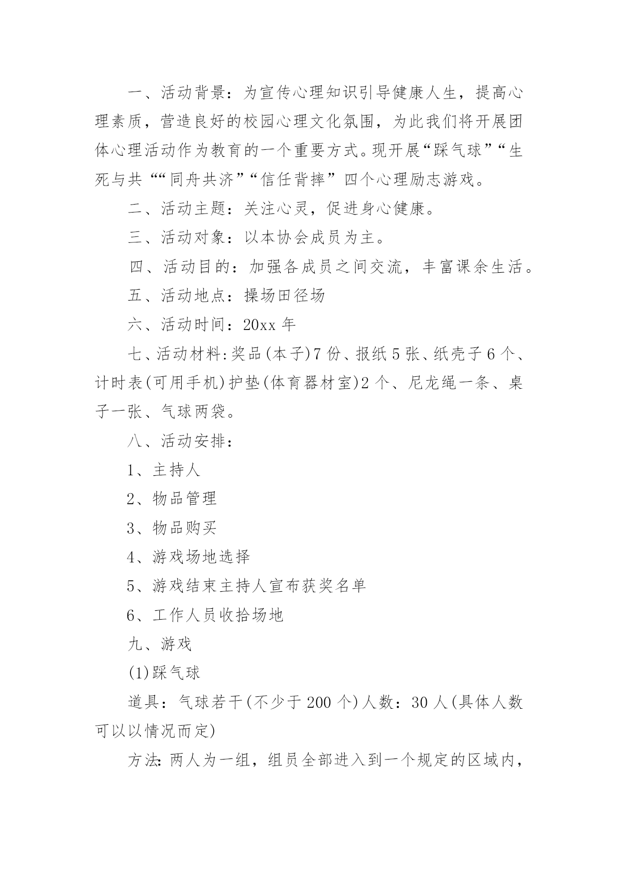 活动游戏策划方案活动游戏策划方案为了确保工作或事情顺利进行,通常需要提前准备好一份方案,方案是从目的、要求、方式、方法、进度等都部署具体、周密,并有很强可操作性的计划。方案应该怎么制定才好呢?以下是小编帮大家整理的活动游戏策划方案,欢迎大家分享。活动游戏策划方案1一、设计意图幼儿在和同伴交往的过程中,不仅学习如何与人友好相处,也在学习如何对待自己和看待他人,不断发展适应社会生活的能力。现代家庭,大都是一个孩子,部分孩子有霸道,唯我独尊的一面,不善于进行友好的沟通与协作,我们可以通过一系列的活动改善并提高幼儿的交往能力,使他们更好地适应社会生活。二、活动目标1、喜欢和小朋友一起游戏,并有自己的好朋友。2、愿意并主动参加群体活动。3、感受规则的意义,并能遵守游戏规则。三、游戏准备儿歌、歌曲、音乐、相关游戏四、游戏玩法及指导适合年龄:4—6岁游戏名称:认识新朋友游戏目标:1、积极主动地加入游戏。2、学习简单的交往技能。游戏场地:活动室围圈、活动室散座、户外围圈游戏规则:儿歌可以是小朋友和老师一同说,但介绍自己的话,必须幼儿自己大方的说出来。游戏玩法:1、参加游戏的小朋友围成半圈或圆圈,一名幼儿站在半圈或圆圈中,走到一名小朋友前面,准备游戏。2、老师或全体小朋友说儿歌,根据歌曲内容“你呀(指向小朋友)我呀(指向自己),你呀(指向小朋友)我呀(指向自己)”,按照一定方向走,“我们是一对好朋友”结束后,停在一个小朋友前面,“握握手呀,转个圈,点点头呀”与小朋友握手、拉手转圈、点头。3、“我叫X,认识你呀真高兴”向小朋友介绍自己,相互交换位置,新的幼儿继续游戏。附儿歌:你呀我呀,你呀我呀,我们是一对好朋友,握握手呀,转个圈,点点头呀!真高兴,我叫X,认识你呀真高兴!活动游戏策划方案2一、活动背景:为宣传心理知识引导健康人生,提高心理素质,营造良好的校园心理文化氛围,为此我们将开展团体心理活动作为教育的一个重要方式。现开展“踩气球”“生死与共““同舟共济”“信任背摔”四个心理励志游戏。二、活动主题:关注心灵,促进身心健康。三、活动对象:以本协会成员为主。四、活动目的:加强各成员之间交流,丰富课余生活。五、活动地点:操场田径场六、活动时间:20xx年七、活动材料:奖品(本子)7份、报纸5张、纸壳子6个、计时表(可用手机)护垫(体育器材室)2个、尼龙绳一条、桌子一张、气球两袋。八、活动安排:1、主持人2、物品管理3、物品购买4、游戏场地选择5、游戏结束主持人宣布获奖名单6、工作人员收拾场地九、游戏(1)踩气球道具:气球若干(不少于200个)人数:30人(具体人数可以以情况而定)方法:两人为一组,组员全部进入到一个规定的区域内,两人三腿,每组系5只气球,互踩其他组的气球,最后还未破气球组获胜。(在游戏中,一旦该组的气球全被踩破就被淘汰,就要退场不能再踩其他组的气球。)(可男女合作,或两男两女)流程:1、气球的打气2、工作人员帮参加游戏的人员绑气球3、游戏规则宣读(主持人)4、登记获奖人员5、现场拍照6、调动气氛人员(2)生死与共道具:不少于报纸10张人数:约20人方法:主持人挑选6对选手(1男1女为1对,男强壮,女瘦小),助手在每对选手面前的地上铺开1大张报纸。主持人讲解游戏规则,告知最后从报纸上站不住的一对选手即为第一,并与助手示范一次。各对选手站到报纸上,主持人计时,数10下,坚持不住者淘汰。助手把进入第二轮的各对选手面前的报纸对折一半,选手站上去,主持人计时,数10下,坚持不住者淘汰,如此循环,知道胜者决出。流程:1、游戏规则宣读(主持人)2、托两组(严平肖振华、梁峰胡颖相机随行)3、登记获奖人员(秘书部吴丽芳安排一人员)4、参赛人员一人一个棒棒糖(秘书部吴丽芳安排人发放)5、秩序维持(组织部)(3)同舟共济道具:硬纸箱6块人数:不定(不少于6人)方法:两人为一组,主持人讲解游戏规则,先每组站在各自纸板上,手里拿着一张纸板当架桥用,每组组员脚不能粘地,架桥式的走到目的地,先到者获胜。(粘地组就被淘汰出局)流程:①参赛人员一人一个棒棒糖(秘书部吴丽芳安排人发放)②托一组(胡颖吴梦瑶相机随行)③登记获奖人员(秘书部吴丽芳安排一人员)④游戏规则宣读(主持人)(4)信任背摔道具:需要一定高度的桌子和椅子,以及一条尼龙绳。活动游戏策划方案3一、活动名称:第四届消防安全知识竞赛二、活动背景:随着生活水平的不断提高,人们的日常生活中充满着各种各样的消防安全隐患,但人们却对这些隐患视而不见,最终造成不可挽回的损失,酿成令人遗憾的悲剧。为避免以上悲剧的发生,由电子工程学院发起,成都信息工程学院校团委主办,外国语学院,网络工程学院,控制学院,通信学院,数学学院,电子工程学院共同承办消防安全知识竞赛。三、活动意义:我们举办此次消防安全知识竞赛,旨在加强大学生基