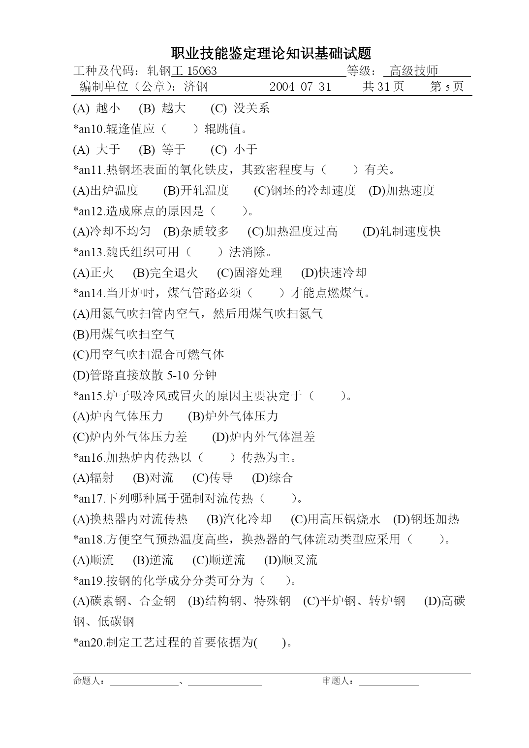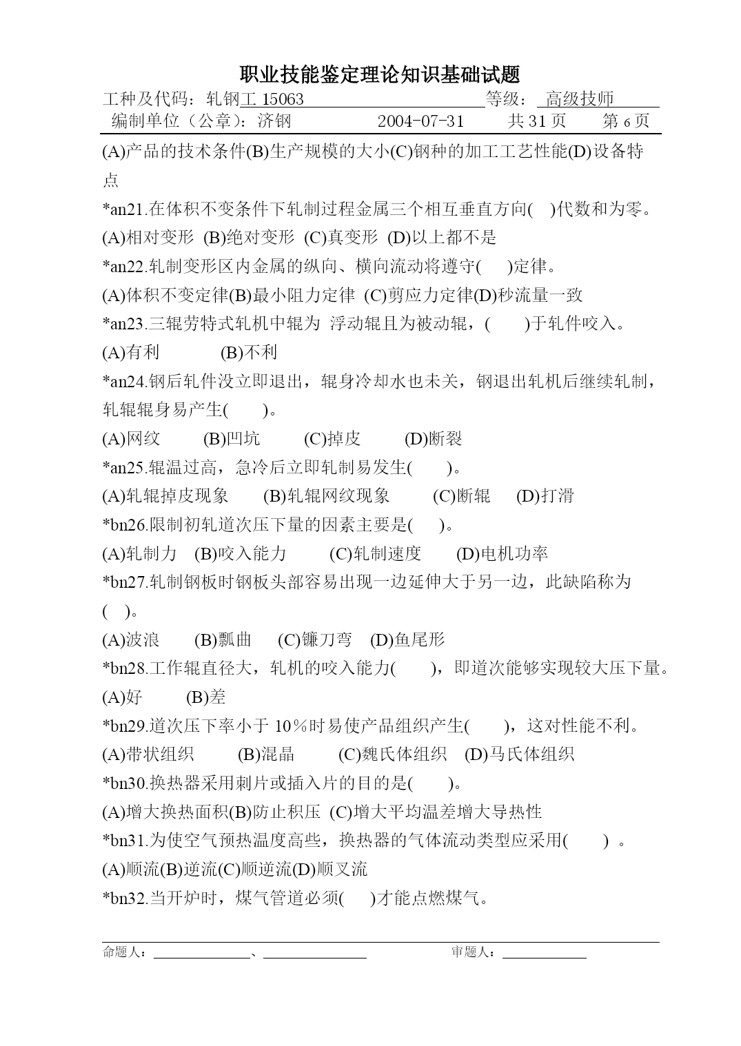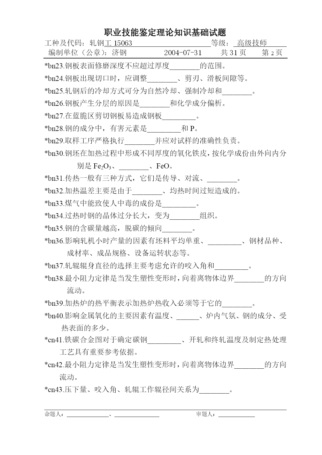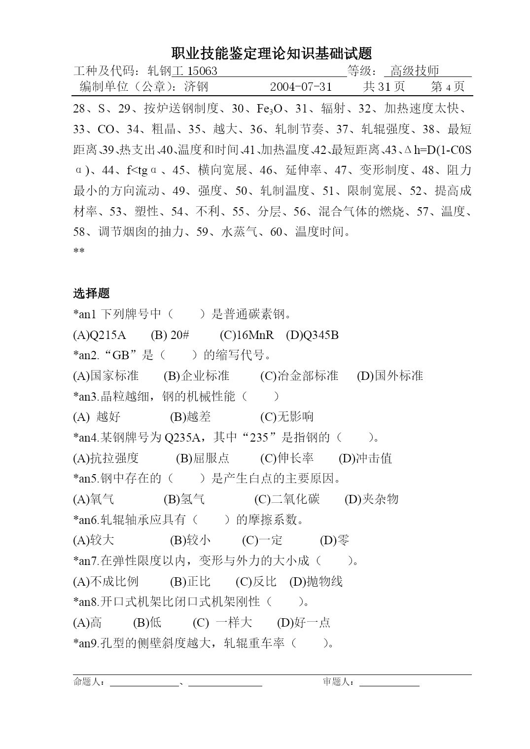 职业技能鉴定理论知识基础试题工种及代码:轧钢工15063等级:高级技师编制单位(公章):济钢2004-07-31第PAGE28页命题人:、审题人:填空题*an1.标准中规定实际尺寸与公称尺寸之间允许的________叫偏差。*an2.对钢加热的目的是为了提高钢的塑性,减少钢的________,消除应力。*an3.中型材的型钢矫直机一般有压力矫直机和________矫直机两种形式。*an4.矫直生产的调整包括零位调整、________调整、正常生产调整。*an5.煤气的三大特性是有毒、________、易爆。*an6.钢锭(坯)加热不均,阴阳面温度差大于_________℃时不允许轧制。*an7.轧件和上下辊接触面之间的空间叫________。*an8.被加热以后的钢坯外层氧化铁皮为_________。*an9.炉子的热平衡是_________定律在炉子热工上的应用。*an10.在轧制过程中,轧件打滑的实质是轧件出口速度小于轧辊的速度,这时整个变形区无_________。*an11.当轧件和工具轧辊的形状不同时,宽展可分为自由展宽、限制展宽、________。*an12.轧制时间,即钢的纯轧时间,可以实际测定,也可用公式计算,公式为________。*an13.金属的塑性指标通常用延伸率和________来表示。*an14.铁碳合金相图对于确定碳钢加热温度、开轧和终轧温度及制定________具有重要参考依据。_______*an15.轧制工艺制度包括变形制度、速度制度与________三部分内容。*an16.前后张力对轧制力的影响是施加张力使轧制力________。*an17.冷却速度越小,实际结晶温度越低,则过冷度越________。____*an18.初轧机最大道次压下量主要取决于咬入条件、设备能力、________。*an19.轧辊凸度过大,为保证良好的板型,要防止轧机________负荷。*an20.精轧道次的最后三道压下量分配与辊型良好配合,就能改善_______。*bn21.在力能参数许可的情况下轧机最大压下量取决于轧辊直径________。*bn22.正确冷却轧辊,能够________辊耗,并确保质量稳定和设备安全。*bn23.钢板表面修磨深度不应超过厚度________的范围。*bn24.钢板出现切口时,应调整________、剪刃、滑板间隙等。*bn25.轧钢后的冷却方式可分为自然冷却、强制冷却和________。*bn26.钢板产生分层的原因是________和化学成分偏析。*bn27.在蓝脆区剪切钢板易造成钢板_________。*bn28.钢的成分中,有害元素是_________和P。*bn29.取样工序严格执行________并应对试样的准确性负责。*bn30.钢坯在加热过程中形成不同厚度的氧化铁皮,按化学成份由外向内分别是Fe2O3、________、FeO。*bn31.传热一般有三种方式,它们是传导、对流、________。*bn32.加热温差主要是由于________、均热时间过短造成的。*bn33.煤气中能致使人中毒的成份是_________。*bn34.过热时钢的晶体过分长大,变为________组织。*bn35.钢的含碳量越高,脱碳的倾向________。*bn36.影响轧机小时产量的因素有坯料平均单重、_________、钢材品种、成材率、成品规格、设备运转状态等。*bn37.轧辊辊身直径的选择主要考虑允许的咬入角和_________。*bn38.最小阻力定律是当发生塑性变形时,向着离物体边界________的方向流动。*bn39.加热炉的热平衡表示加热炉热收入必须等于它的________。*bn40.影响金属氧化的主要因素有温度、______、炉内气氛、钢的成分、受热表面的多少。*cn41.铁碳合金图对于确定碳钢_________、开轧和终轧温度及制定热处理工艺具有重要参考依据。*cn42.最小阻力定律是当发生塑性变形时,向着离物体边界________的方向流动。*cn43.压下量、咬入角、轧辊工作辊径间关系为________。*cn44.轧辊的咬入条件为:________。*cn45.钢材轧制过程中的变形一般分为纵向延伸、_________、高向压下三部分。*cn46.塑性的主要衡量指标有_________、断面收缩率。*cn47.轧制工艺制度包括_________、温度制度和速度制度。*cn48.钢在塑性变形时金属沿着________这就叫最小阻力定律。*cn49.钢经过加热性质会变得比较柔软,具有较大的塑性和较低的________,容易延伸和变形。*cn50.影响