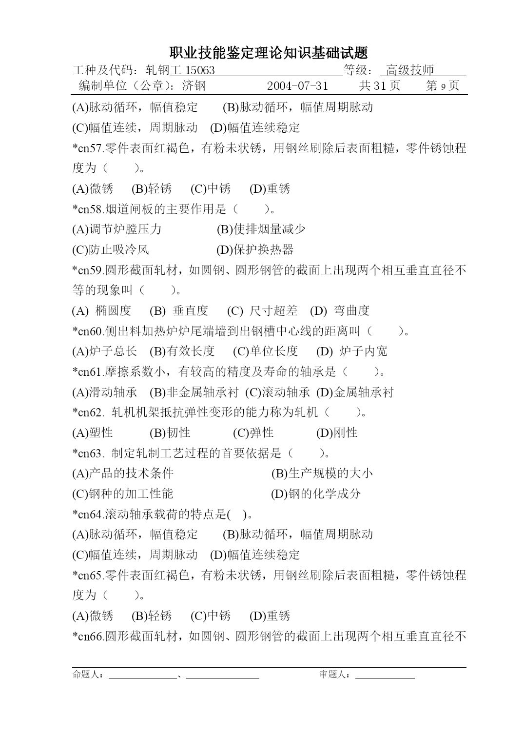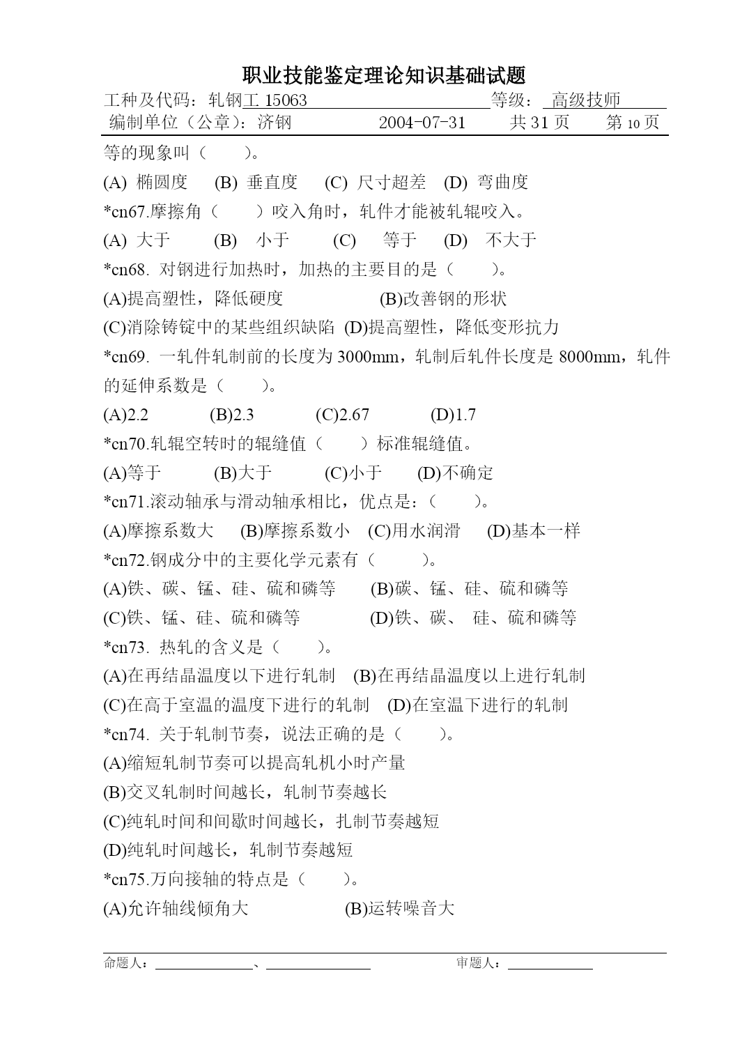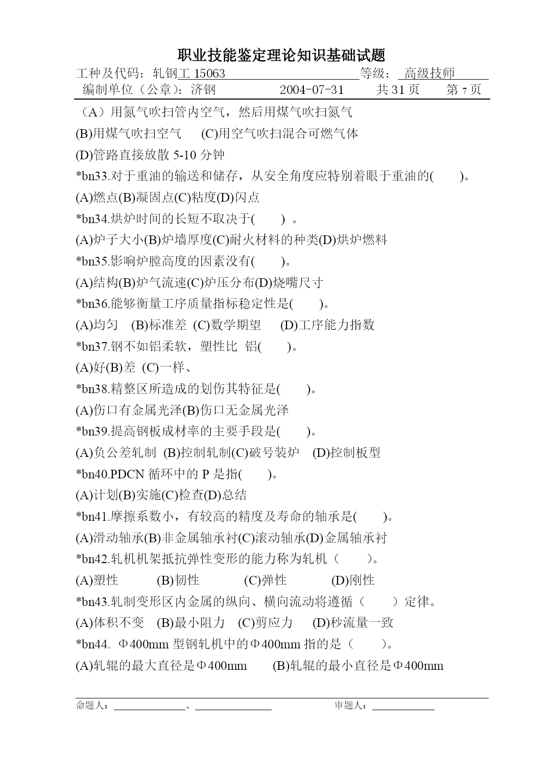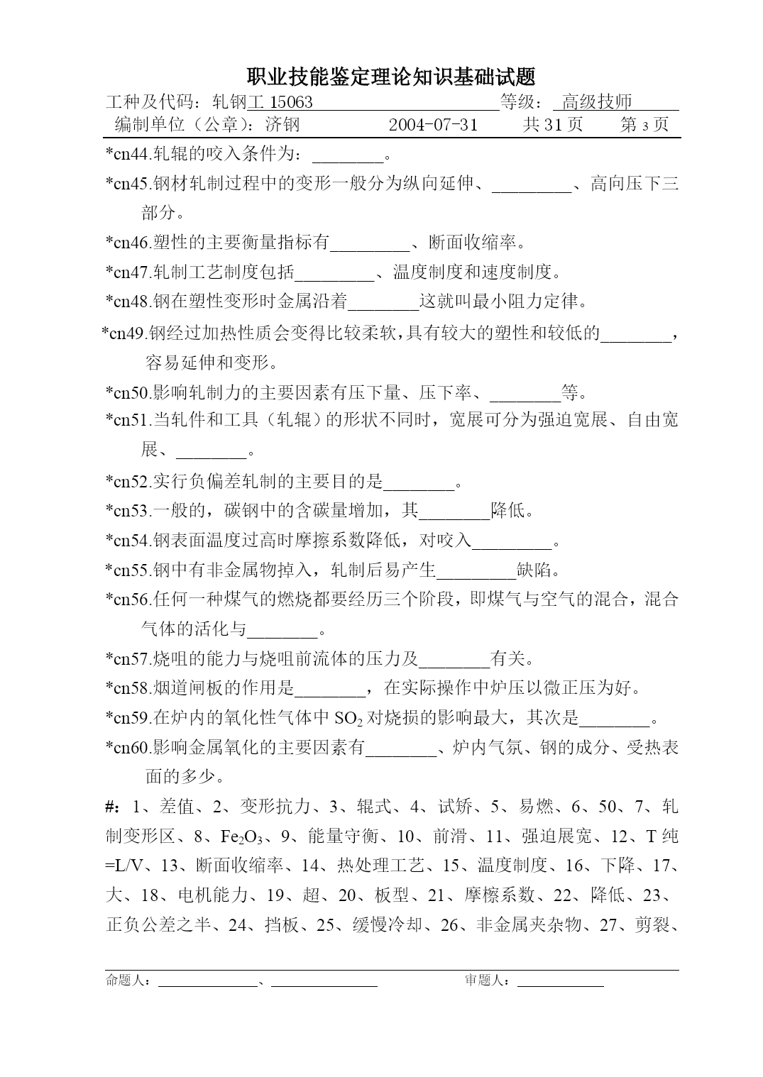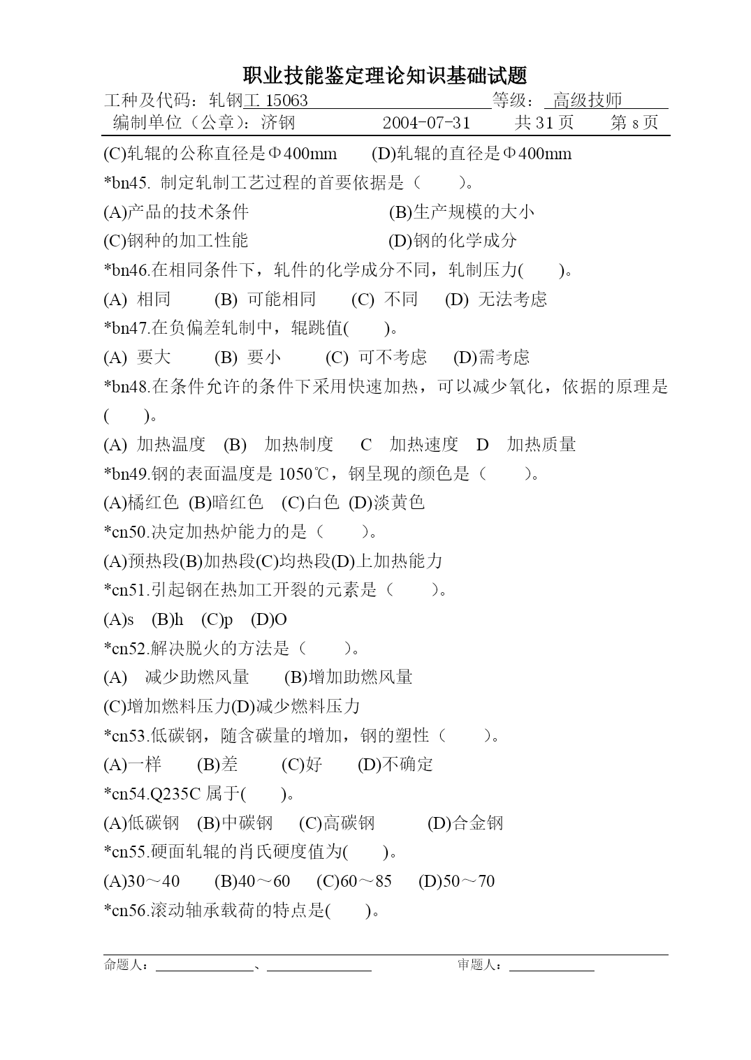 职业技能鉴定理论知识基础试题工种及代码:轧钢工15063等级:高级技师编制单位(公章):济钢2004-07-31第PAGE28页命题人:、审题人:填空题*an1.标准中规定实际尺寸与公称尺寸之间允许的________叫偏差。*an2.对钢加热的目的是为了提高钢的塑性,减少钢的________,消除应力。*an3.中型材的型钢矫直机一般有压力矫直机和________矫直机两种形式。*an4.矫直生产的调整包括零位调整、________调整、正常生产调整。*an5.煤气的三大特性是有毒、________、易爆。*an6.钢锭(坯)加热不均,阴阳面温度差大于_________℃时不允许轧制。*an7.轧件和上下辊接触面之间的空间叫________。*an8.被加热以后的钢坯外层氧化铁皮为_________。*an9.炉子的热平衡是_________定律在炉子热工上的应用。*an10.在轧制过程中,轧件打滑的实质是轧件出口速度小于轧辊的速度,这时整个变形区无_________。*an11.当轧件和工具轧辊的形状不同时,宽展可分为自由展宽、限制展宽、________。*an12.轧制时间,即钢的纯轧时间,可以实际测定,也可用公式计算,公式为________。*an13.金属的塑性指标通常用延伸率和________来表示。*an14.铁碳合金相图对于确定碳钢加热温度、开轧和终轧温度及制定________具有重要参考依据。_______*an15.轧制工艺制度包括变形制度、速度制度与________三部分内容。*an16.前后张力对轧制力的影响是施加张力使轧制力________。*an17.冷却速度越小,实际结晶温度越低,则过冷度越________。____*an18.初轧机最大道次压下量主要取决于咬入条件、设备能力、________。*an19.轧辊凸度过大,为保证良好的板型,要防止轧机________负荷。*an20.精轧道次的最后三道压下量分配与辊型良好配合,就能改善_______。*bn21.在力能参数许可的情况下轧机最大压下量取决于轧辊直径________。*bn22.正确冷却轧辊,能够________辊耗,并确保质量稳定和设备安全。*bn23.钢板表面修磨深度不应超过厚度________的范围。*bn24.钢板出现切口时,应调整________、剪刃、滑板间隙等。*bn25.轧钢后的冷却方式可分为自然冷却、强制冷却和________。*bn26.钢板产生分层的原因是________和化学成分偏析。*bn27.在蓝脆区剪切钢板易造成钢板_________。*bn28.钢的成分中,有害元素是_________和P。*bn29.取样工序严格执行________并应对试样的准确性负责。*bn30.钢坯在加热过程中形成不同厚度的氧化铁皮,按化学成份由外向内分别是Fe2O3、________、FeO。*bn31.传热一般有三种方式,它们是传导、对流、________。*bn32.加热温差主要是由于________、均热时间过短造成的。*bn33.煤气中能致使人中毒的成份是_________。*bn34.过热时钢的晶体过分长大,变为________组织。*bn35.钢的含碳量越高,脱碳的倾向________。*bn36.影响轧机小时产量的因素有坯料平均单重、_________、钢材品种、成材率、成品规格、设备运转状态等。*bn37.轧辊辊身直径的选择主要考虑允许的咬入角和_________。*bn38.最小阻力定律是当发生塑性变形时,向着离物体边界________的方向流动。*bn39.加热炉的热平衡表示加热炉热收入必须等于它的________。*bn40.影响金属氧化的主要因素有温度、______、炉内气氛、钢的成分、受热表面的多少。*cn41.铁碳合金图对于确定碳钢_________、开轧和终轧温度及制定热处理工艺具有重要参考依据。*cn42.最小阻力定律是当发生塑性变形时,向着离物体边界________的方向流动。*cn43.压下量、咬入角、轧辊工作辊径间关系为________。*cn44.轧辊的咬入条件为:________。*cn45.钢材轧制过程中的变形一般分为纵向延伸、_________、高向压下三部分。*cn46.塑性的主要衡量指标有_________、断面收缩率。*cn47.轧制工艺制度包括_________、温度制度和速度制度。*cn48.钢在塑性变形时金属沿着________这就叫最小阻力定律。*cn49.钢经过加热性质会变得比较柔软,具有较大的塑性和较低的________,容易延伸和变形。*cn50.影响