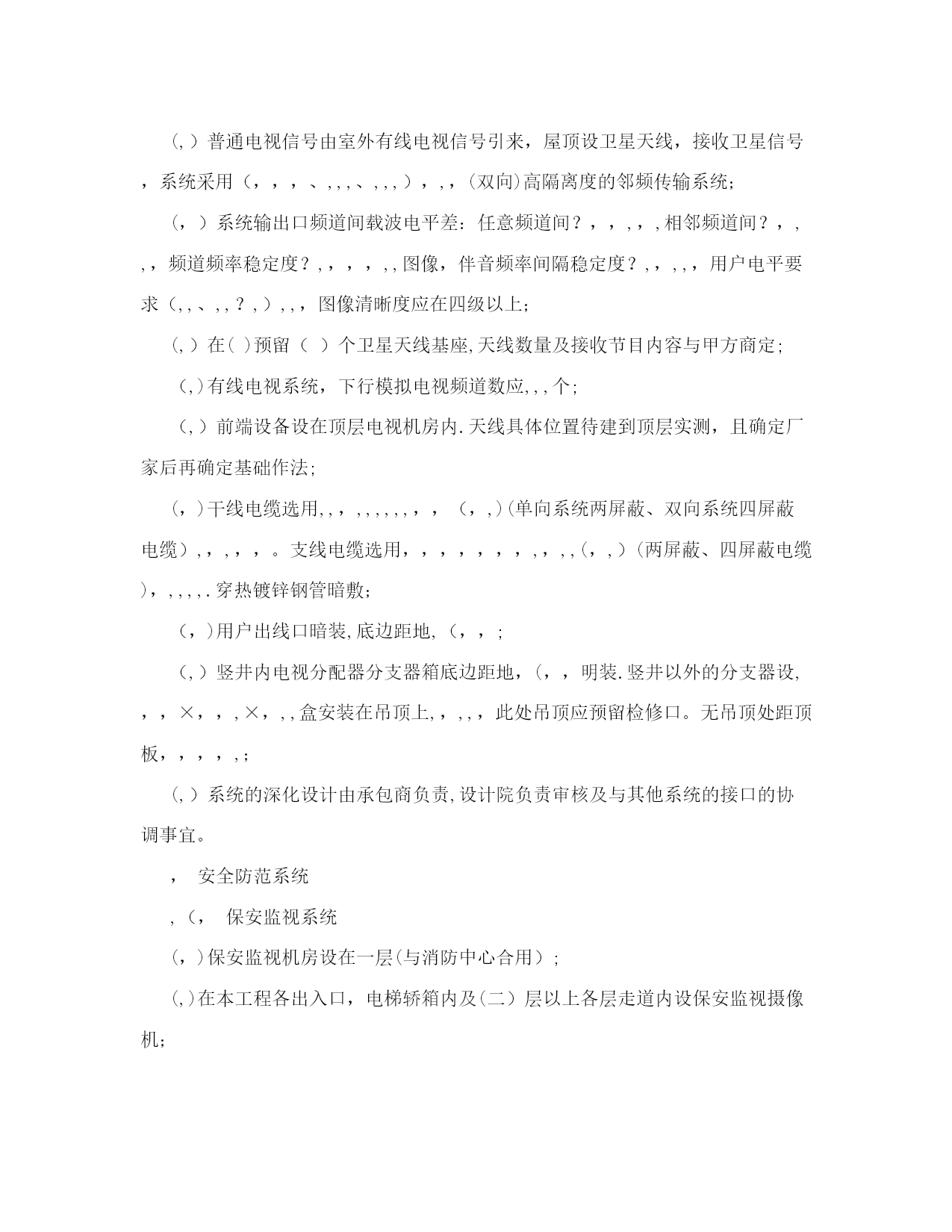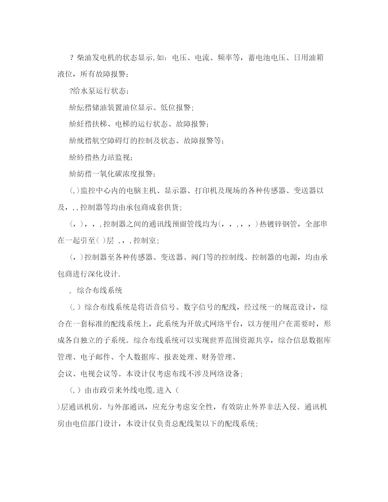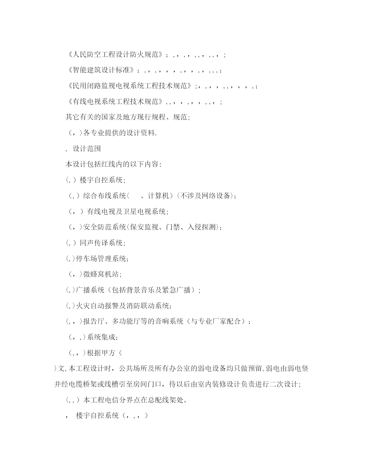 弱电施工设计图纸设计说明【可编辑】实用文档(实用文档,可以直接使用,可编辑优秀版资料,欢迎下载)弱电施工设计图纸设计说明【可编辑】建筑电气弱电设计施工说明摘要:施工图的设计说明非常重要,在实行设计终身负责制的今天,尤为如此。文章阐述的弱电设计说明是作者结合多年设计经验,力求全面、翔实,希望对建筑电气设计同行有所帮助。关键词:楼宇自控综合布线有线电视安全防范停车场管理广播火灾自动报警及消防联动,建筑概况本工程位于()()路与()路交叉口()。建筑面积(,,)。地下()层,主要为车库、各种机房、库房,地上()层,主要为办公室、餐厅、会议室等,属于()类防火建筑。建筑主体高度(,),裙房高度(,)。结构形式为(),基础为(),楼板厚(,,),垫层厚(,,)。,设计依据(,)各市政主管部门对初步设计的审批意见;(,)甲方设计任务书及设计要求;(,)中华人民共和国现行有关规范:《民用建筑电气设计规范》,,,,,,,,,,;《高层民用建筑设计防火规范》,,,,,,,,,,(,,,,年版);《火灾自动报警系统设计规范》,,,,,,,,,,;《建筑与建筑群综合布线系统工程设计规范》,,,,,,,,,,,,,,;《汽车库、修车库、停车场设计防火规范》,,,,,,,,,,;《人民防空地下室设计规范》,,,,,,,,,,;《人民防空工程设计防火规范》;,,,,,,,,,,;《智能建筑设计标准》;,,,,,,,,,,,,,,;《民用闭路监视电视系统工程技术规范》;,,,,,,,,,,;《有线电视系统工程技术规范》,,,,,,,,,,;其它有关的国家及地方现行规程、规范;(,)各专业提供的设计资料.,设计范围本设计包括红线内的以下内容:(,)楼宇自控系统;(,)综合布线系统(、计算机)(不涉及网络设备);(,)有线电视及卫星电视系统;(,)安全防范系统(保安监视、门禁、入侵探测);(,)同声传译系统;(,)停车场管理系统;(,)微蜂窝机站;(,)广播系统(包括背景音乐及紧急广播);(,)火灾自动报警及消防联动系统;(,,)报告厅、多功能厅等的音响系统(与专业厂家配合);(,,)系统集成;(,,)根据甲方()文,本工程设计时,公共场所及所有办公室的弱电设备均只做预留,弱电由弱电竖井经电缆桥架或线槽引至房间门口,待以后由室内装修设计负责进行二次设计;(,,)本工程电信分界点在总配线架处。,楼宇自控系统(,,,)(,)空调、制冷、供暖、通风、给排水、变配电系统、柴油发电机系统、公共区域照明等均纳入,,,系统进行监控或监视;(,)监控中心设于()层。()设置分站;(,),,,应具备机组的手,自动状态监视、启停控制、运行状态显示、故障报警、温度监测、湿度监测、控制及实现相关的各种逻辑控制关系等功能;(,)消防类水泵、风机不进入,,,;(,)冷冻机应能从其控制屏(箱)内送出机组的运行状态、故障信号;能接受由,,系统发出的控制冷冻机的起、停信号;能根据控制系统的要求,进行制冷系统的顺序起停;(,),,,包括:?冷冻机、冷却泵、冷冻泵、冷却塔及相应的进出水阀等顺序起、停程序控制,状态显示,故障报警;?压差调节阀、新风阀、水路电动两通阀、进风机电动阀、空调机、新风机、温度调节阀的开启、关闭或开度控制;?送、排风机的时间程序控制;?温、湿度等参数的测量记录;?变配电所内高压进线、出线及联络开关的状态,进、出线电流、电压、有功功率、无功功率、计量;低压进线及联络开关状态、电流、电压、电量、功率因数等参数的测量记录;干式变压器运行温度显示、超温报警;?公共场所照明、室外照明、节日照明、车库照明等的时间程序控制或光敏元件控制;?高位水箱水位显示及溢流报警;?污水坑水位显示及溢流报警;?柴油发电机的状态显示,如:电压、电流、频率等,蓄电池电压、日用油箱液位,所有故障报警;?给水泵运行状态;紒紜矠储油装置油位显示、低位报警;紒紝矠扶梯、电梯的运行状态、故障报警;紒紞矠航空障碍灯的控制及状态、故障报警等;紒紟矠热力站监视;紒紡矠一氧化碳浓度报警;(,)监控中心内的电脑主机、显示器、打印机及现场的各种传感器、变送器以及,,,控制器等均由承包商成套供货;(,),,,控制器之间的通讯线预留管线均为(,,,,,)热镀锌钢管,全部串在一起引至()层,,,控制室;(,)控制器至各种传感器、变送器、阀门等的控制线、控制器的电源,均由承包商进行深化设计.,综合布线系统(,)综合布线系统是将语音信号、数字信号的配线,经过统一的规范设计,综合在一套标准的配线系统上,此系统为开放式网络平台,以方便用户在需要时,形成各自独立的子系统。综合布线系统可以实现世界范围资源共享,综合信息