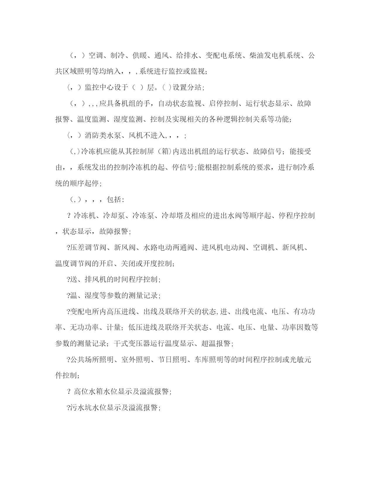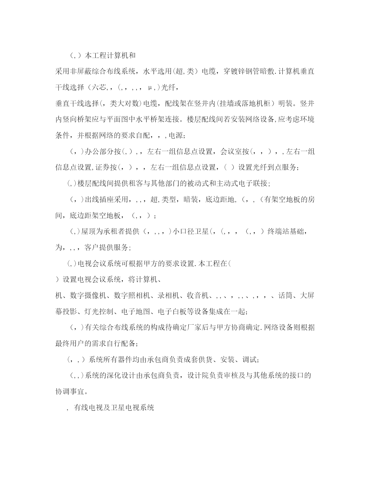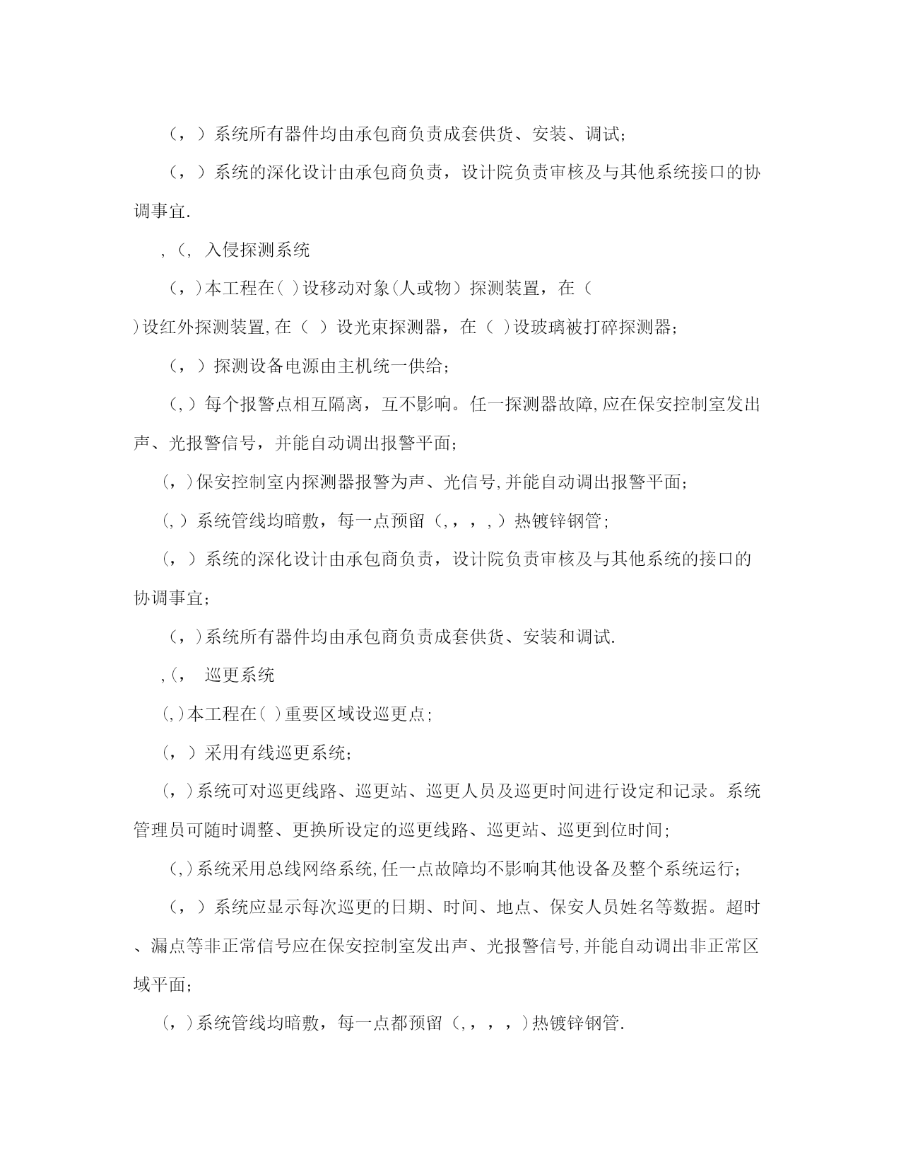 弱电施工设计图纸设计说明【可编辑】实用文档(实用文档,可以直接使用,可编辑优秀版资料,欢迎下载)弱电施工设计图纸设计说明【可编辑】建筑电气弱电设计施工说明摘要:施工图的设计说明非常重要,在实行设计终身负责制的今天,尤为如此。文章阐述的弱电设计说明是作者结合多年设计经验,力求全面、翔实,希望对建筑电气设计同行有所帮助。关键词:楼宇自控综合布线有线电视安全防范停车场管理广播火灾自动报警及消防联动,建筑概况本工程位于()()路与()路交叉口()。建筑面积(,,)。地下()层,主要为车库、各种机房、库房,地上()层,主要为办公室、餐厅、会议室等,属于()类防火建筑。建筑主体高度(,),裙房高度(,)。结构形式为(),基础为(),楼板厚(,,),垫层厚(,,)。,设计依据(,)各市政主管部门对初步设计的审批意见;(,)甲方设计任务书及设计要求;(,)中华人民共和国现行有关规范:《民用建筑电气设计规范》,,,,,,,,,,;《高层民用建筑设计防火规范》,,,,,,,,,,(,,,,年版);《火灾自动报警系统设计规范》,,,,,,,,,,;《建筑与建筑群综合布线系统工程设计规范》,,,,,,,,,,,,,,;《汽车库、修车库、停车场设计防火规范》,,,,,,,,,,;《人民防空地下室设计规范》,,,,,,,,,,;《人民防空工程设计防火规范》;,,,,,,,,,,;《智能建筑设计标准》;,,,,,,,,,,,,,,;《民用闭路监视电视系统工程技术规范》;,,,,,,,,,,;《有线电视系统工程技术规范》,,,,,,,,,,;其它有关的国家及地方现行规程、规范;(,)各专业提供的设计资料.,设计范围本设计包括红线内的以下内容:(,)楼宇自控系统;(,)综合布线系统(、计算机)(不涉及网络设备);(,)有线电视及卫星电视系统;(,)安全防范系统(保安监视、门禁、入侵探测);(,)同声传译系统;(,)停车场管理系统;(,)微蜂窝机站;(,)广播系统(包括背景音乐及紧急广播);(,)火灾自动报警及消防联动系统;(,,)报告厅、多功能厅等的音响系统(与专业厂家配合);(,,)系统集成;(,,)根据甲方()文,本工程设计时,公共场所及所有办公室的弱电设备均只做预留,弱电由弱电竖井经电缆桥架或线槽引至房间门口,待以后由室内装修设计负责进行二次设计;(,,)本工程电信分界点在总配线架处。,楼宇自控系统(,,,)(,)空调、制冷、供暖、通风、给排水、变配电系统、柴油发电机系统、公共区域照明等均纳入,,,系统进行监控或监视;(,)监控中心设于()层。()设置分站;(,),,,应具备机组的手,自动状态监视、启停控制、运行状态显示、故障报警、温度监测、湿度监测、控制及实现相关的各种逻辑控制关系等功能;(,)消防类水泵、风机不进入,,,;(,)冷冻机应能从其控制屏(箱)内送出机组的运行状态、故障信号;能接受由,,系统发出的控制冷冻机的起、停信号;能根据控制系统的要求,进行制冷系统的顺序起停;(,),,,包括:?冷冻机、冷却泵、冷冻泵、冷却塔及相应的进出水阀等顺序起、停程序控制,状态显示,故障报警;?压差调节阀、新风阀、水路电动两通阀、进风机电动阀、空调机、新风机、温度调节阀的开启、关闭或开度控制;?送、排风机的时间程序控制;?温、湿度等参数的测量记录;?变配电所内高压进线、出线及联络开关的状态,进、出线电流、电压、有功功率、无功功率、计量;低压进线及联络开关状态、电流、电压、电量、功率因数等参数的测量记录;干式变压器运行温度显示、超温报警;?公共场所照明、室外照明、节日照明、车库照明等的时间程序控制或光敏元件控制;?高位水箱水位显示及溢流报警;?污水坑水位显示及溢流报警;?柴油发电机的状态显示,如:电压、电流、频率等,蓄电池电压、日用油箱液位,所有故障报警;?给水泵运行状态;紒紜矠储油装置油位显示、低位报警;紒紝矠扶梯、电梯的运行状态、故障报警;紒紞矠航空障碍灯的控制及状态、故障报警等;紒紟矠热力站监视;紒紡矠一氧化碳浓度报警;(,)监控中心内的电脑主机、显示器、打印机及现场的各种传感器、变送器以及,,,控制器等均由承包商成套供货;(,),,,控制器之间的通讯线预留管线均为(,,,,,)热镀锌钢管,全部串在一起引至()层,,,控制室;(,)控制器至各种传感器、变送器、阀门等的控制线、控制器的电源,均由承包商进行深化设计.,综合布线系统(,)综合布线系统是将语音信号、数字信号的配线,经过统一的规范设计,综合在一套标准的配线系统上,此系统为开放式网络平台,以方便用户在需要时,形成各自独立的子系统。综合布线系统可以实现世界范围资源共享,综合信息