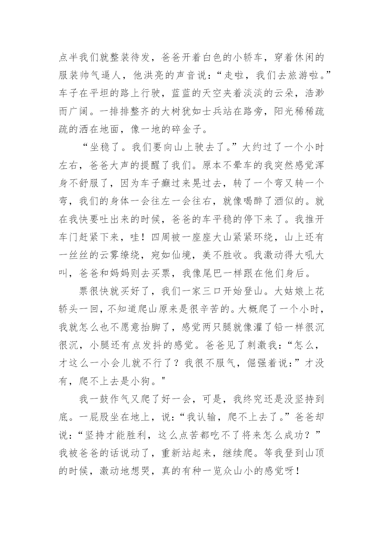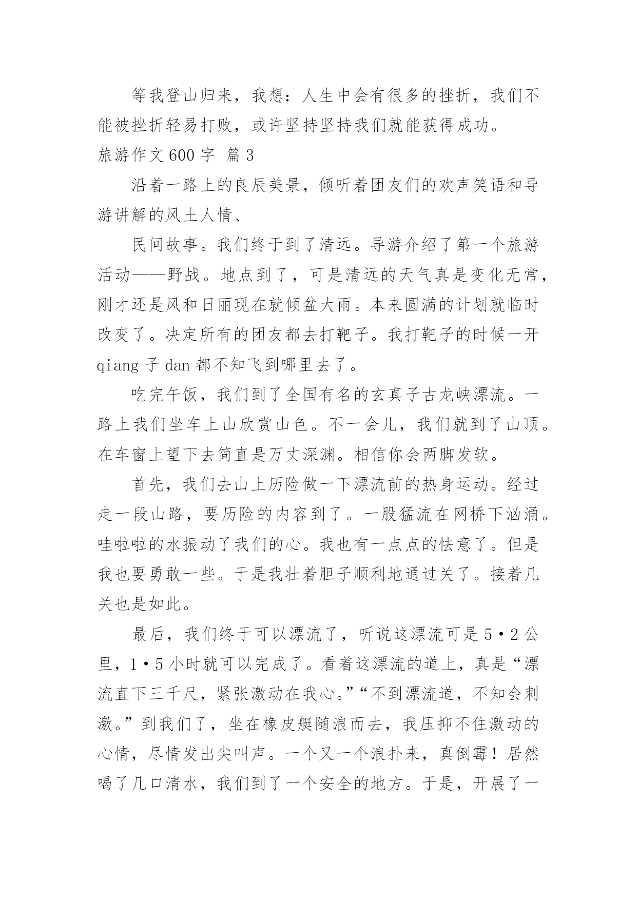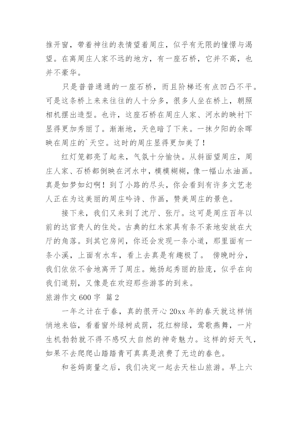 旅游作文600字旅游作文600字3篇在我们平凡的日常里,许多人都写过作文吧,作文是一种言语活动,具有高度的综合性和创造性。写起作文来就毫无头绪?以下是小编精心整理的旅游作文600字3篇,仅供参考,大家一起来看看吧。旅游作文600字篇1周庄之旅下午,下起了牛毛细雨。细细的雨珠轻快地拍打着人们的脸颊。我和爸爸妈妈来到周庄游玩。首先映入眼帘的是巨大的石门,上面刻着大红色的字:周庄。走过这块石门,大大小小的商店接踵而至。瞧!那儿是专门卖伞和香囊的,淡粉色的、蓝色的……各式各样的江南竹伞整整齐齐地挂在了商店门前。香囊上画着美丽的花纹,还会有薰衣草、茉莉花的清香飘来。看!那儿是专门卖牛骨毛笔的。如玉石般雪白的笔杆,摸上去凉丝丝,滑滑的,估计这就是牛骨吧。走进这家商店,还会有比扫把大5倍的牛骨毛笔悬挂在高高的天花板上呢!怎么样?这像不像魔法师骑的魔法扫帚?继续向前走,真正的周庄才慢慢揭开她的面纱,为你一展她的风采。黑瓦白墙的周庄人家紧靠着一条条清澈的河。有些人正在把衣服吊在一根竹竿上,看上去充满了家常味。有些人正推开窗,带着神往的表情望着周庄,似乎有无限的憧憬与渴望。在离周庄人家不远的地方,有一座石桥,它并不高,也并不豪华。只是普普通通的一座石桥,而且阶梯还有点凹凸不平。可是这条桥上来来往往的人十分多,很多人坐在桥上,朝照相机摆出造型。也许,这座石桥在周庄人家、河水的映衬下显得更加秀丽了。渐渐地,天色暗了下来。一抹夕阳的余晖映在周庄的`天空。这时的周庄显得更加美了!红灯笼都亮了起来,气氛十分愉快。从斜面望周庄,周庄人家、石桥都倒映在河水中,模模糊糊,像一幅山水油画。真是如梦如幻啊!到了小路的尽头,你会看到有许多文艺老人正在为这美丽的周庄吟诗、作画,赞美周庄的景色。接下来,我们又来到了沈厅、张厅。这可是周庄百年以前的达官贵人的住处。古典的红木家具有条不紊地安放在大厅的角落。到其它房间,你还会发现一条小道,那里面有一条小溪,上面有水车,看上去真是有趣极了。傍晚时分,我们依依不舍地离开了周庄。她扬起秀丽的脸庞,似乎在向我们道别,又像是在欢迎那些游客的到来。旅游作文600字篇2一年之计在于春,真的很开心20xx年的春天就这样悄悄地来临,看着窗外绿树成荫,花红柳绿,莺歌燕舞,一片生机勃勃就不得不感叹大自然的神奇魅力。这样的好天气,如果不去爬爬山踏踏青可真真是浪费了无边的春色。和爸妈商量之后,我们决定一起去天柱山旅游。早上六点半我们就整装待发,爸爸开着白色的小轿车,穿着休闲的服装帅气逼人,他洪亮的声音说:“走啦,我们去旅游啦。”车子在平坦的路上行驶,蓝蓝的天空夹着淡淡的云朵,浩渺而广阔。一排排整齐的大树犹如士兵站在路旁,阳光稀稀疏疏的洒在地面,像一地的碎金子。“坐稳了。我们要向山上驶去了。”大约过了一个小时左右,爸爸大声的提醒了我们。原本不晕车的我突然感觉浑身不舒服了,因为车子癫过来晃过去,转了一个弯又转一个弯,我们的身体一会往左一会往右,就像喝醉了酒似的。就在我快要吐出来的时候,爸爸的车平稳的停下来了。我推开车门赶紧下来,哇!四周被一座座大山紧紧环绕,山上还有一丝丝的云雾缭绕,宛如仙境,美不胜收。我激动得大吼大叫,爸爸和妈妈则去买票,我像尾巴一样跟在他们身后。票很快就买好了,我们一家三口开始登山。大姑娘上花轿头一回,不知道爬山原来是很辛苦的。大概爬了一个小时,我就怎么也不愿意抬脚了,感觉两只腿就像灌了铅一样很沉很沉,小腿还有点发抖的感觉。爸爸见了刺激我:“怎么,才这么一小会儿就不行了?我很不服气,倔强着说:”才没有,爬不上去是小狗。"我一鼓作气又爬了好一会,可是,我终究还是没坚持到底。一屁股坐在地上,说:“我认输,爬不上去了。”爸爸却说:“坚持才能胜利,这么点苦都吃不了将来怎么成功?”我被爸爸的话说动了,重新站起来,继续爬。等我登到山顶的时候,激动地想哭,真的有种一览众山小的感觉呀!等我登山归来,我想:人生中会有很多的挫折,我们不能被挫折轻易打败,或许坚持坚持我们就能获得成功。旅游作文600字篇3沿着一路上的良辰美景,倾听着团友们的欢声笑语和导游讲解的风土人情、民间故事。我们终于到了清远。导游介绍了第一个旅游活动——野战。地点到了,可是清远的天气真是变化无常,刚才还是风和日丽现在就倾盆大雨。本来圆满的计划就临时改变了。决定所有的团友都去打靶子。我打靶子的时候一开qiang子dan都不知飞到哪里去了。吃完午饭,我们到了全国有名的玄真子古龙峡漂流。一路上我们坐车上山欣赏山色。不一会儿,我们就到了山顶。在车窗上望下去简直是万丈深渊。相信你会两脚发软。首先,我们去山上历险做一下漂流前的热身运动。经过走一段山路,要历险的内容到了。一股猛流在网桥下汹涌。哇啦啦的水振动了我们的心。我也有一点点的怯意了。但是我也要勇敢一些。于是我壮着胆子顺利地通过关了。接着几关