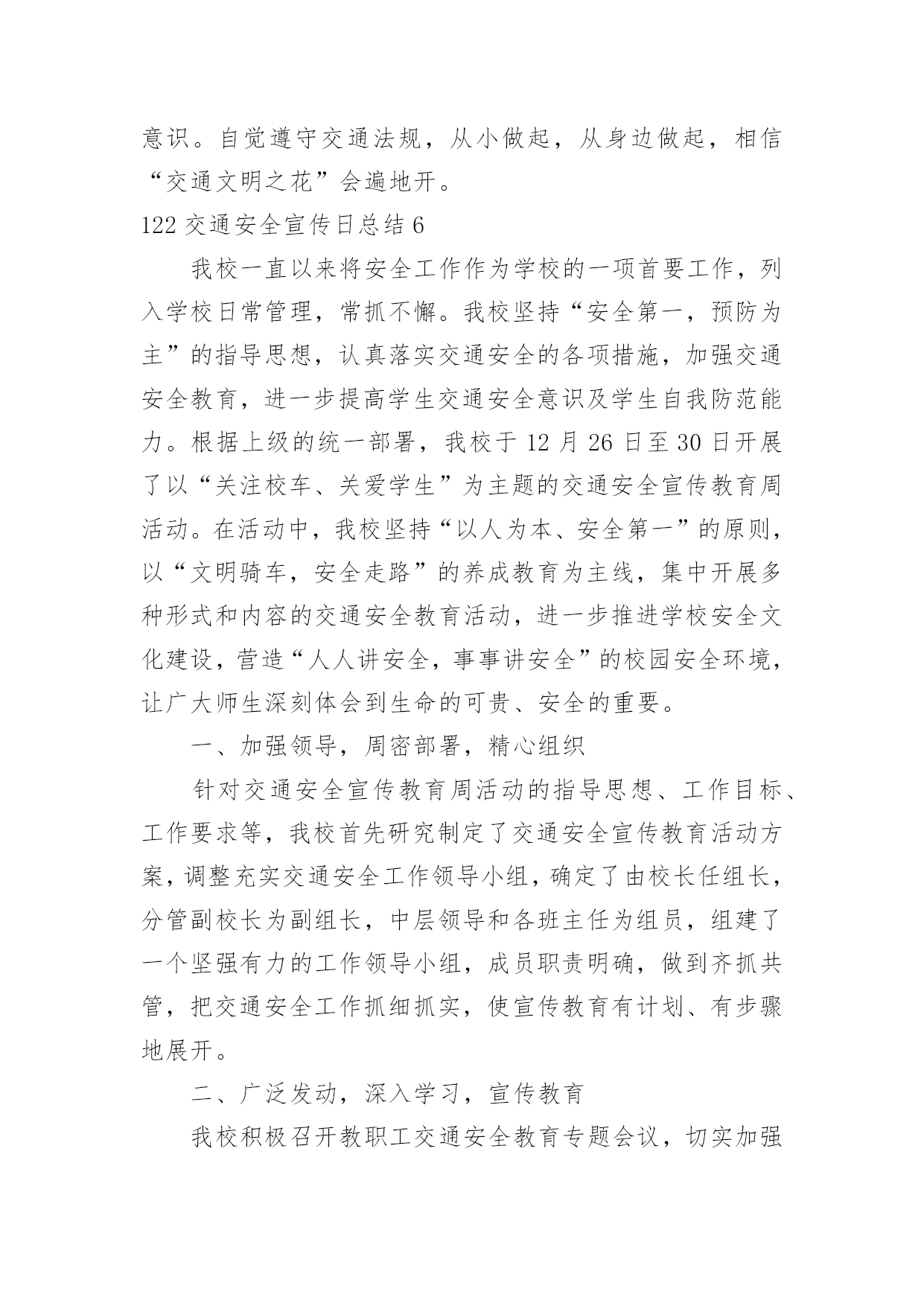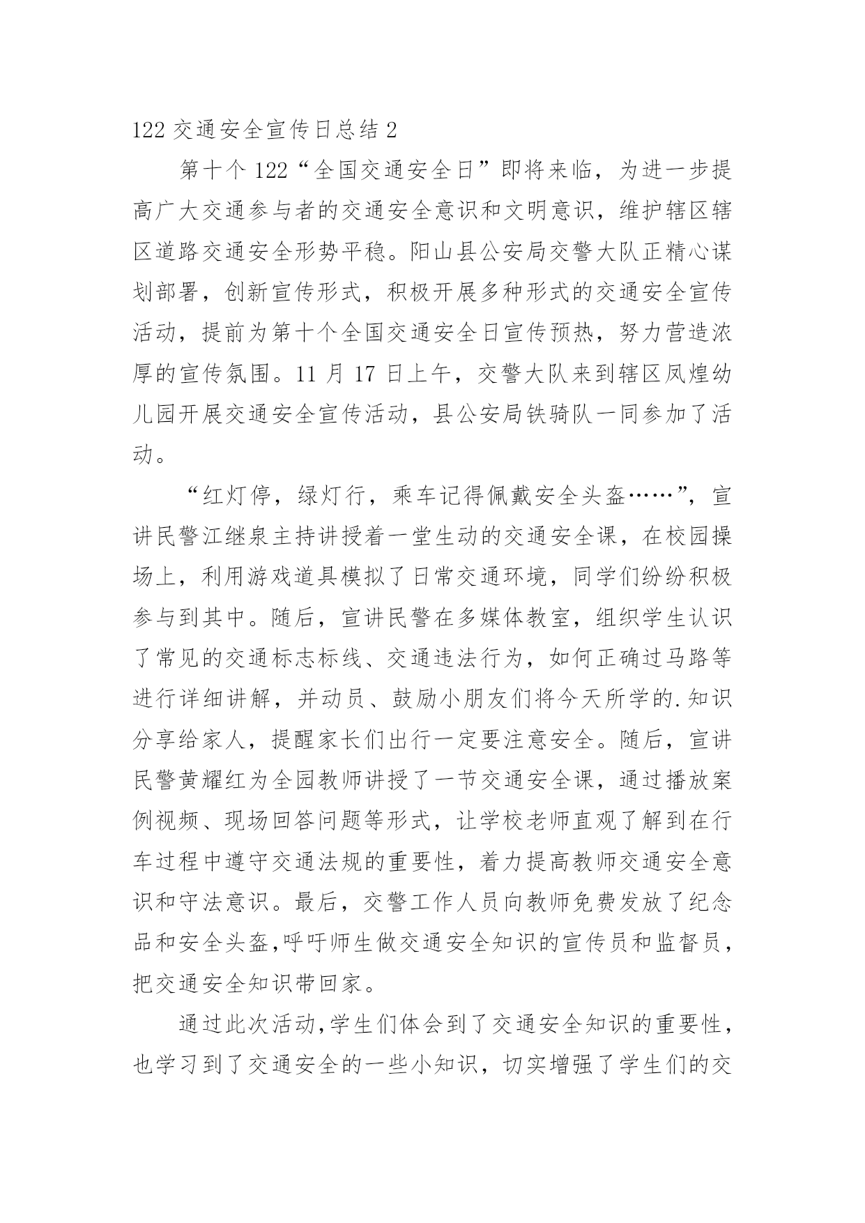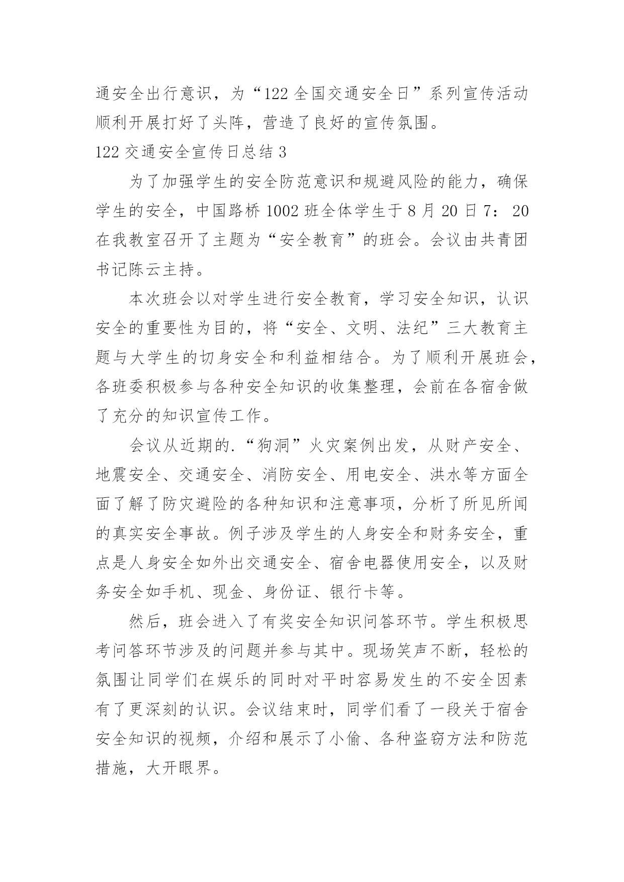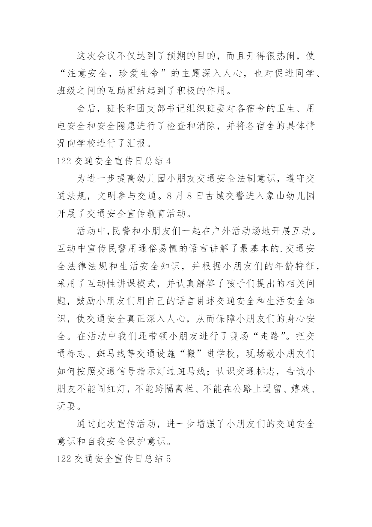 122交通安全宣传日总结122交通安全宣传日总结总结是事后对某一阶段的学习或工作情况作加以回顾检查并分析评价的书面材料,通过它可以全面地、系统地了解以往的学习和工作情况,让我们一起认真地写一份总结吧。那么总结有什么格式呢?下面是小编为大家整理的122交通安全宣传日总结,欢迎大家分享。122交通安全宣传日总结1为了让我们的孩子能够:“高高兴兴上学,平平安安回家”,为了“安全第一,预防为主”的方针,加强对幼儿交通安全教育管理,根据《大唐镇教办中小学生交通安全宣传月活动实施意见》,结合幼儿园特点,创造性地开展了交通安全宣传教育活动。一、全方位加强管理,完善幼儿接送安全制度。切实加强幼儿接送安全,认真执行幼儿接送制度,由行政人员进行监督执行。幼儿入园即配有一帽两卡,家长接送幼儿须凭“接送卡”以卡换人;接送高峰期,行政值班人员在门口进行巡视,严防幼儿冒领或走失;通过填写《幼儿家庭情况调查表》,调查幼儿接送车的安全现状,严禁无牌无证的车辆来接送幼儿,确保幼儿接送途中安全;完善门卫考核制度,落实门卫职责,有效促进幼儿在园安全。二、多渠道宣传,提高家长的交通安全意识。都说“孩子是看着父母的后背成长的”,父母如果严格遵守规则,那么孩子亦然。我园积极利用宣传窗,以图文并茂的形式向家长推广交通法规常识,;利用家长学校这一大课堂,聘请了市交警大队的周指导员为家长开设“交通安全”专题讲座;利用家长会向家长提出了,要求家长遵守的《幼儿园家长接送车辆停放制度》;利用家园栏和“告家长书”这些宣传载体,让家长明确自己具有教育职责、管理职责、自觉遵守的职责等等。从而不断提高家长的道德法制意识,使其从自身出发,在路上时,常以“自觉遵守交通规则”自诫,为幼儿树立良好的榜样。另外,我园为确保接送高峰期园门口的交通安全,在园门口设置了车辆通行标志和车辆停放标志,进一步提高了家长的交通规则意识。三、浓厚的'教育氛围,增强幼儿的交通安全意识。当幼儿坐在家长驾驶的车内或父母骑的自行车上时,家长应因势利导让孩子明白怎么乘车,安全带怎么系,乘车应注意的事项等交通安全知识。幼儿园则运用生动形象的教学形式对幼儿进行交通安全教育。在社会区域游戏中设立交通指挥岗、斑马线、“小小交通员”运用简单的交通手势,指挥交通,通过游戏活动使幼儿对交通规则有一个初浅的印象,增强幼儿的交通安全意识,了解交通法律知识,知道违反交通规则也是一种违法行为;在班级里创设良好的教育环境,潜移默化地影响幼儿,如设立交通安全角,张贴有关交通安全标志的图片等,提高幼儿对交通标识的识别。122交通安全宣传日总结2第十个122“全国交通安全日”即将来临,为进一步提高广大交通参与者的交通安全意识和文明意识,维护辖区辖区道路交通安全形势平稳。阳山县公安局交警大队正精心谋划部署,创新宣传形式,积极开展多种形式的交通安全宣传活动,提前为第十个全国交通安全日宣传预热,努力营造浓厚的宣传氛围。11月17日上午,交警大队来到辖区凤煌幼儿园开展交通安全宣传活动,县公安局铁骑队一同参加了活动。“红灯停,绿灯行,乘车记得佩戴安全头盔……”,宣讲民警江继泉主持讲授着一堂生动的交通安全课,在校园操场上,利用游戏道具模拟了日常交通环境,同学们纷纷积极参与到其中。随后,宣讲民警在多媒体教室,组织学生认识了常见的交通标志标线、交通违法行为,如何正确过马路等进行详细讲解,并动员、鼓励小朋友们将今天所学的.知识分享给家人,提醒家长们出行一定要注意安全。随后,宣讲民警黄耀红为全园教师讲授了一节交通安全课,通过播放案例视频、现场回答问题等形式,让学校老师直观了解到在行车过程中遵守交通法规的重要性,着力提高教师交通安全意识和守法意识。最后,交警工作人员向教师免费发放了纪念品和安全头盔,呼吁师生做交通安全知识的宣传员和监督员,把交通安全知识带回家。通过此次活动,学生们体会到了交通安全知识的重要性,也学习到了交通安全的一些小知识,切实增强了学生们的交通安全出行意识,为“122全国交通安全日”系列宣传活动顺利开展打好了头阵,营造了良好的宣传氛围。122交通安全宣传日总结3为了加强学生的安全防范意识和规避风险的能力,确保学生的安全,中国路桥1002班全体学生于8月20日7:20在我教室召开了主题为“安全教育”的班会。会议由共青团书记陈云主持。本次班会以对学生进行安全教育,学习安全知识,认识安全的重要性为目的,将“安全、文明、法纪”三大教育主题与大学生的切身安全和利益相结合。为了顺利开展班会,各班委积极参与各种安全知识的收集整理,会前在各宿舍做了充分的知识宣传工作。会议从近期的.“狗洞”火灾案例出发,从财产安全、地震安全、交通安全、消防安全、用电安全、洪水等方面全面了解了防灾避险的各种知识和注意事项,分析了所见所闻的真实安全事故。例子涉及学生的人身安全和财务安全,重点