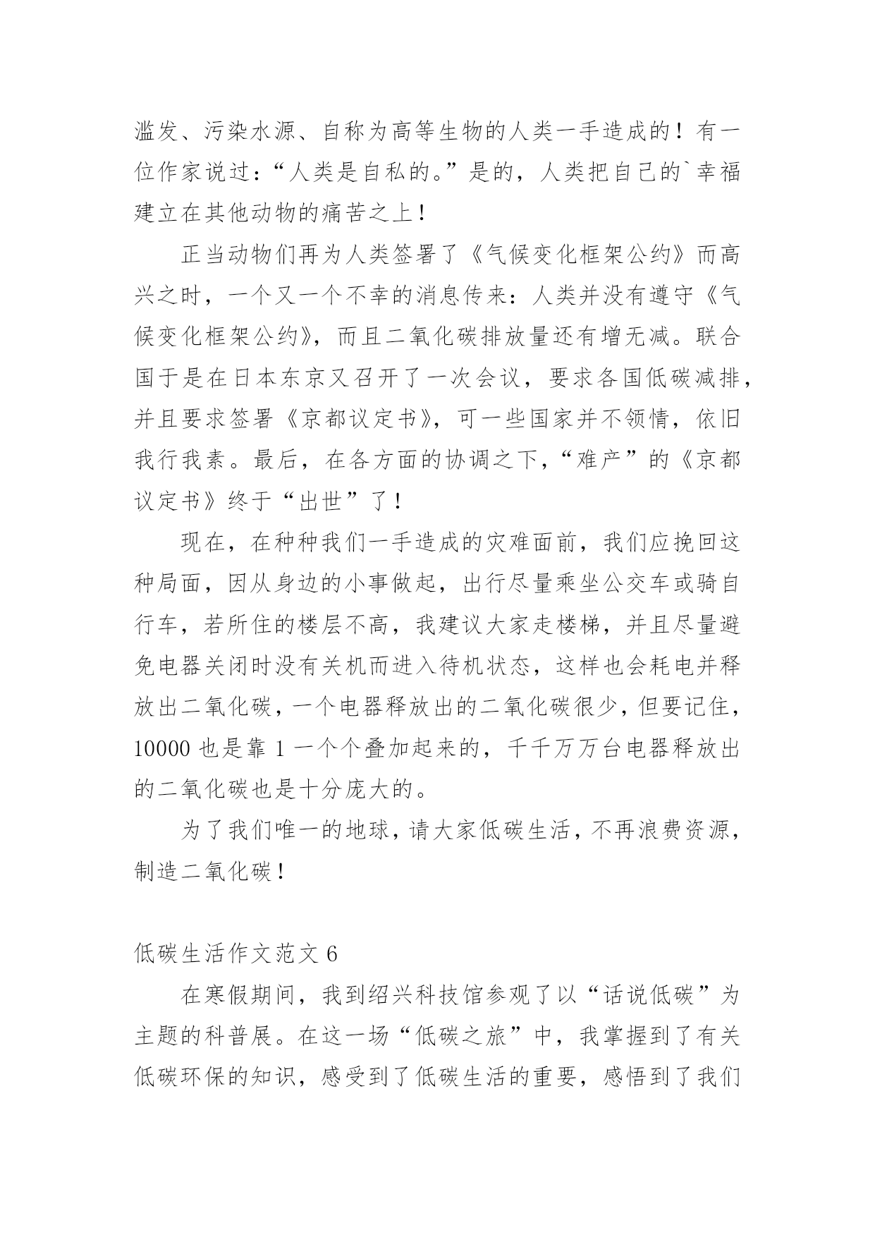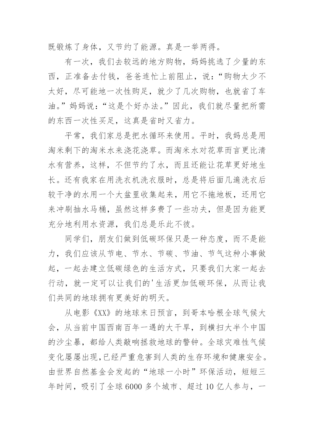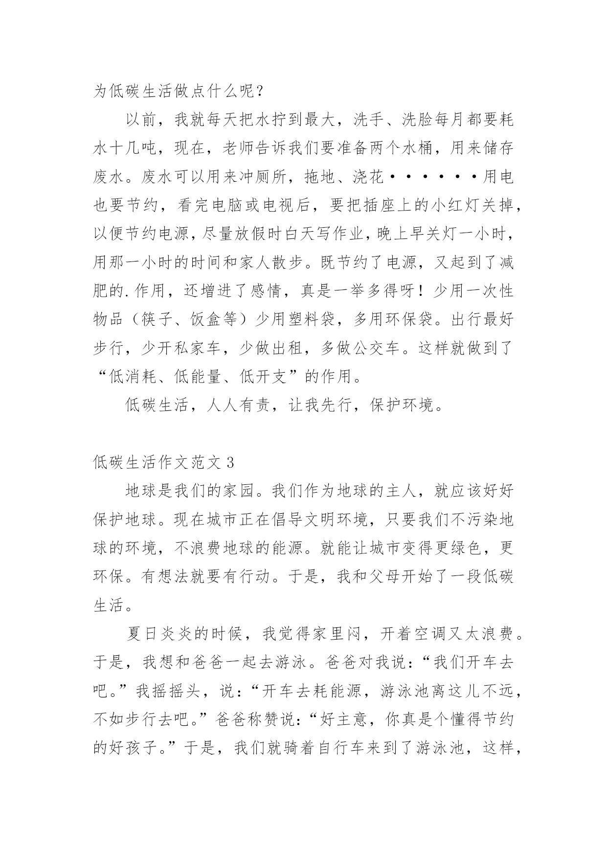 低碳生活作文低碳生活作文范文无论是在学校还是在社会中,大家对作文都再熟悉不过了吧,作文是一种言语活动,具有高度的综合性和创造性。相信写作文是一个让许多人都头痛的问题,下面是小编为大家整理的低碳生活作文范文,欢迎阅读,希望大家能够喜欢。低碳生活作文范文1在去年12月7日,《半岛都市报》为了拯救地球,发起了“你说我说,低碳生活”的活动,呼吁人们节能减排,立刻得到了市民以及有关部门的响应。我身为青岛的小公民,也应该为低碳出把力,从身边做起,做“低碳一族”“低碳宣传员”。现在我正好放假在家里,就先向家里人“开刀”吧!奶奶每天做饭不太讲究节约,我说:“奶奶,现在提倡”低碳生活“,如果你焖米饭时,把大米浸泡20分钟后再煮,可缩短时间;做饭时要用中火;烧东西时要擦干锅,不易煮烂煮烂的食品要用高压锅,都有助于节省燃气。还有,洗菜淘米的水可以用来浇花,洗衣服的水可以用来拖地或者冲厕所。”奶奶,吃惊的说:“是吗?!奶奶老了不知道,就照你说的办吧!”爸爸起床后,先点上一支烟,我趁机说:“爸爸,吸烟影响低碳生活。”爸爸还没等我说完,就问道:“什么低碳?”我说:“低碳就是节能减排,比如你开车,如果你每月少开一天车,每年就可以减少98千克二氧化碳的排放。再比如说你用电脑吧!暂时不用时可以让它”睡“一会儿,可以节约不少电呢!”爸爸说:“你小子,比我知道的还多,说的有道理,我试试看,也加入你的'”低碳一族“。我心里喜滋滋的。到了晚上,爷爷打开了电视,声音调的十分大。我说:“爷爷,现在人们都在不断提高低碳意识,声音小,亮度低都可以节电,还有你的手机,晚上不用时就关机,可以减少充电的次数。”爷爷满脸笑容的说:“你不愧是我的好孙子,从小就知道节约,这些我还没想到呢,我一定照办。”我高兴地一蹦三尺高,爷爷也是“低碳一族”了。我不能光要求别人低碳,自己也要做到,我要马上行动起来。做到多喝白开水,少喝饮料;少用纸巾擦手;每周选一天不吃肉;少买多余的衣服以及生活学习用品;本子反正面都用,不用修正液、修正带。希望大家都养成低碳习惯,提高低碳意识,争当低碳标兵。低碳生活作文范文2最近一个时期,我听到了“低碳生活”一词。通过看书了解,低碳生活是一种低消耗,低能量,低开支,从而减少二氧化碳的排放的生活方式。在查阅资料的过程中,我知道了保定是全国中小城市的试点城市,作为一名小学生,我能为低碳生活做点什么呢?以前,我就每天把水拧到最大,洗手、洗脸每月都要耗水十几吨,现在,老师告诉我们要准备两个水桶,用来储存废水。废水可以用来冲厕所,拖地、浇花······用电也要节约,看完电脑或电视后,要把插座上的小红灯关掉,以便节约电源,尽量放假时白天写作业,晚上早关灯一小时,用那一小时的时间和家人散步。既节约了电源,又起到了减肥的.作用,还增进了感情,真是一举多得呀!少用一次性物品(筷子、饭盒等)少用塑料袋,多用环保袋。出行最好步行,少开私家车,少做出租,多做公交车。这样就做到了“低消耗、低能量、低开支”的作用。低碳生活,人人有责,让我先行,保护环境。低碳生活作文范文3地球是我们的家园。我们作为地球的主人,就应该好好保护地球。现在城市正在倡导文明环境,只要我们不污染地球的环境,不浪费地球的能源。就能让城市变得更绿色,更环保。有想法就要有行动。于是,我和父母开始了一段低碳生活。夏日炎炎的时候,我觉得家里闷,开着空调又太浪费。于是,我想和爸爸一起去游泳。爸爸对我说:“我们开车去吧。”我摇摇头,说:“开车去耗能源,游泳池离这儿不远,不如步行去吧。”爸爸称赞说:“好主意,你真是个懂得节约的好孩子。”于是,我们就骑着自行车来到了游泳池,这样,既锻炼了身体,又节约了能源。真是一举两得。有一次,我们去较远的地方购物,妈妈挑选了少量的东西,正准备去付钱,爸爸连忙上前阻止,说:“购物太少不太好,尽可能地一次性购足,就少了几次购物,也就省了车油。”妈妈说:“这是个好办法。”因此,我们就尽量把所需的东西一次性买足,这真是省时又省力。平常,我们家总是把水循环来使用。平时,我妈总是用淘米剩下的淘米水来浇花浇草。而淘米水对花草而言更比清水有营养,这样,不但节约了水,而且还能让花草更好地生长。还有我家在用洗衣机洗衣服时,总是将后面几遍洗衣后较干净的水用一个大盆里收集起来,用它不拖地板,还用它来冲刷抽水马桶,虽然这样多费了一些功夫,但是因为能更充分地利用水资源,我们总是乐此不彼。同学们,朋友们做到低碳环保只是一种态度,而不是能力,我们应该从节电、节水、节碳、节油、节气这种小事做起,一起去建立低碳绿色的生活方式,只要我们大家一起去行动,就一定可以让我们的'生活更加低碳环保,从而让我们共同的地球拥有更美好的明天。从电影《XX》的地球末日预言,到哥本哈根全球气候大会,从当前中国西南百年一遇的大干旱,到横扫大半个中国的沙尘暴,都给人