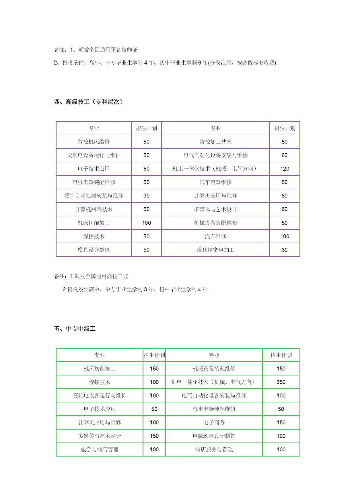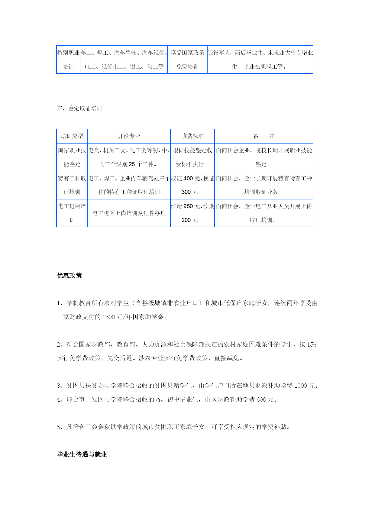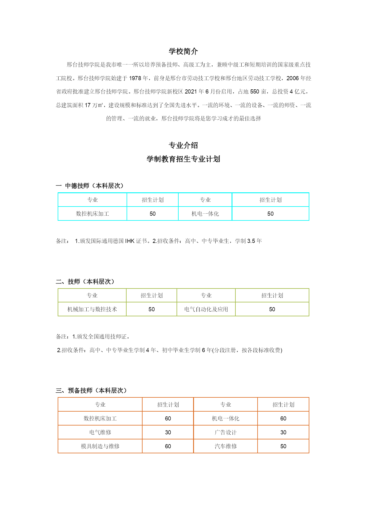 邢台技师学院学校简介招生简章(完整版)实用资料(可以直接使用,可编辑完整版实用资料,欢迎下载)学校简介邢台技师学院是我市唯一一所以培养预备技师、高级工为主,兼顾中级工和短期培训的国家级重点技工院校。邢台技师学院始建于1978年,前身是邢台市劳动技工学校和邢台地区劳动技工学校,2006年经省政府批准建立邢台技师学院。邢台技师学院新校区2021年6月份启用,占地550亩,总投资4亿元,总建筑面积17万㎡,建设规模和标准达到了全国先进水平。一流的环境、一流的设备、一流的师资、一流的管理、一流的就业,邢台技师学院将是您学习成才的最佳选择专业介绍学制教育招生专业计划一中德技师(本科层次)专业招生计划专业招生计划数控机床加工50机电一体化50备注:1.颁发国际通用德国IHK证书。2.招收条件:高中、中专毕业生,学制3.5年二、技师(本科层次)专业招生计划专业招生计划机械加工与数控技术50电气自动化及应用50备注:1.颁发全国通用技师证。2.招收条件:高中、中专毕业生学制4年、初中毕业生学制6年(分段注册,按各段标准收费)三、预备技师(本科层次)专业招生计划专业招生计划数控机床加工60机电一体化60电气维修30广告设计30模具制造与维修60汽车维修50备注:1、颁发全国通用预备技师证2、招收条件:高中、中专毕业生学制4年、初中毕业生学制6年(分段注册,按各段标准收费)四、高级技工(专科层次)专业招生计划专业招生计划数控机床维修50数控加工技术50变频电设备运行与维护50电气自动化设备安装与维修60电子技术应用50机电一体化技术(机械、电气方向)120电机电器装配维修50汽车电器维修50楼宇自动控制安装与维修30计算机应用与维修80计算机网络技术60多媒体与艺术设计60机床切削加工100机械设备装配维修50焊接技术50汽车维修100模具设计制造50现代精密电加工30备注:1.颁发全国通用高技工证2.招收条件高中、中专毕业生学制3年、初中毕业生学制4年五、中专中级工专业招生计划专业招生计划机床切削加工150机械设备装配维修150焊接技术100机电一体化技术(机械、电气方向)350变频电设备运行与维护100电气自动化设备安装与维修100电子技术应用50机电电器装配维修50计算机应用与维修100电子商务150多媒体与艺术设计150电脑动画设计制作100旅游与酒店管理100酒店服务与管理100会计100市场营销50形象设计与造型50中式面点30中式烹饪30玻璃工艺50煤化工100盐化工100化工工艺50制冷设备安装维修30建筑施工预算30电气化铁路供电100珠宝玉石加工与营销100物流管理50文秘与办公自动化50艺术设计与装潢100幼教150幼儿艺术教育50学前教育(师范类)300物业管理100农村经济综合管理(涉农免费)100农产品保鲜与加工(涉农免费)100农机使用与维修(涉农免费)100备注:1.招收条件:初中毕业生学制2-3年2.初中毕业生学制3年(艺术、幼教专业)3.小学毕业生、学制5-6年(幼儿艺术教育专业)六、对口升学专业招生计划机电50财经50备注:1.招收条件:高中、中专、中技毕业生学制2年短训分院招生简章一、短期技能培训面向社会常年开办的短期培训技能培训专业培训时间收费标准招生对象备注电工3个月1500初中以上学历,身体健康。安排就业,月综合工资不低于1500元。面向社会常年开办的短期培训一、短期技能培训技能培训专业培训时间收费标准招生对象备注电工3个月1500初中以上学历,身体健康。安排就业,月综合工资不低于1500元。焊工3个月150017周岁以上,初中以上学历,身高1.60米以上。安排就业,月综合工资不低于1500元。汽车驾驶与维修3个月2500身高1.65米以上,18至45周岁。学驾驶免费学维修,学维修免费学驾驶。保安60天60018-40周岁初、高中毕业生。身体健康、五官端正,男性身高1.60米以上,女性1.55米以上。车工3个月150017周岁以上,初中以上学历。安排就业,月综合工资不低于1500元。化工2个月100018周岁以上,初中以上学历。定向分配到旭阳焦化厂。月综合工资不低于1500元。二、政策性培训培训类型开设专业培训费用培训对象金蓝领技师培训车工、焊工、汽车驾驶、汽车维修、电工、维修电工、钳工、化工等享受国家政策免费培训各企业取得高级工资格2年以上或在市级以上比赛获奖者可申报。失业职工培训计算机应用、厨师、插花、电工、焊工等300元领完失业金且6个月仍未就业者,经过培训可一次性申领6个月求职补贴(约计2300元)。特别职业培训车工、焊工、汽车驾驶、汽车维修、电工、维修电工、钳工、化工等享受国