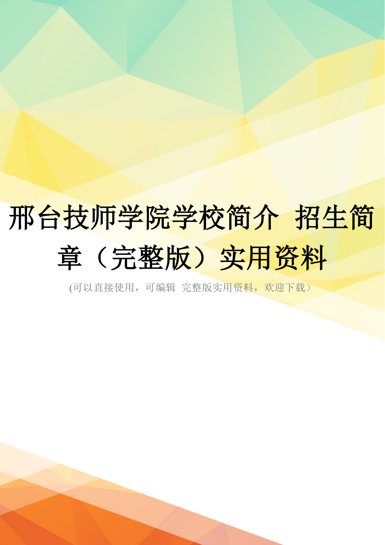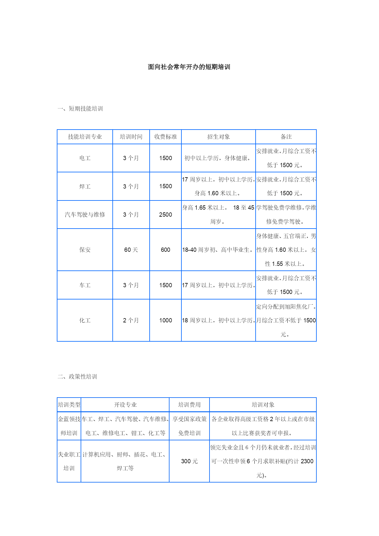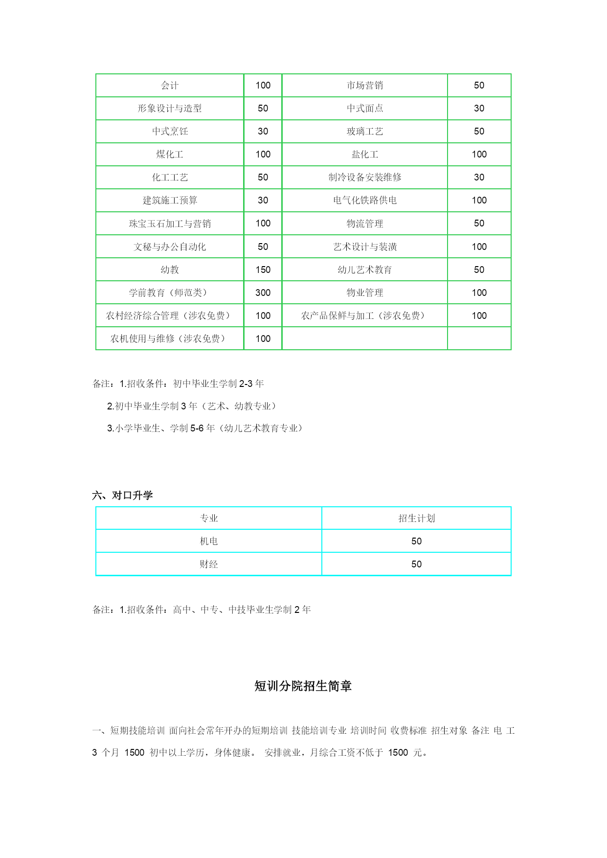 邢台技师学院学校简介招生简章(完整版)实用资料(可以直接使用,可编辑完整版实用资料,欢迎下载)学校简介邢台技师学院是我市唯一一所以培养预备技师、高级工为主,兼顾中级工和短期培训的国家级重点技工院校。邢台技师学院始建于1978年,前身是邢台市劳动技工学校和邢台地区劳动技工学校,2006年经省政府批准建立邢台技师学院。邢台技师学院新校区2021年6月份启用,占地550亩,总投资4亿元,总建筑面积17万㎡,建设规模和标准达到了全国先进水平。一流的环境、一流的设备、一流的师资、一流的管理、一流的就业,邢台技师学院将是您学习成才的最佳选择专业介绍学制教育招生专业计划一中德技师(本科层次)专业招生计划专业招生计划数控机床加工50机电一体化50备注:1.颁发国际通用德国IHK证书。2.招收条件:高中、中专毕业生,学制3.5年二、技师(本科层次)专业招生计划专业招生计划机械加工与数控技术50电气自动化及应用50备注:1.颁发全国通用技师证。2.招收条件:高中、中专毕业生学制4年、初中毕业生学制6年(分段注册,按各段标准收费)三、预备技师(本科层次)专业招生计划专业招生计划数控机床加工60机电一体化60电气维修30广告设计30模具制造与维修60汽车维修50备注:1、颁发全国通用预备技师证2、招收条件:高中、中专毕业生学制4年、初中毕业生学制6年(分段注册,按各段标准收费)四、高级技工(专科层次)专业招生计划专业招生计划数控机床维修50数控加工技术50变频电设备运行与维护50电气自动化设备安装与维修60电子技术应用50机电一体化技术(机械、电气方向)120电机电器装配维修50汽车电器维修50楼宇自动控制安装与维修30计算机应用与维修80计算机网络技术60多媒体与艺术设计60机床切削加工100机械设备装配维修50焊接技术50汽车维修100模具设计制造50现代精密电加工30备注:1.颁发全国通用高技工证2.招收条件高中、中专毕业生学制3年、初中毕业生学制4年五、中专中级工专业招生计划专业招生计划机床切削加工150机械设备装配维修150焊接技术100机电一体化技术(机械、电气方向)350变频电设备运行与维护100电气自动化设备安装与维修100电子技术应用50机电电器装配维修50计算机应用与维修100电子商务150多媒体与艺术设计150电脑动画设计制作100旅游与酒店管理100酒店服务与管理100会计100市场营销50形象设计与造型50中式面点30中式烹饪30玻璃工艺50煤化工100盐化工100化工工艺50制冷设备安装维修30建筑施工预算30电气化铁路供电100珠宝玉石加工与营销100物流管理50文秘与办公自动化50艺术设计与装潢100幼教150幼儿艺术教育50学前教育(师范类)300物业管理100农村经济综合管理(涉农免费)100农产品保鲜与加工(涉农免费)100农机使用与维修(涉农免费)100备注:1.招收条件:初中毕业生学制2-3年2.初中毕业生学制3年(艺术、幼教专业)3.小学毕业生、学制5-6年(幼儿艺术教育专业)六、对口升学专业招生计划机电50财经50备注:1.招收条件:高中、中专、中技毕业生学制2年短训分院招生简章一、短期技能培训面向社会常年开办的短期培训技能培训专业培训时间收费标准招生对象备注电工3个月1500初中以上学历,身体健康。安排就业,月综合工资不低于1500元。面向社会常年开办的短期培训一、短期技能培训技能培训专业培训时间收费标准招生对象备注电工3个月1500初中以上学历,身体健康。安排就业,月综合工资不低于1500元。焊工3个月150017周岁以上,初中以上学历,身高1.60米以上。安排就业,月综合工资不低于1500元。汽车驾驶与维修3个月2500身高1.65米以上,18至45周岁。学驾驶免费学维修,学维修免费学驾驶。保安60天60018-40周岁初、高中毕业生。身体健康、五官端正,男性身高1.60米以上,女性1.55米以上。车工3个月150017周岁以上,初中以上学历。安排就业,月综合工资不低于1500元。化工2个月100018周岁以上,初中以上学历。定向分配到旭阳焦化厂。月综合工资不低于1500元。二、政策性培训培训类型开设专业培训费用培训对象金蓝领技师培训车工、焊工、汽车驾驶、汽车维修、电工、维修电工、钳工、化工等享受国家政策免费培训各企业取得高级工资格2年以上或在市级以上比赛获奖者可申报。失业职工培训计算机应用、厨师、插花、电工、焊工等300元领完失业金且6个月仍未就业者,经过培训可一次性申领6个月求职补贴(约计2300元)。特别职业培训车工、焊工、汽车驾驶、汽车维修、电工、维修电工、钳工、化工等享受国