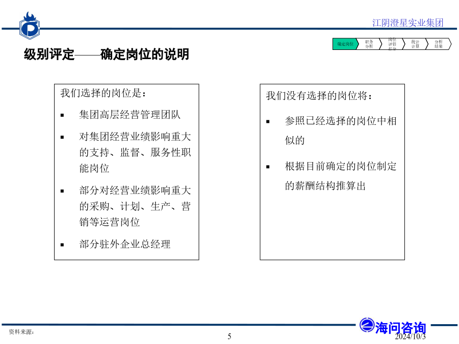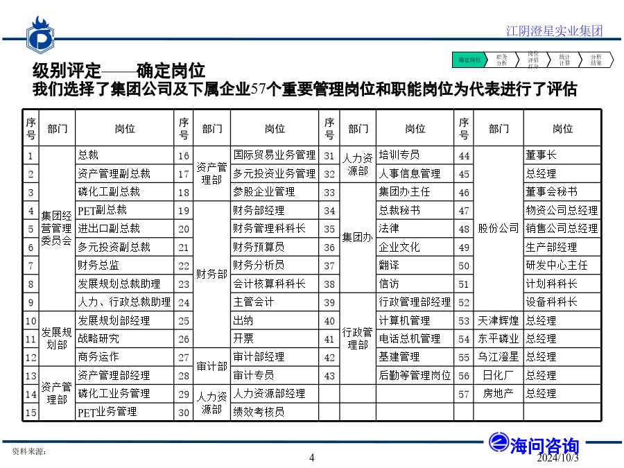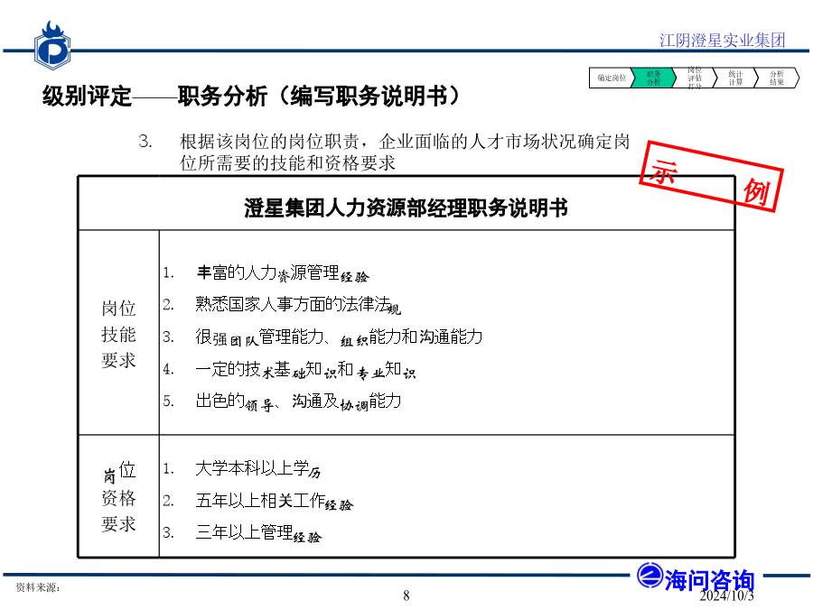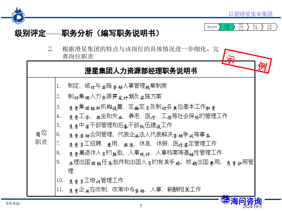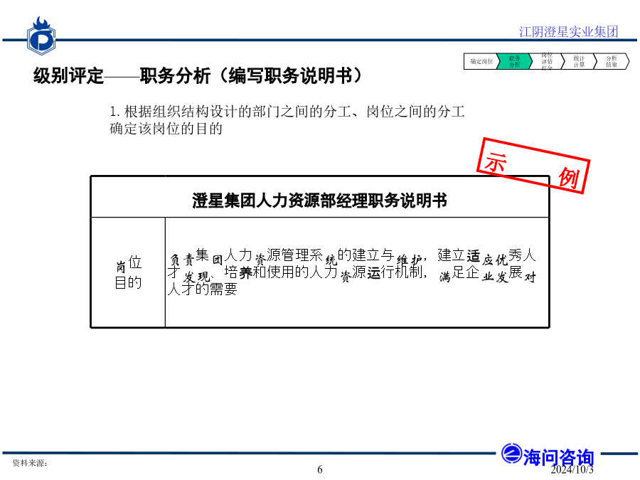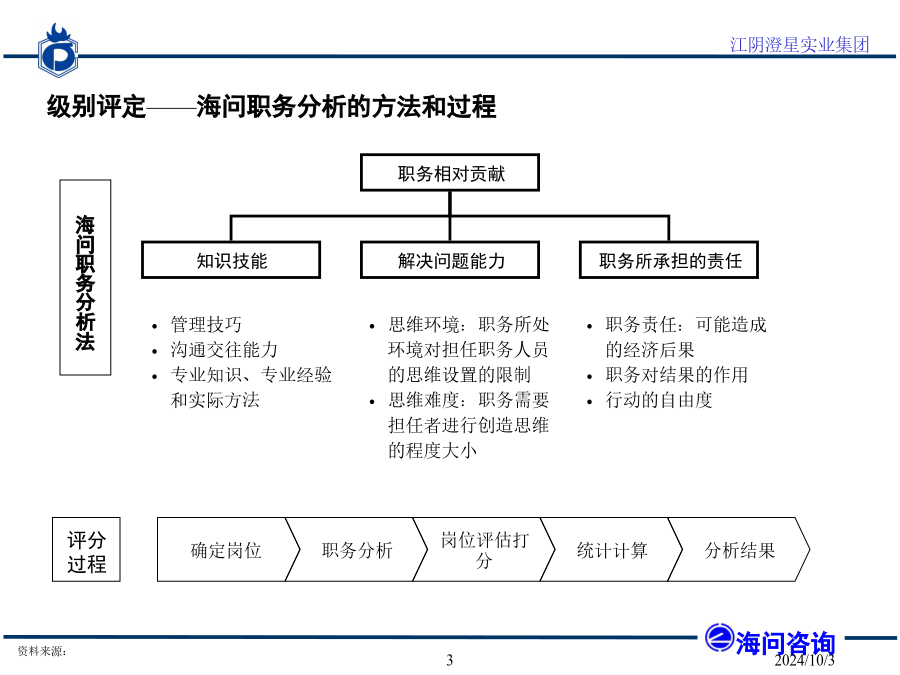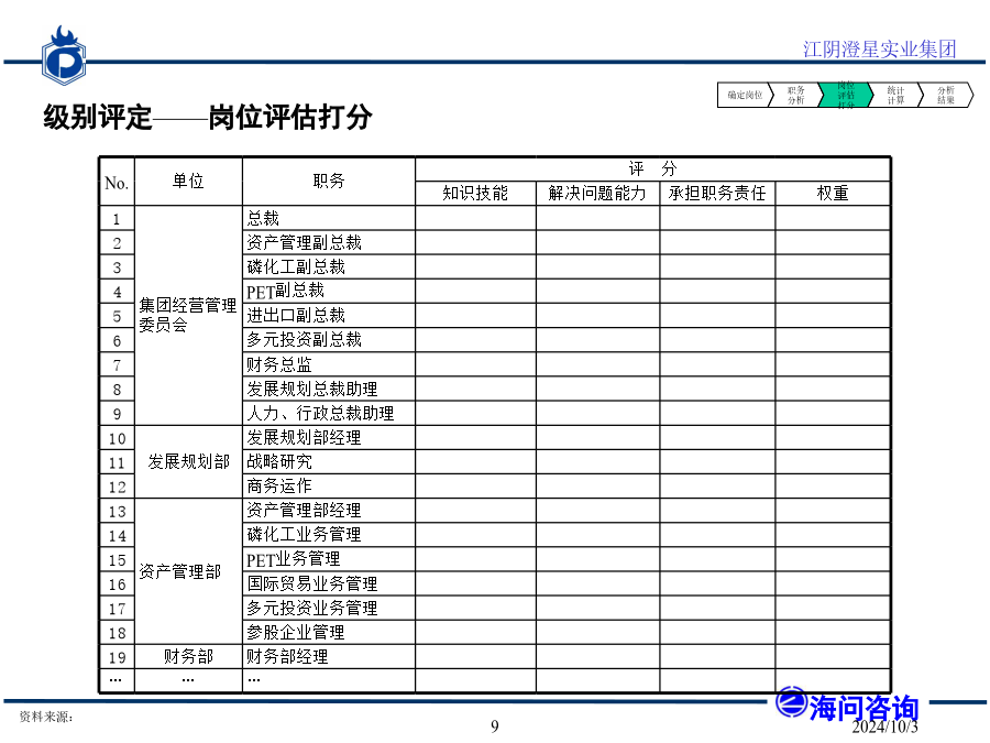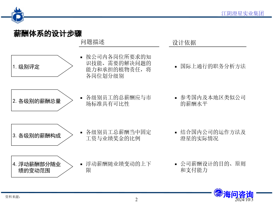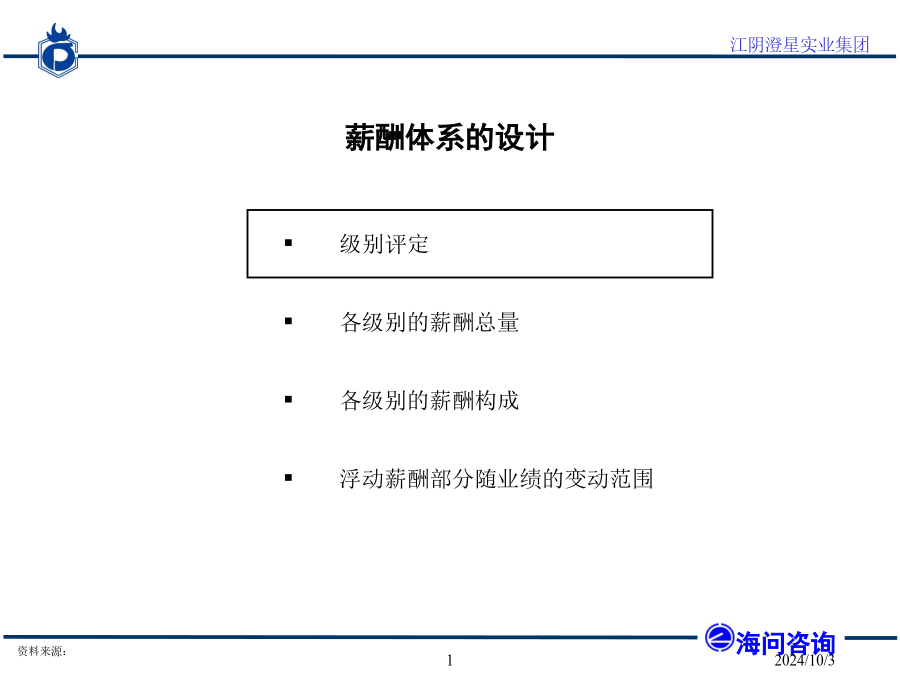 江阴澄星实业集团管理咨询项目薪酬方案与绩效考核体系薪酬体系的设计级别评定级别评定——海问职务分析的方法和过程序号级别评定——确定岗位的说明级别评定——职务分析(编写职务说明书)级别评定——职务分析(编写职务说明书)级别评定——职务分析(编写职务说明书)级别评定——岗位评估打分级别评定——统计计算级别评定——分析结果级别评定——分析结果级别评定——分析结果级别评定——分析结果薪酬体系的设计2024/10/3根据业绩拉开级别薪酬总额上下限的差距确定岗位薪酬的标准(3)薪酬范围业绩决定是否得到奖金以及奖金的数额业绩决定中层经理获得股票期权的数额及其实际价值公司业绩决定中高层经理所持期权的实际价值业绩决定基本工资的上调幅度原则将岗位归纳分级,以确保内部一致性属于同一级别的不同岗位的价值应符合市场行情及公司实际情况应找出岗位价值的关键驱动因素,并以此把岗位分类对调查结果进行初步分析目录公司KPI指标体系说明(一)公司KPI指标体系说明(二)提炼KPI(关键业绩指标)的方法KPI确定方法硬指标与软指标选择KPI指标的原则企管部规划专员KPI组成表企管部规划专员KPI软指标评分表一:战略规划报告建议报告(企管部总经理填写)企管部规划专员KPI软指标评分表二:战略规划建议报告内容整理备案目录季度考核表:自评部分季度考核表:直属领导考评(一)季度考核表:直属领导考评(二)季度考核表:人力资源部汇总季度考核表:改进建议年度考核表:态度考评(一)年度考核表:态度考评(二)年度考核表:能力考评(一)年度考核表:能力考评(二)年度考核表:人力资源部汇总年度考核表:直属领导评价表年度考核表:绩效考评工作变更及执行调整表(一)年度考核表:绩效考评工作变更及执行调整表(二)目录总论:绩效考评目的与用途总论:绩效考评原则总论:绩效考评周期与时间安排总论:考评者与被考评者绩效考评层次结构绩效考评内容:指标体系绩效考评内容:业绩考评绩效考评内容:业绩考评—工作计划完成情况考评绩效考评内容:能力考评绩效考评内容:态度考评(一)绩效考评内容:态度考评(二)绩效考评实施绩效考评实施:年初考评内容调整绩效考评实施:季度绩效考评(一)绩效考评实施:季度绩效考评(二)绩效考评实施:年度绩效考评(一)绩效考评实施:年度绩效考评(二)目录薪酬组合与绩效考核设计思路岗位等级评估模型岗位等级评估岗位等级评估目录杰赛目前薪酬组合状况分析目前公司岗位工资与岗位责任不相匹配,岗位的重要性没有明显体现杰赛目前薪酬组合状况分析目录总体薪酬模型设计总体薪酬模型设计总体薪酬模型设计总体薪酬模型设计目录第一、二事业部总经理和副总经理考核激励的特殊说明(1)第一、二事业部总经理和副总经理考核激励的特殊说明(1)第三事业部总经理和副总经理考核激励的特殊说明(1)第三事业部总经理和副总经理考核激励的特殊说明(2)第六事业部总经理和副总经理考核激励的特殊说明(1)第六事业部总经理和副总经理考核激励的特殊说明(2)七—十事业部总经理和副总经理考核激励的特殊说明(1)七—十事业部总经理和副总经理考核激励的特殊说明(2)目录谢谢!