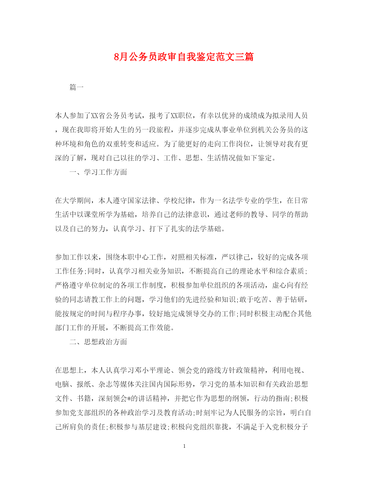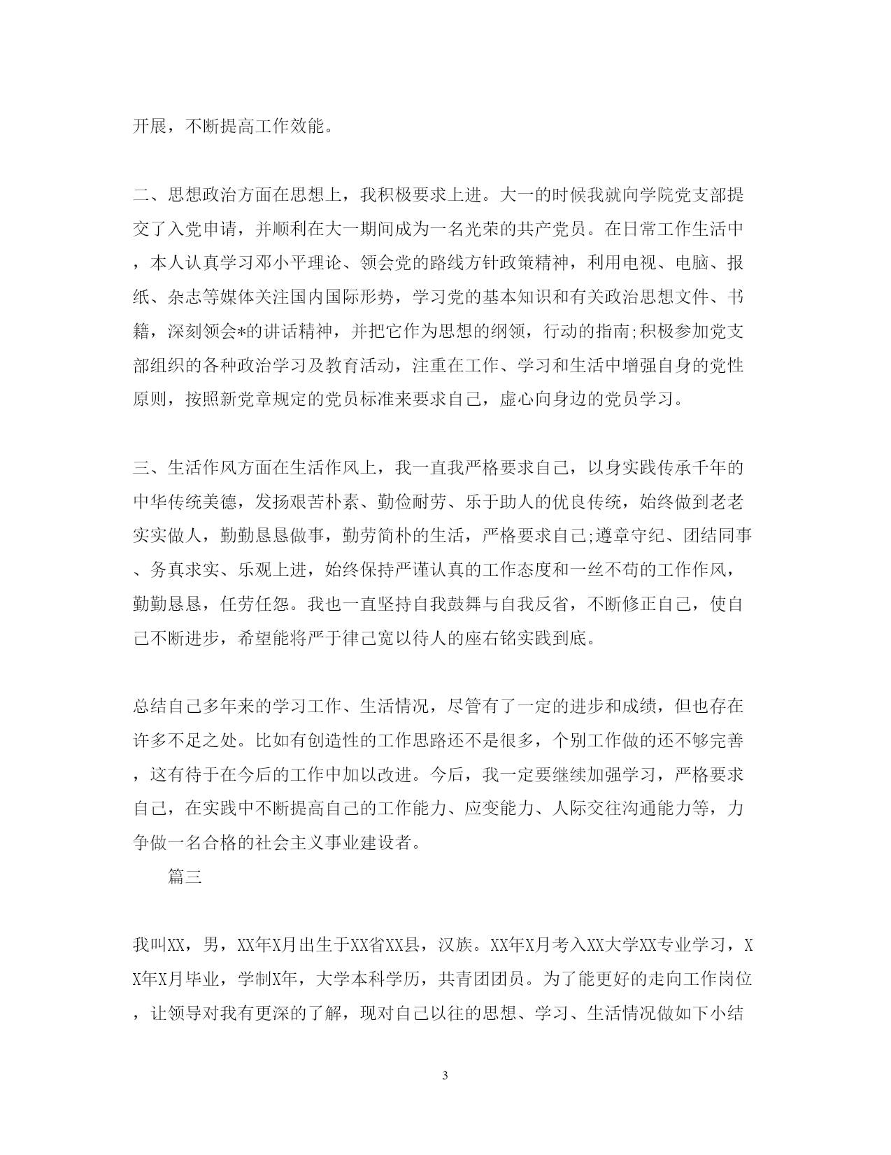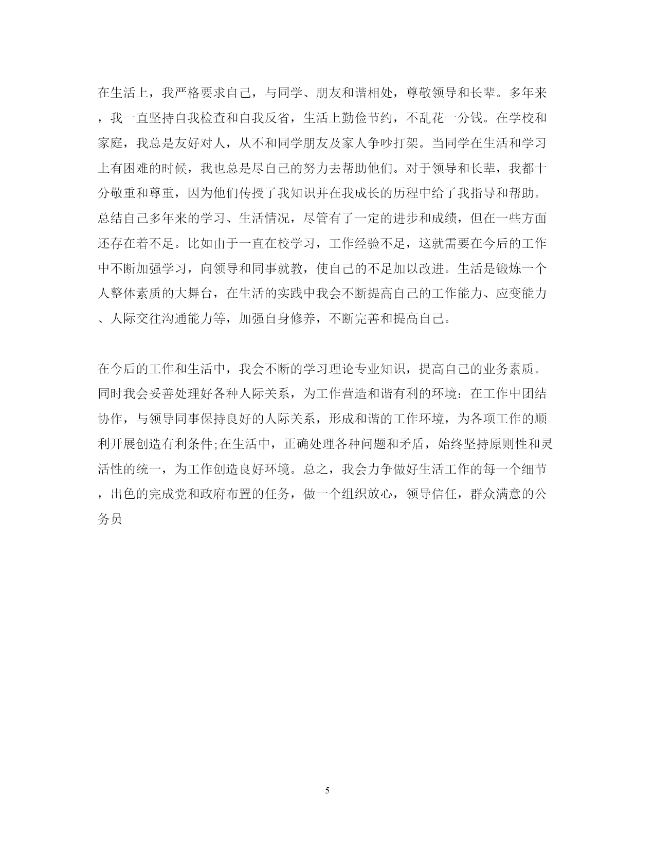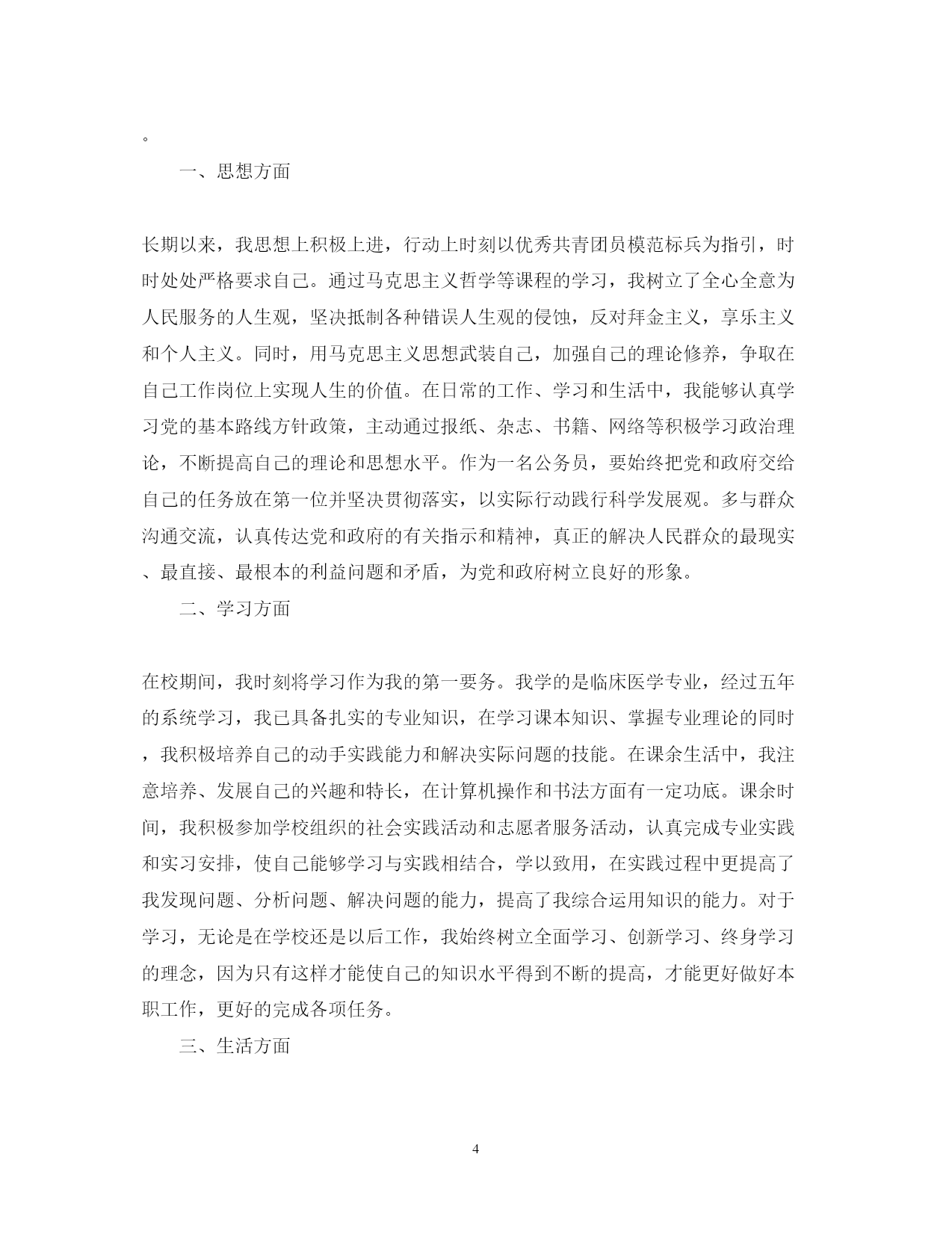 此资料由网络收集而来,如有侵权请告知上传者立即删除。资料共分享,我们负责传递知识。PAGEPAGE58月公务员政审自我鉴定范文三篇篇一本人参加了XX省公务员考试,报考了XX职位,有幸以优异的成绩成为拟录用人员,现在我即将开始人生的另一段旅程,并逐步完成从事业单位到机关公务员的这种环境和角色的双重转变和适应。为了能更好的走向工作岗位,让领导对我有更深的了解,现对自己以往的学习、工作、思想、生活情况做如下鉴定。一、学习工作方面在大学期间,本人遵守国家法律、学校纪律,作为一名法学专业的学生,在日常生活中以课堂所学为基础,培养自己的法律意识,通过老师的教导、同学的帮助以及自己的努力,认真学习、打下了扎实的法学基础。参加工作以来,围绕本职中心工作,对照相关标准,严以律己,较好的完成各项工作任务;同时,认真学习相关业务知识,不断提高自己的理论水平和综合素质;严格遵守单位制定的各项工作制度,积极参加单位组织的各项活动,虚心向有经验的同志请教工作上的问题,学习他们的先进经验和知识;敢于吃苦、善于钻研,能按规定的时间与程序办事,较好地完成领导交办的工作;同时积极主动配合其他部门工作的开展,不断提高工作效能。二、思想政治方面在思想上,本人认真学习邓小平理论、领会党的路线方针政策精神,利用电视、电脑、报纸、杂志等媒体关注国内国际形势,学习党的基本知识和有关政治思想文件、书籍,深刻领会*的讲话精神,并把它作为思想的纲领,行动的指南;积极参加党支部组织的各种政治学习及教育活动;时刻牢记为人民服务的宗旨,明白自己所肩负的责任;积极参与基层建设;积极向党组织靠拢,不满足于入党积极分子培训所获得的党的基本知识,在工作、学习和生活中增强自身的党性原则,按照新党章规定的党员标准来要求自己,虚心向身边的党员学习。三、生活作风方面在生活作风上,发扬艰苦朴素、勤俭耐劳、乐于助人的优良传统,始终做到老老实实做人,勤勤恳恳做事,勤劳简朴的生活,严格要求自己;遵章守纪、团结同事、务真求实、乐观上进,始终保持严谨认真的工作态度和一丝不苟的工作作风,勤勤恳恳,任劳任怨。总结自己多年来的学习工作、生活情况,尽管有了一定的进步和成绩,但在一些方面还存在着不足。比如我刚刚踏出校园,步入社会。社会工作经验上还存在着一定的欠缺。这有待于在今后的工作中加以磨砺。在新的工作岗位上,我一定要继续加强学习,严格要求自己,在实践中不断提高自己的工作能力、应变能力、人际交往沟通能力等,力争做一名合格的司法工作人员,为我国法治事业发展和壮大做出自己应有的贡献。篇二一、学习工作方面在学习方面,从小学习刻苦,成绩一直很优秀,顺利考取理想的大学,完成了学业。大学期间一直担任班长一职,成功的组织了班级的各项活动,并获得多项荣誉称号。同时,在校期间参加过学校的各种活动,并且在学校的演讲比赛节等各项活动中获奖。参加工作以后,围绕本职中心工作,对照相关标准,严以律己,较好的完成各项工作任务;同时,认真学习相关业务知识,不断提高自己的理论水平和综合素质;严格遵守单位制定的各项工作制度,积极参加单位组织的各项活动,虚心向有经验的同志请教工作上的问题,学习他们的先进经验和知识;敢于吃苦、善于钻研,能按规定的时间与程序办事,较好地完成领导交办的工作;同时积极主动配合其他部门工作的开展,不断提高工作效能。二、思想政治方面在思想上,我积极要求上进。大一的时候我就向学院党支部提交了入党申请,并顺利在大一期间成为一名光荣的共产党员。在日常工作生活中,本人认真学习邓小平理论、领会党的路线方针政策精神,利用电视、电脑、报纸、杂志等媒体关注国内国际形势,学习党的基本知识和有关政治思想文件、书籍,深刻领会*的讲话精神,并把它作为思想的纲领,行动的指南;积极参加党支部组织的各种政治学习及教育活动,注重在工作、学习和生活中增强自身的党性原则,按照新党章规定的党员标准来要求自己,虚心向身边的党员学习。三、生活作风方面在生活作风上,我一直我严格要求自己,以身实践传承千年的中华传统美德,发扬艰苦朴素、勤俭耐劳、乐于助人的优良传统,始终做到老老实实做人,勤勤恳恳做事,勤劳简朴的生活,严格要求自己;遵章守纪、团结同事、务真求实、乐观上进,始终保持严谨认真的工作态度和一丝不苟的工作作风,勤勤恳恳,任劳任怨。我也一直坚持自我鼓舞与自我反省,不断修正自己,使自己不断进步,希望能将严于律己宽以待人的座右铭实践到底。总结自己多年来的学习工作、生活情况,尽管有了一定的进步和成绩,但也存在许多不足之处。比如有创造性的工作思路还不是很多,个别工作做的还不够完善,这有待于在今后的工作中加以改进。今后,我一定要继续加强学习,严格要求自己,在实践中不断提高自己的工作能力、应变能力、人际交往沟通能力等,力争做一名合格的社会